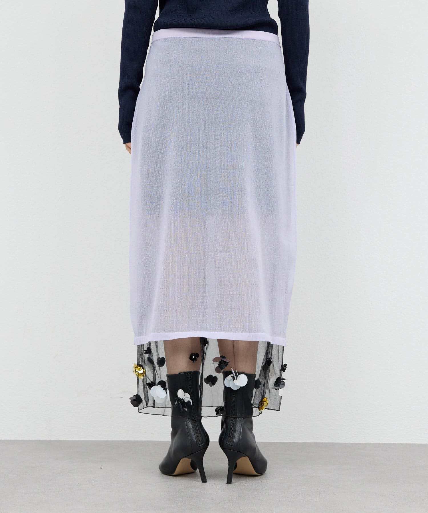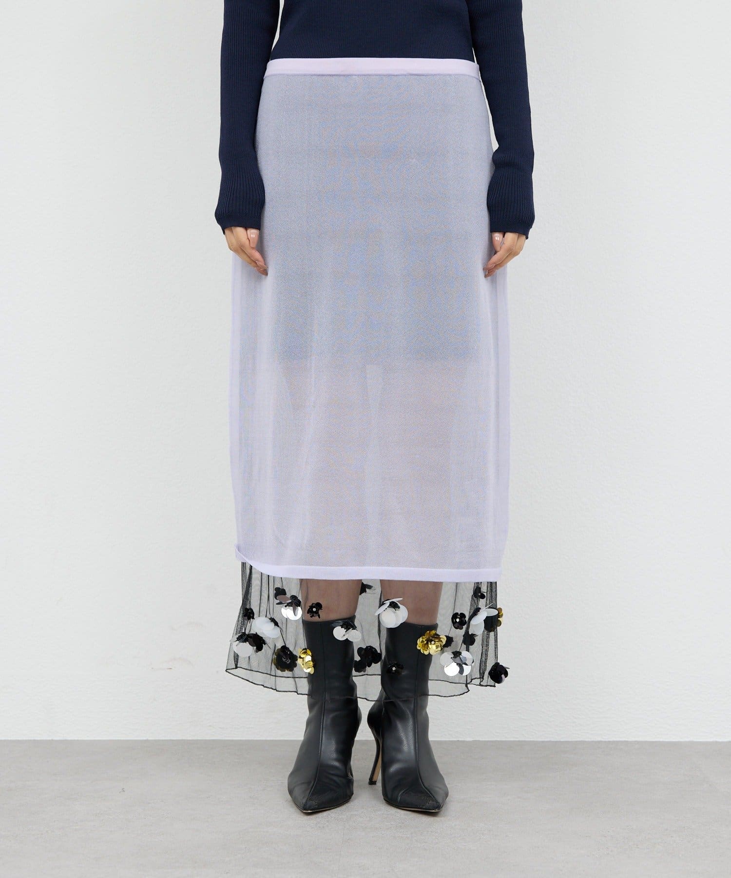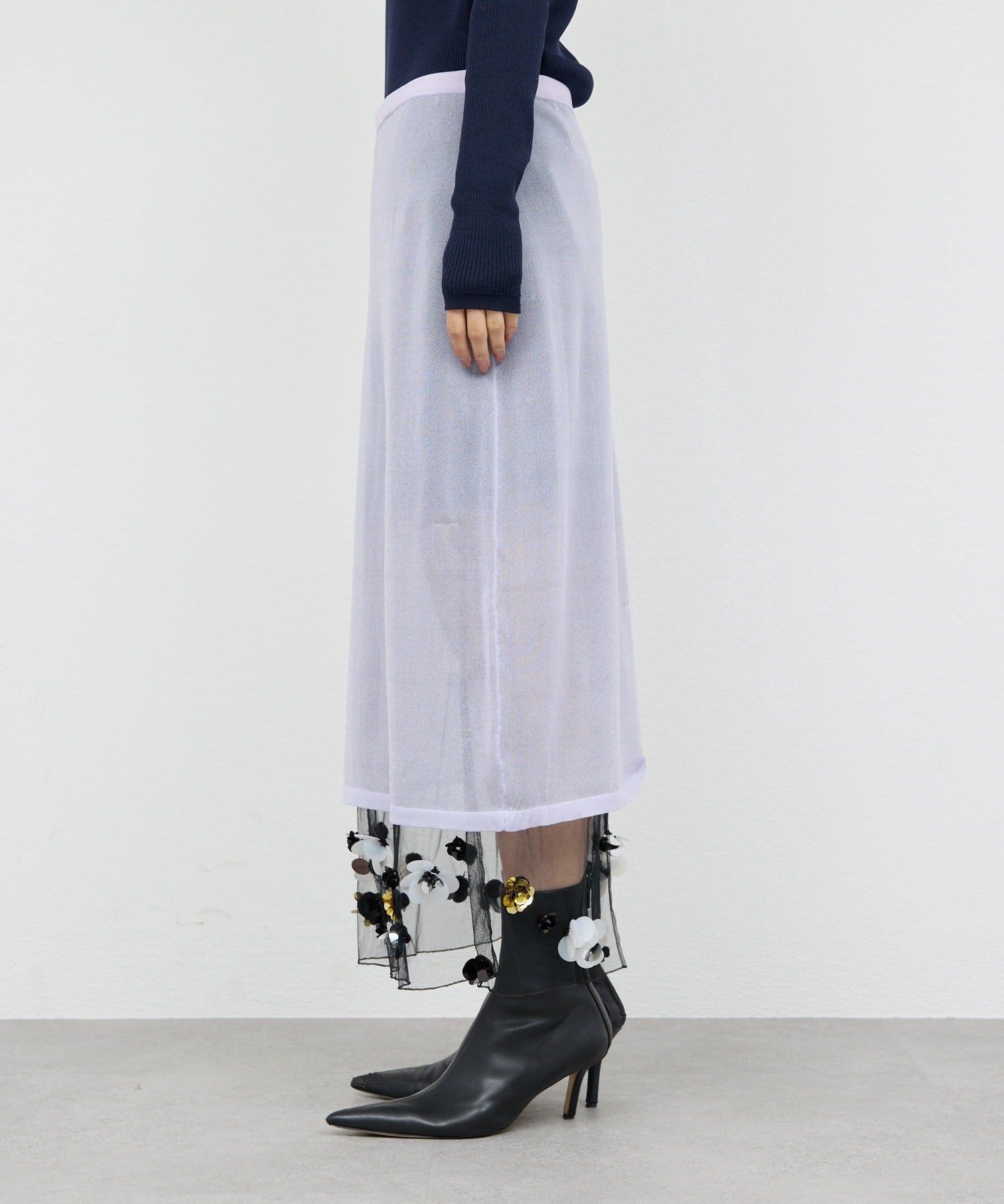 ●ラベンダーカラーとビジューデザインがレディな印象のシアースカート。
