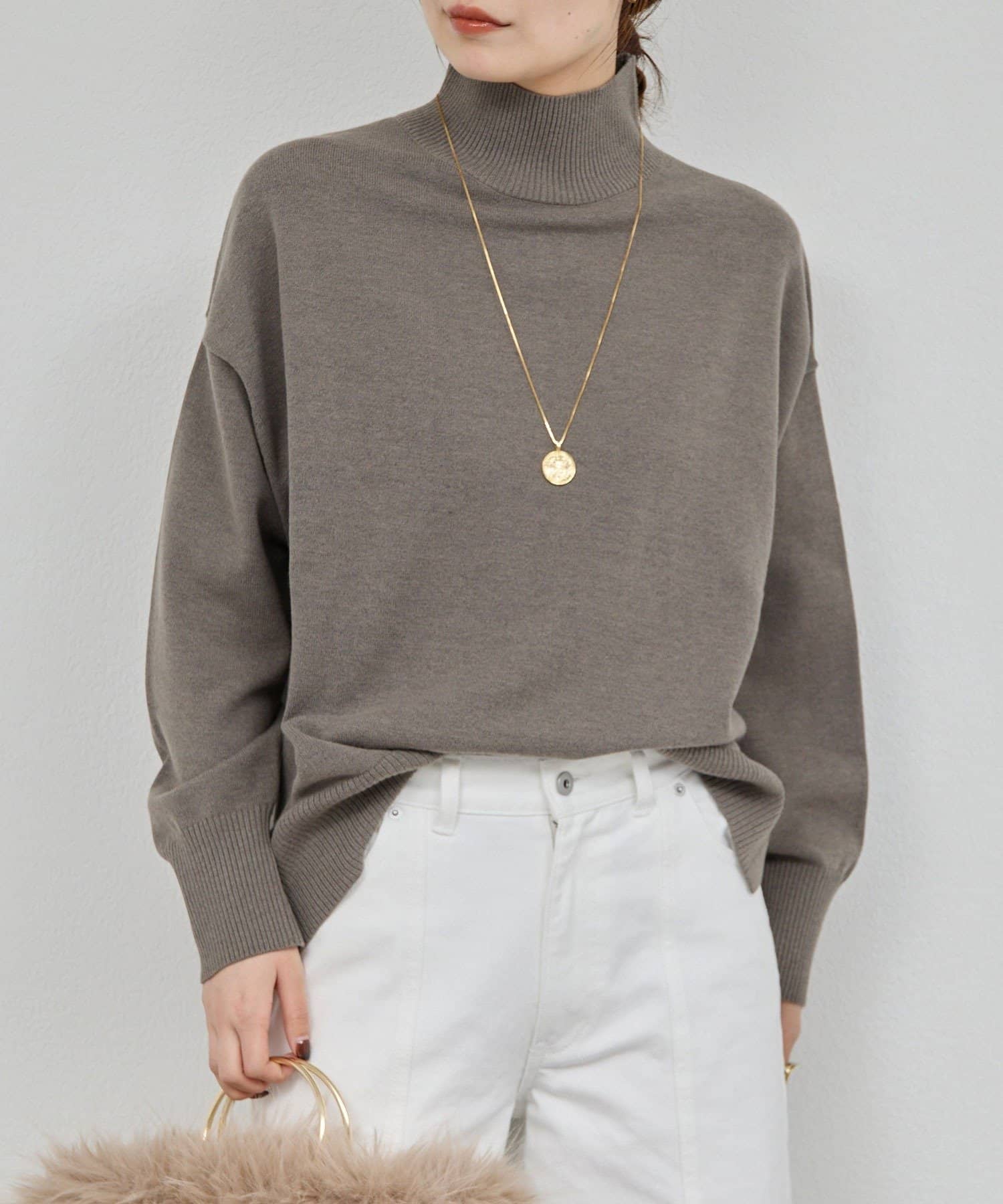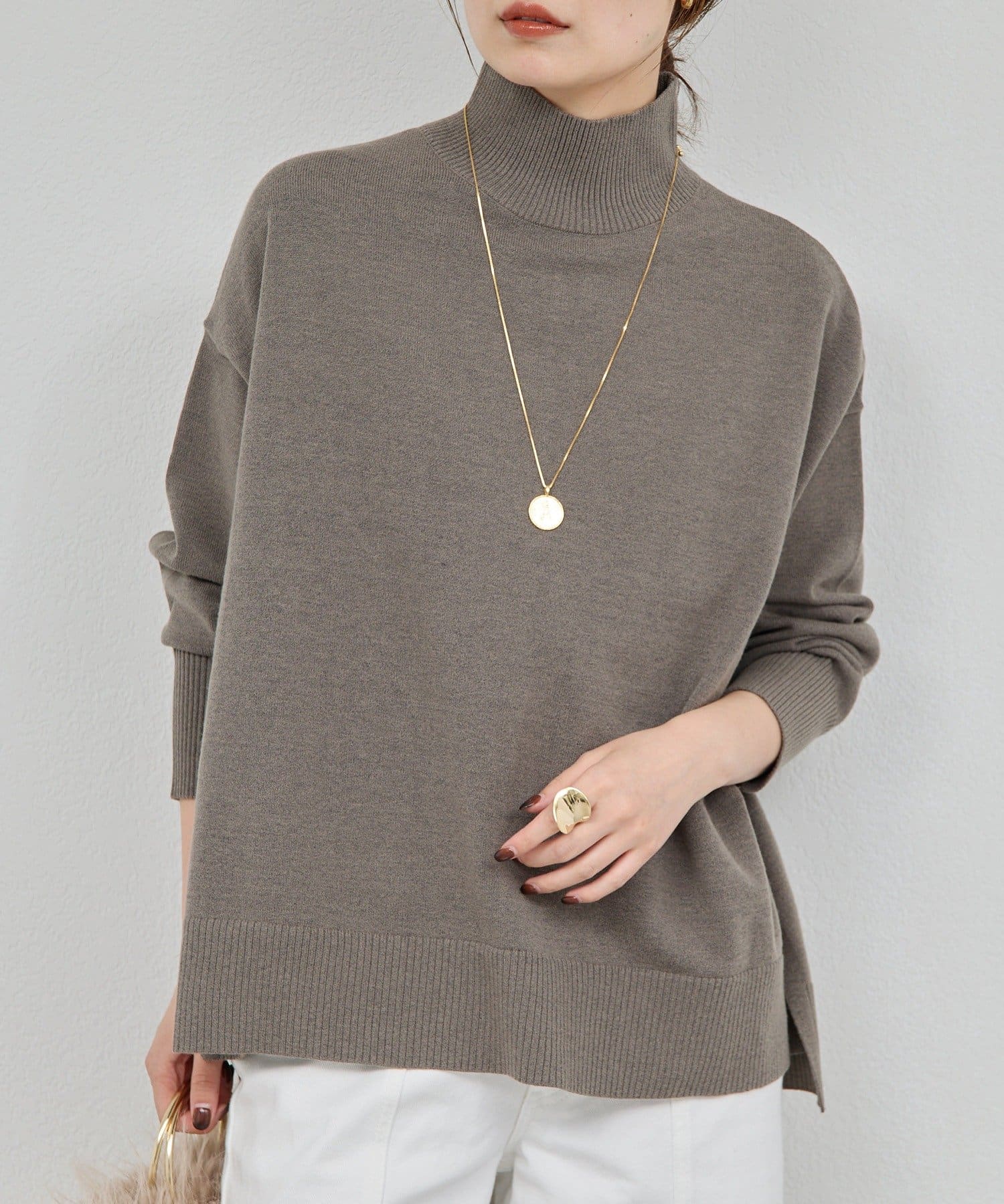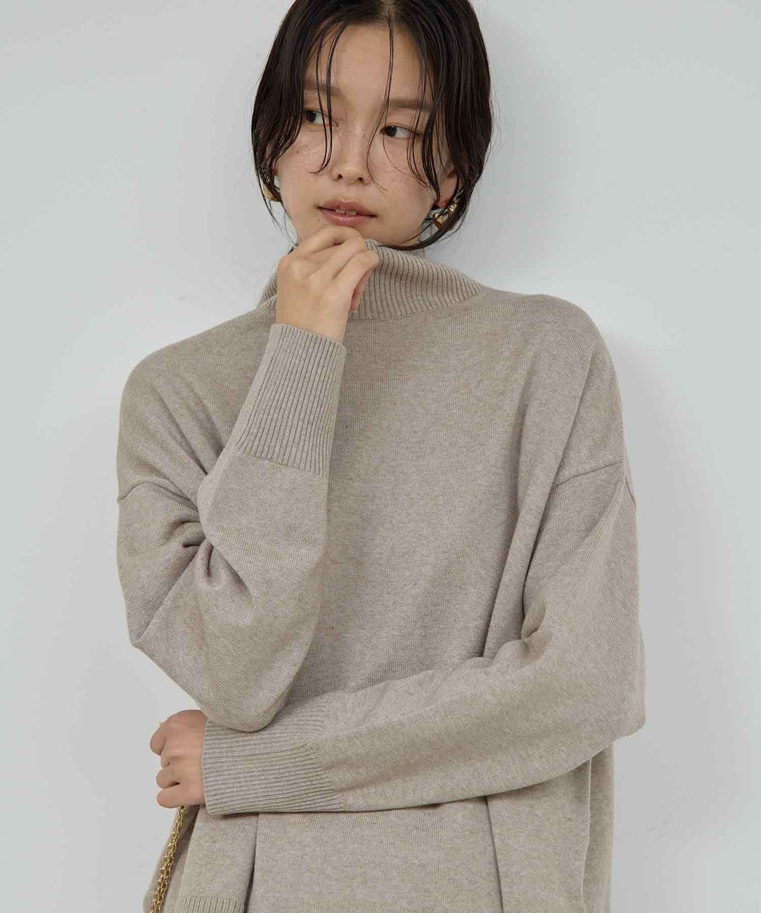 毛玉のできにくい非ウール素材で初秋から長く着られるタートルニット。