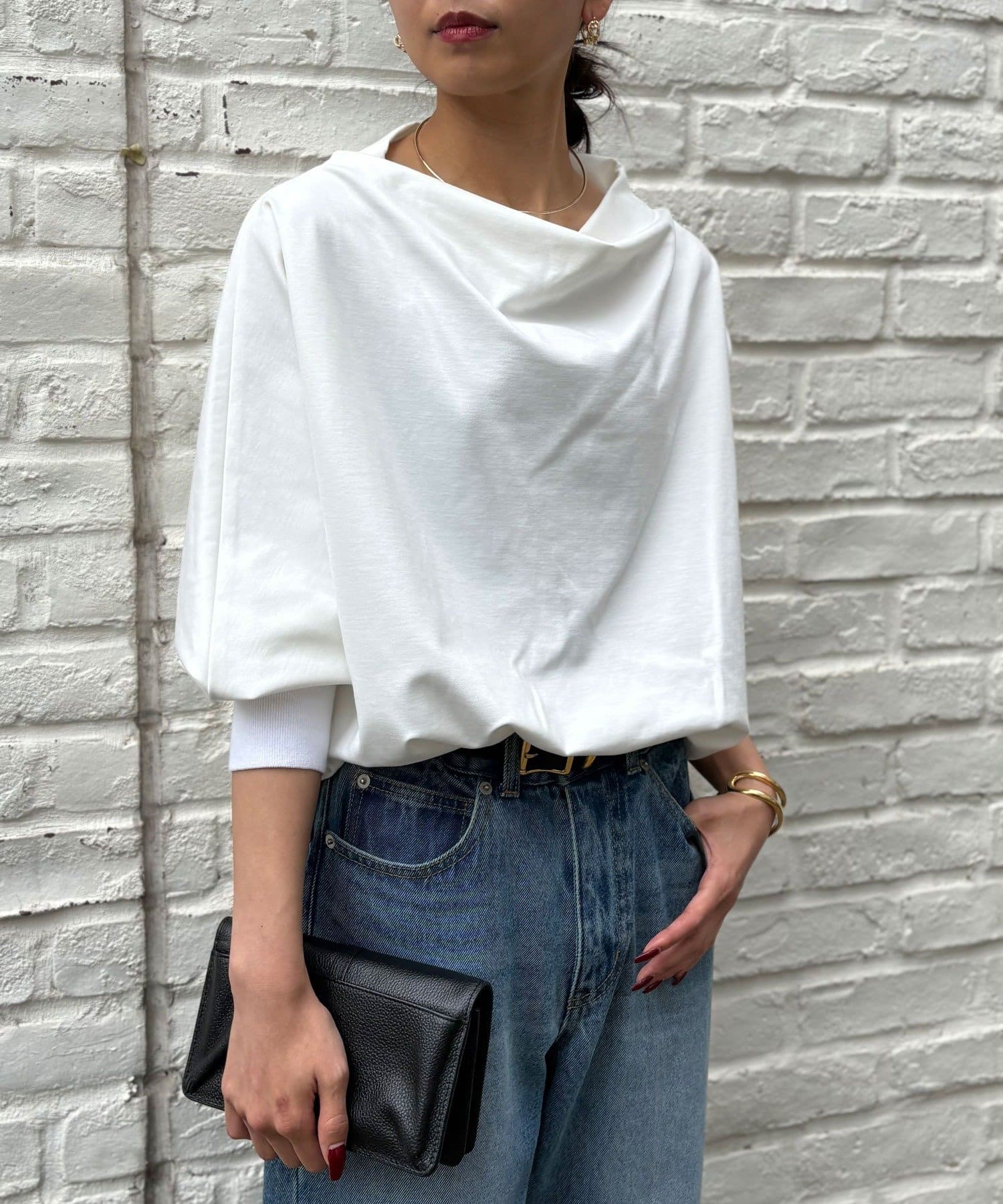 ●首元に施されえたドレープデザインはスタイリングをエレガントな印象に。