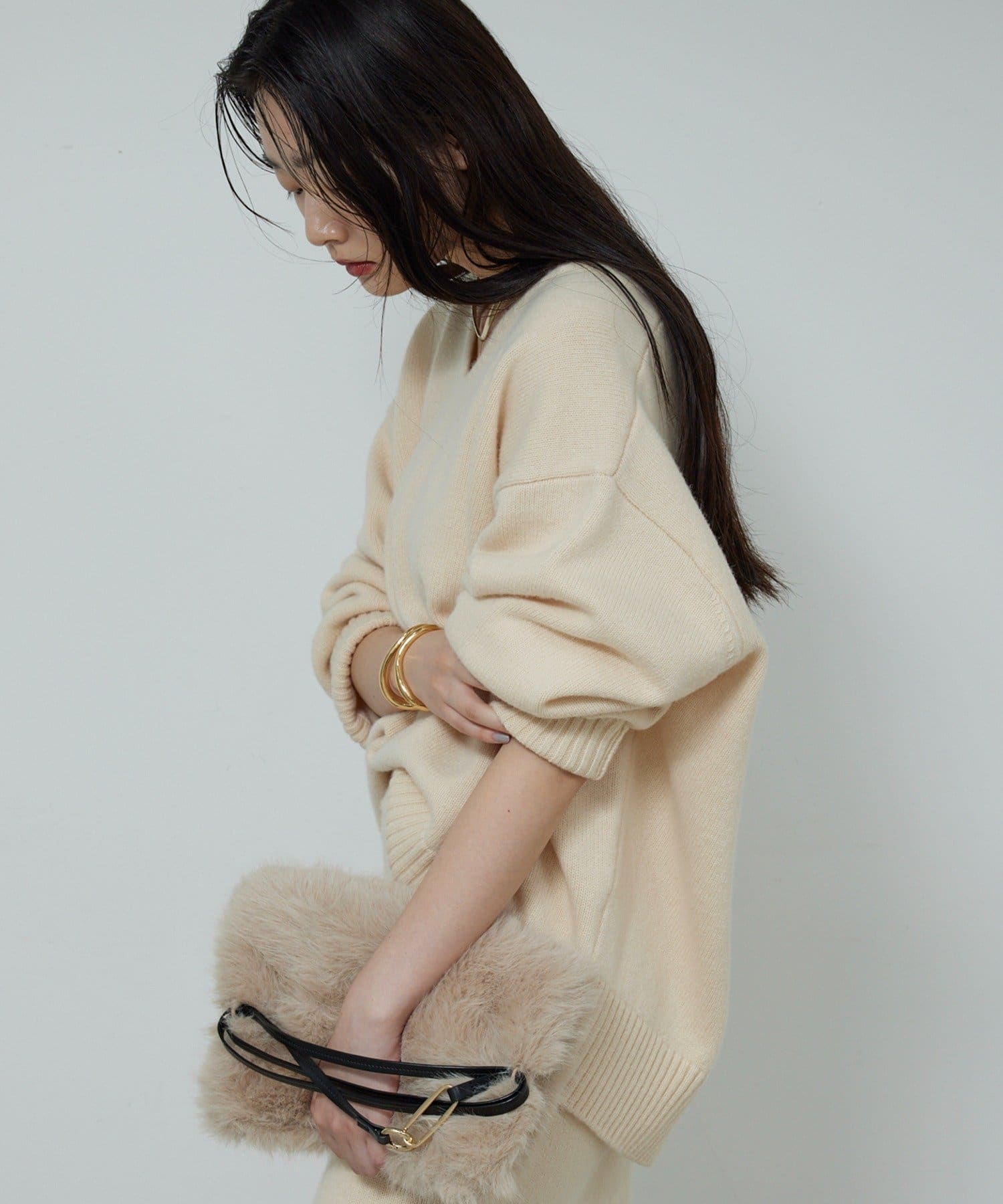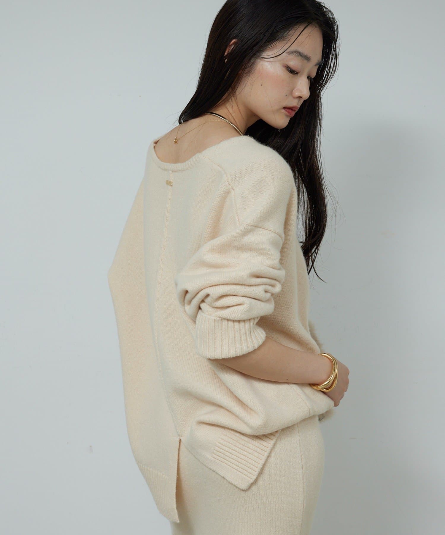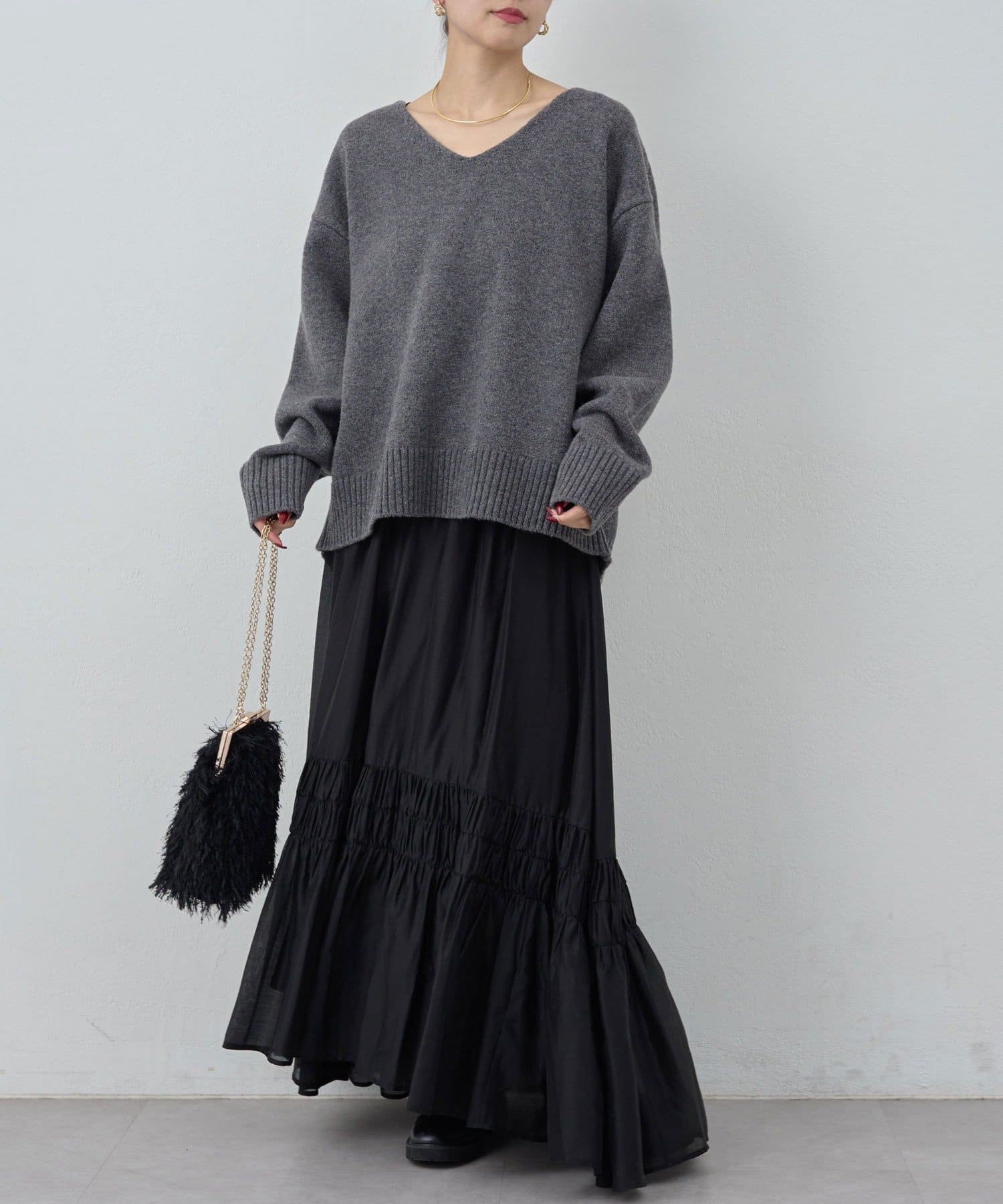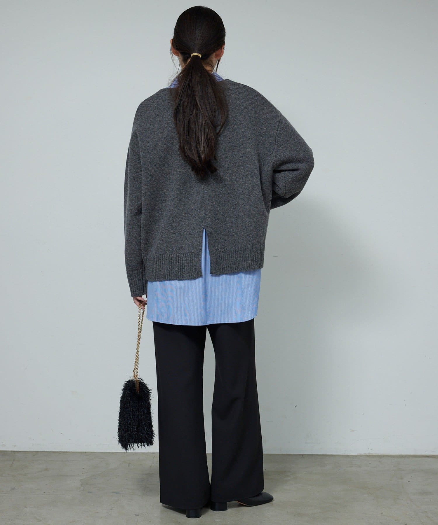 ●首元をすっきりと見せつつインナーにも困らない絶妙な開き具合のVネック。