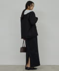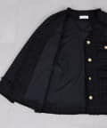 ●顔周りをすっきりと見せるノーカラーのジャケット。