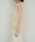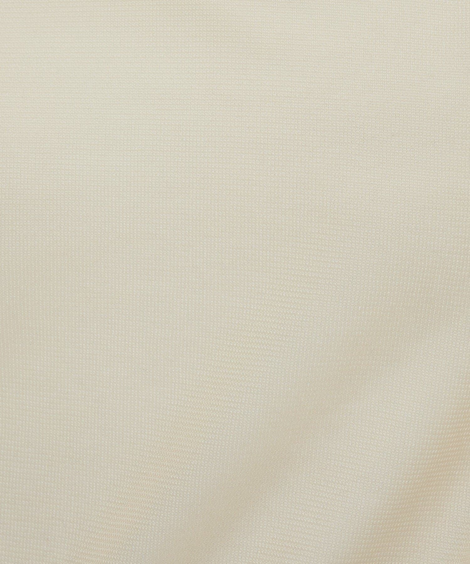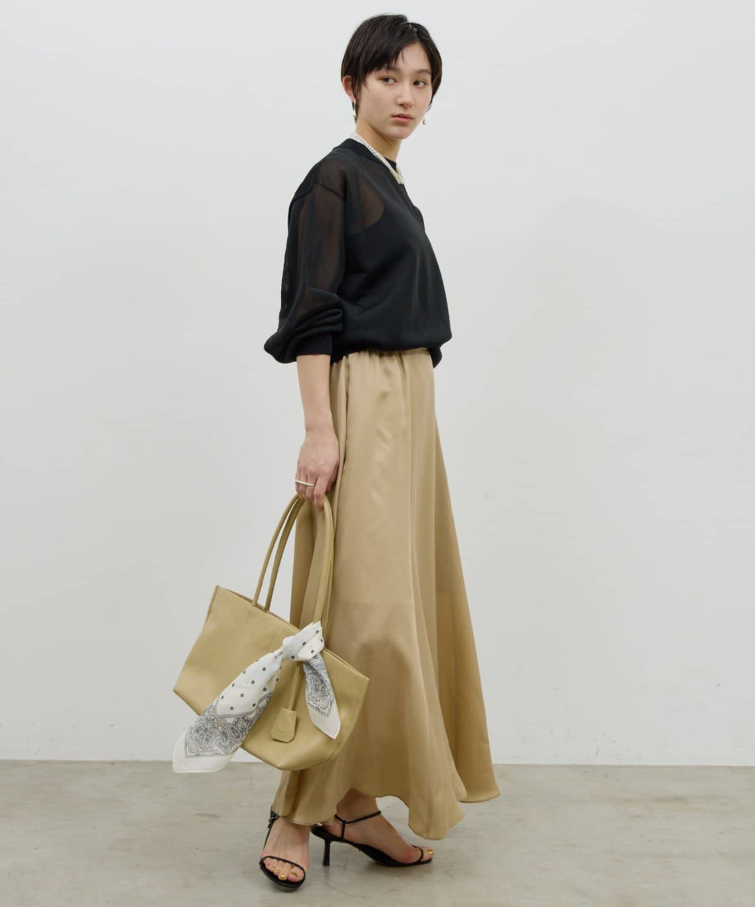 ●つややかな素材が装いにさりげない女性らしさを添える1着。