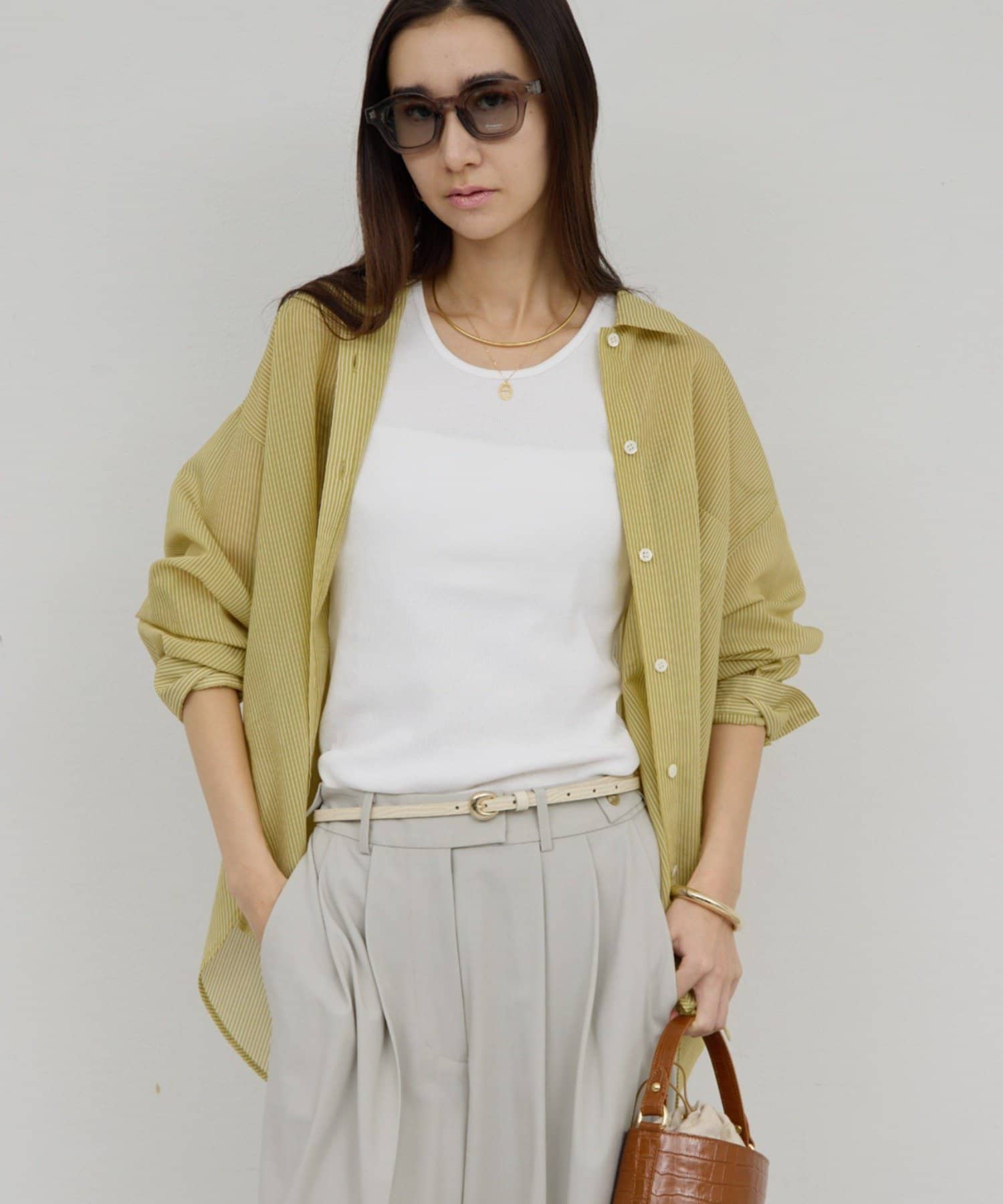 • staff:160cm コーディネートに馴染みやすいライトグレー 控え目なストライプが上品見えする一枚