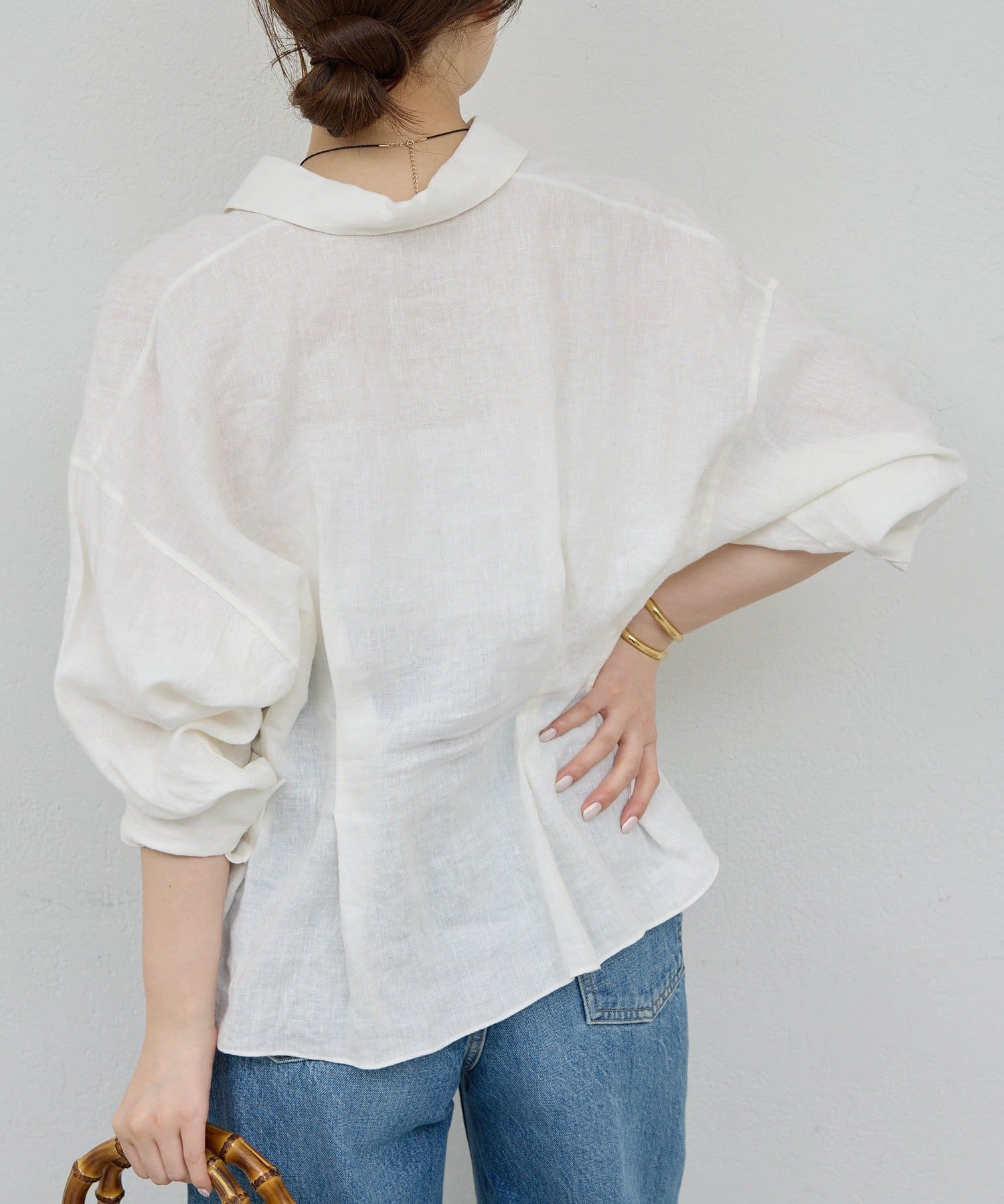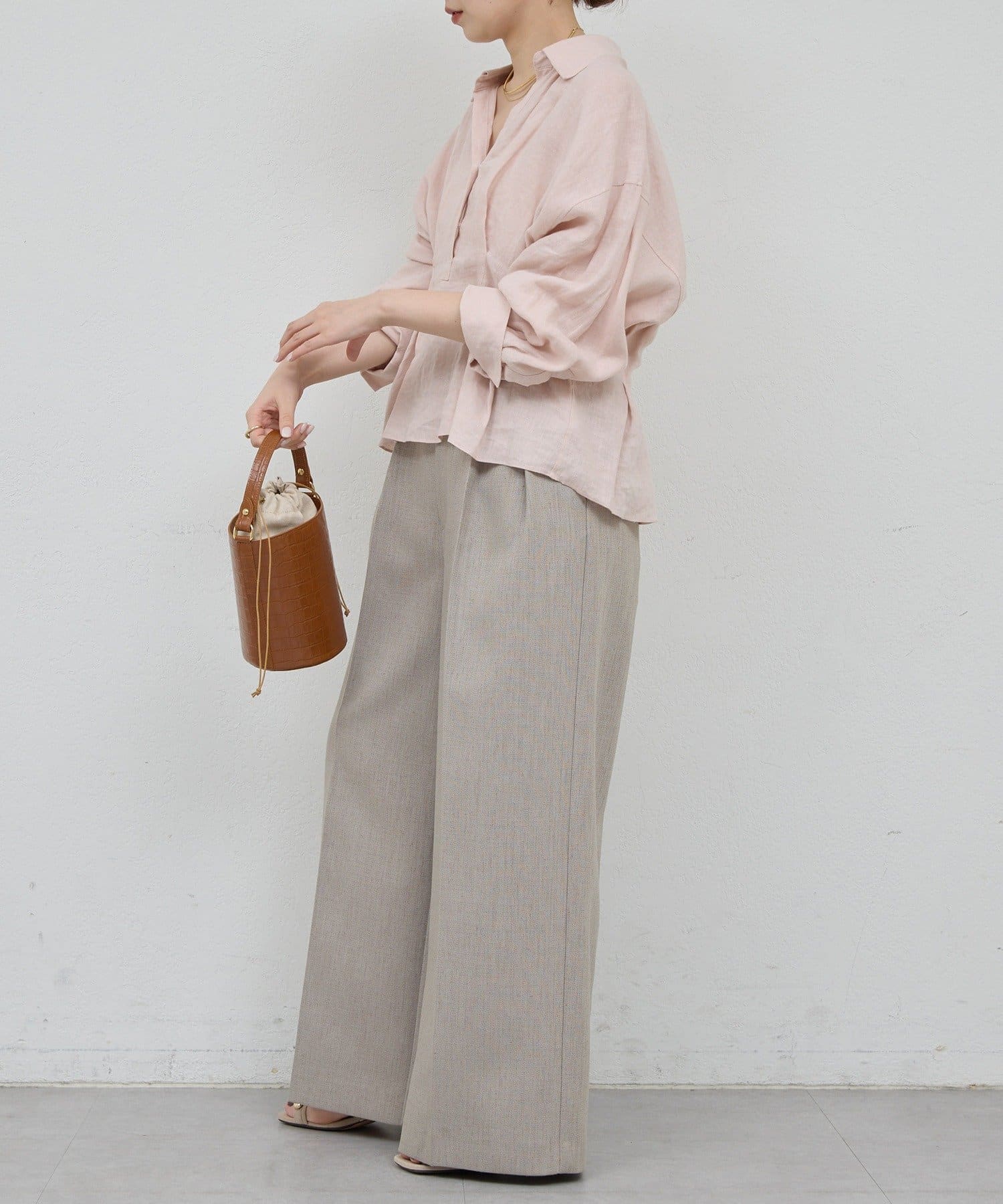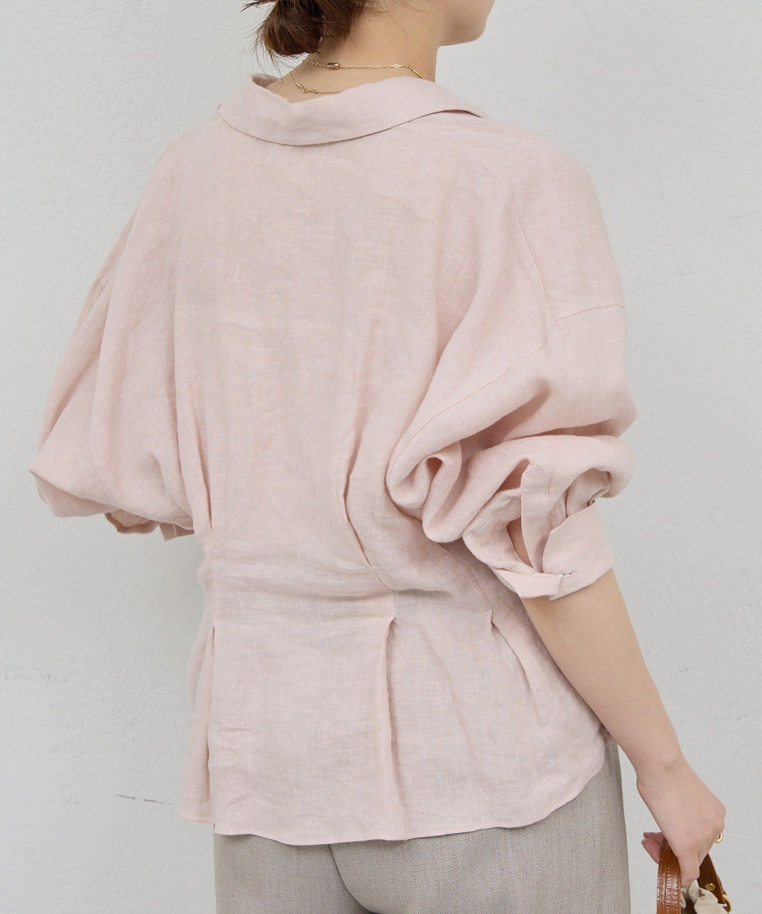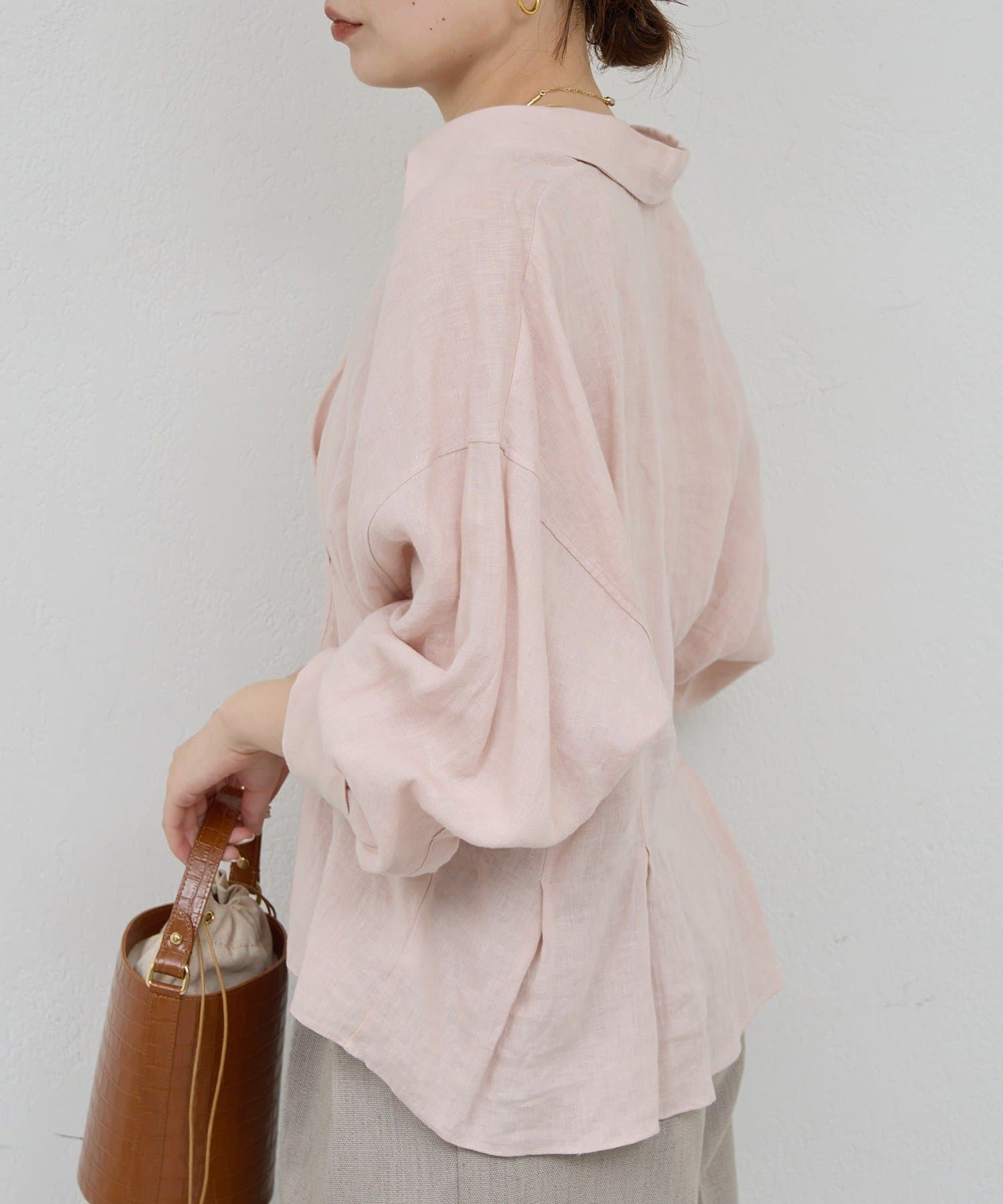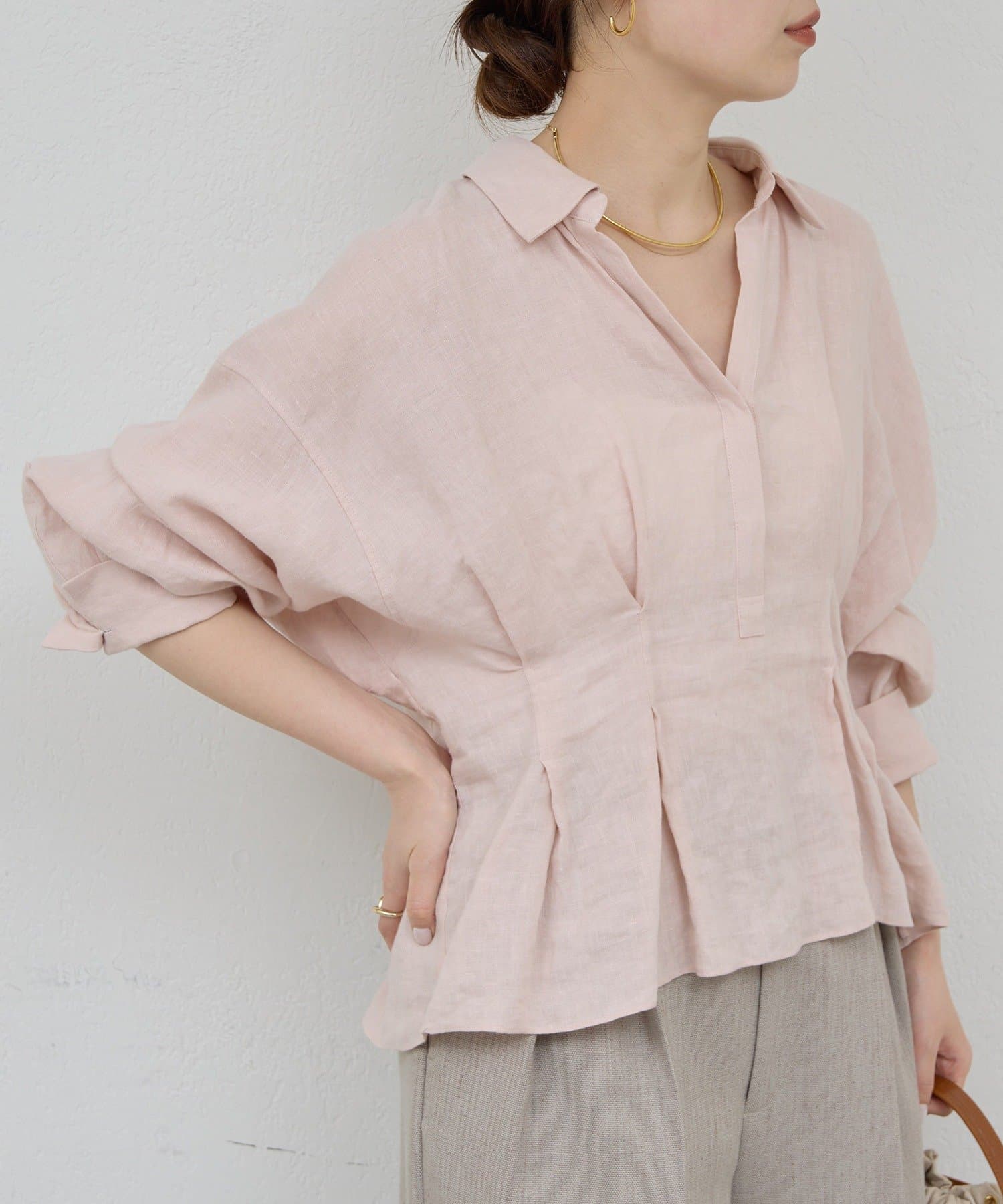 ウエストの絞りが可愛いです。パンツにもスカートにも合わせやすいです。リネン素材でも綺麗系になるのが嬉しいです。