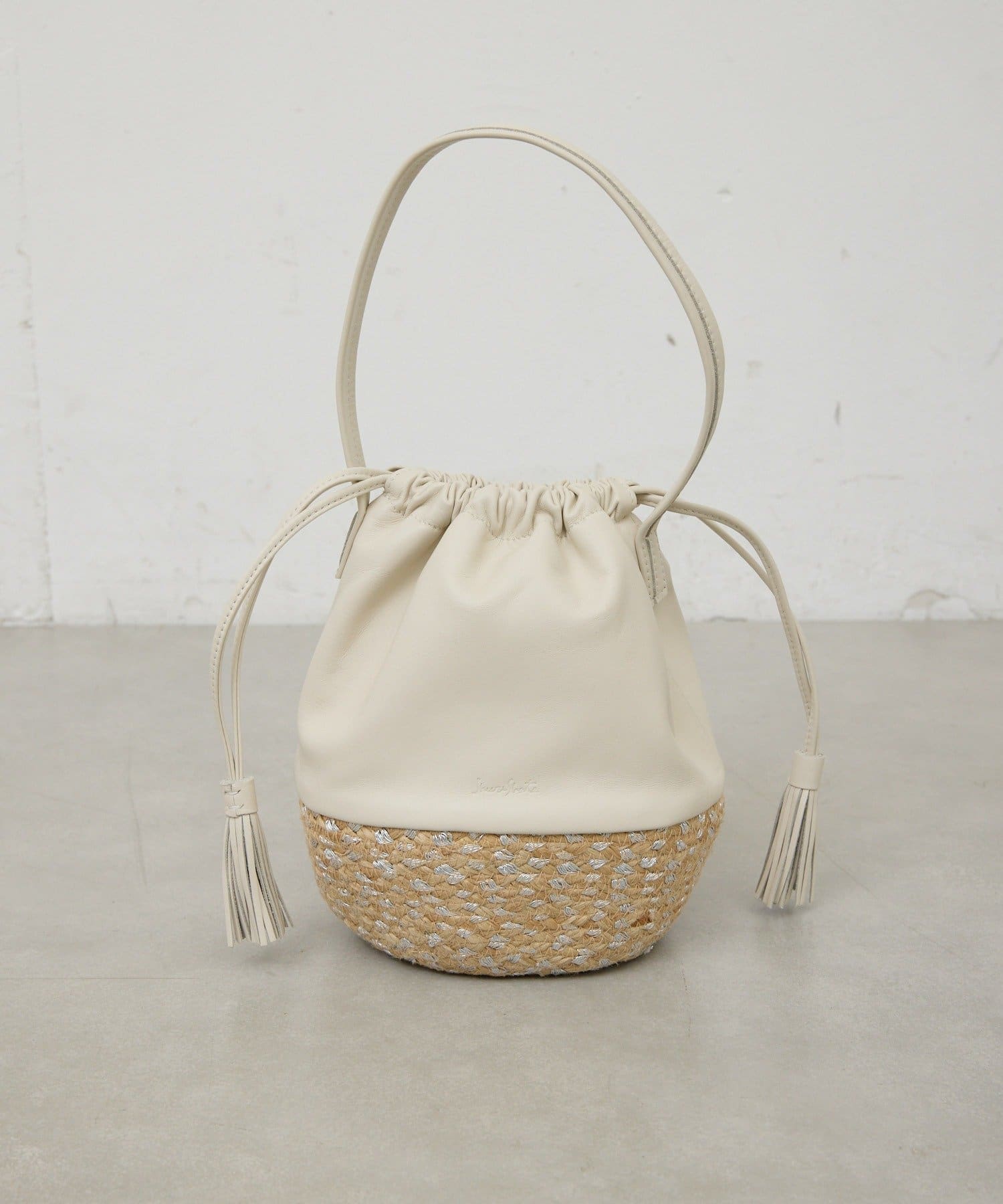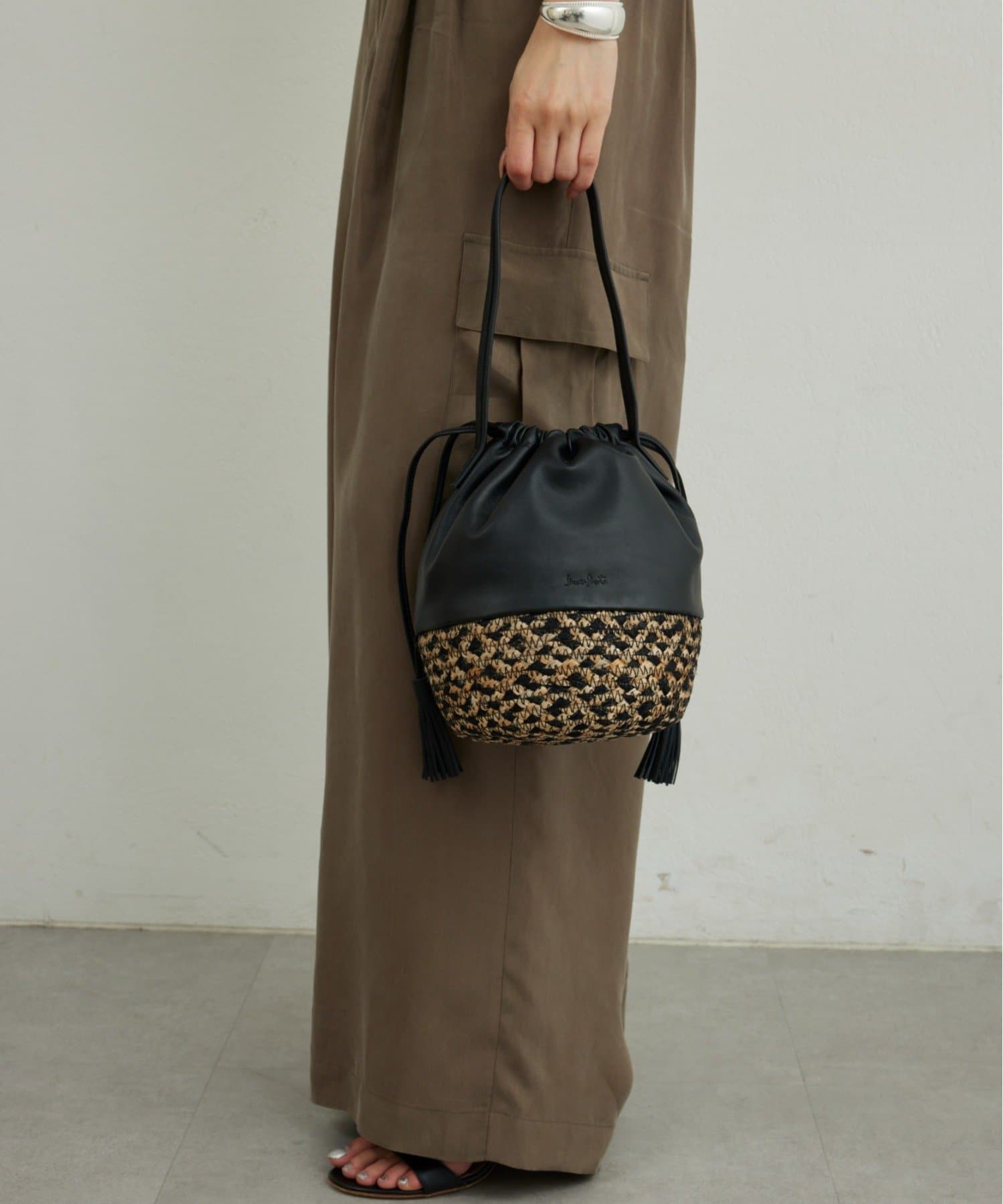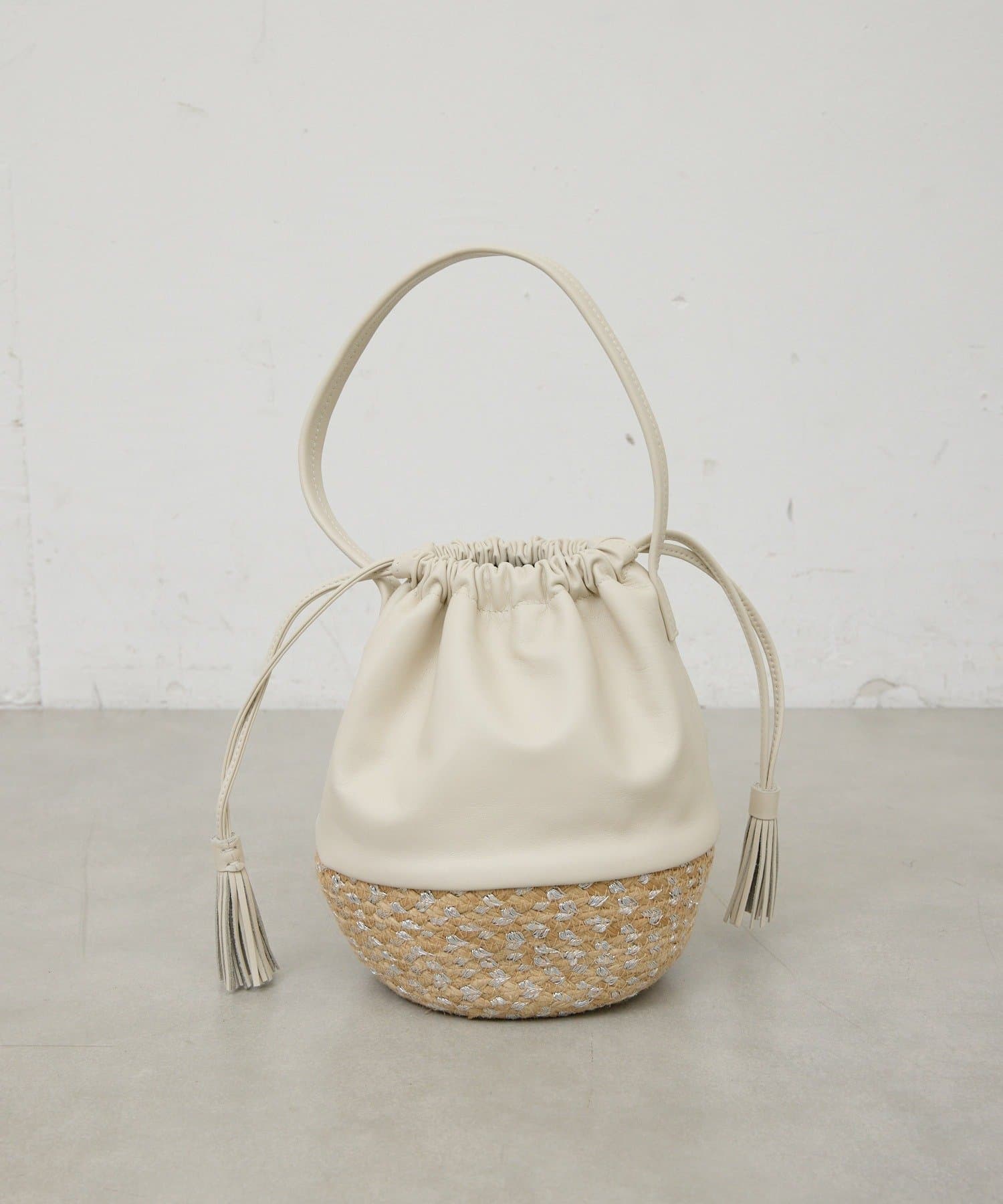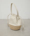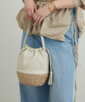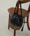 ●柔らかなレザーと丁寧に織られたかご素材を組み合わせた巾着型バッグ。