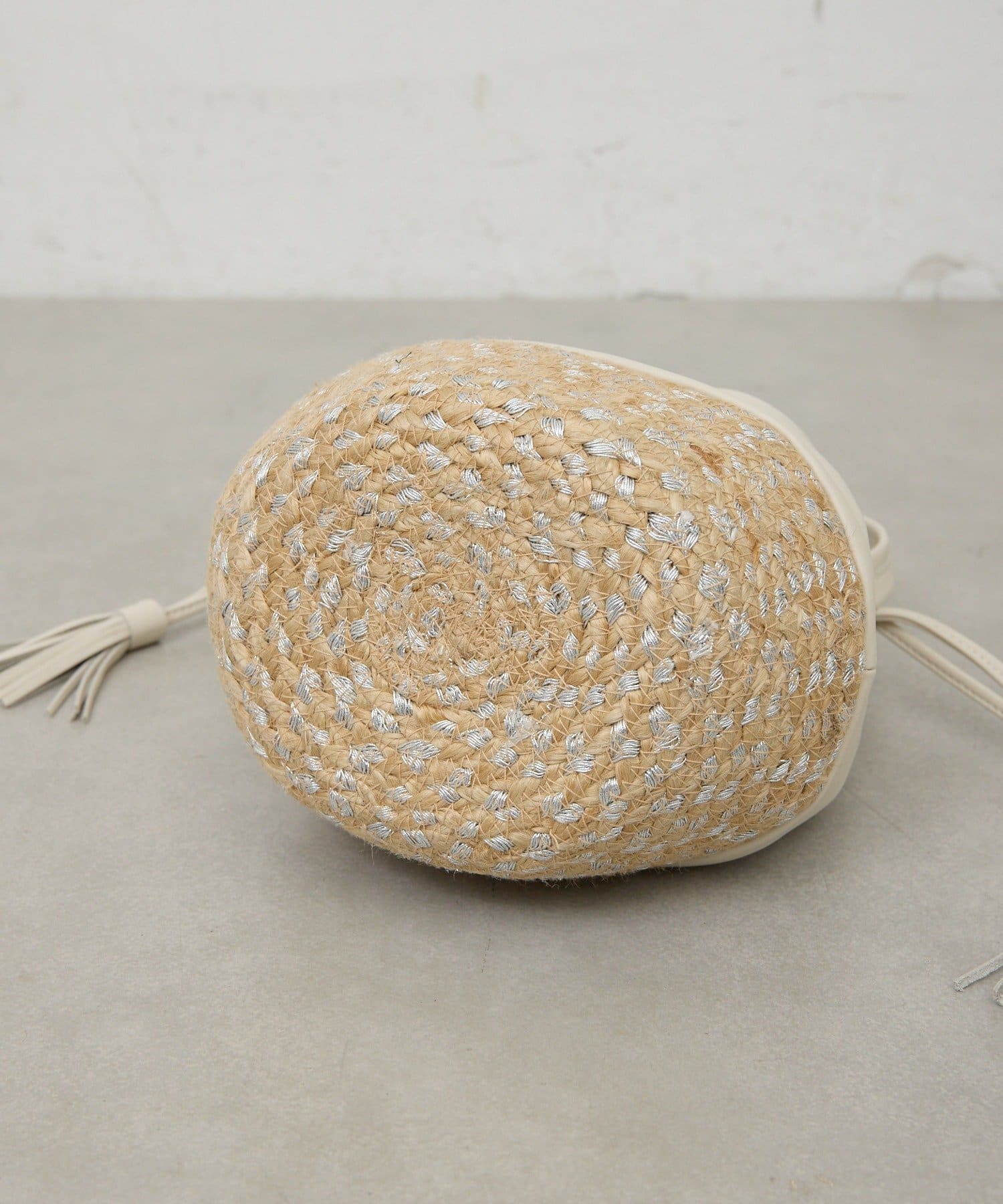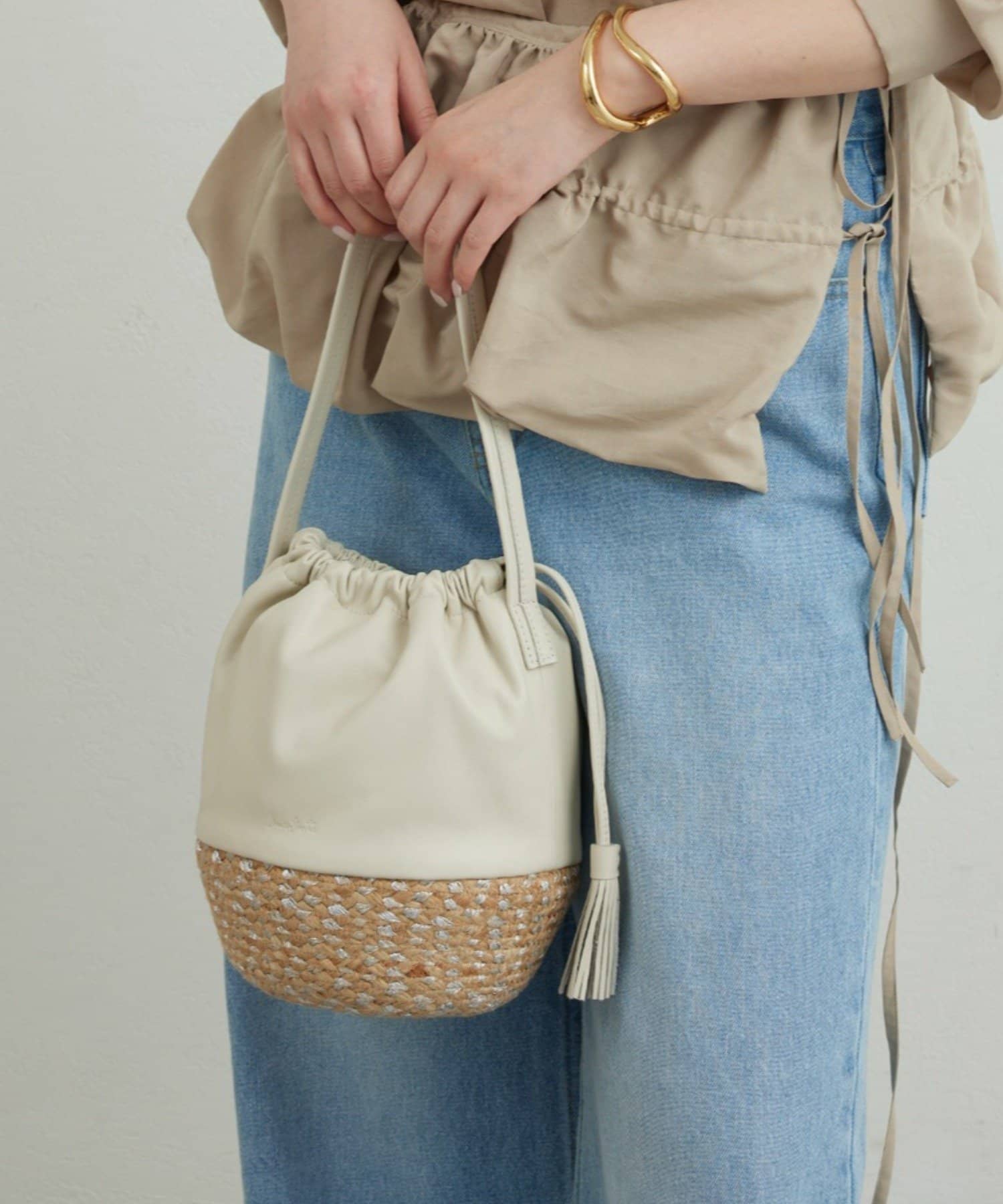 ●フリンジ付きの紐がバッグに動きを加え、シンプルなスタイリングにもこなれ感を演出。