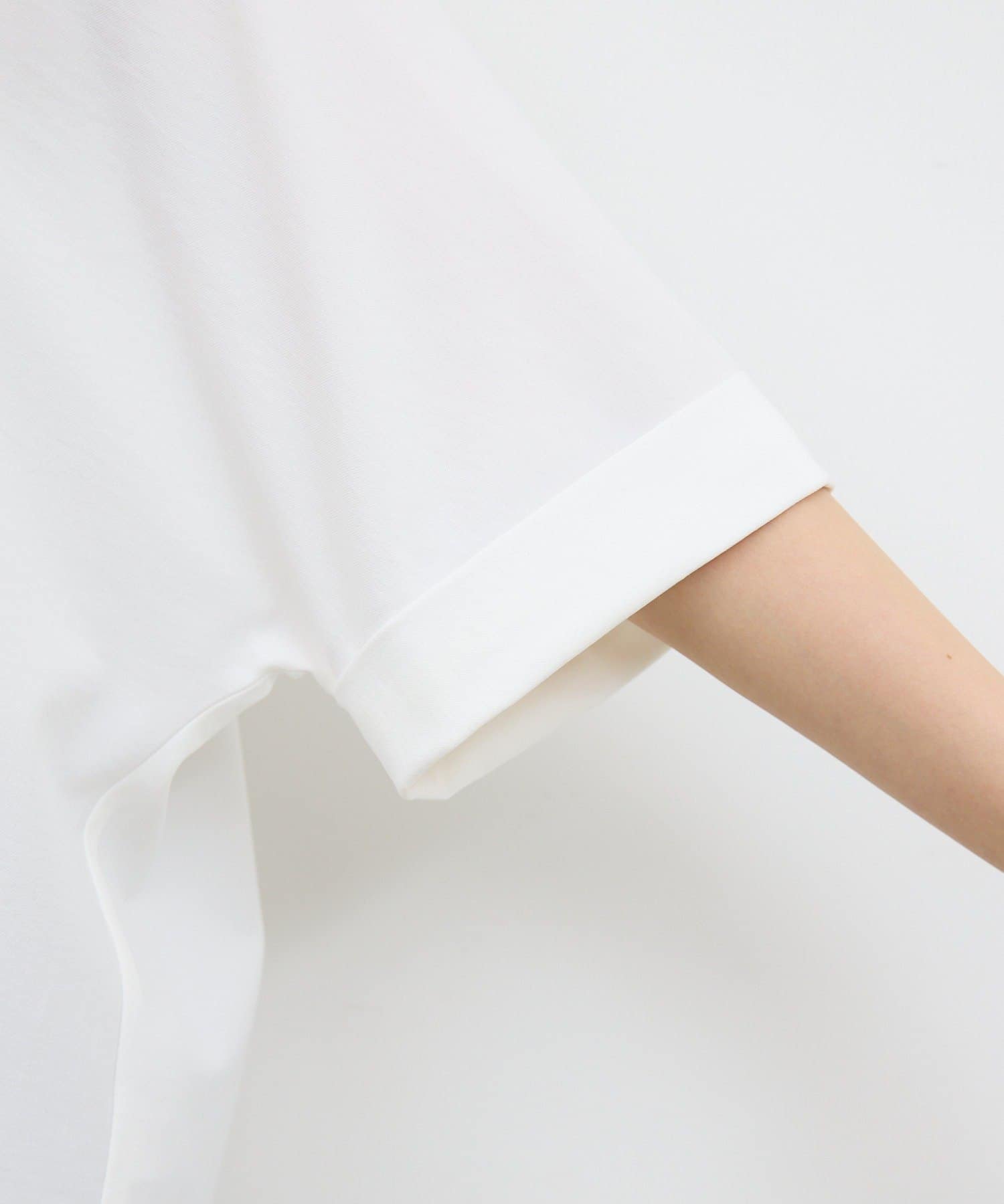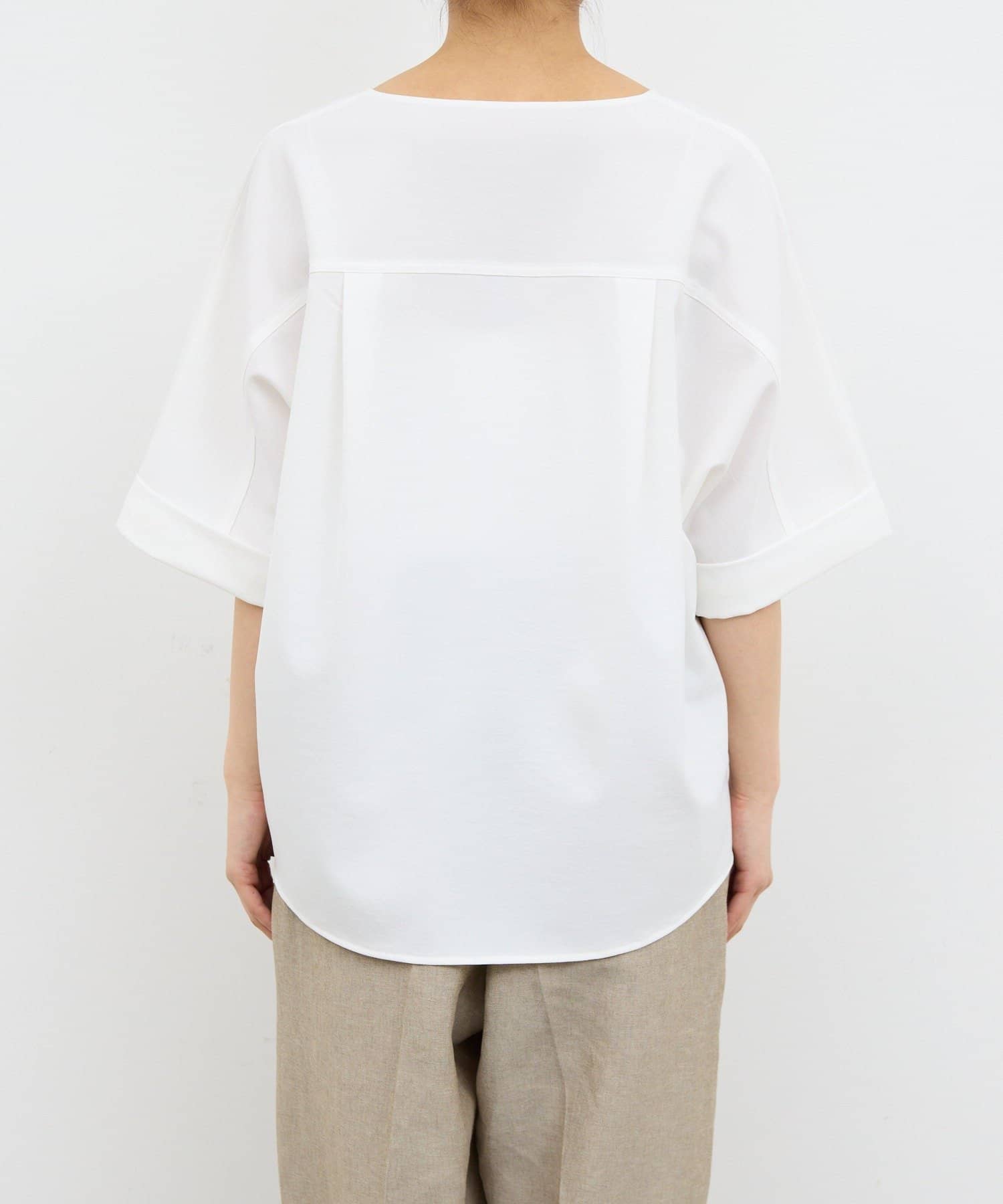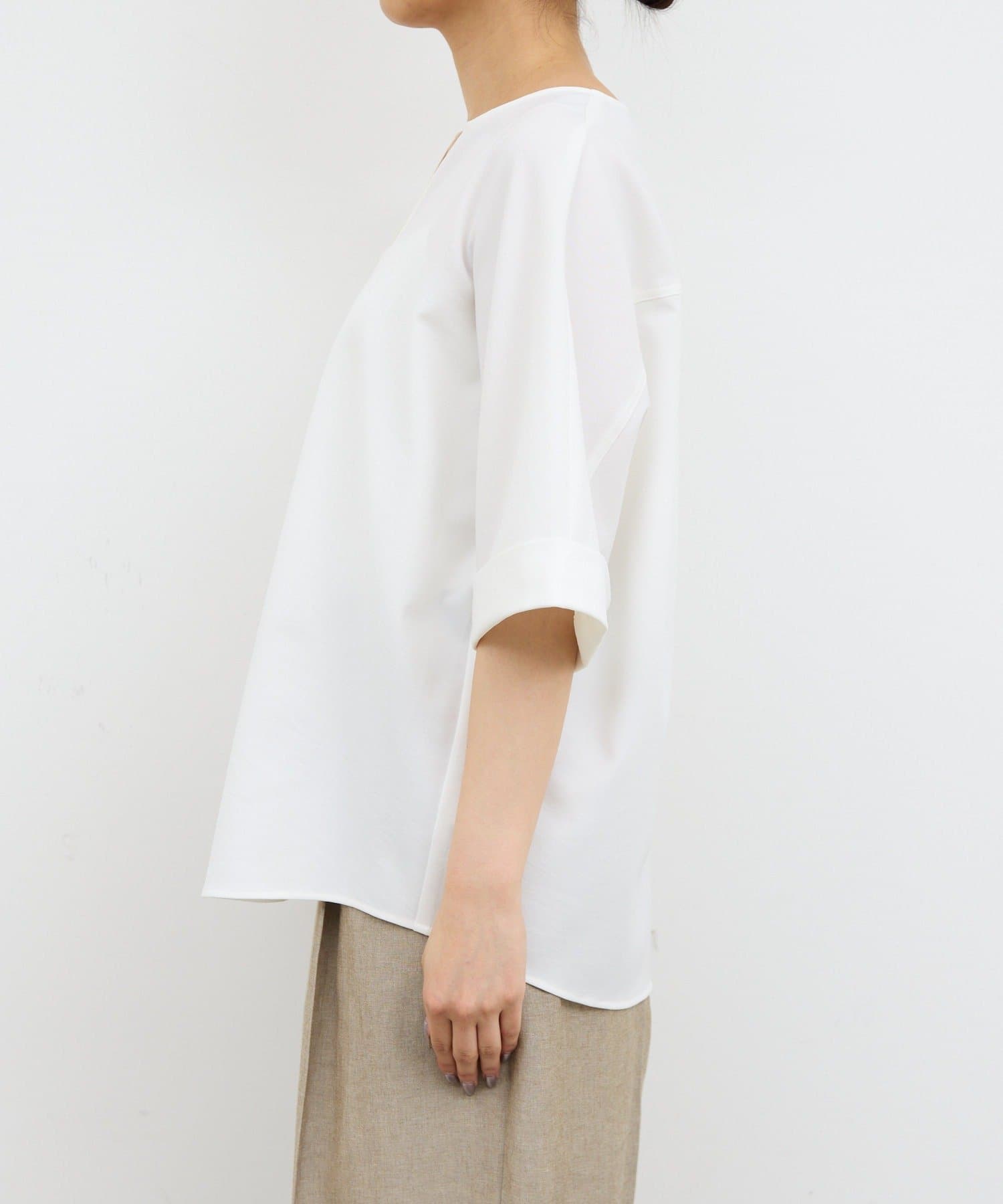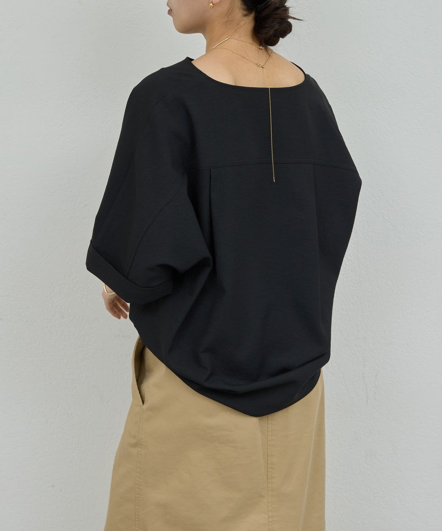 肩幅や二の腕、肘を自然にカバーしつつ、風通しの良いドルマンハーフスリーブ。