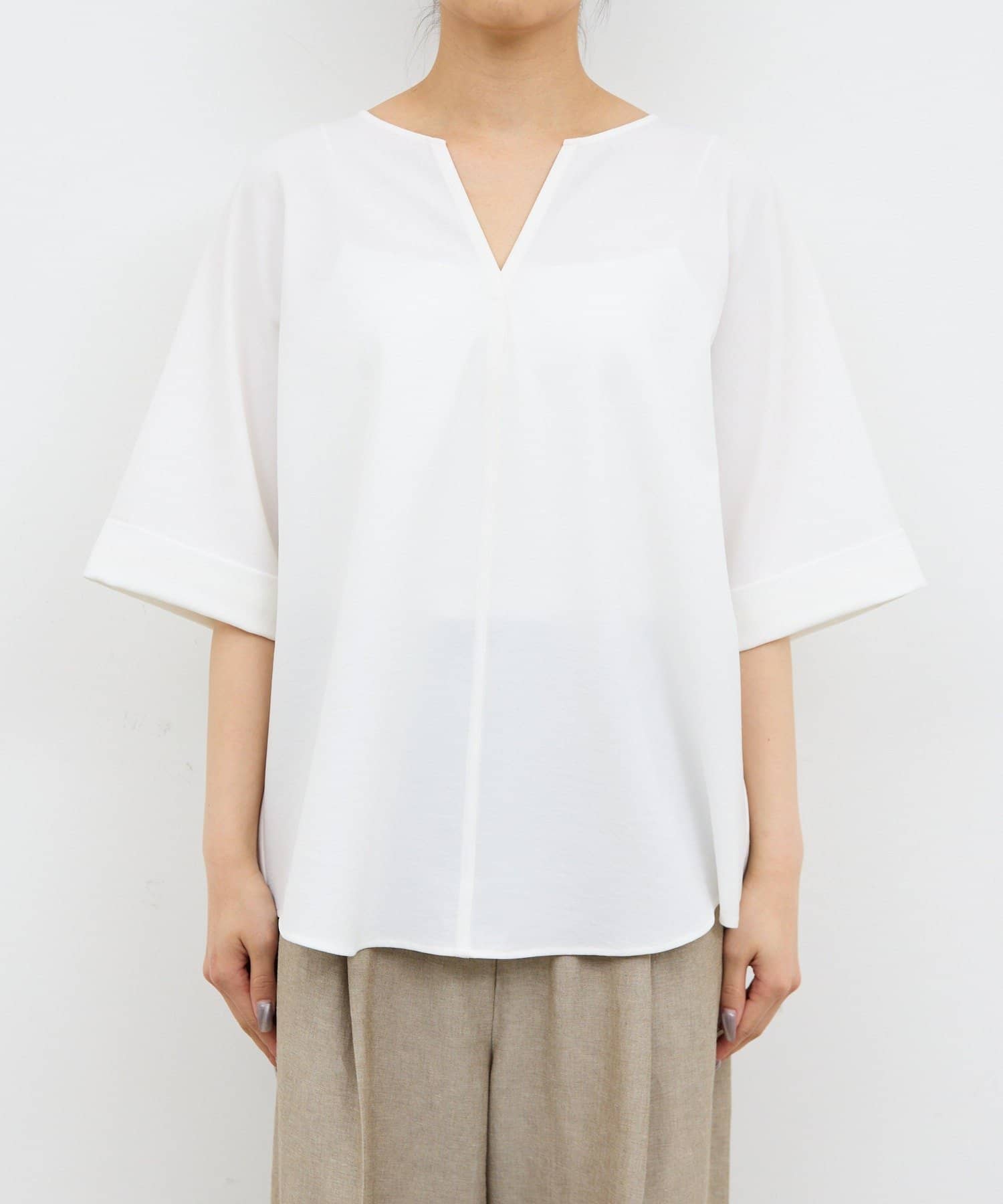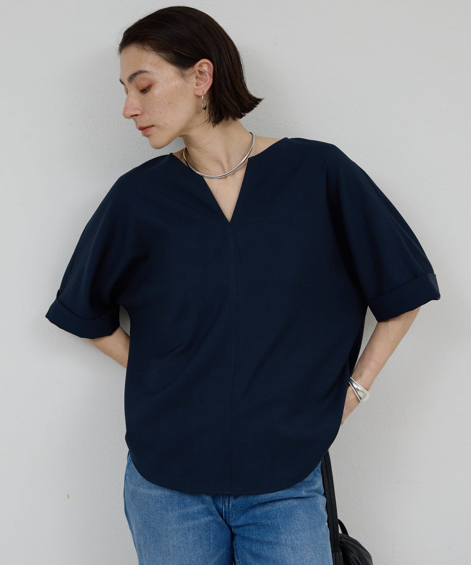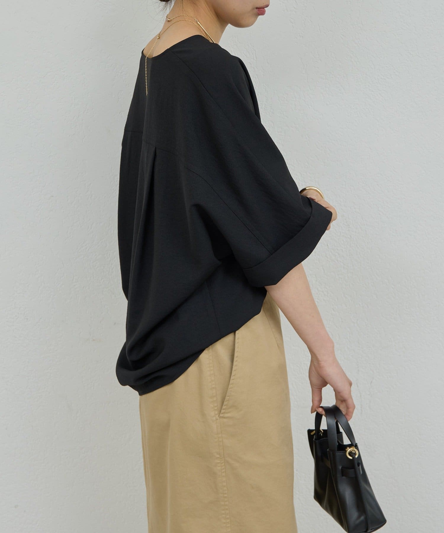 肩幅や二の腕、肘を自然にカバーしつつ、風通しの良いドルマンハーフスリーブ。