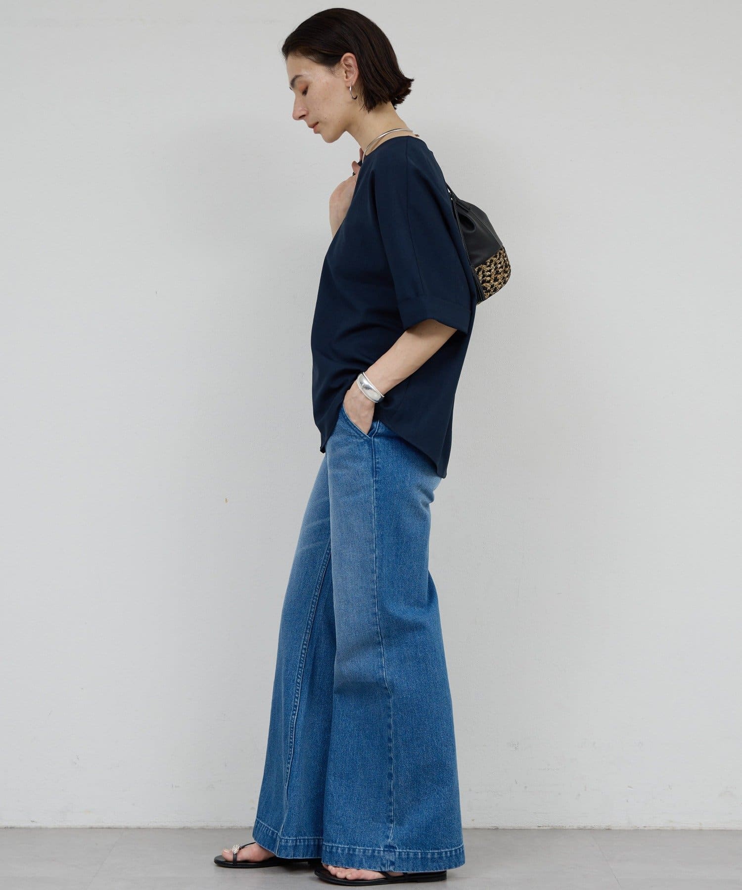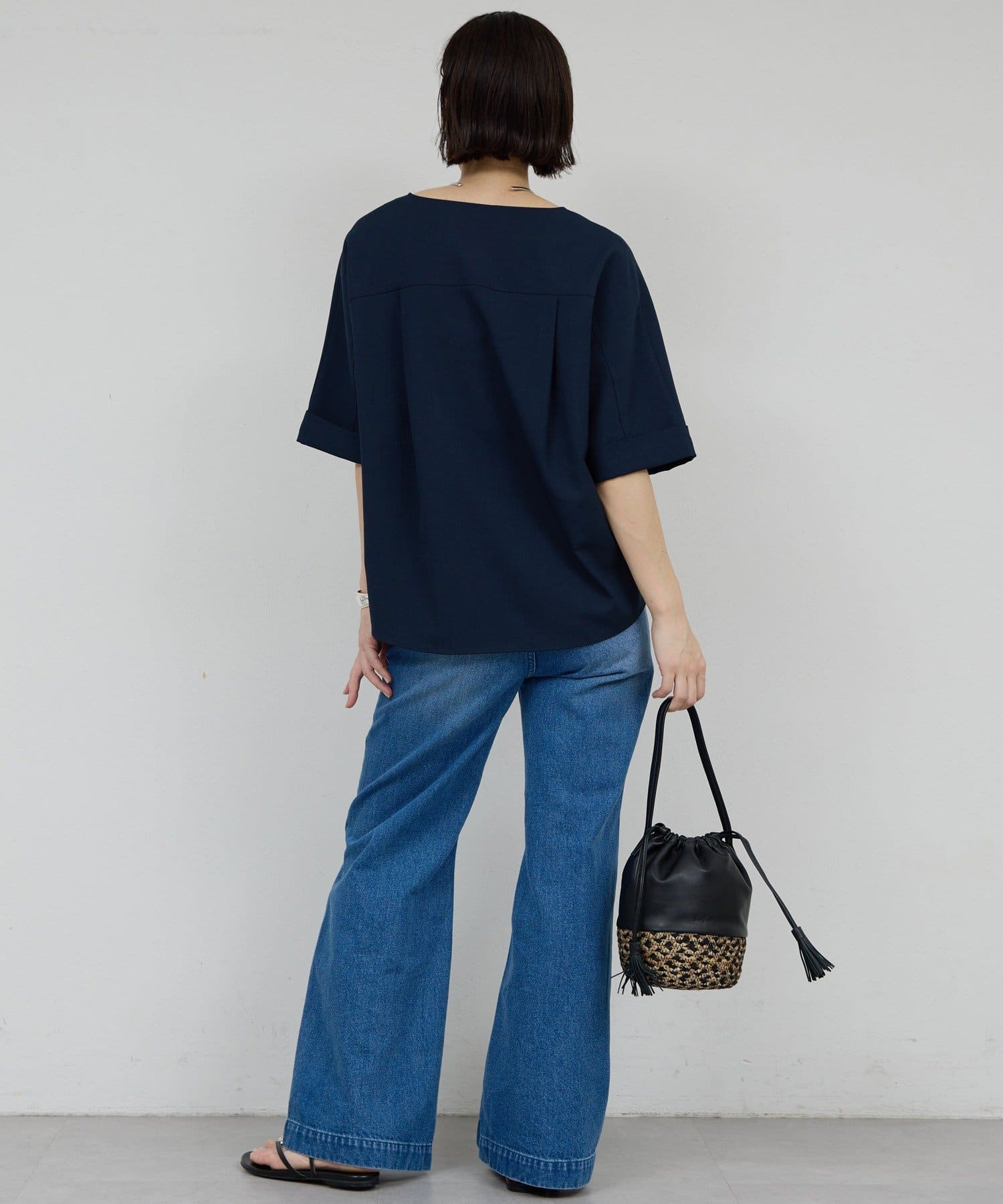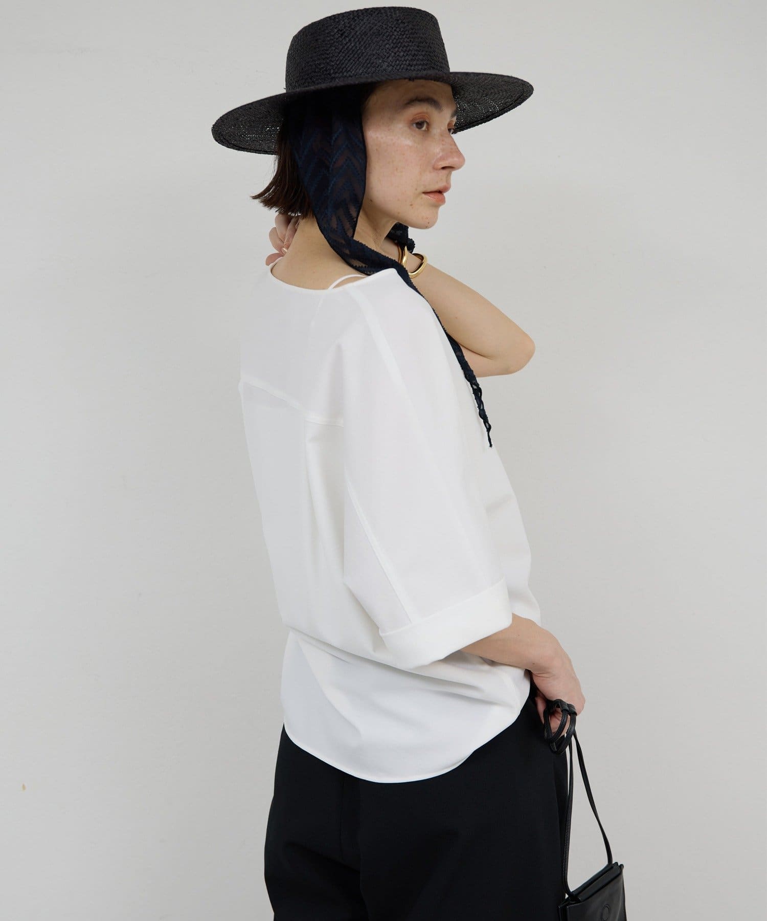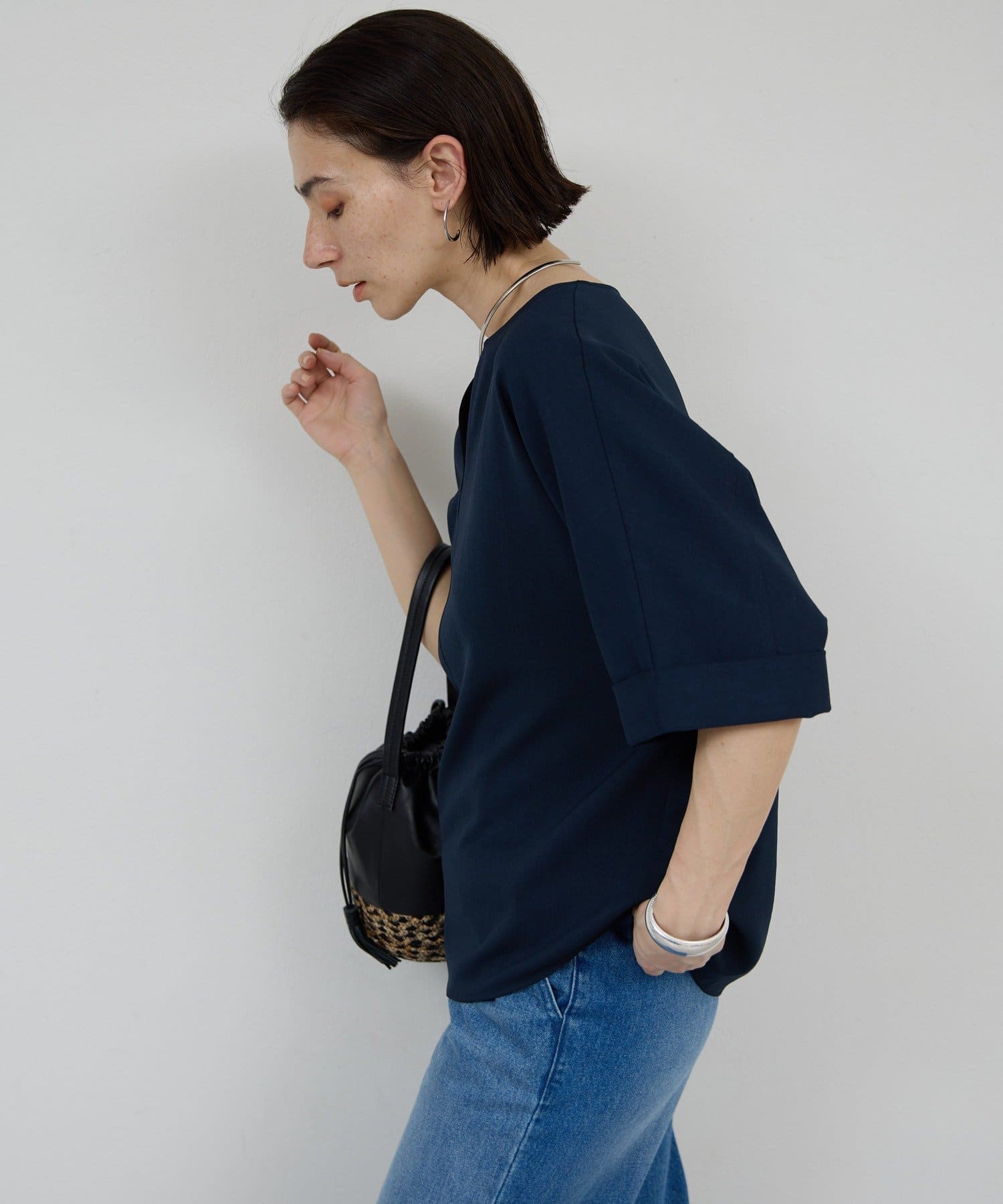 肩幅や二の腕、肘を自然にカバーしつつ、風通しの良いドルマンハーフスリーブ。
