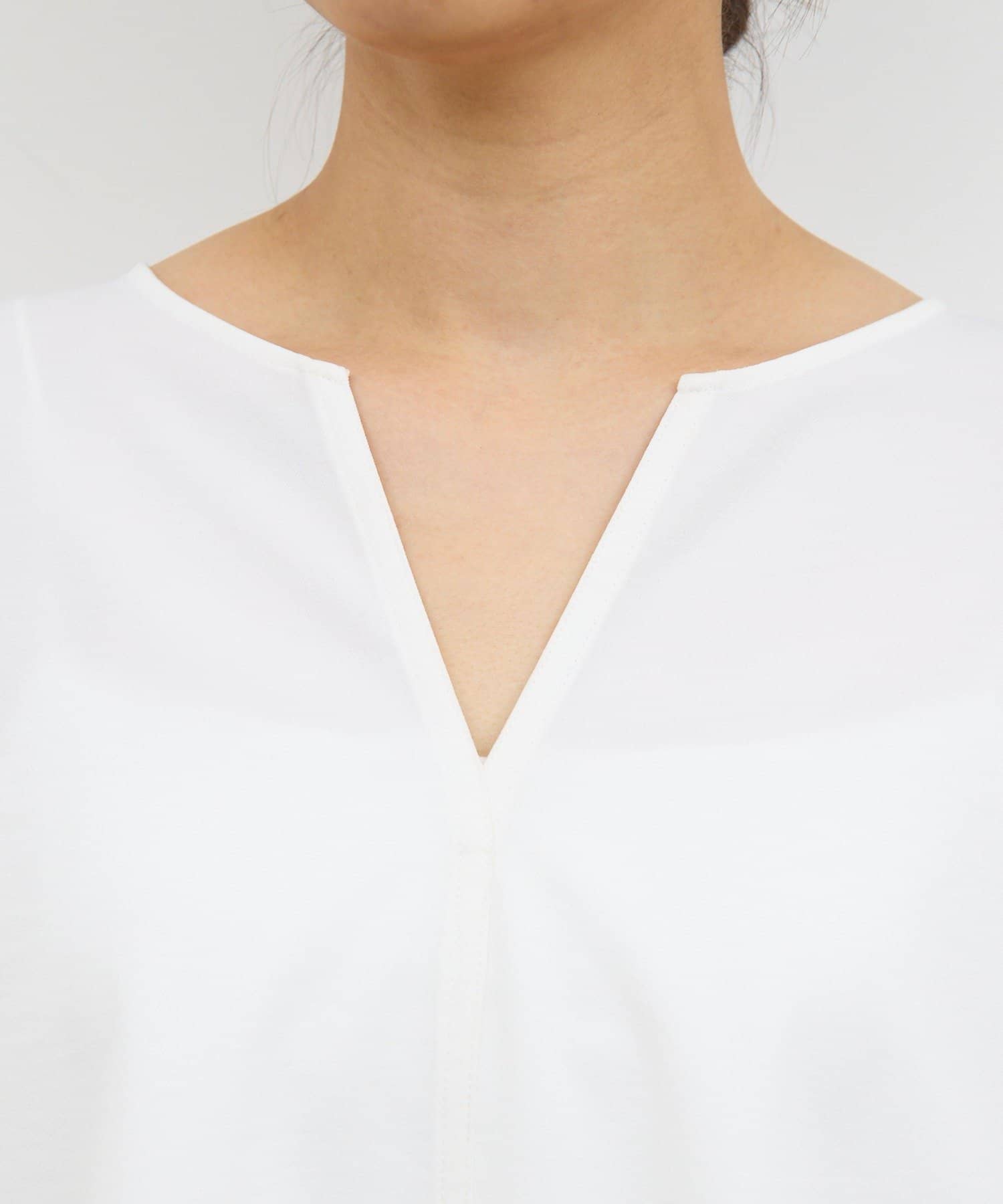 顔まわりがシャープに見えるスキッパーデザインのブラウス。