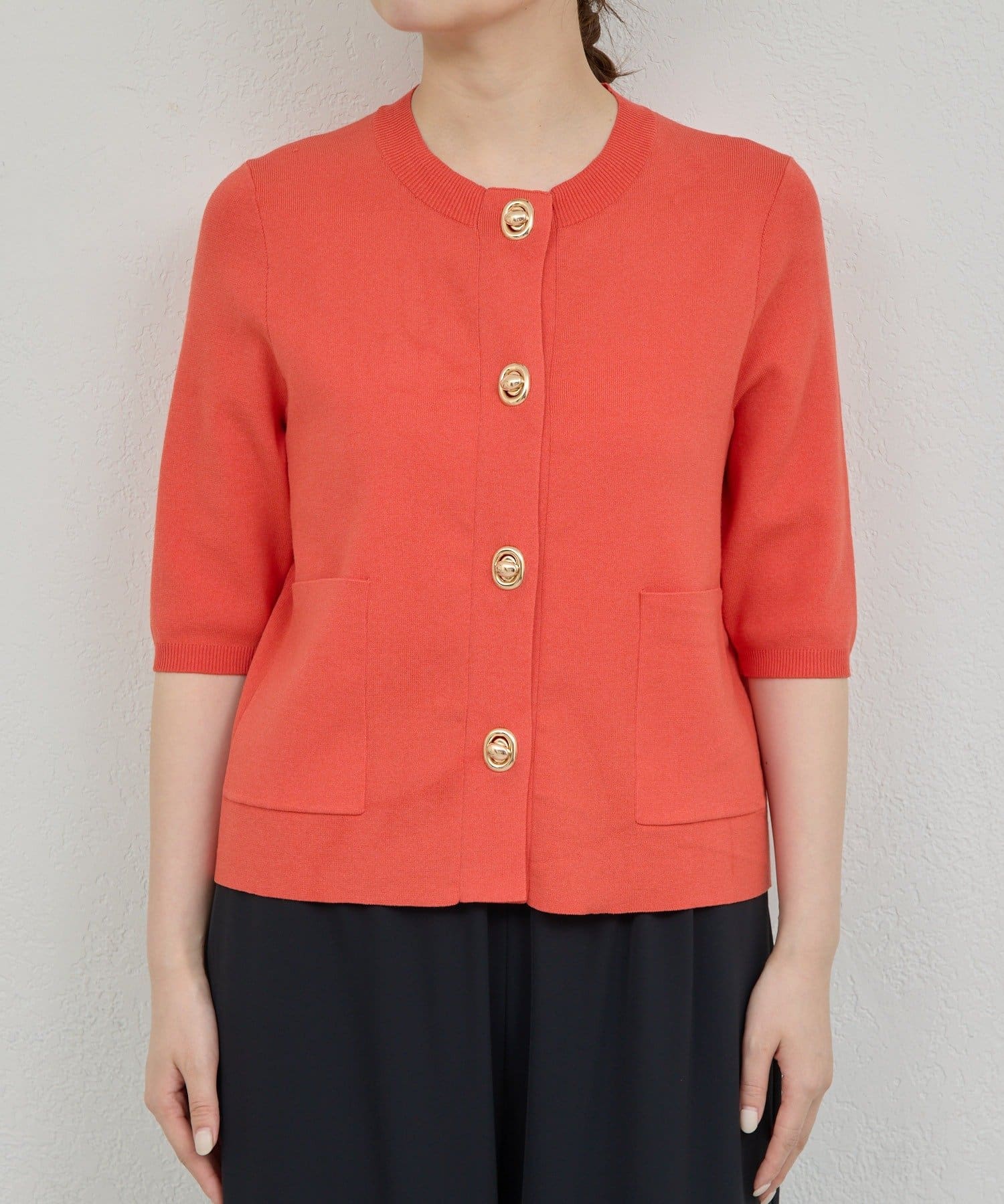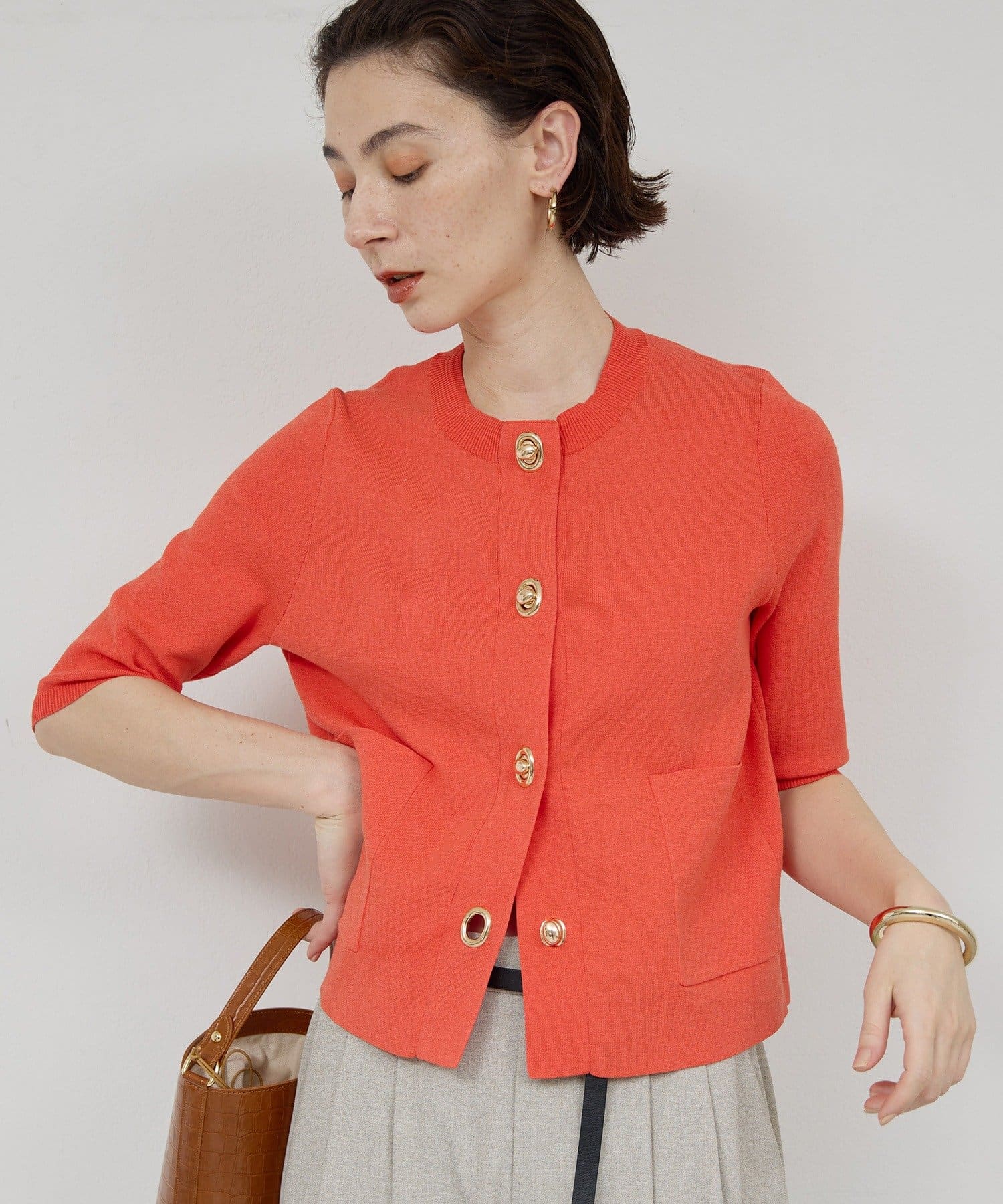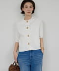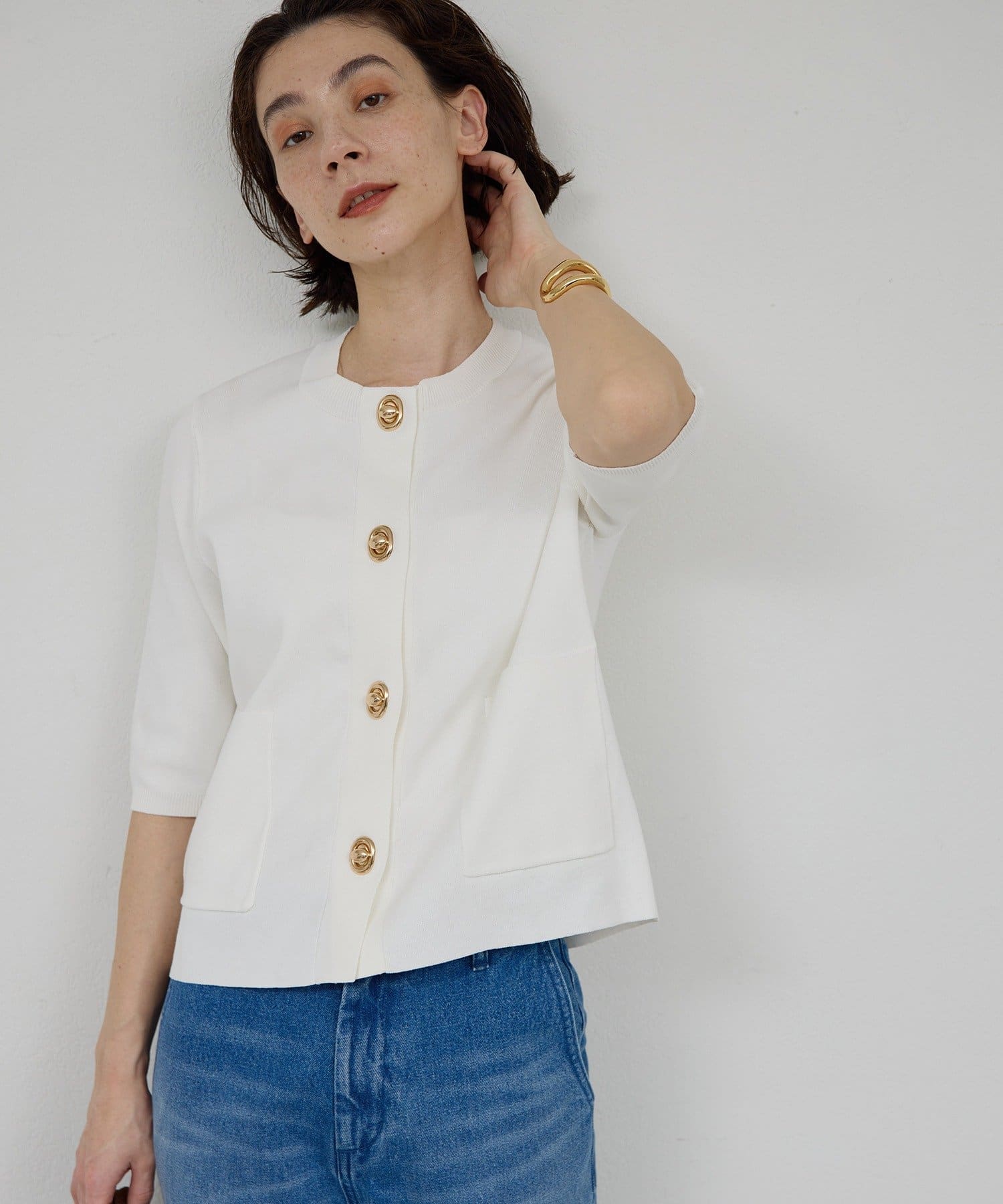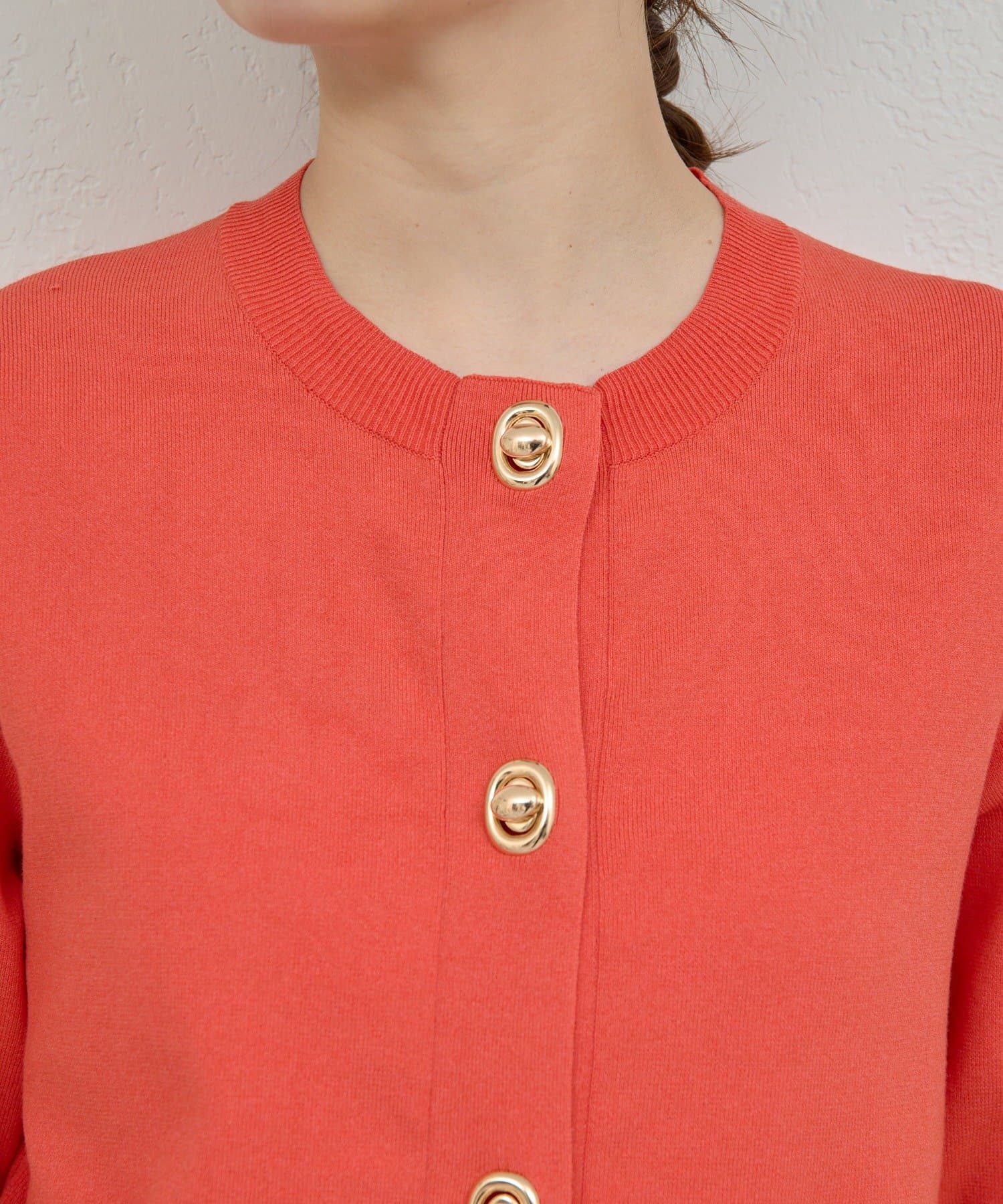 ●ゴールドのオーバルボタンが目を惹くカーディガン。