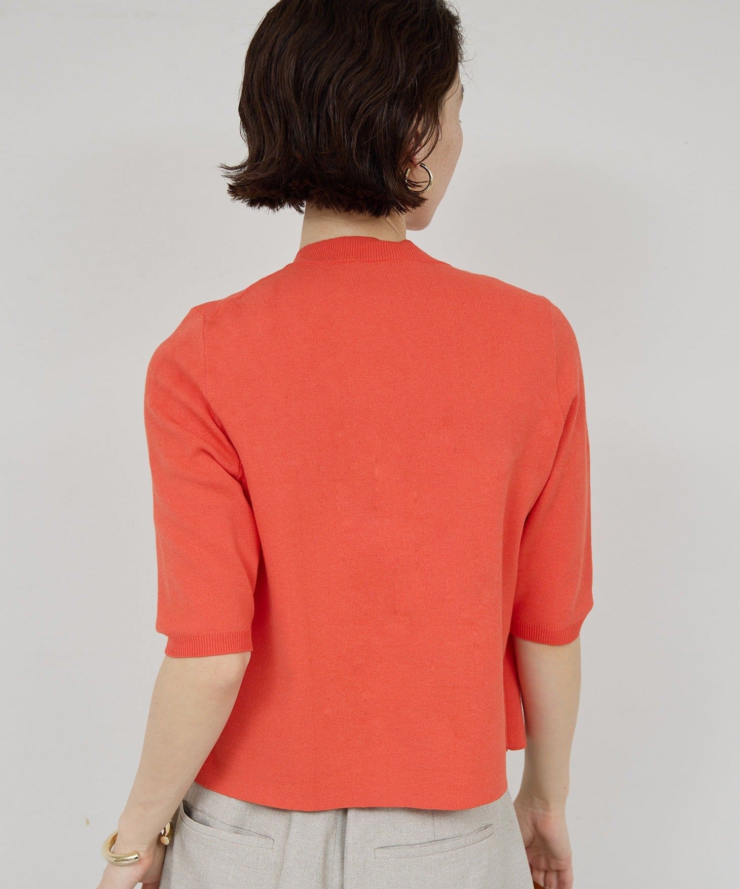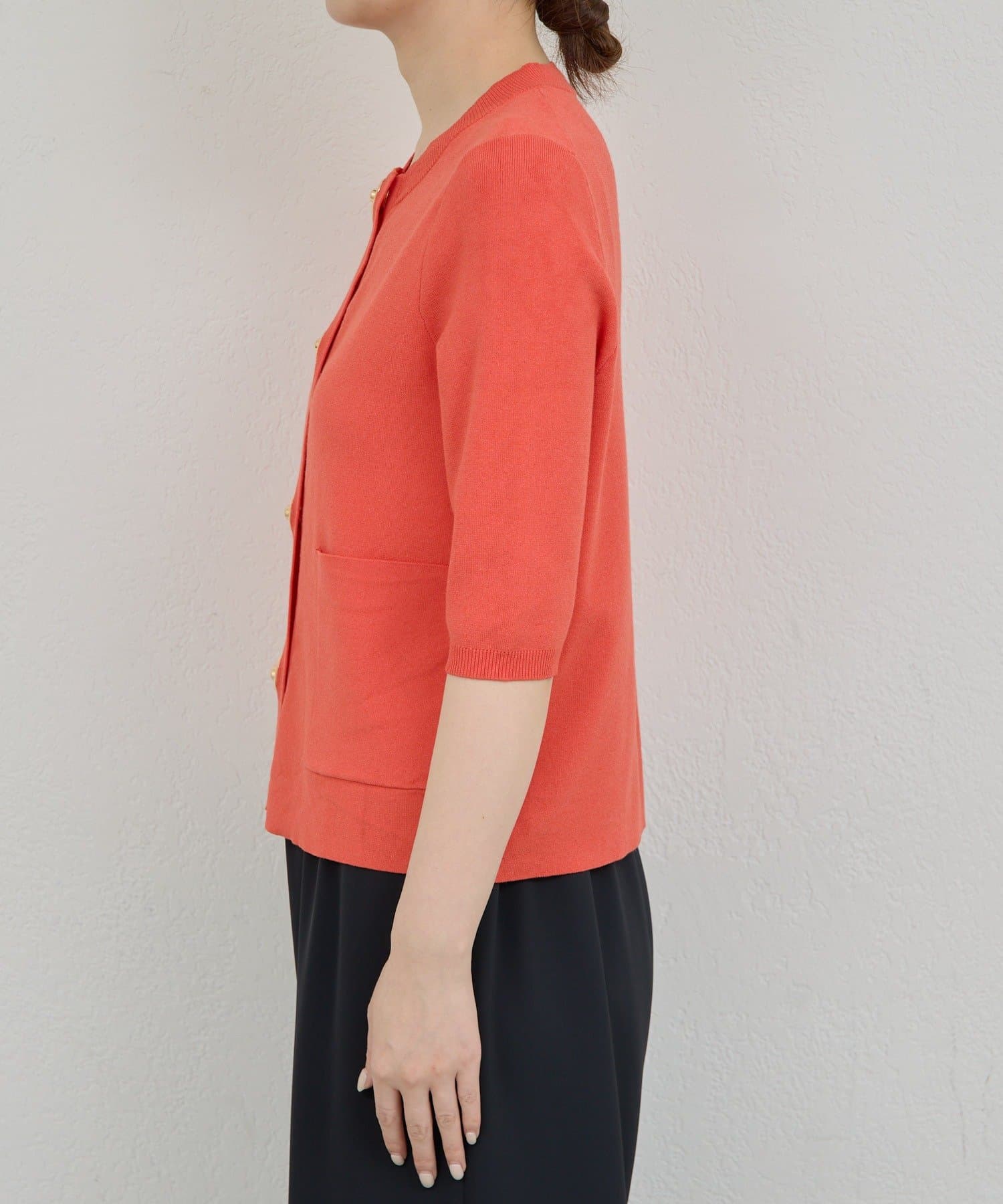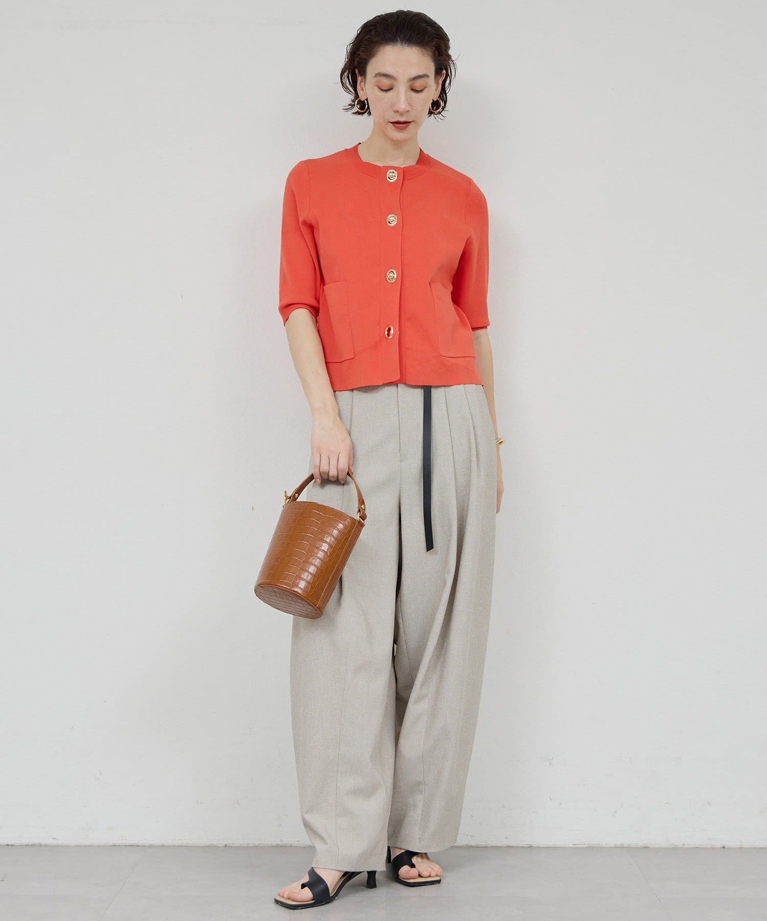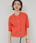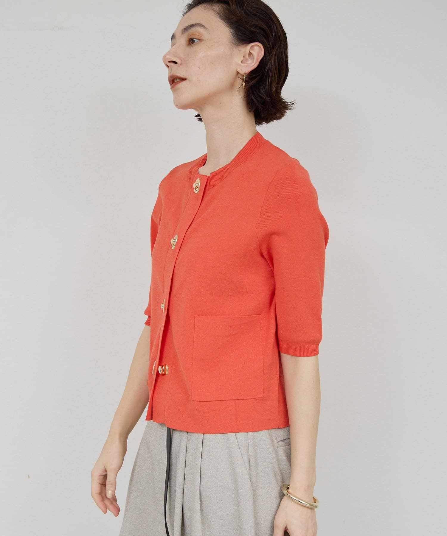 ●ゴールドのオーバルボタンが目を惹くカーディガン。