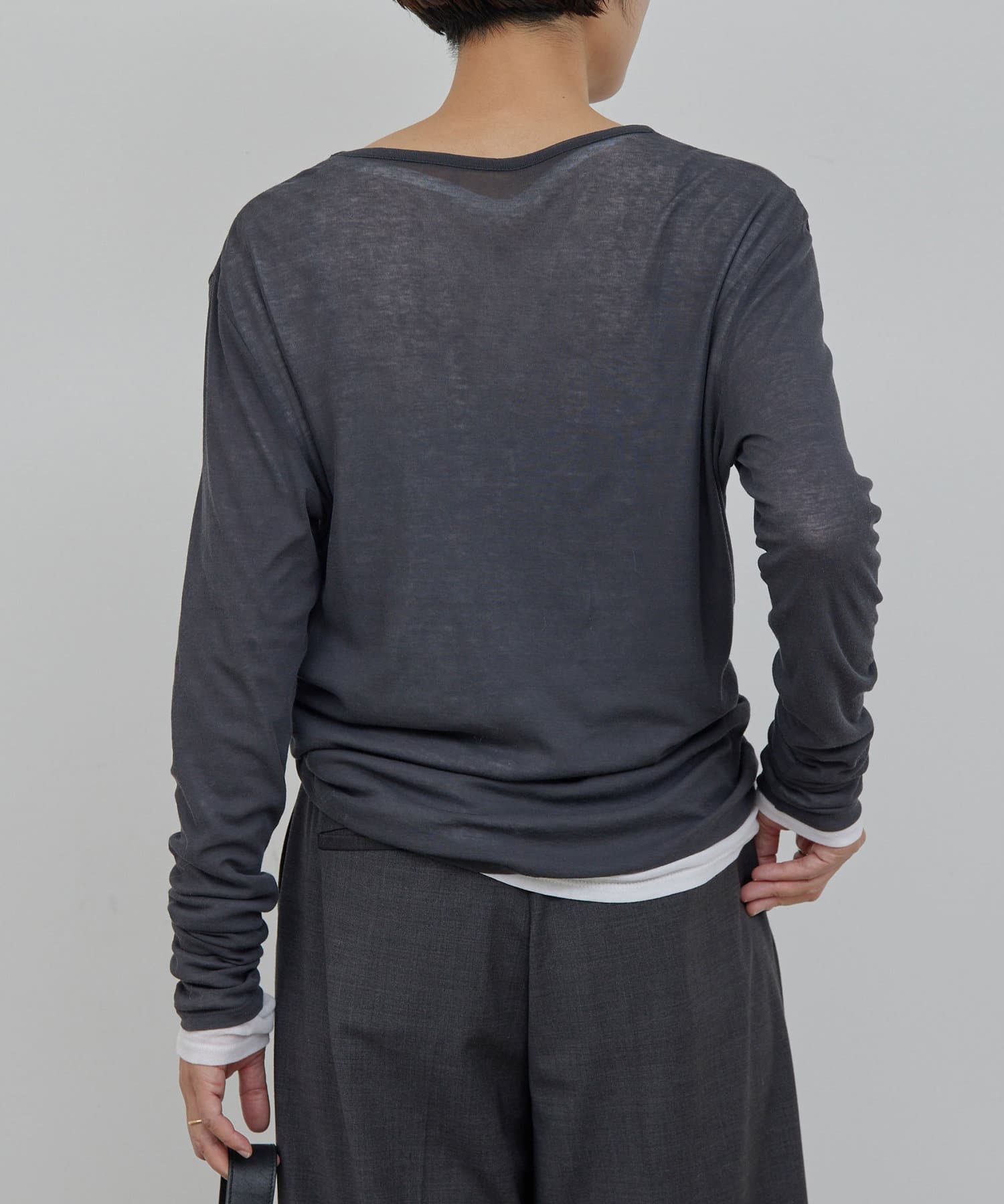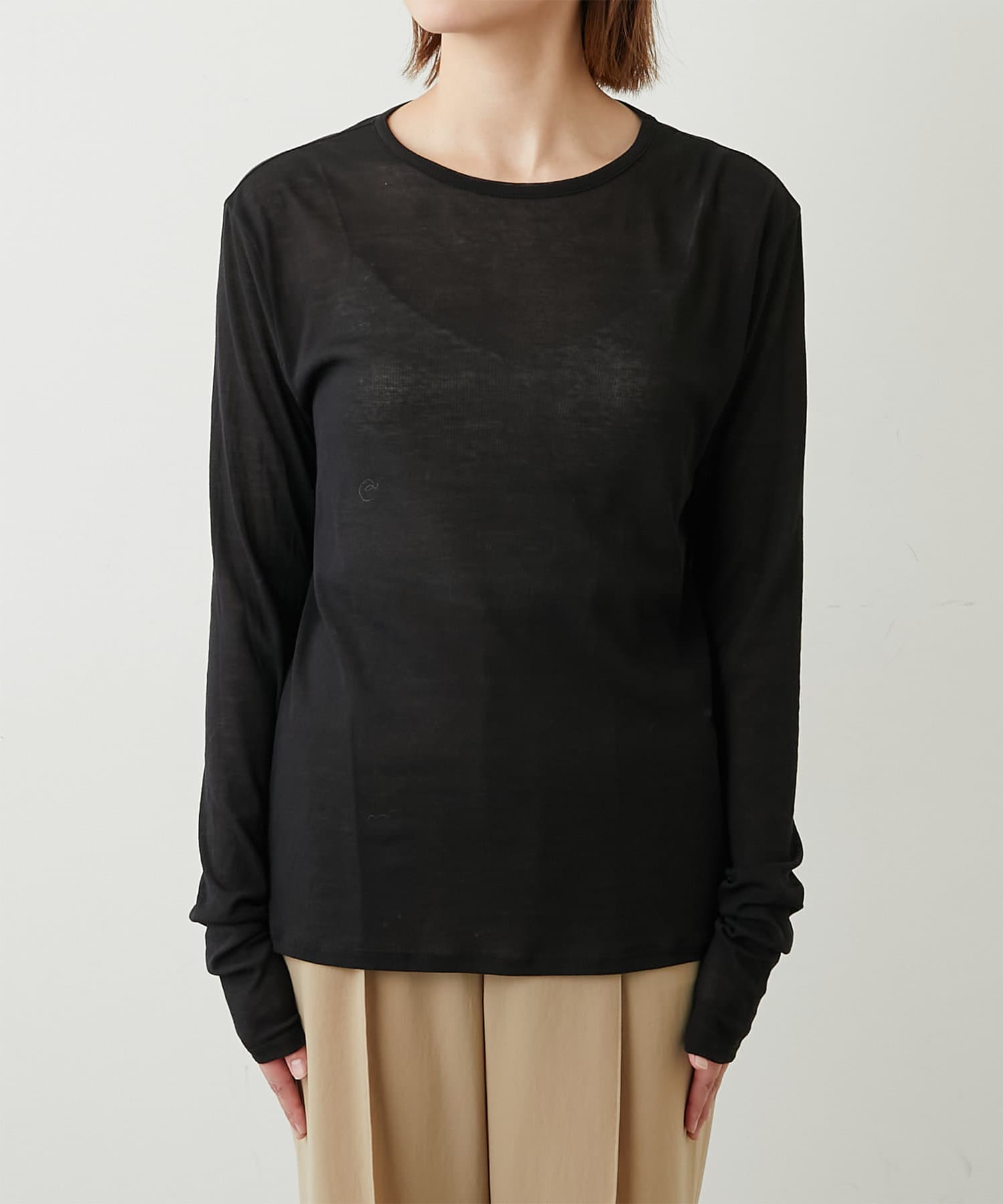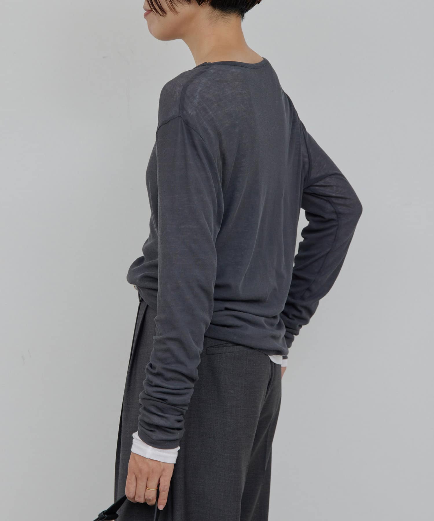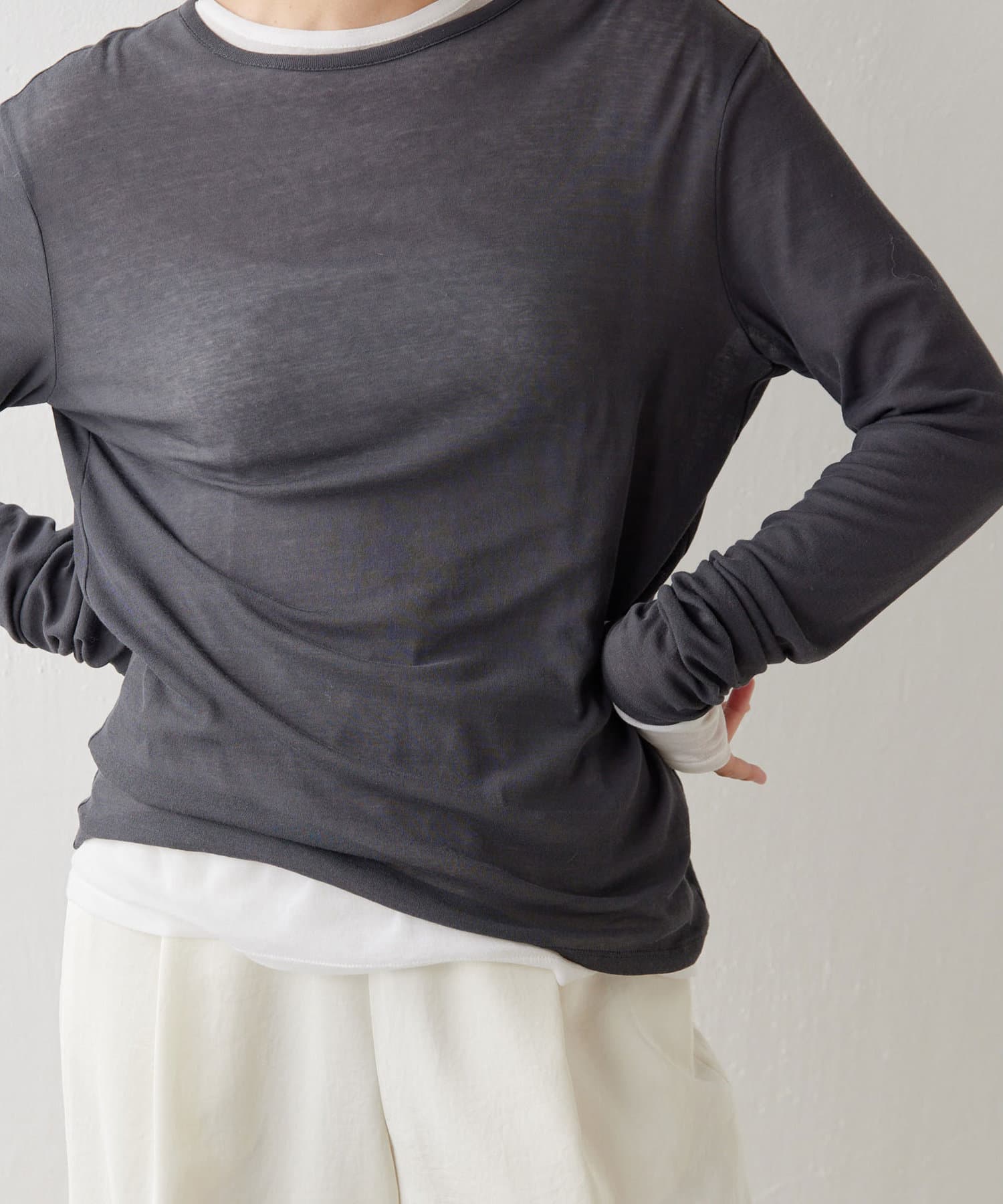 購入場所:店舗一枚で着ると透け感が気になると思いますが、袖口だけ出すなどのレイヤードに重宝しそうです。ブラック、グレーも購入しており、比べると透け感や柔らかさに抵抗があったのですが、これはこれでありかなと思いなおしました。