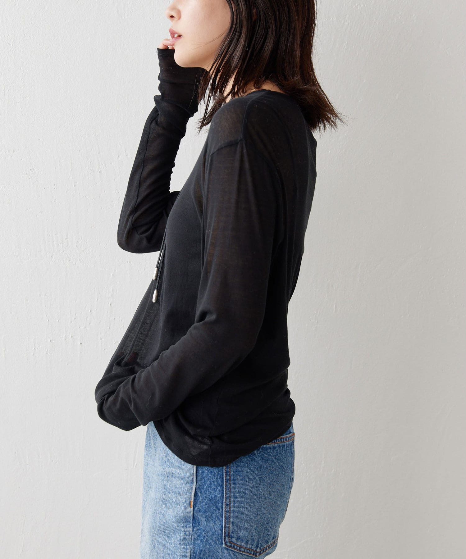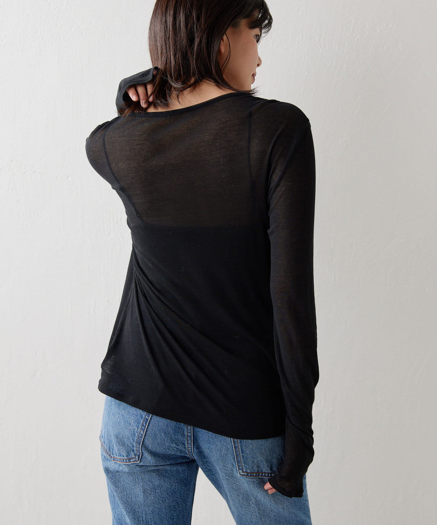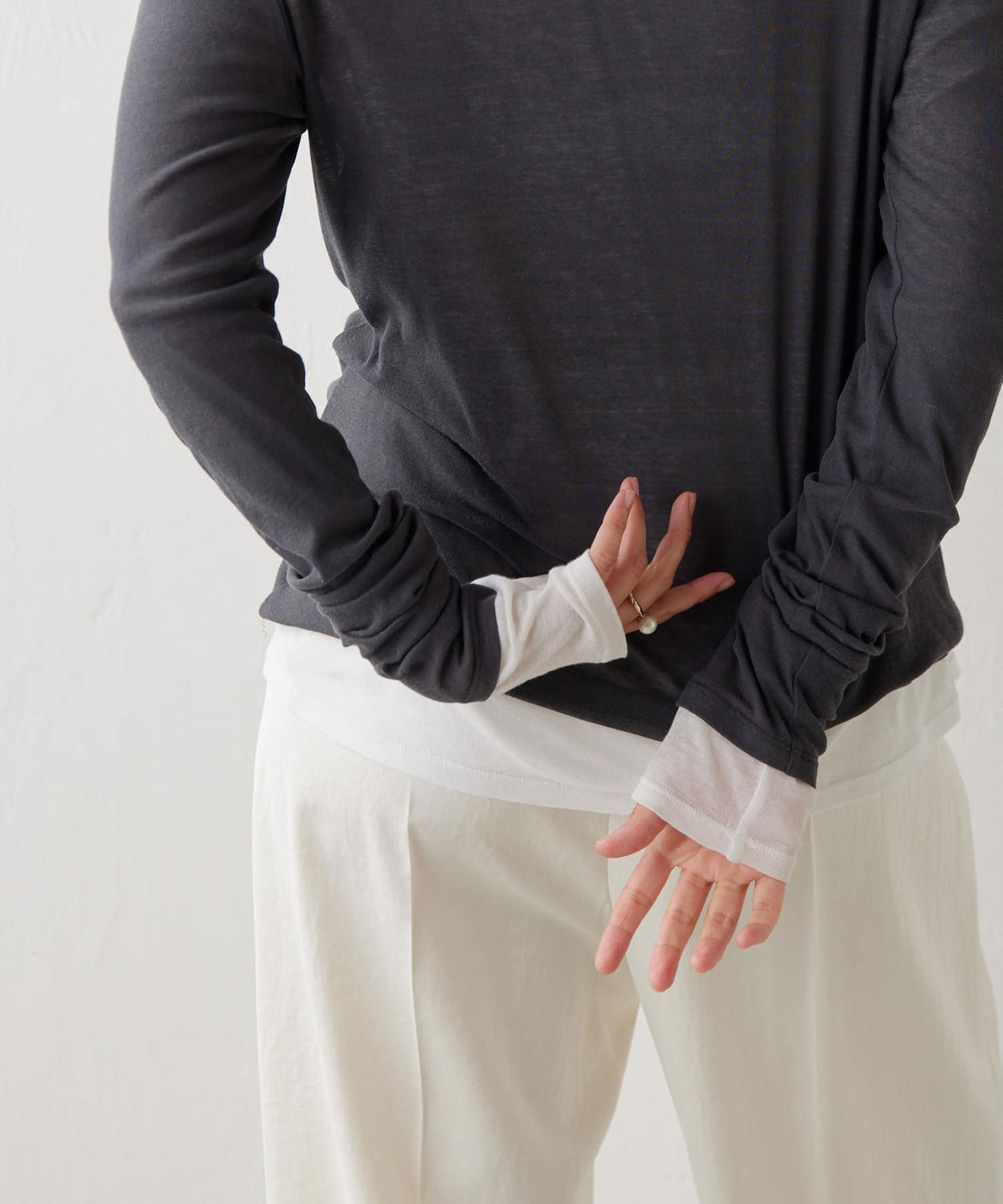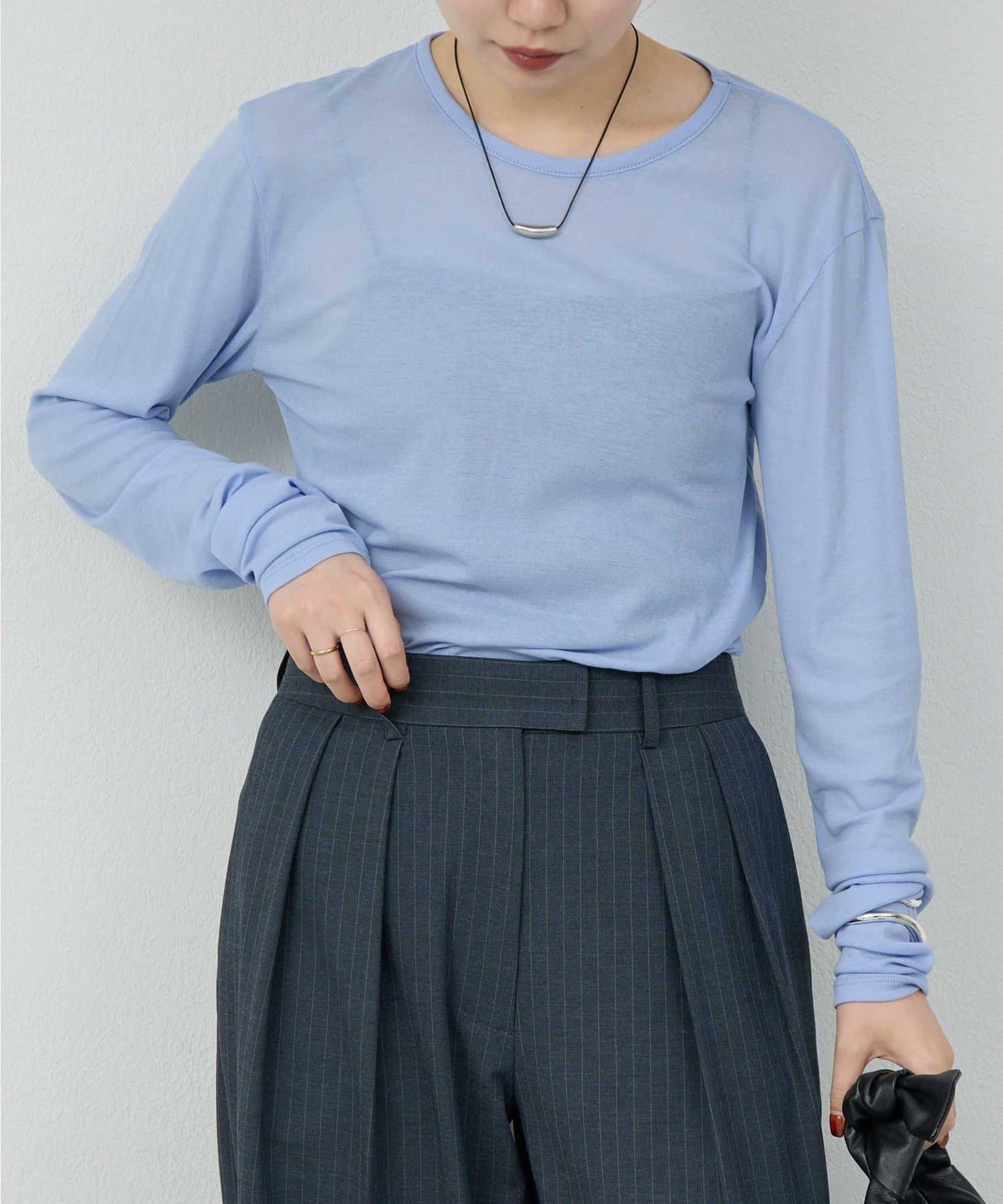 購入場所:店舗一枚で着ると透け感が気になると思いますが、袖口だけ出すなどのレイヤードに重宝しそうです。ブラック、グレーも購入しており、比べると透け感や柔らかさに抵抗があったのですが、これはこれでありかなと思いなおしました。