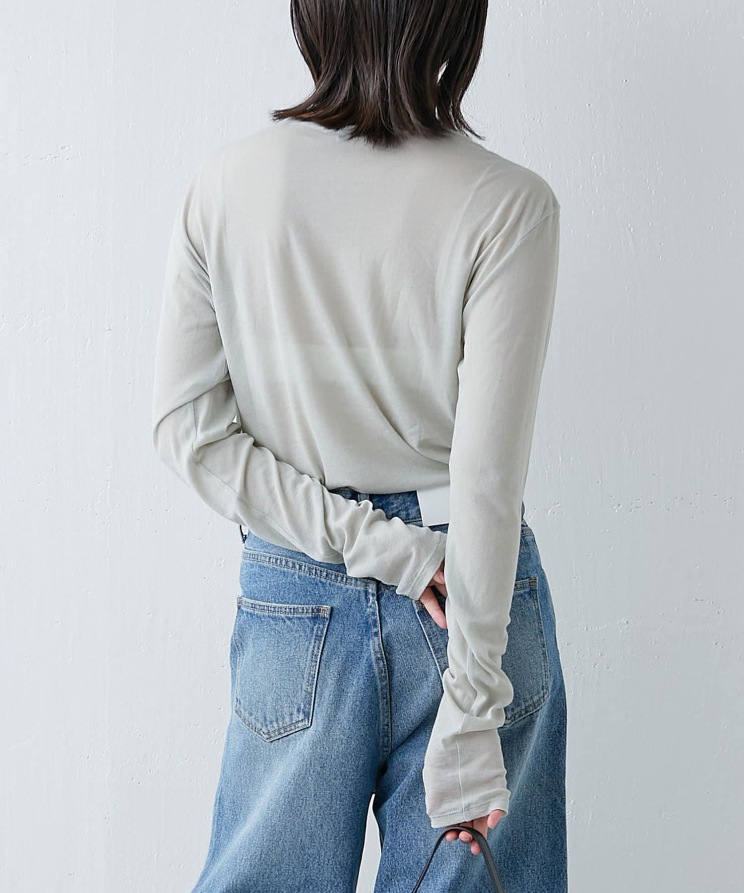 購入場所:店舗一枚で着ると透け感が気になると思いますが、袖口だけ出すなどのレイヤードに重宝しそうです。ブラック、グレーも購入しており、比べると透け感や柔らかさに抵抗があったのですが、これはこれでありかなと思いなおしました。