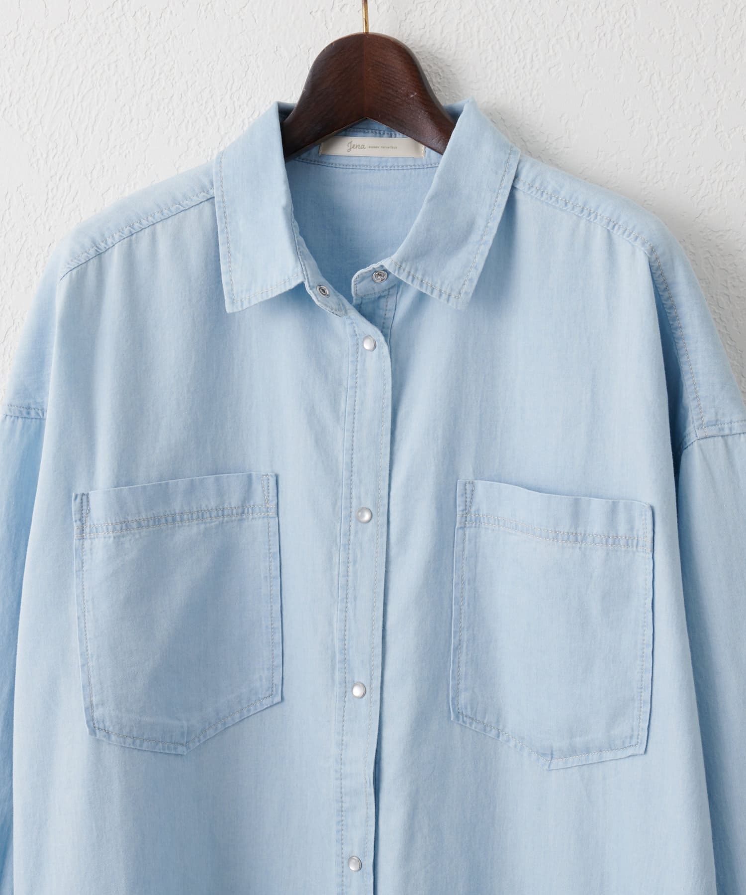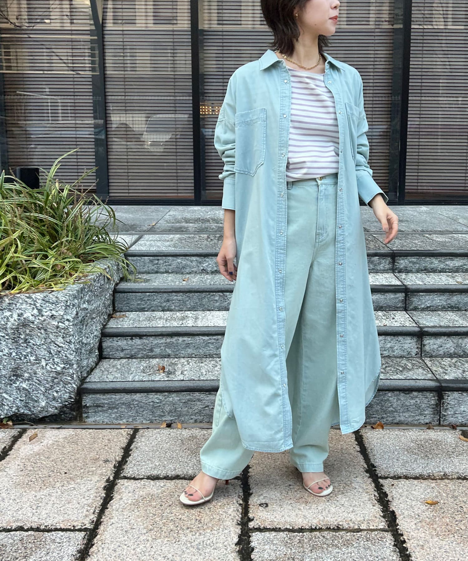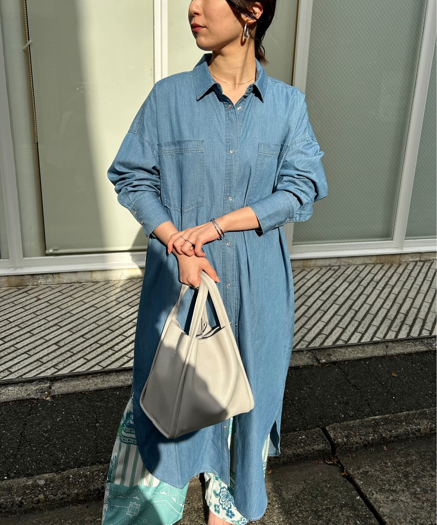 ・カジュアルなデニムシャツも、とろみ感のある素材で女性らしいすっきりとした印象に。