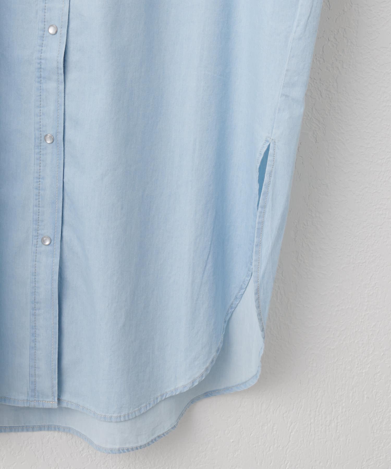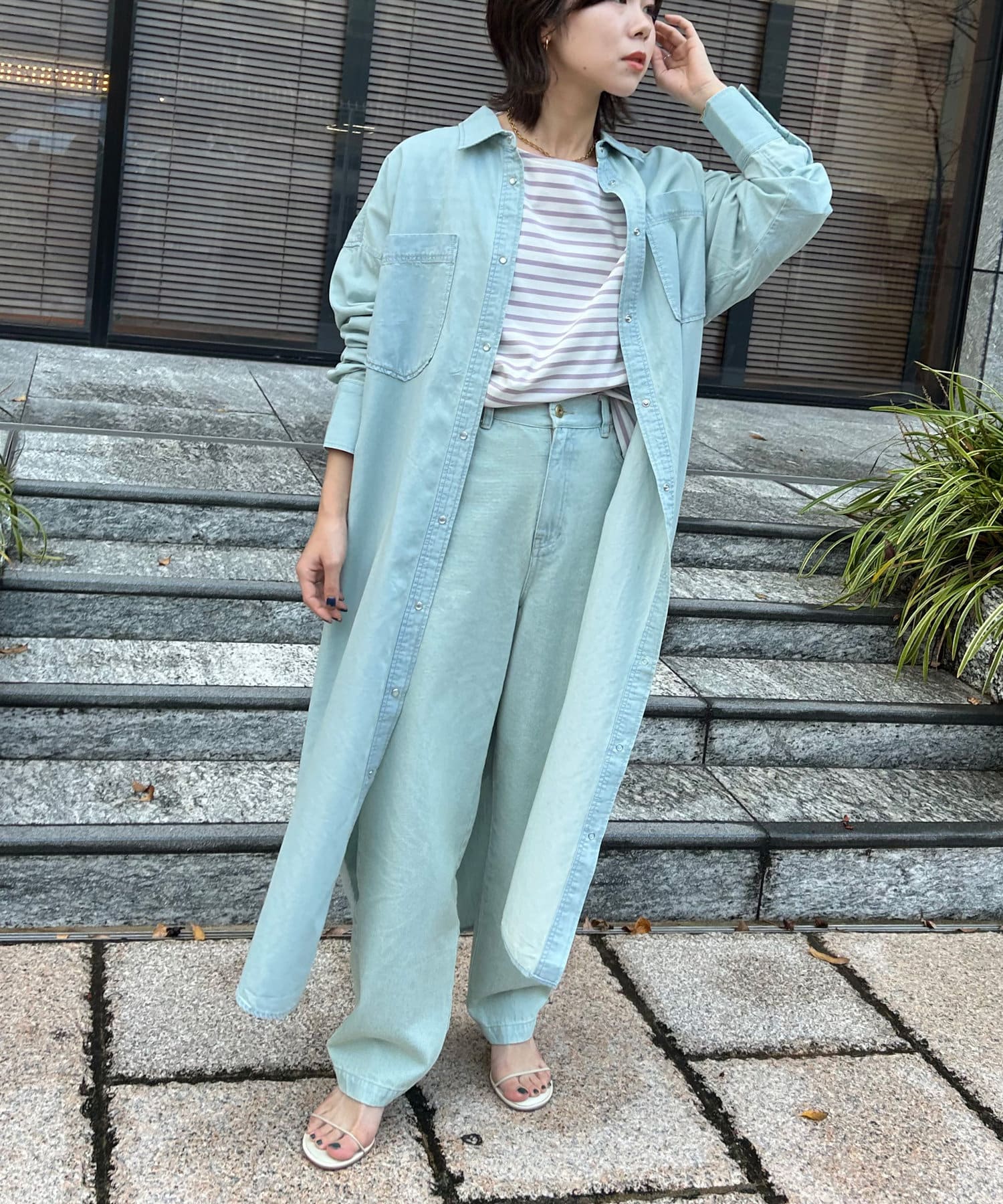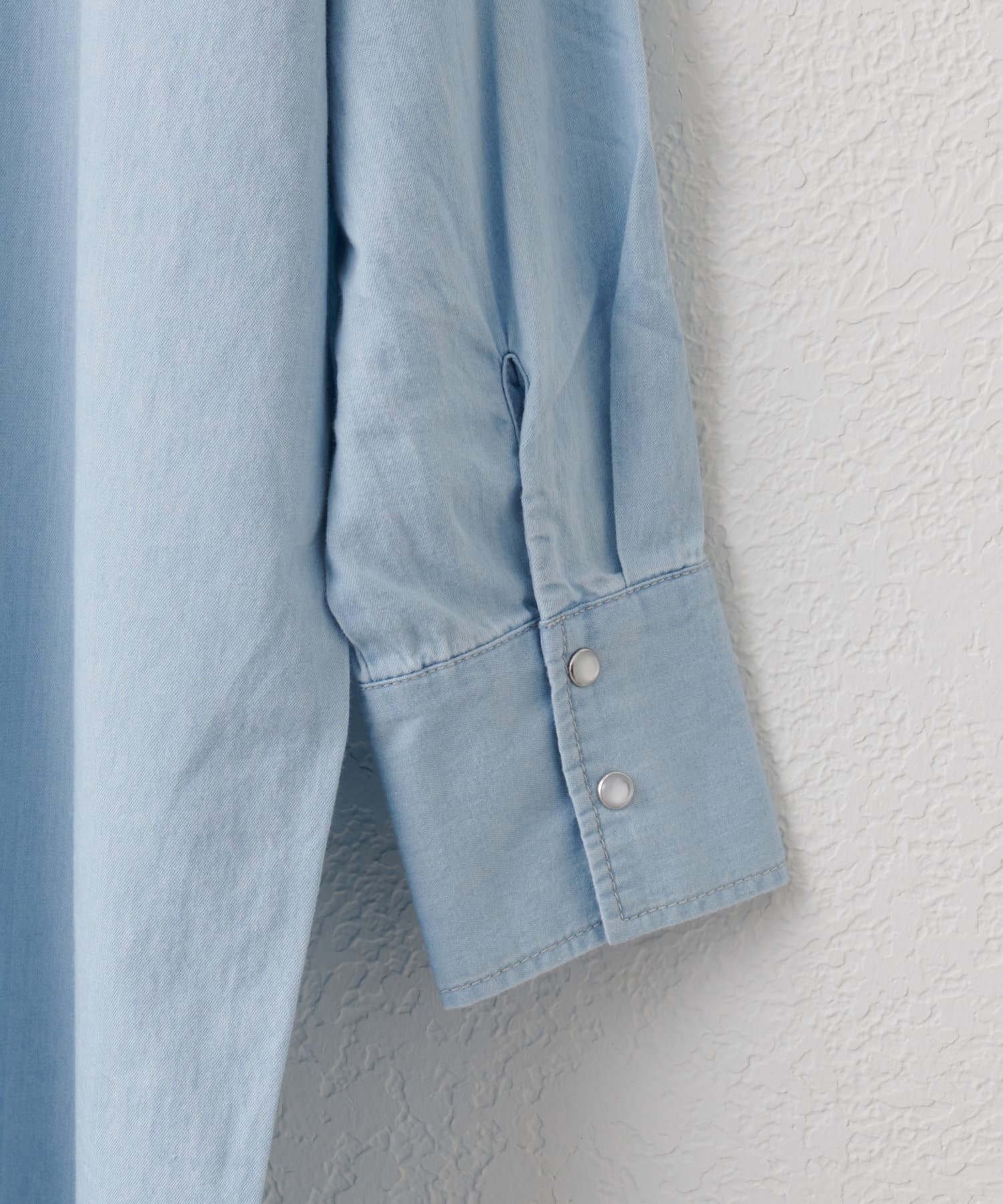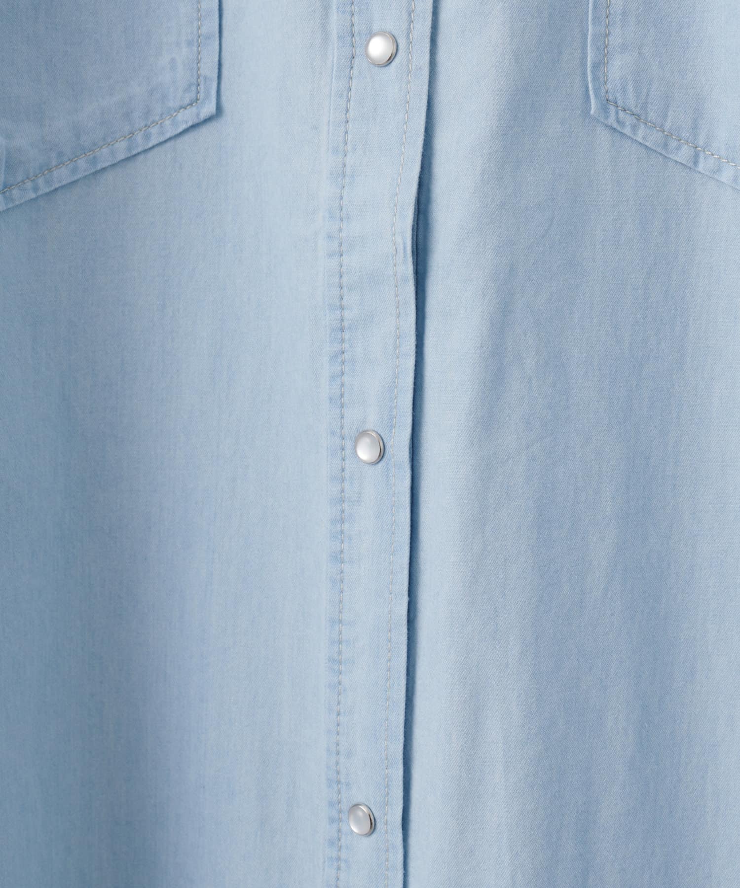 ・カジュアルなデニムシャツも、とろみ感のある素材で女性らしいすっきりとした印象に。