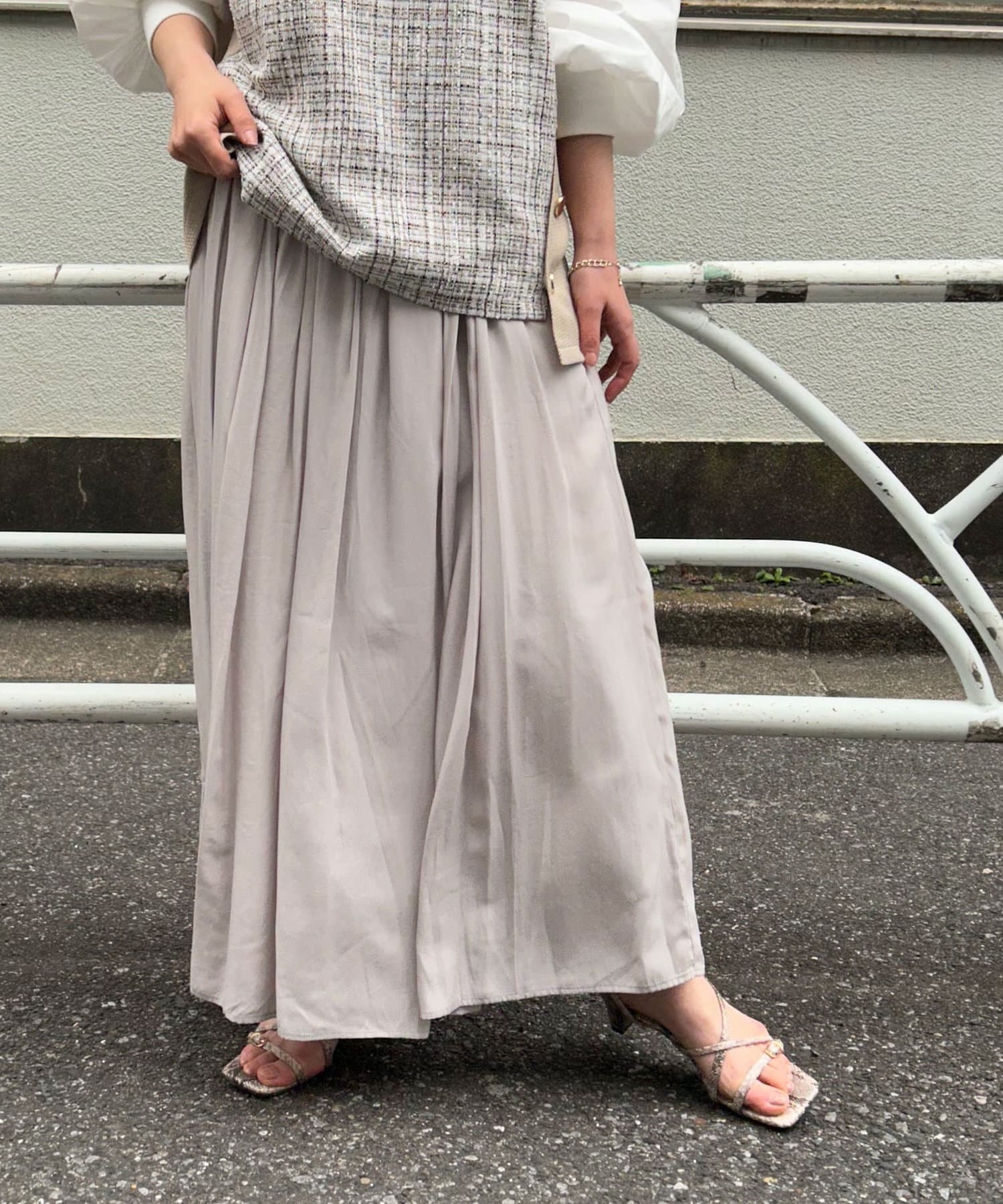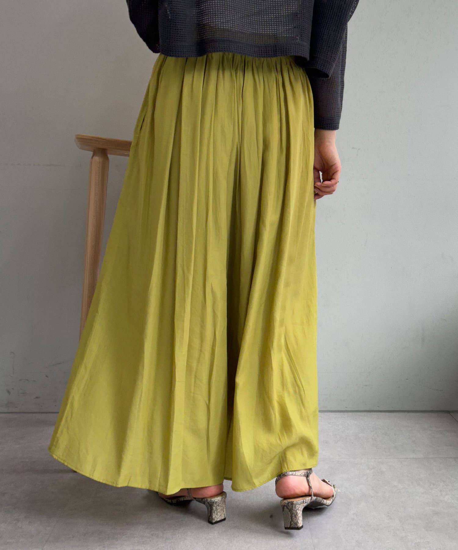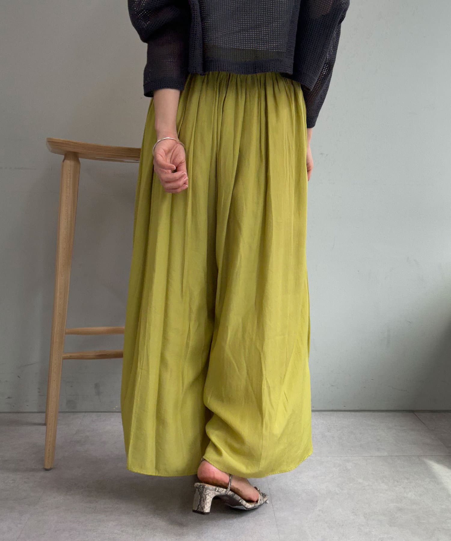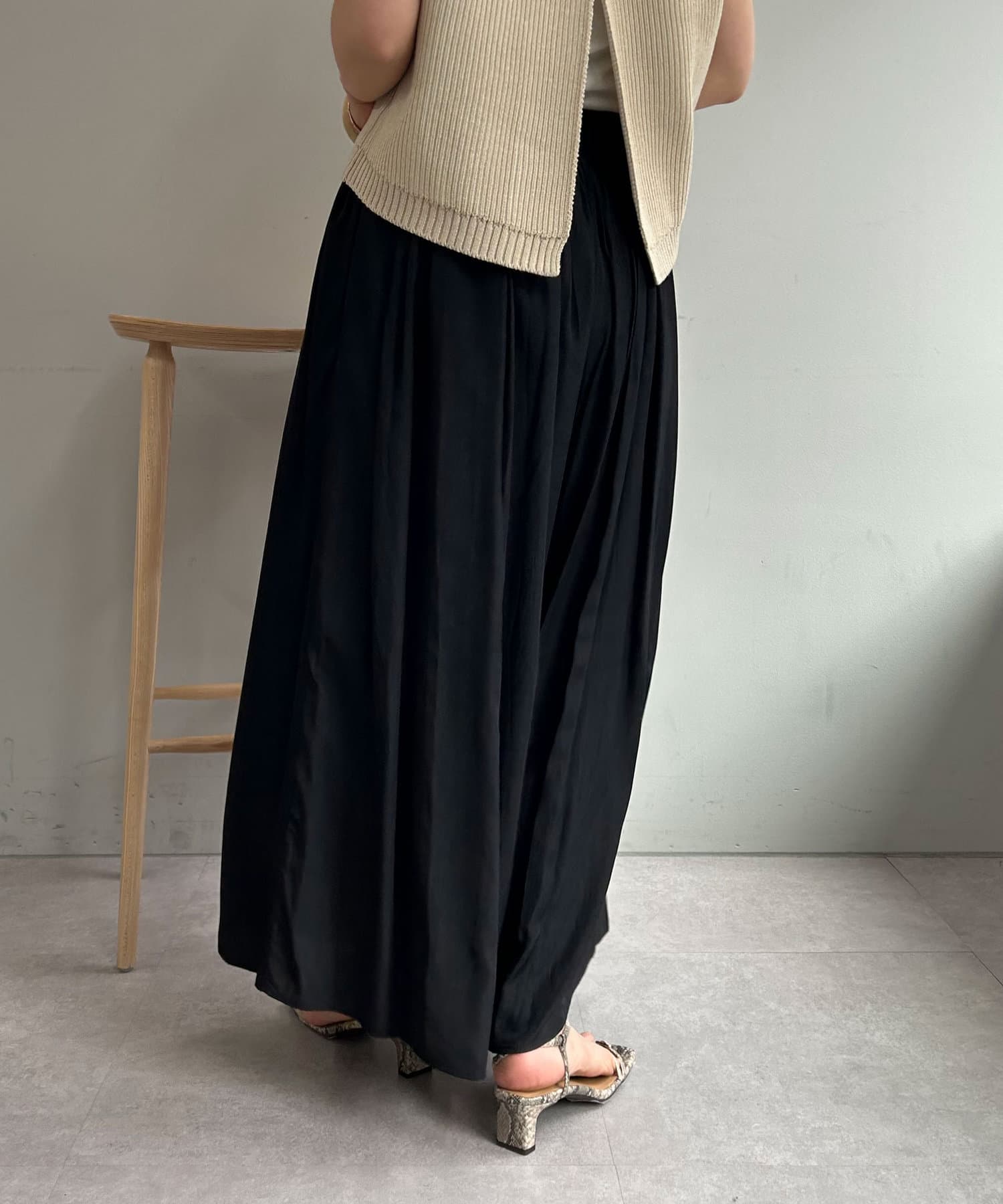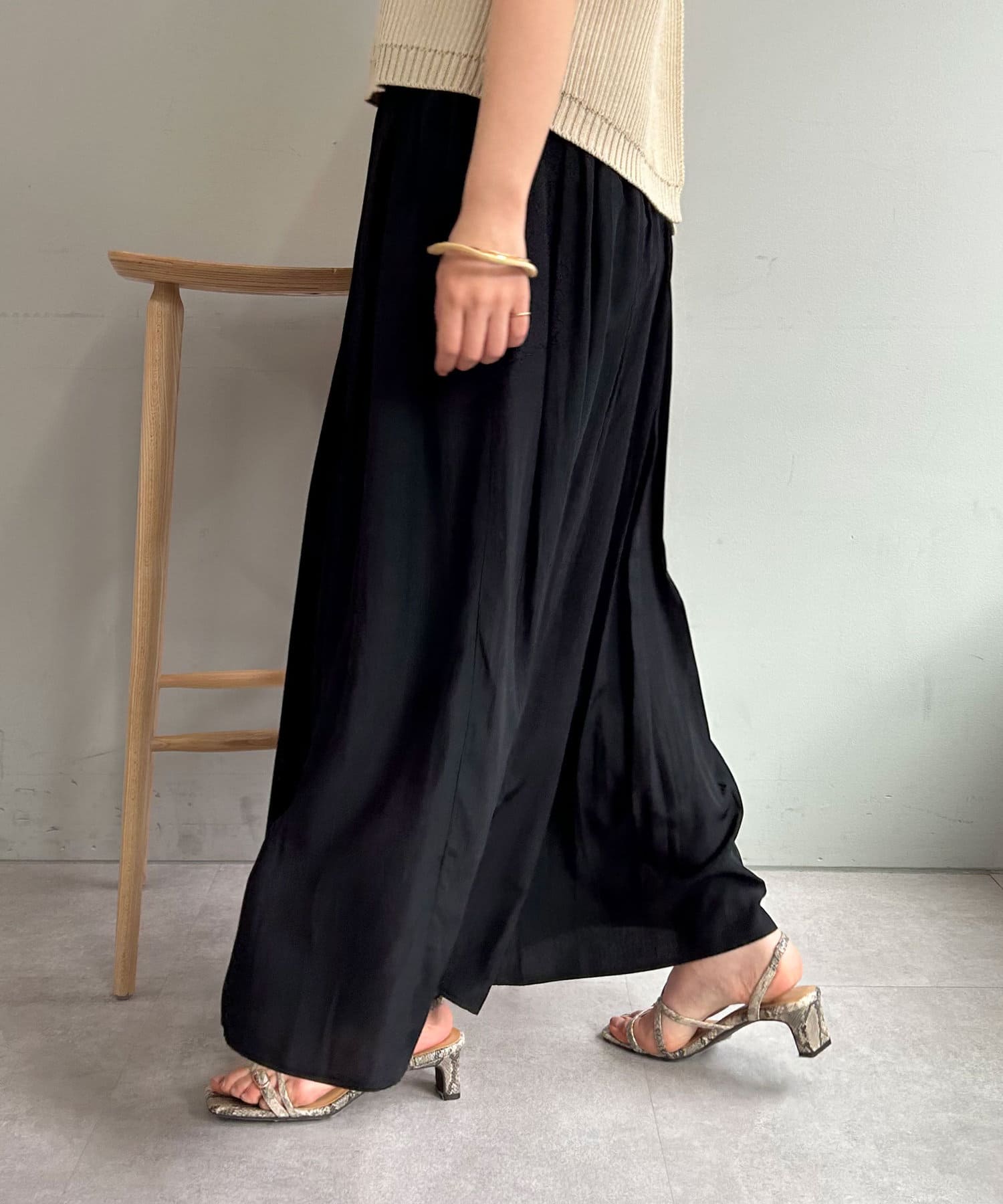 ・シルエットはスカートらしく、艶感がありエレガンスさがありながらも、パンツなので動きやすいスカーチョ。