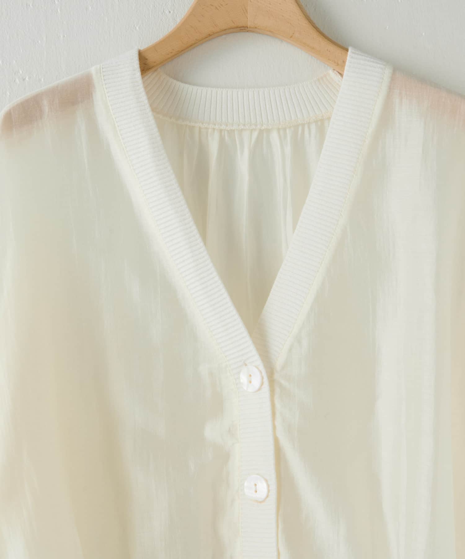 ・シャツ×ニットの異素材ミックスがお洒落なシアーカーディガン。