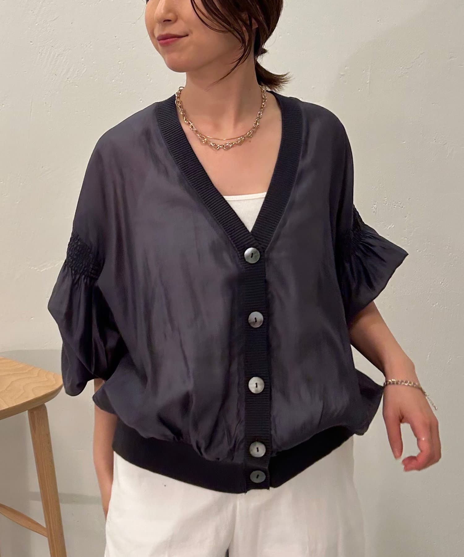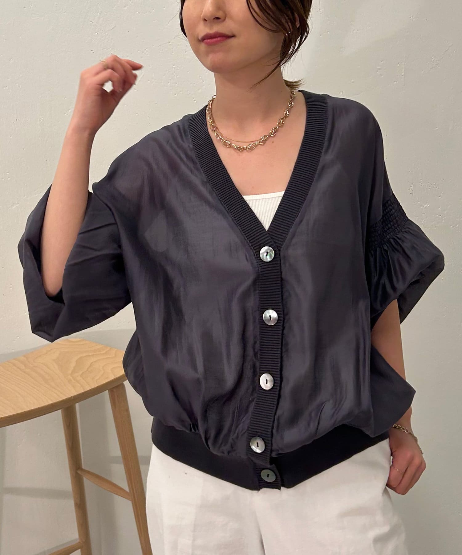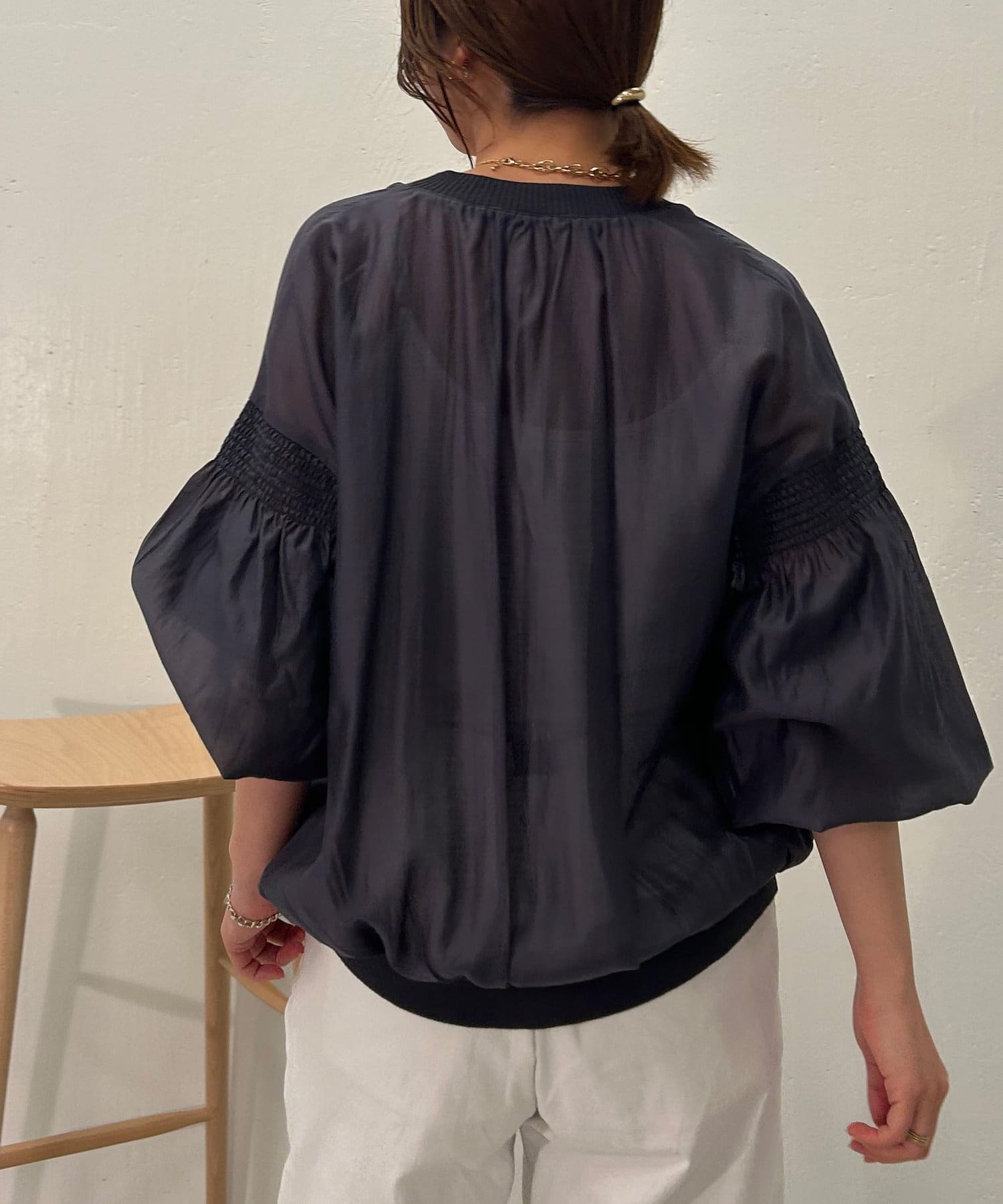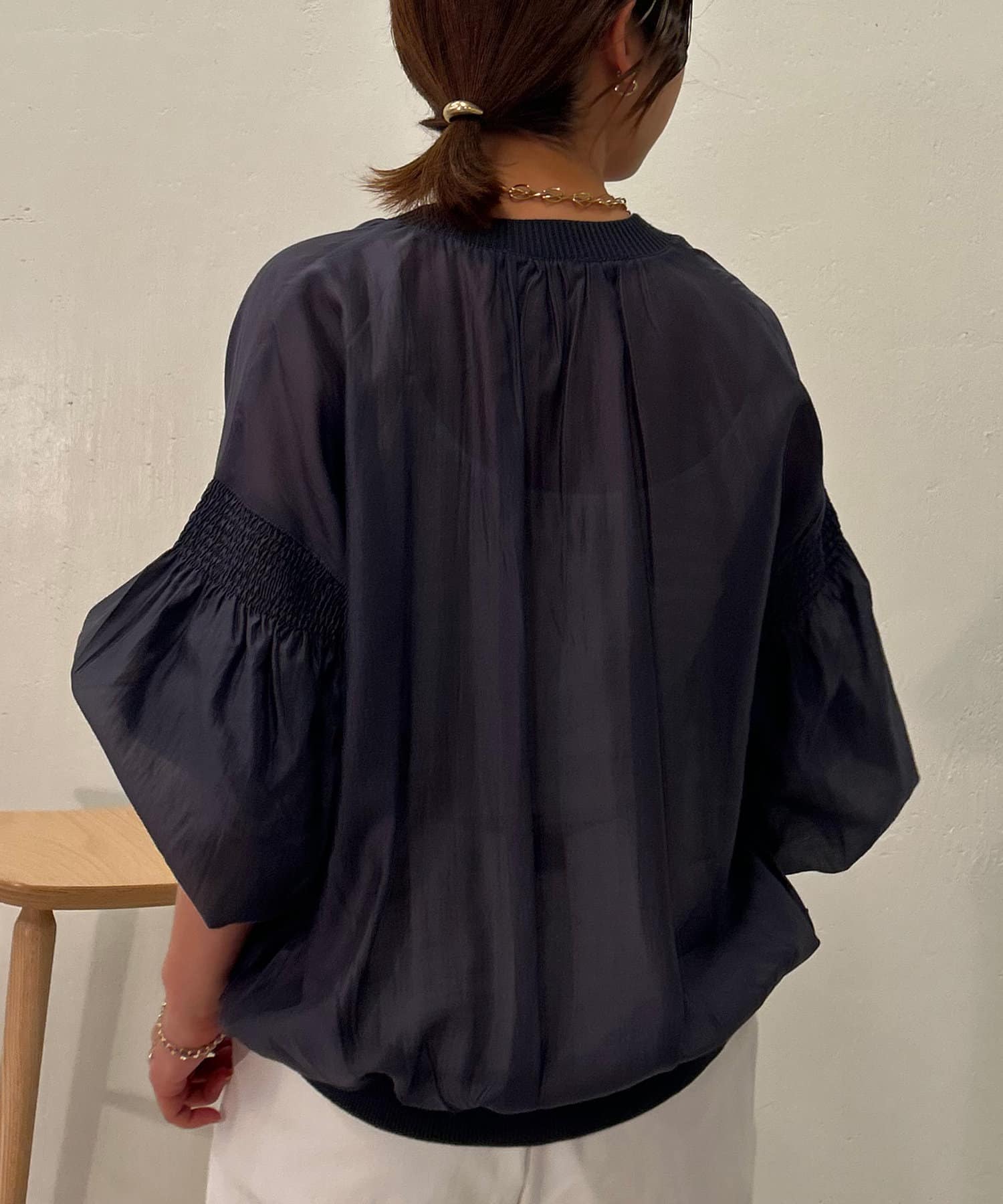 ・袖にはシャーリングが施されており、シンプルすぎず女性らしさもプラス。