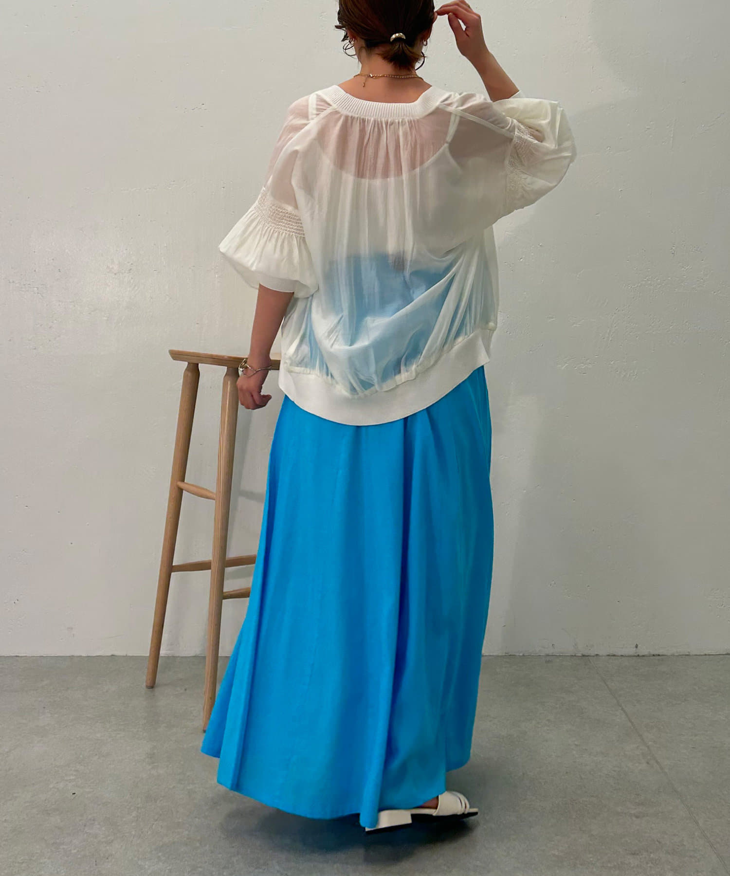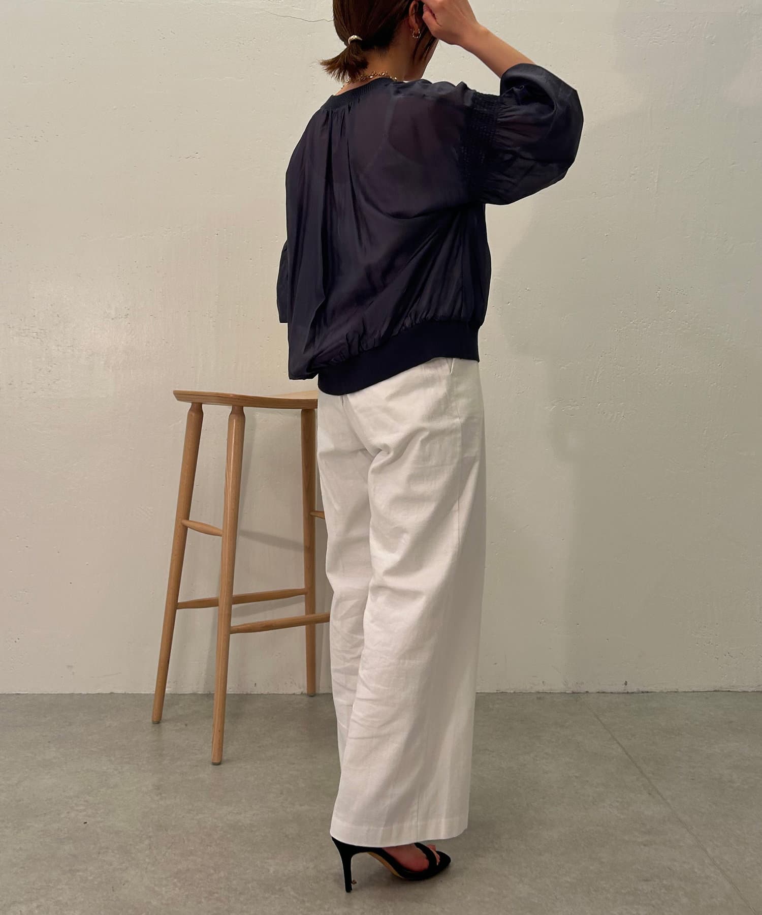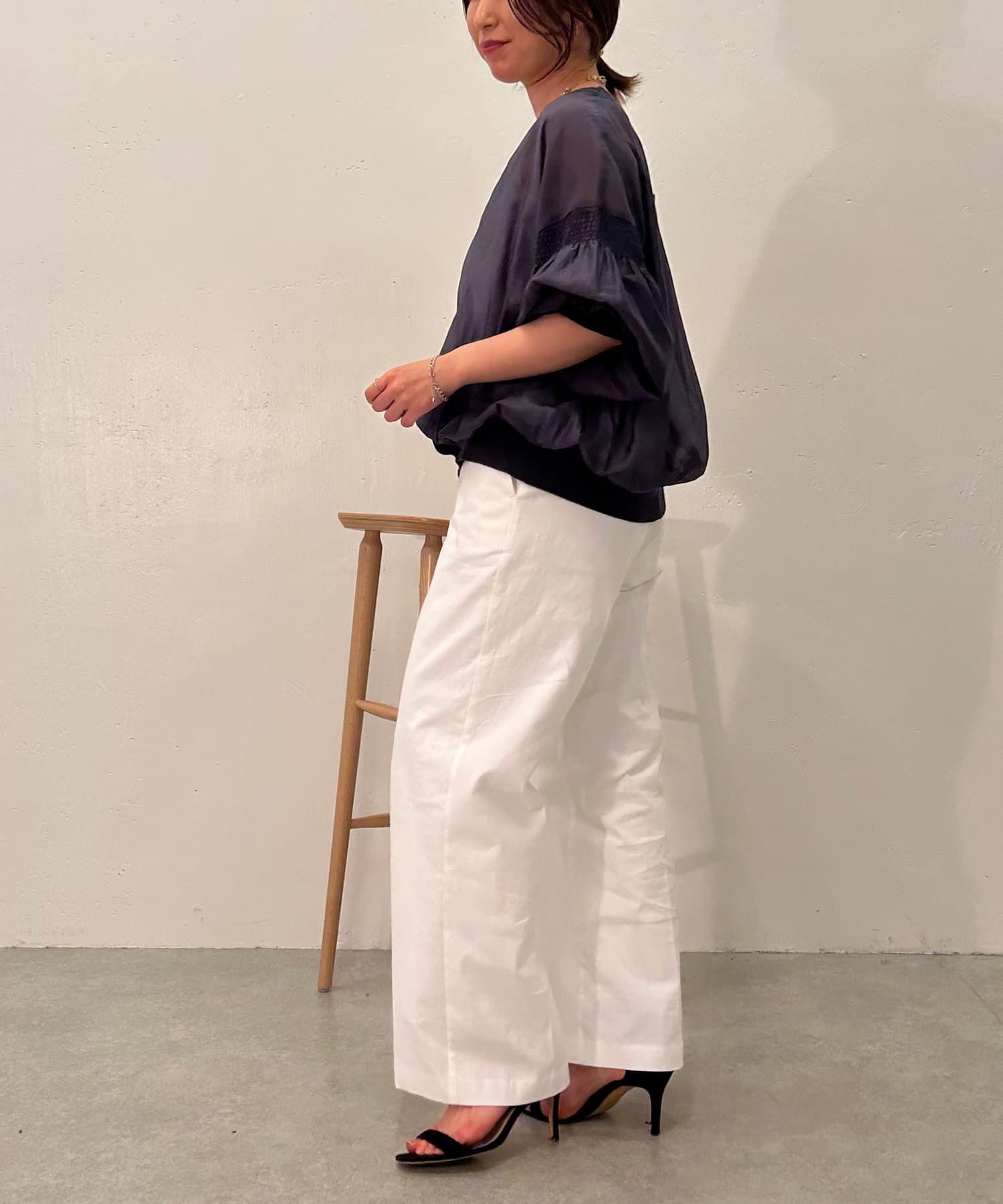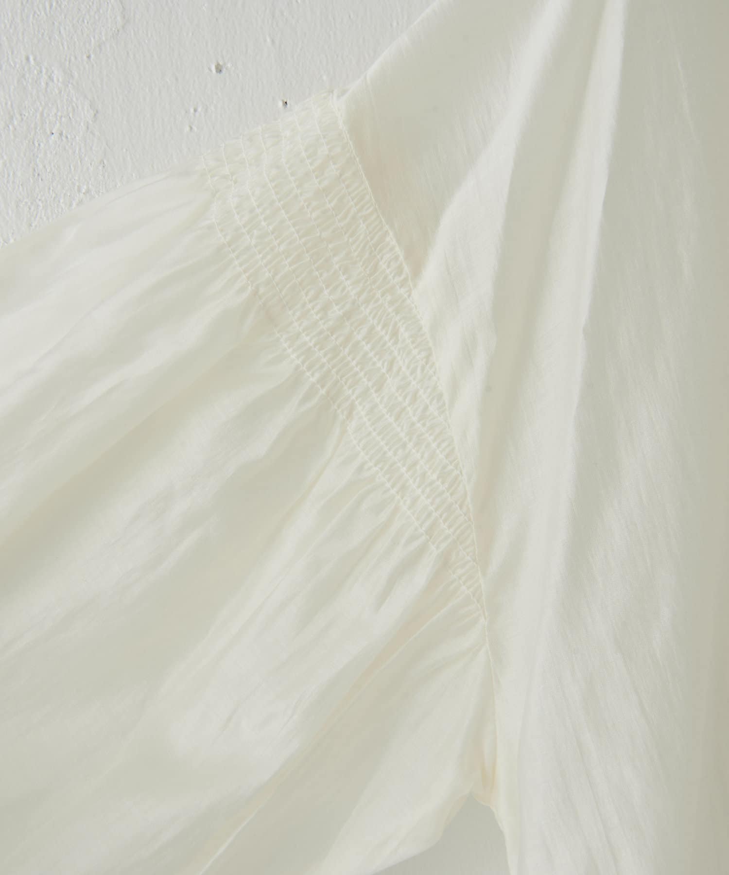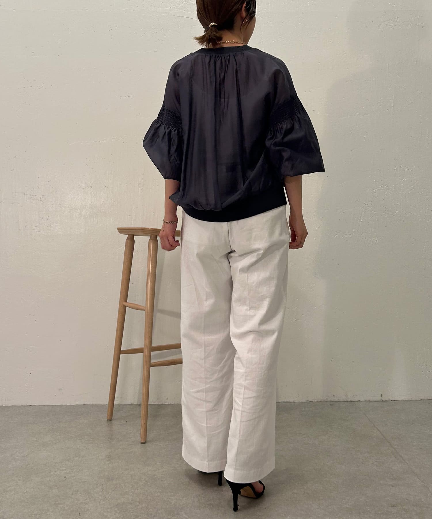 ・袖にはシャーリングが施されており、シンプルすぎず女性らしさもプラス。