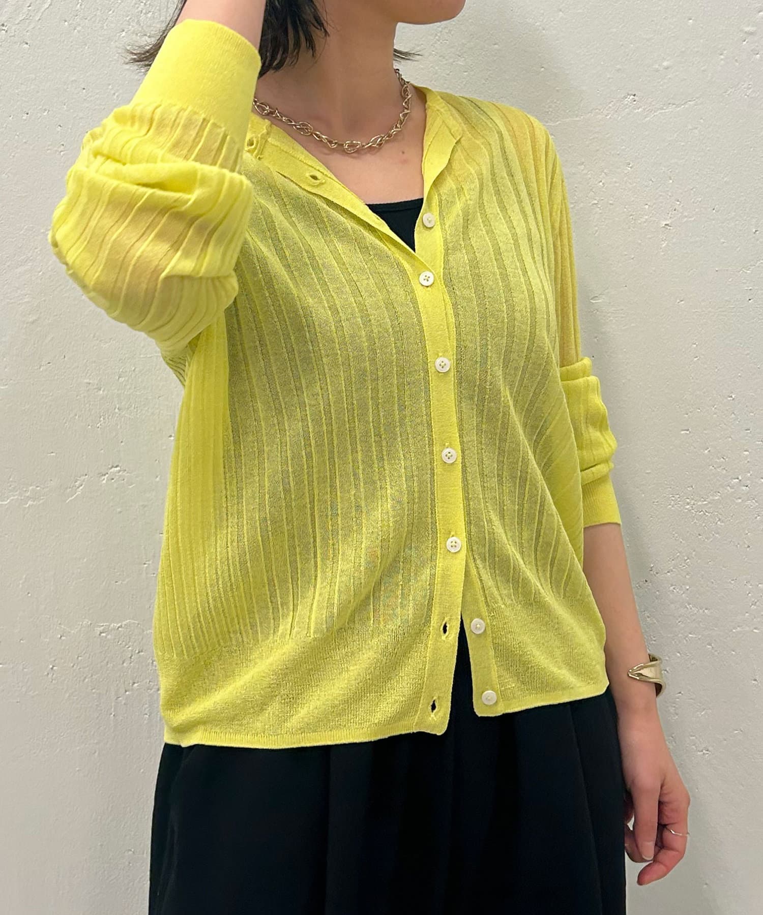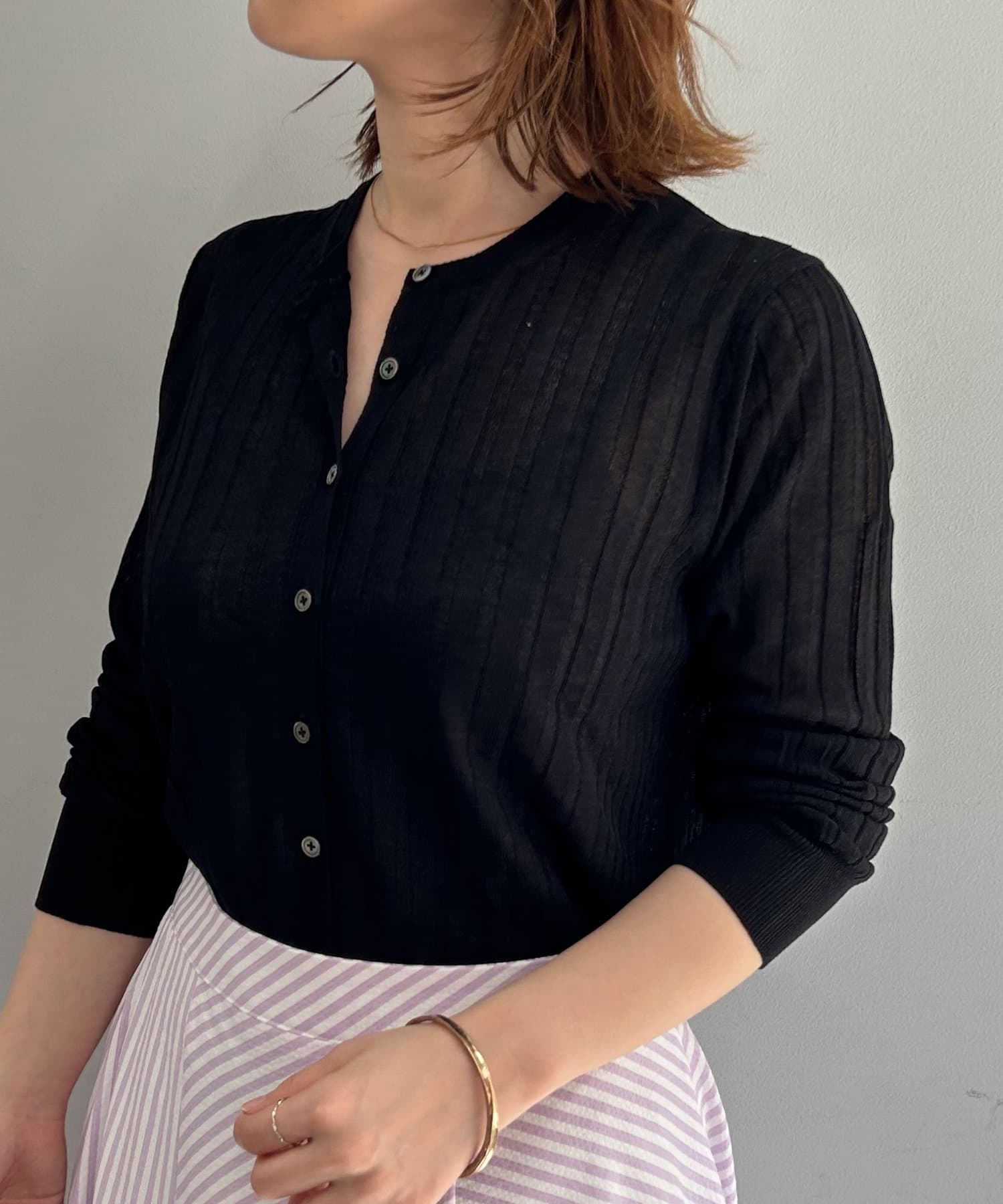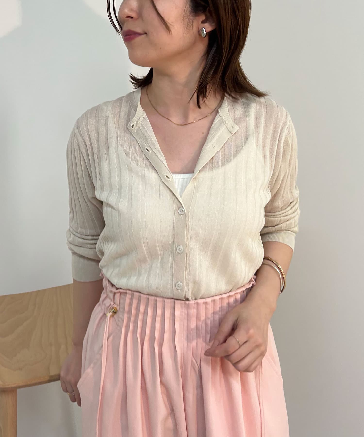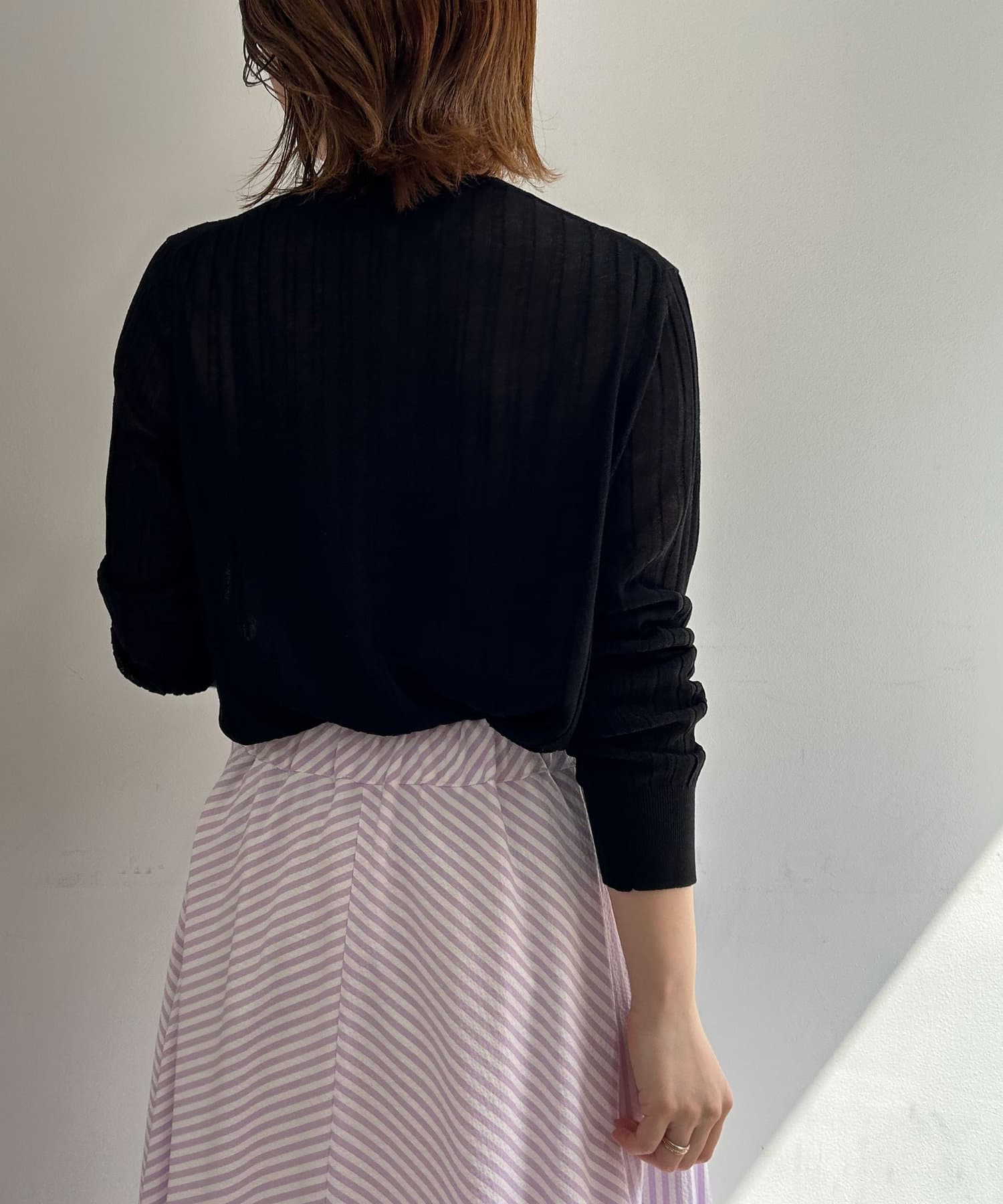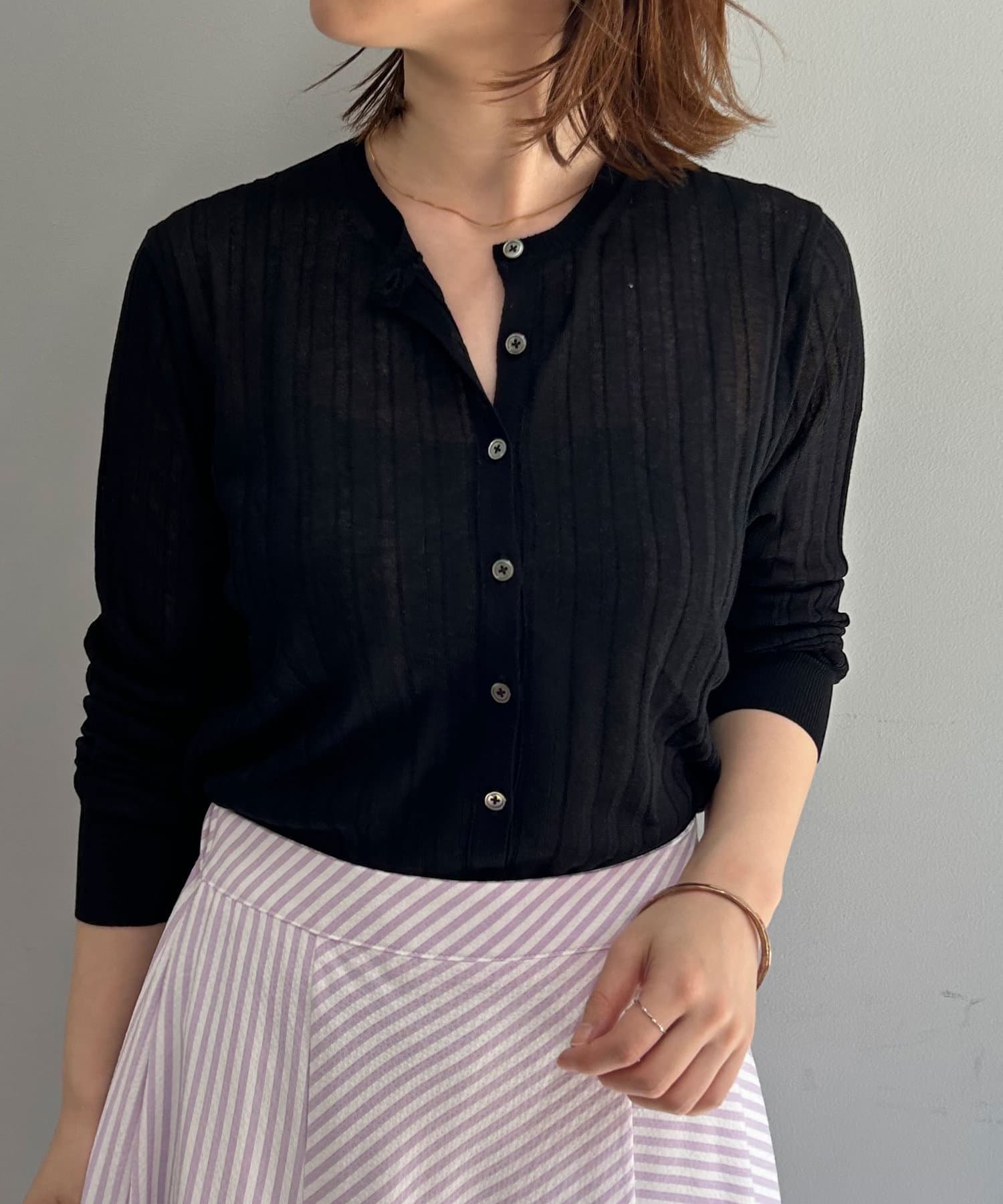・リブ編みになった薄手のサマーニットカーディガン。