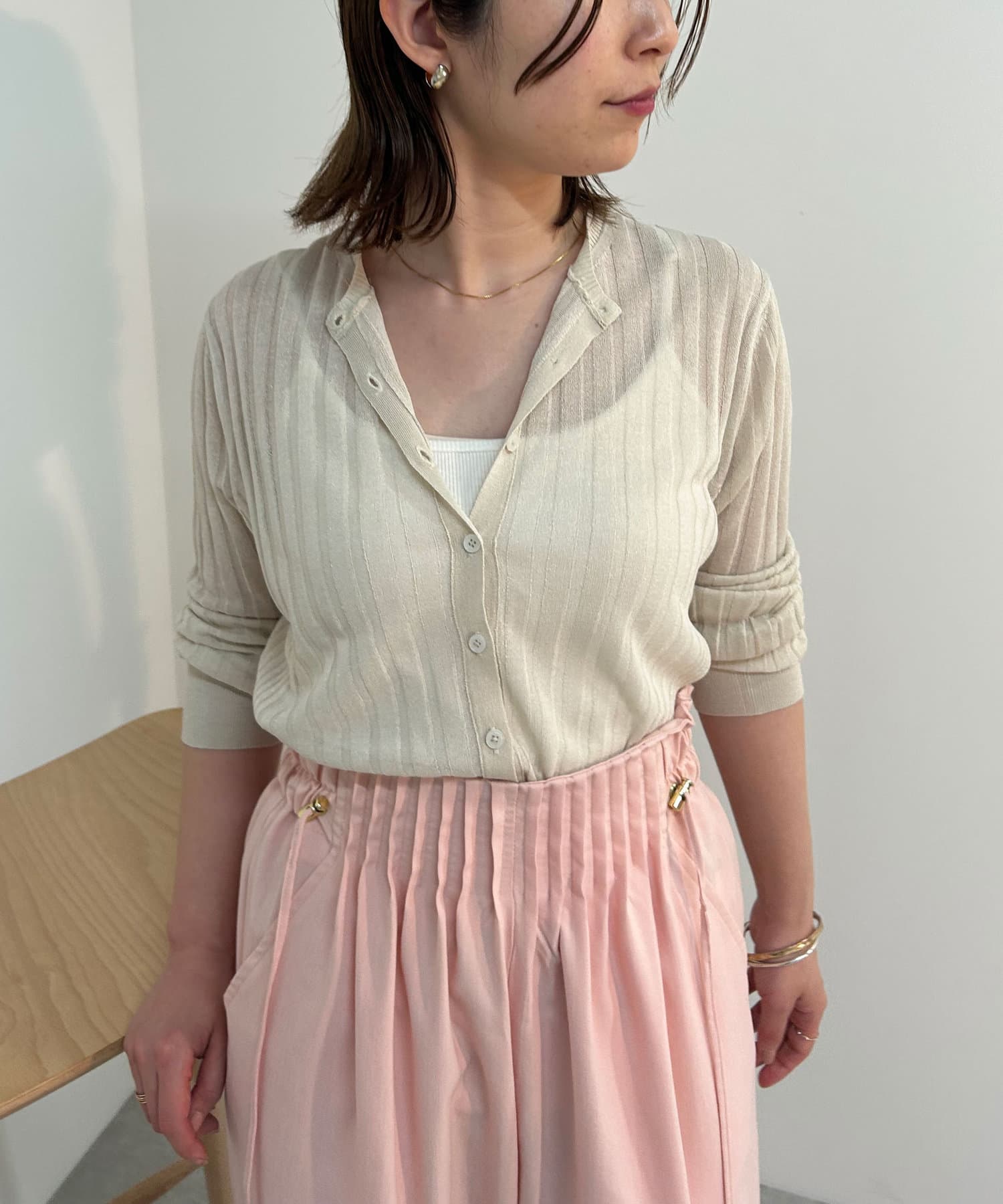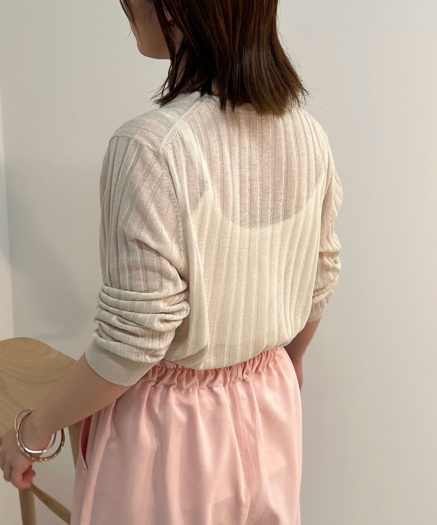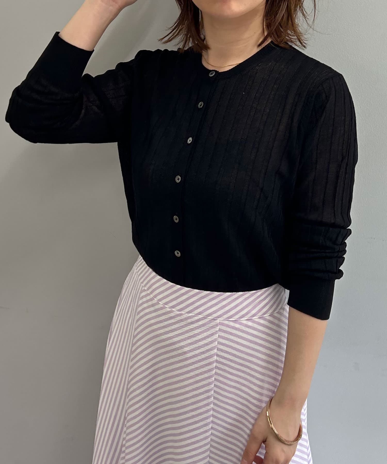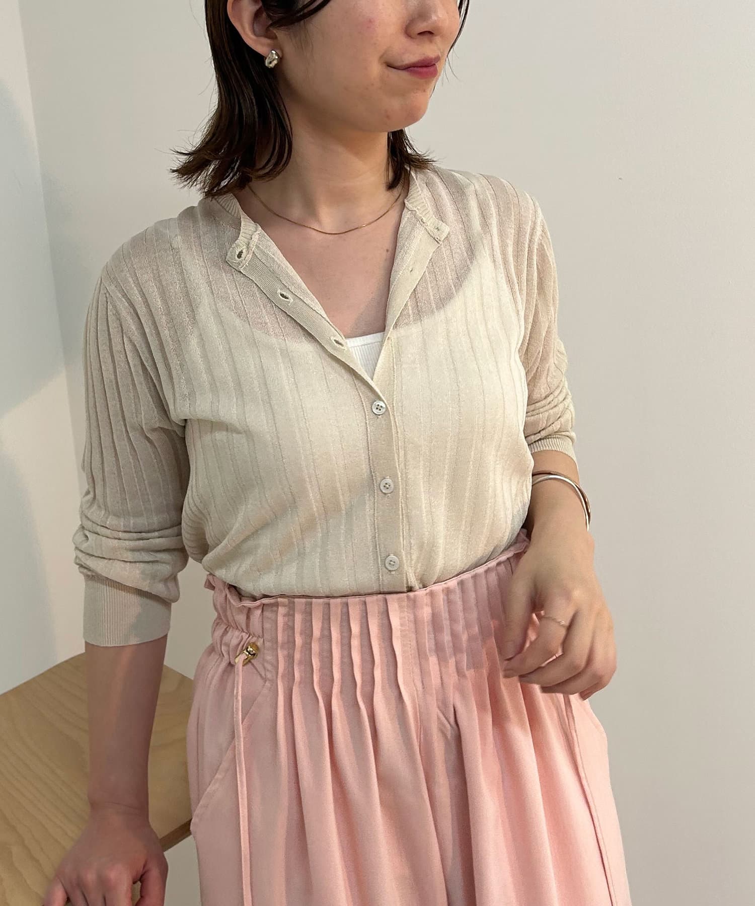 ・リブ編みになった薄手のサマーニットカーディガン。