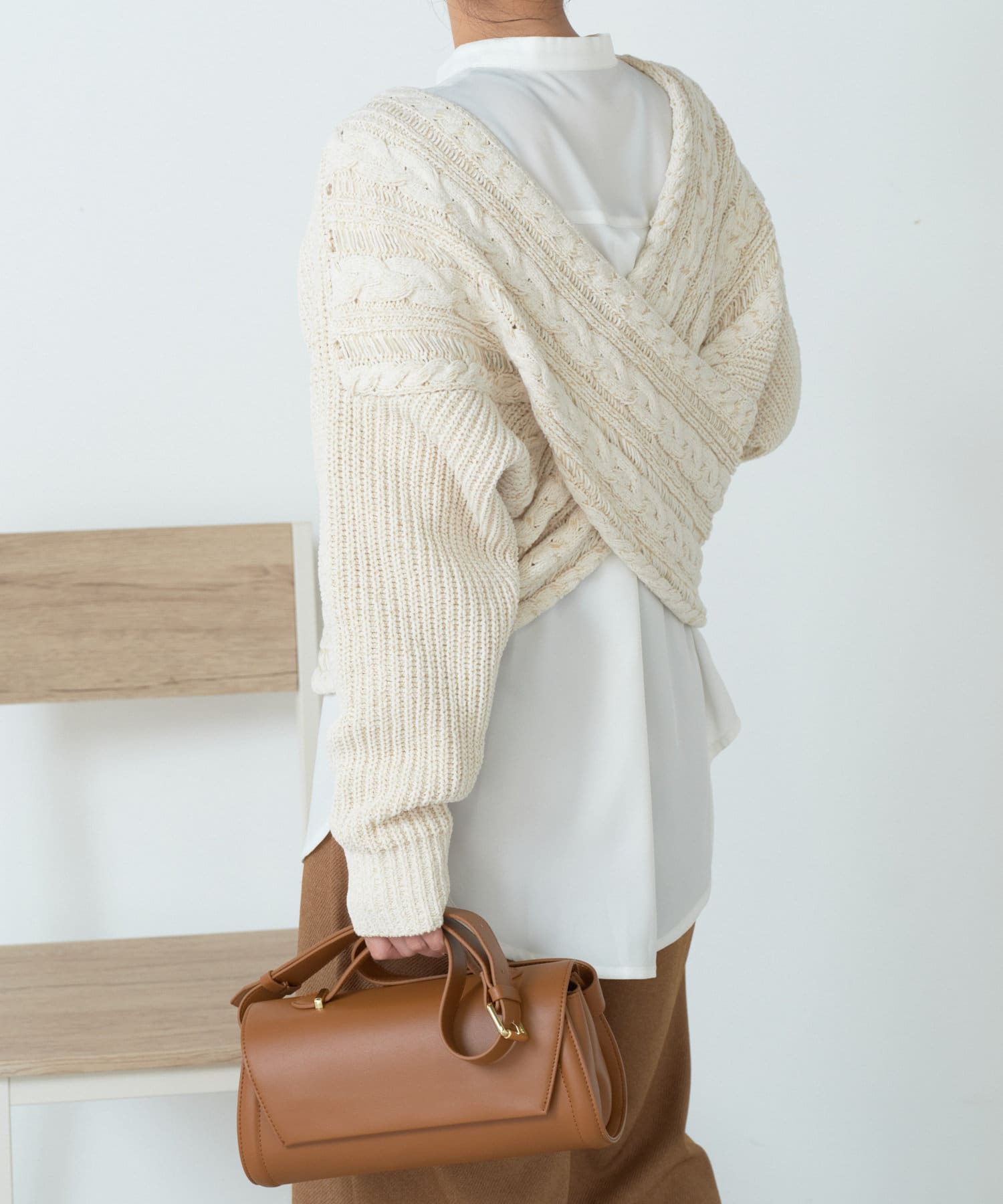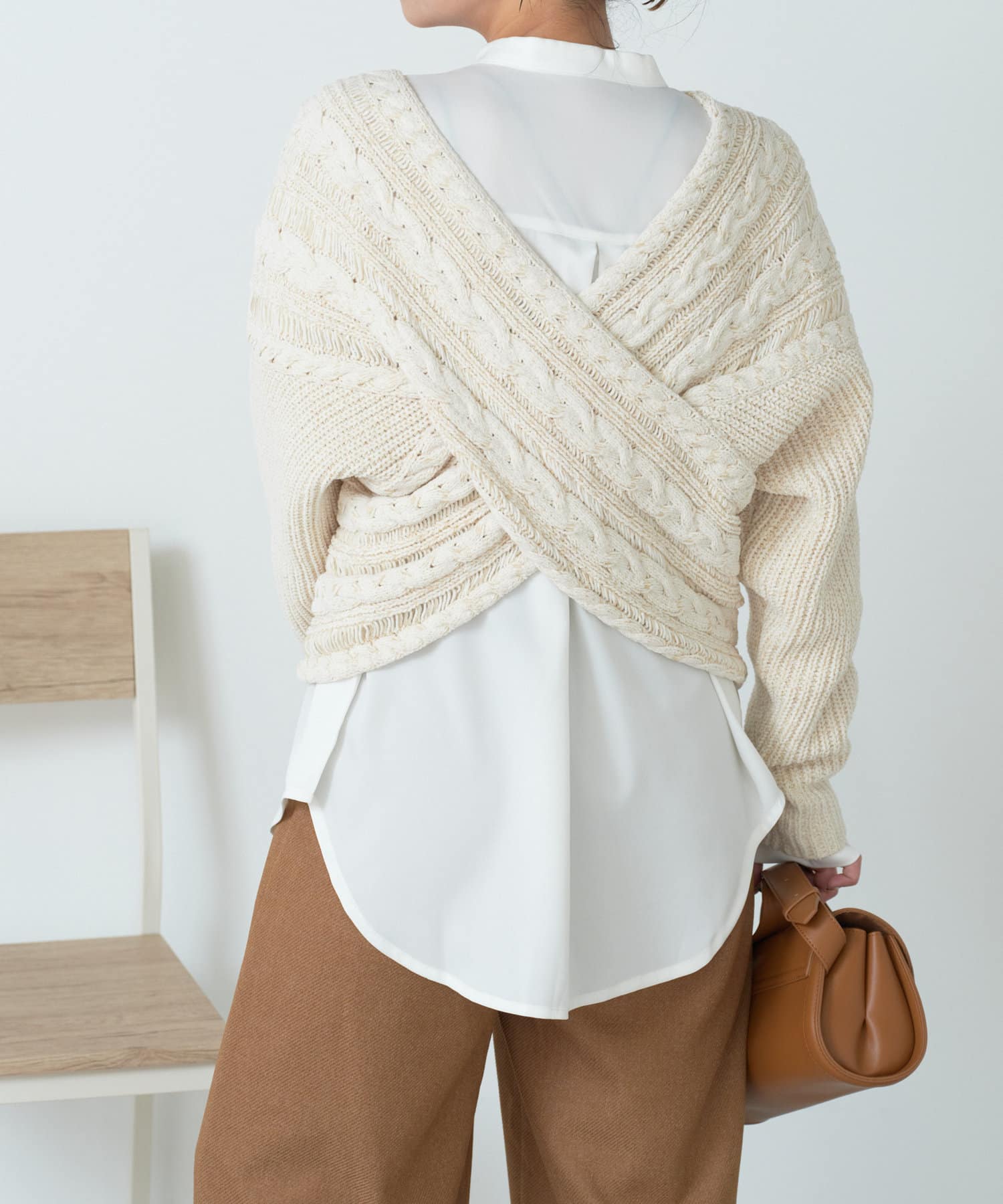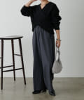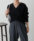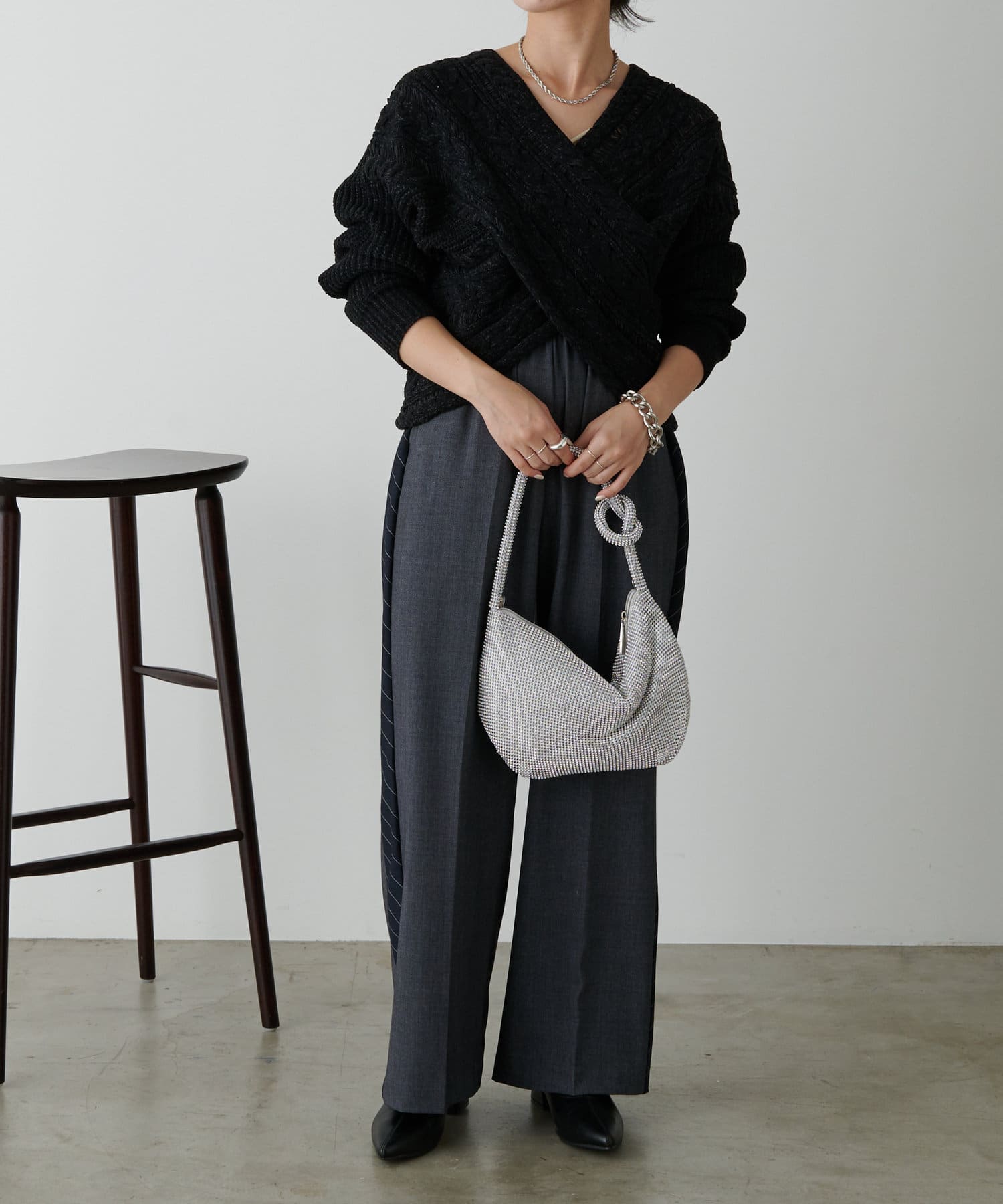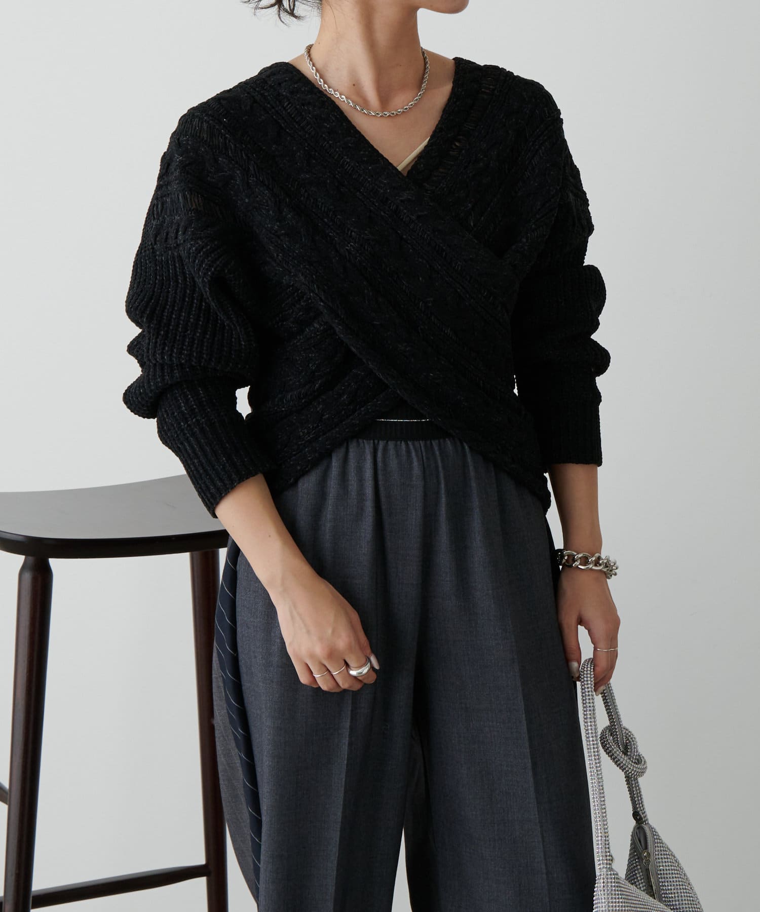 ・程よく開いた胸元とボディラインをスッキリ整えるカシュクールニット。