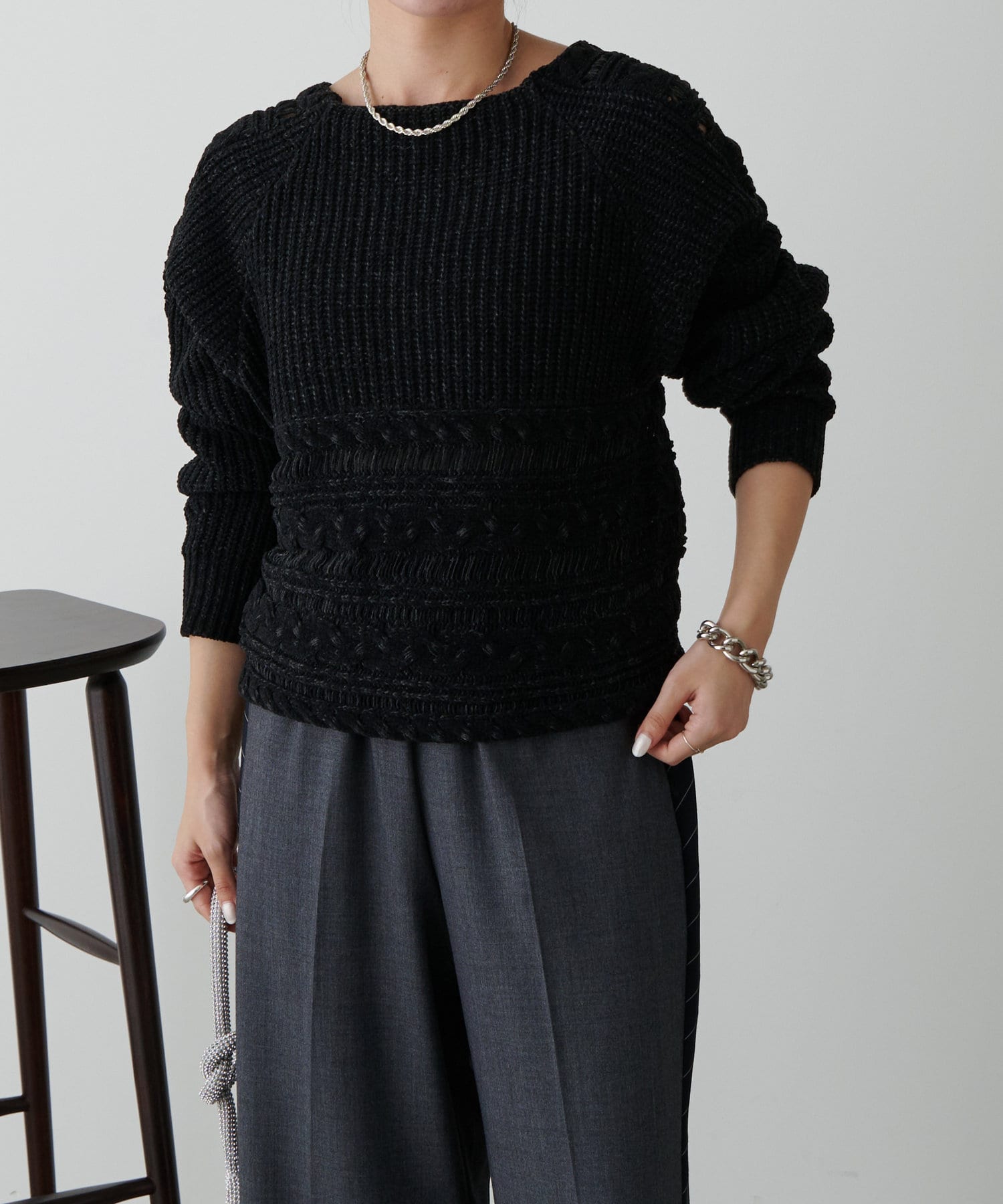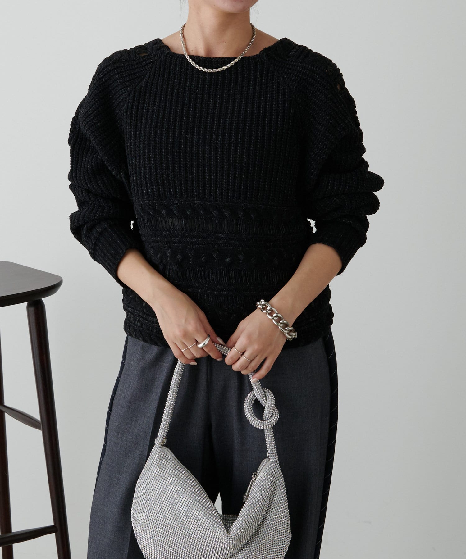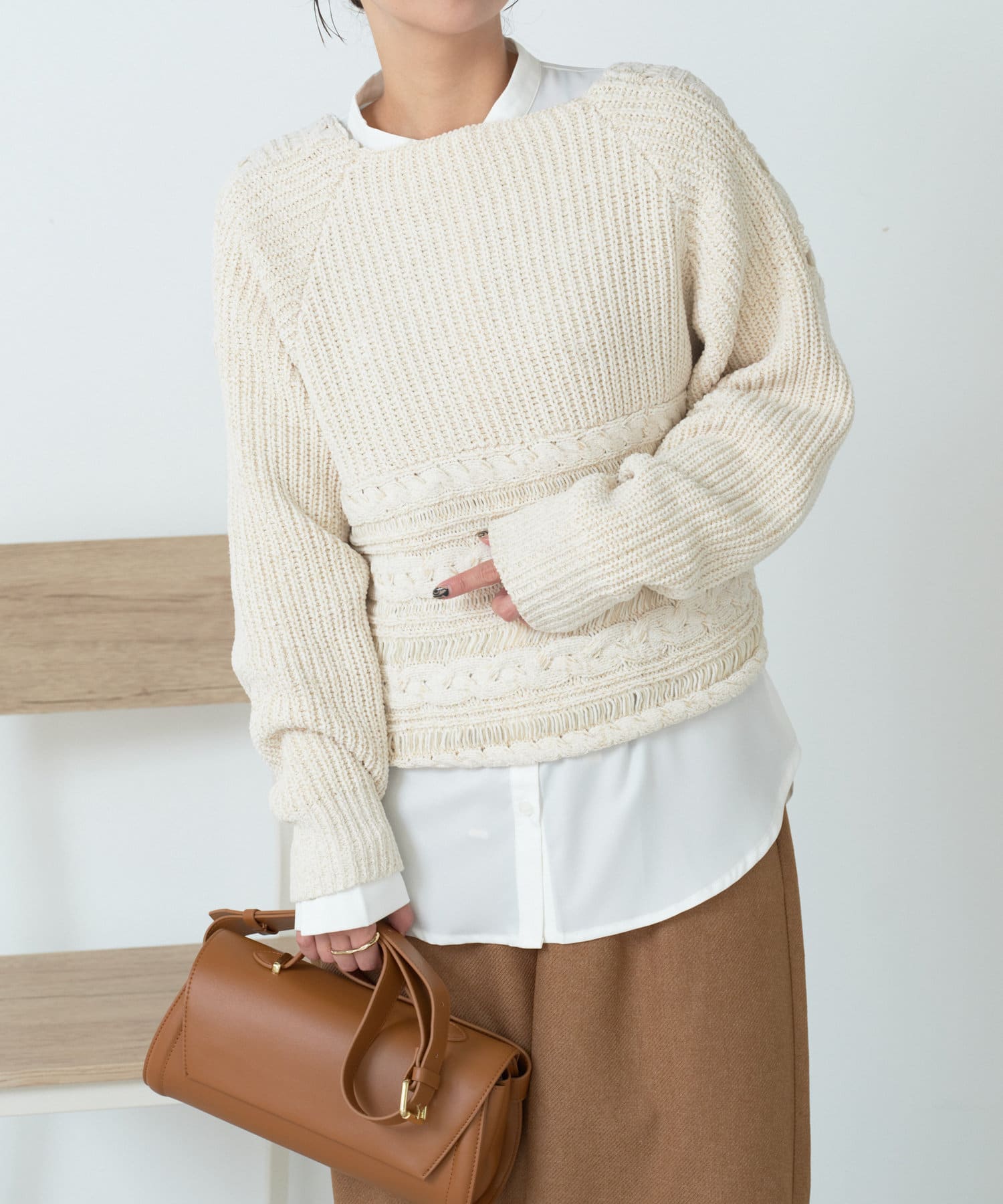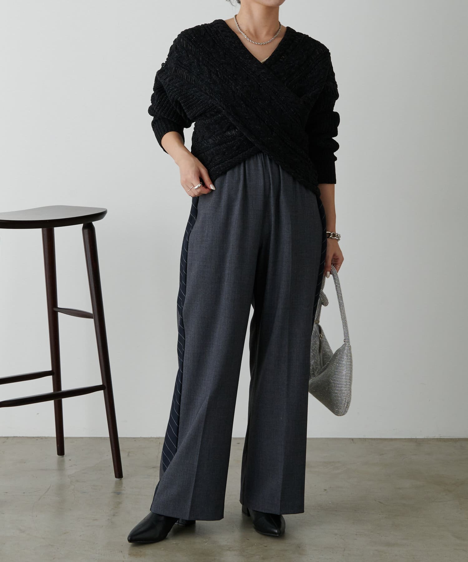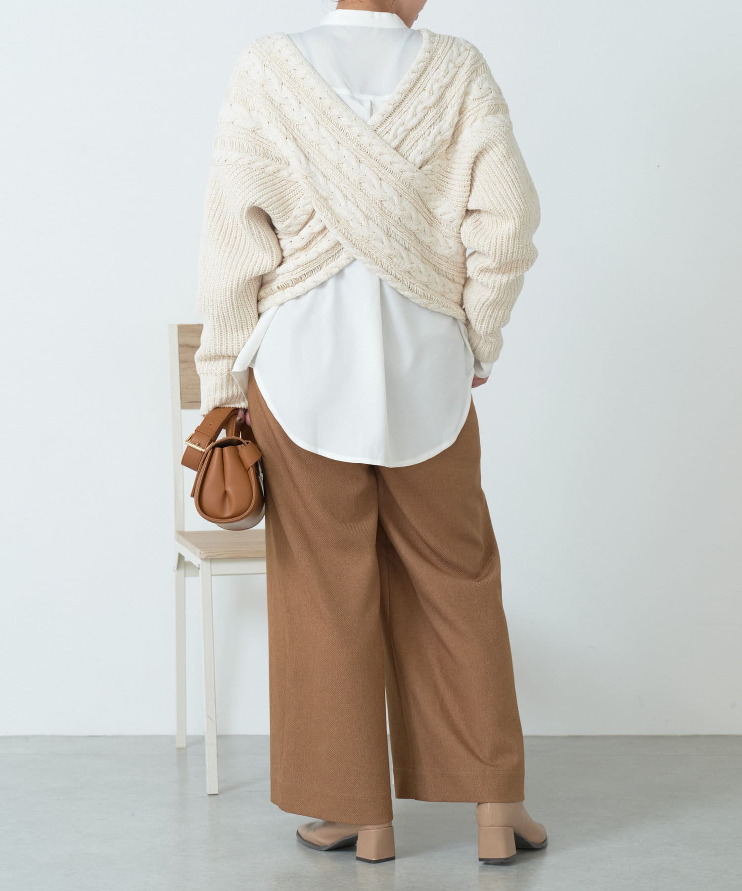 ・程よく開いた胸元とボディラインをスッキリ整えるカシュクールニット。
