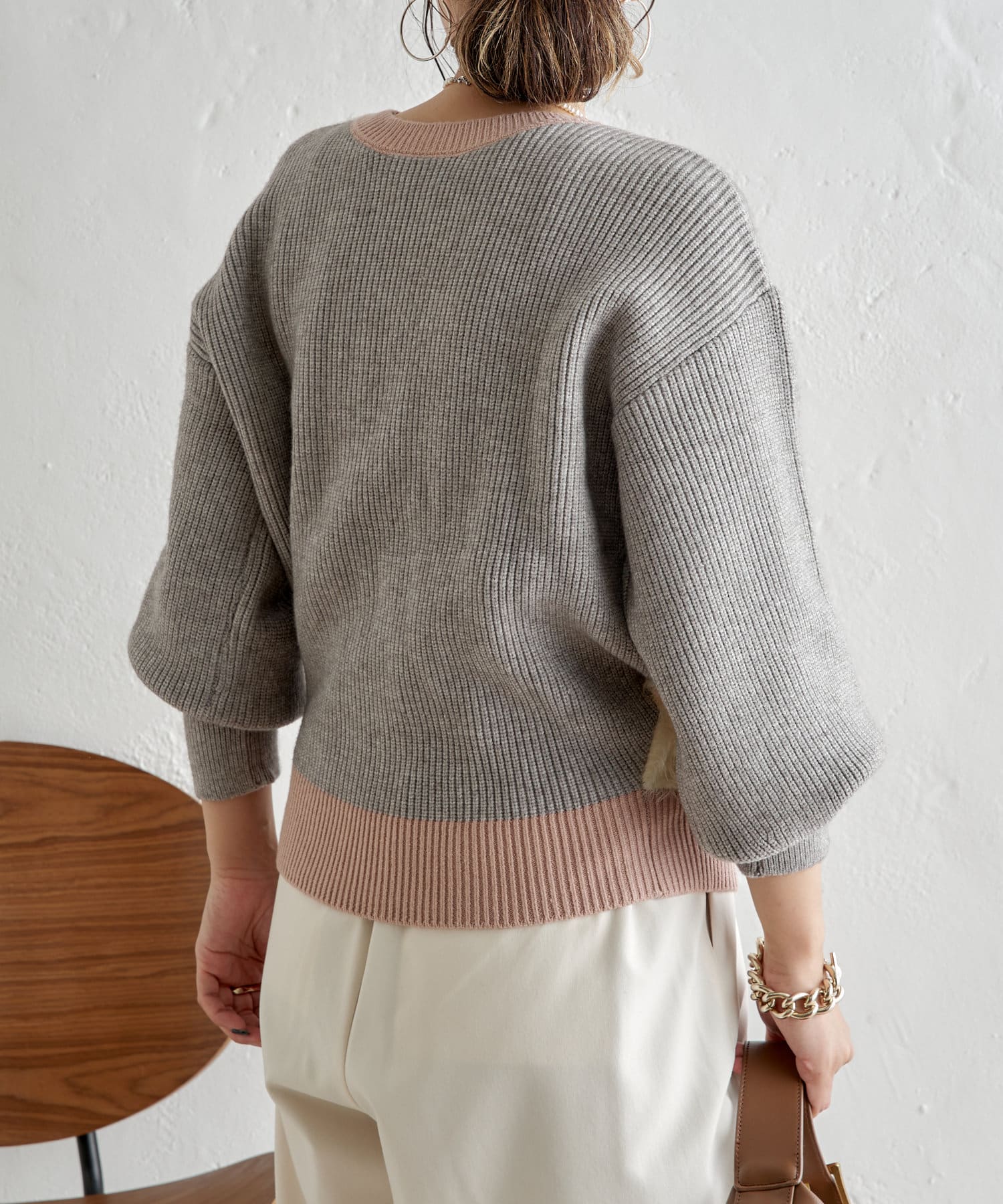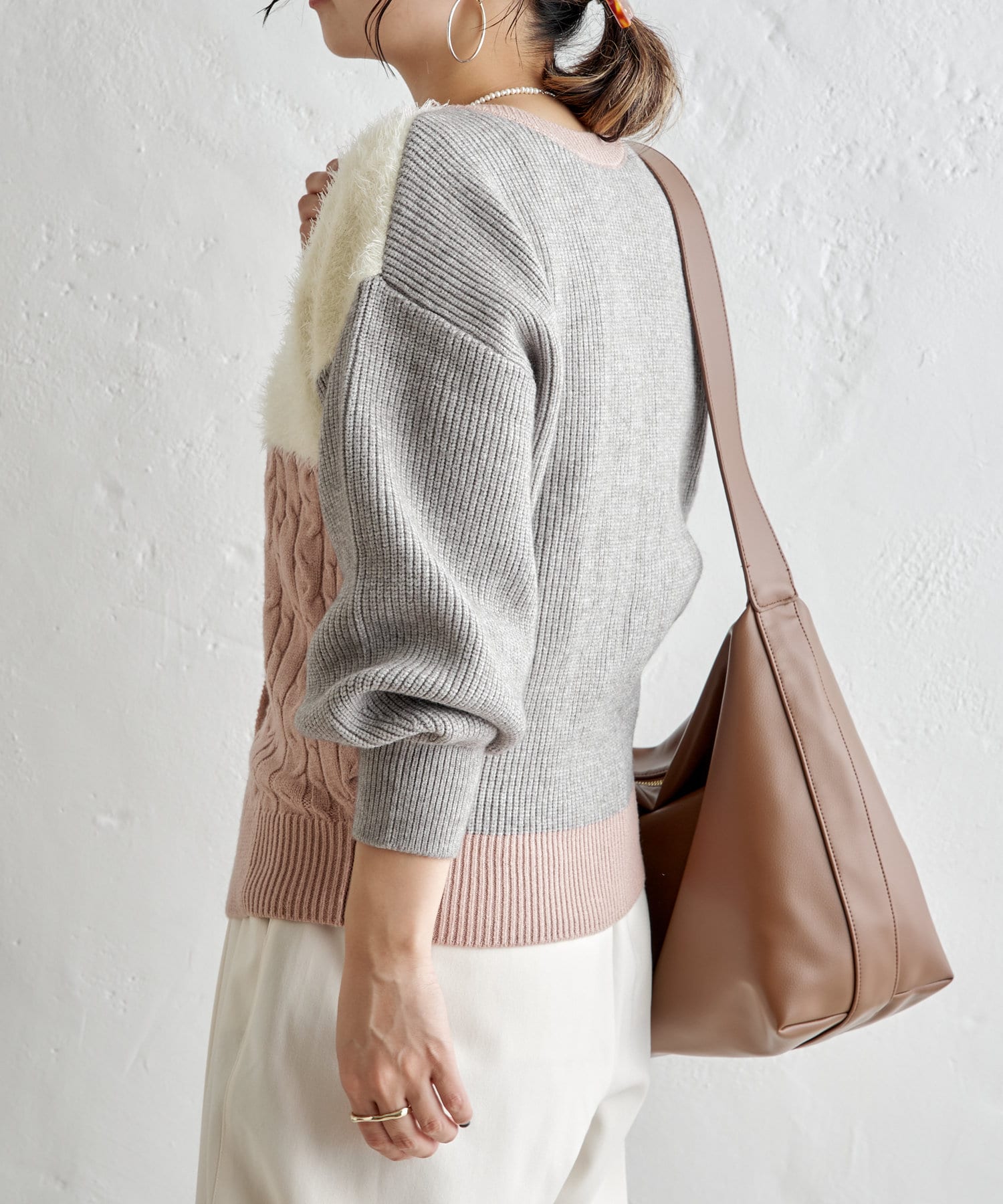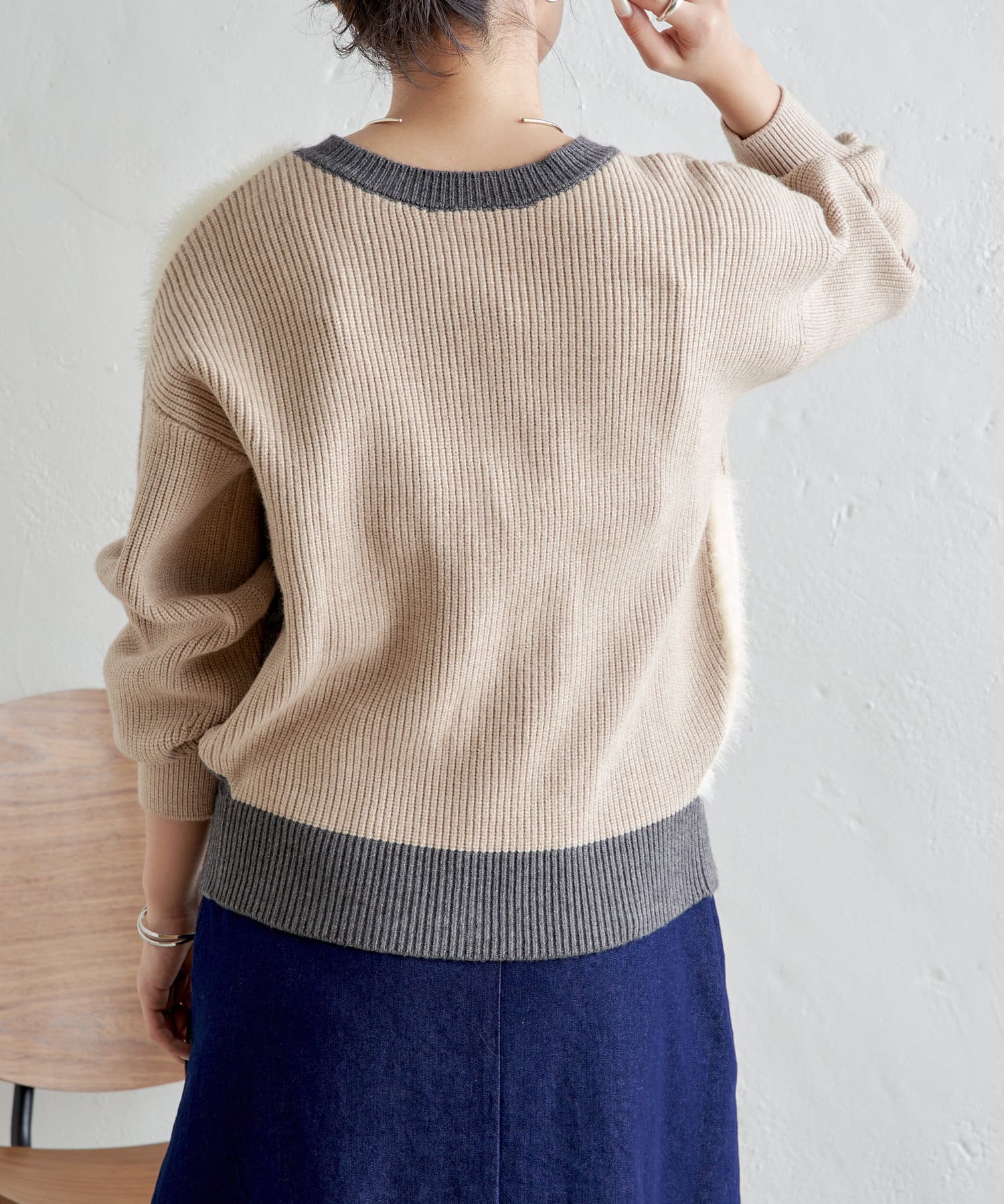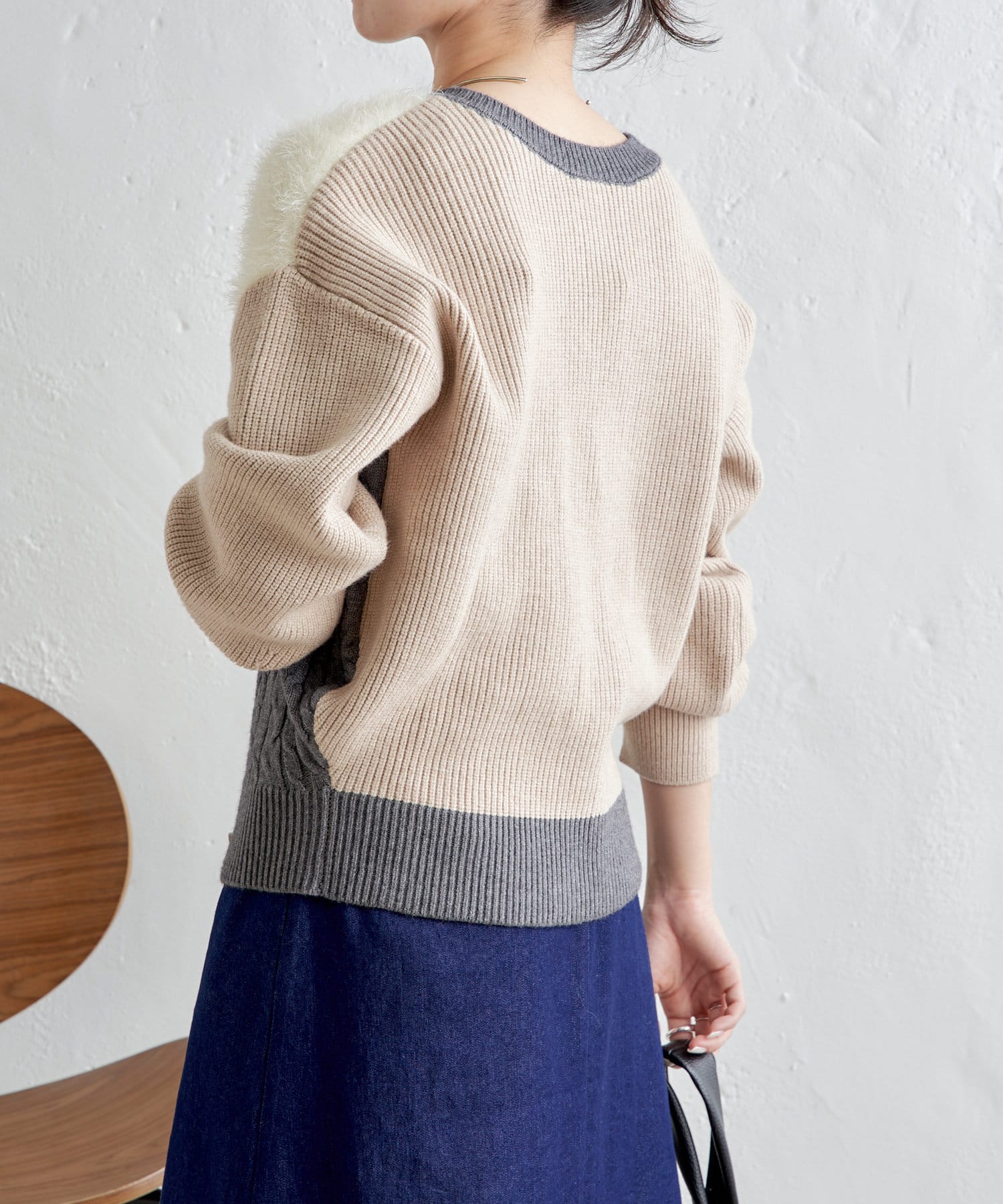 ・大きめのパネルとフェザーの切替で、1枚でスタイリングが決まるニット。