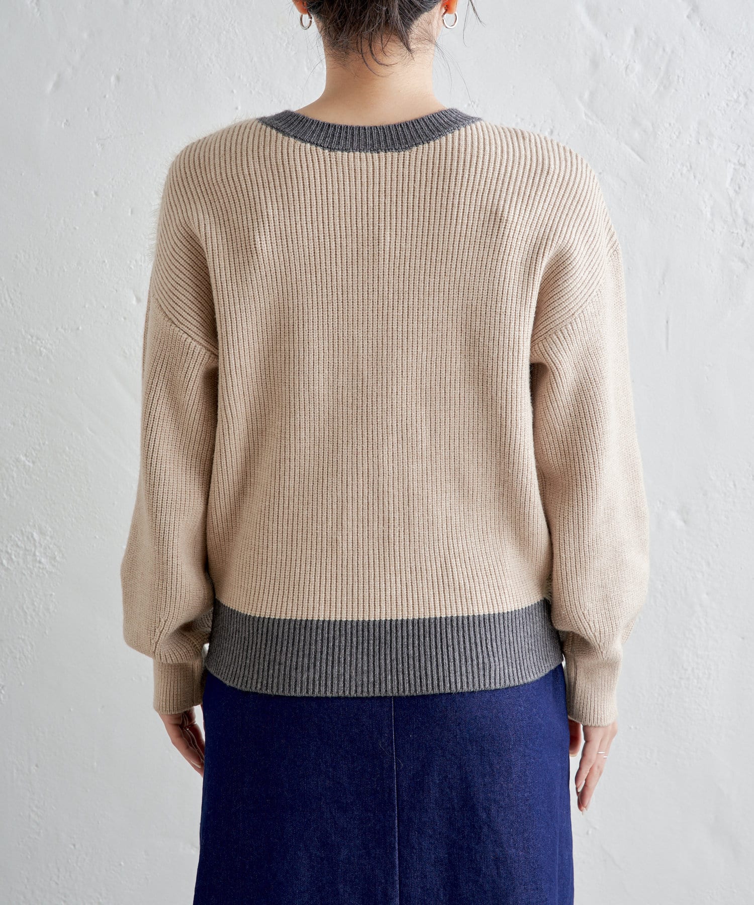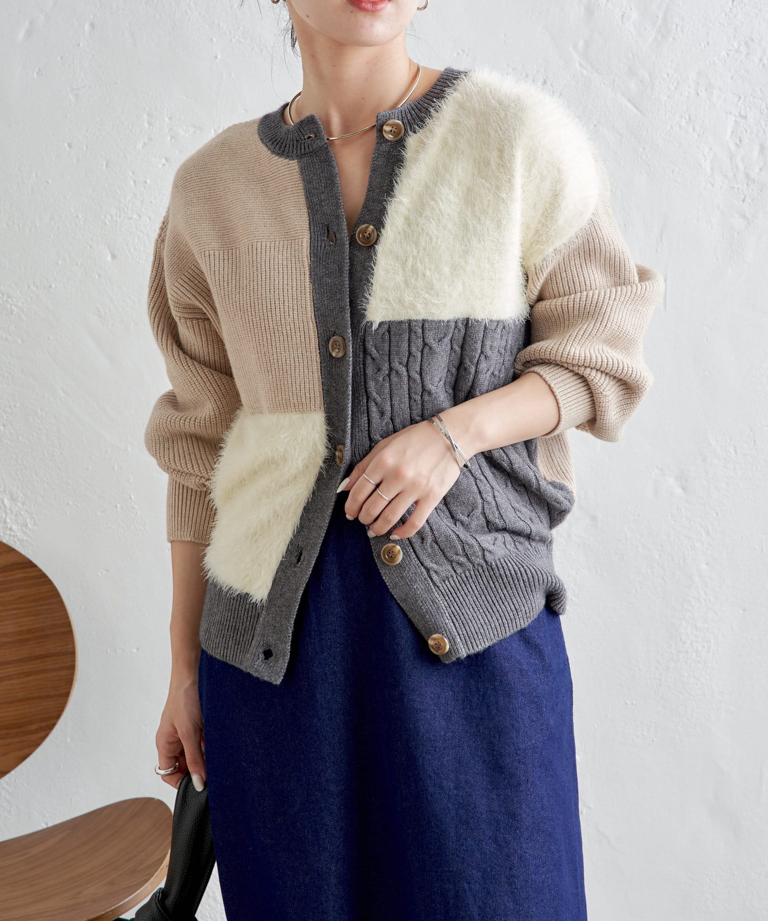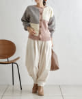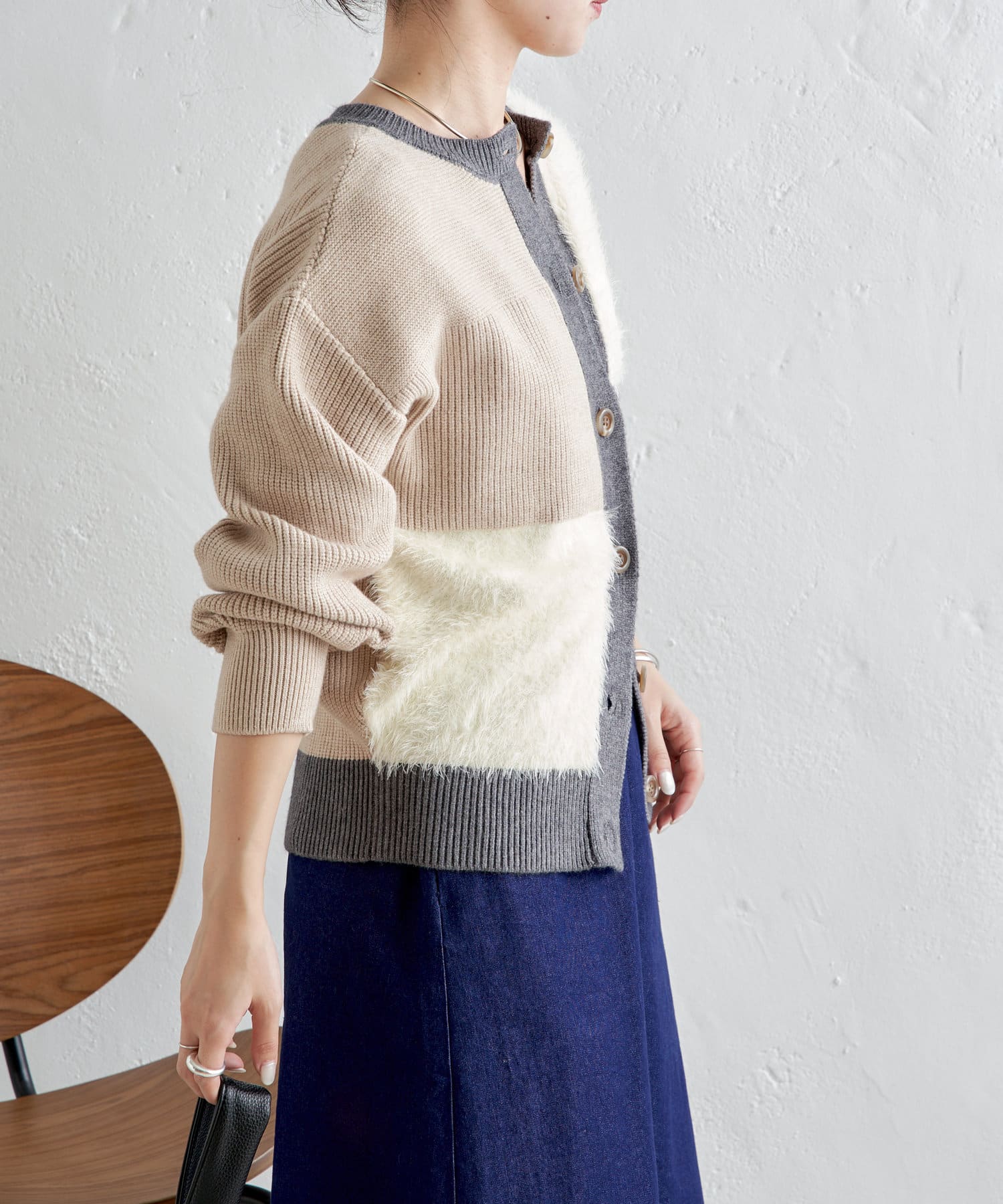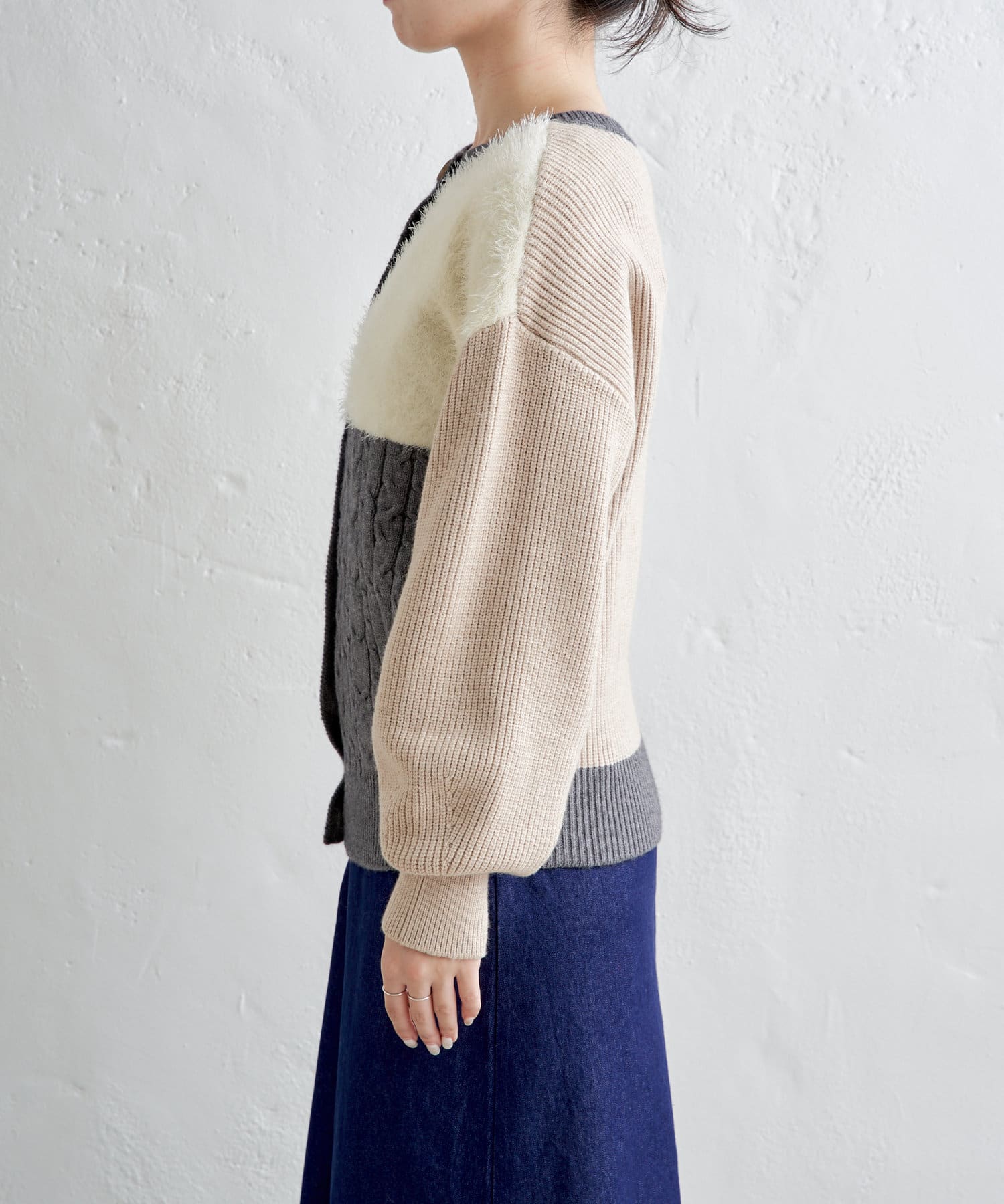 ・大きめのパネルとフェザーの切替で、1枚でスタイリングが決まるニット。