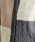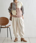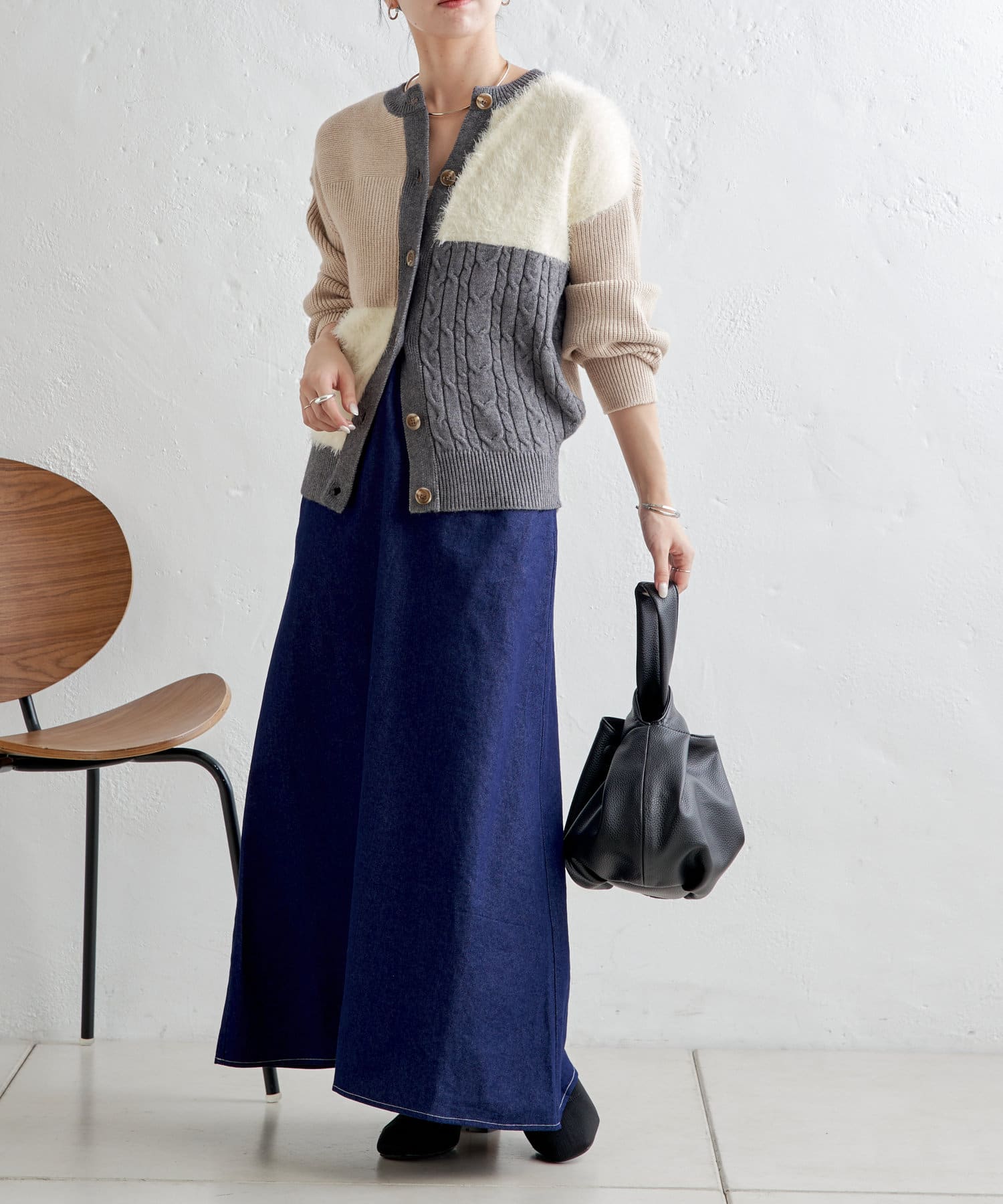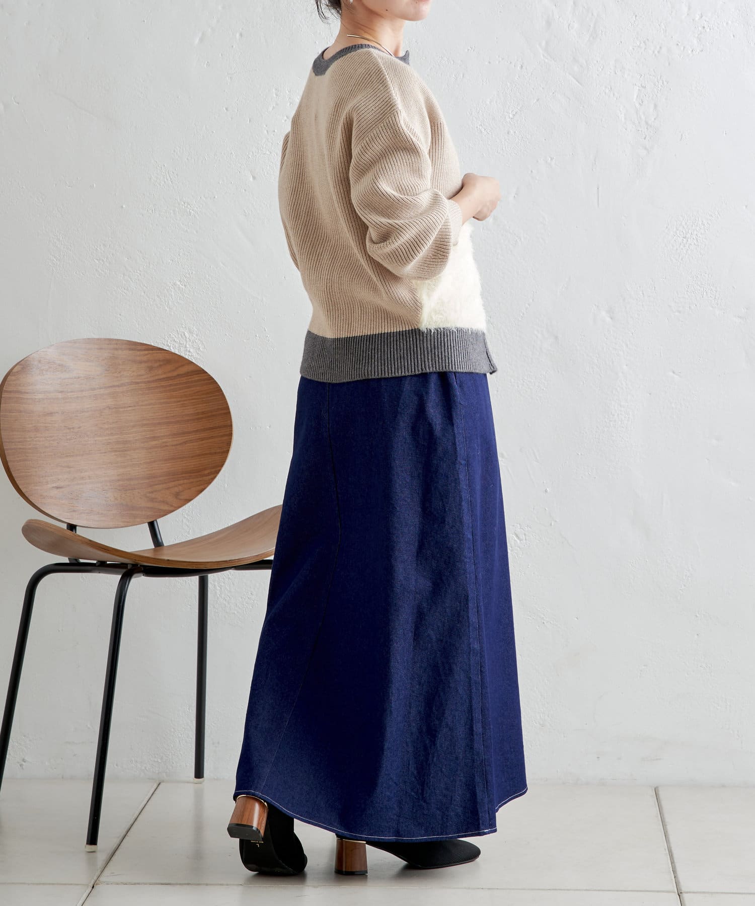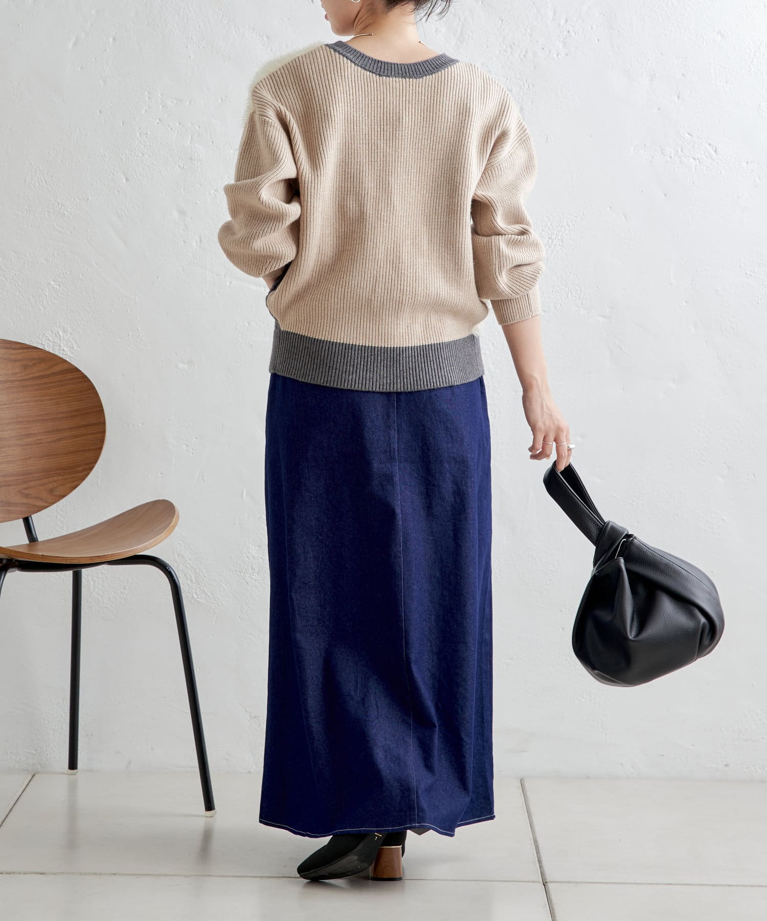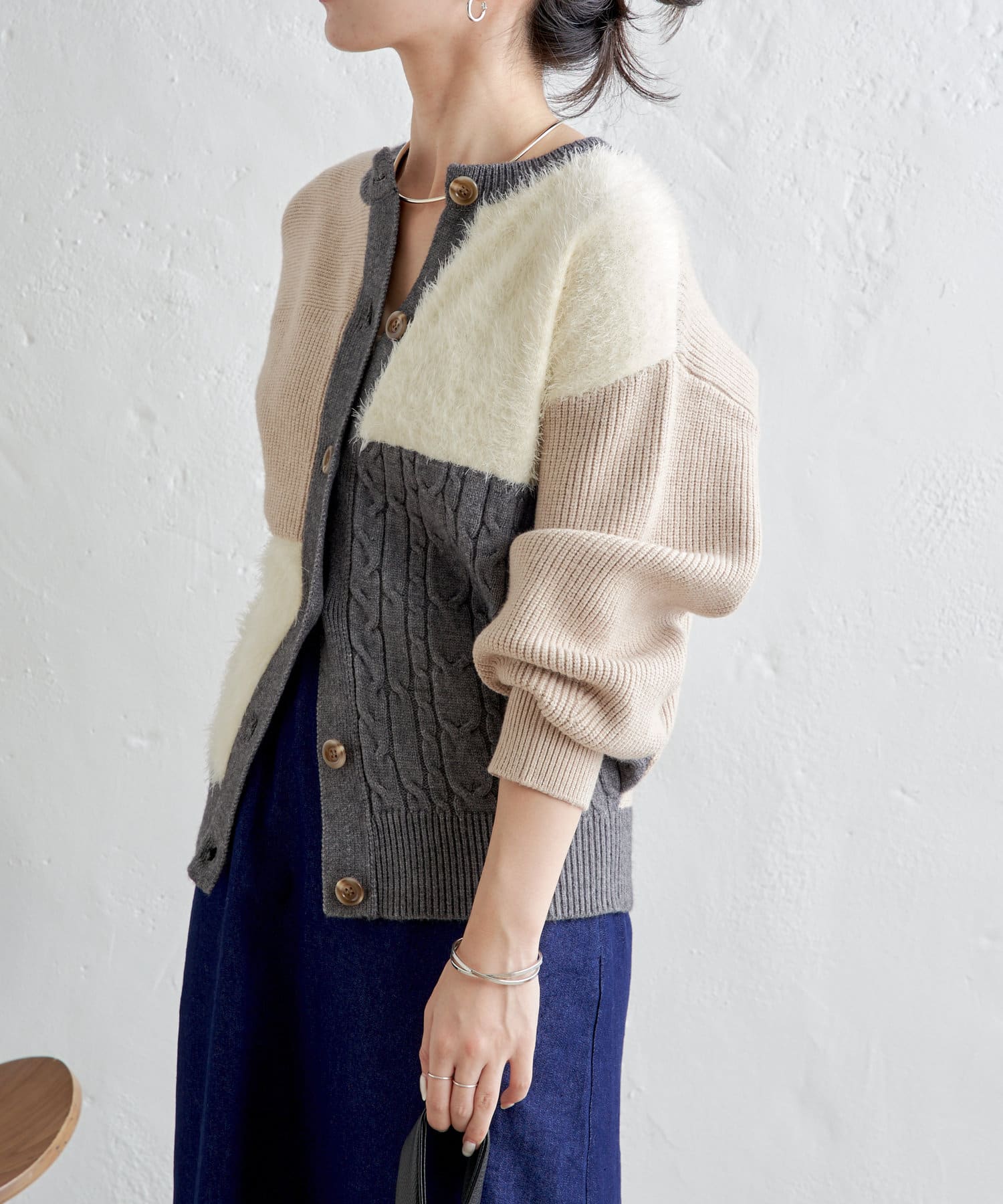 ・大きめのパネルとフェザーの切替で、1枚でスタイリングが決まるニット。