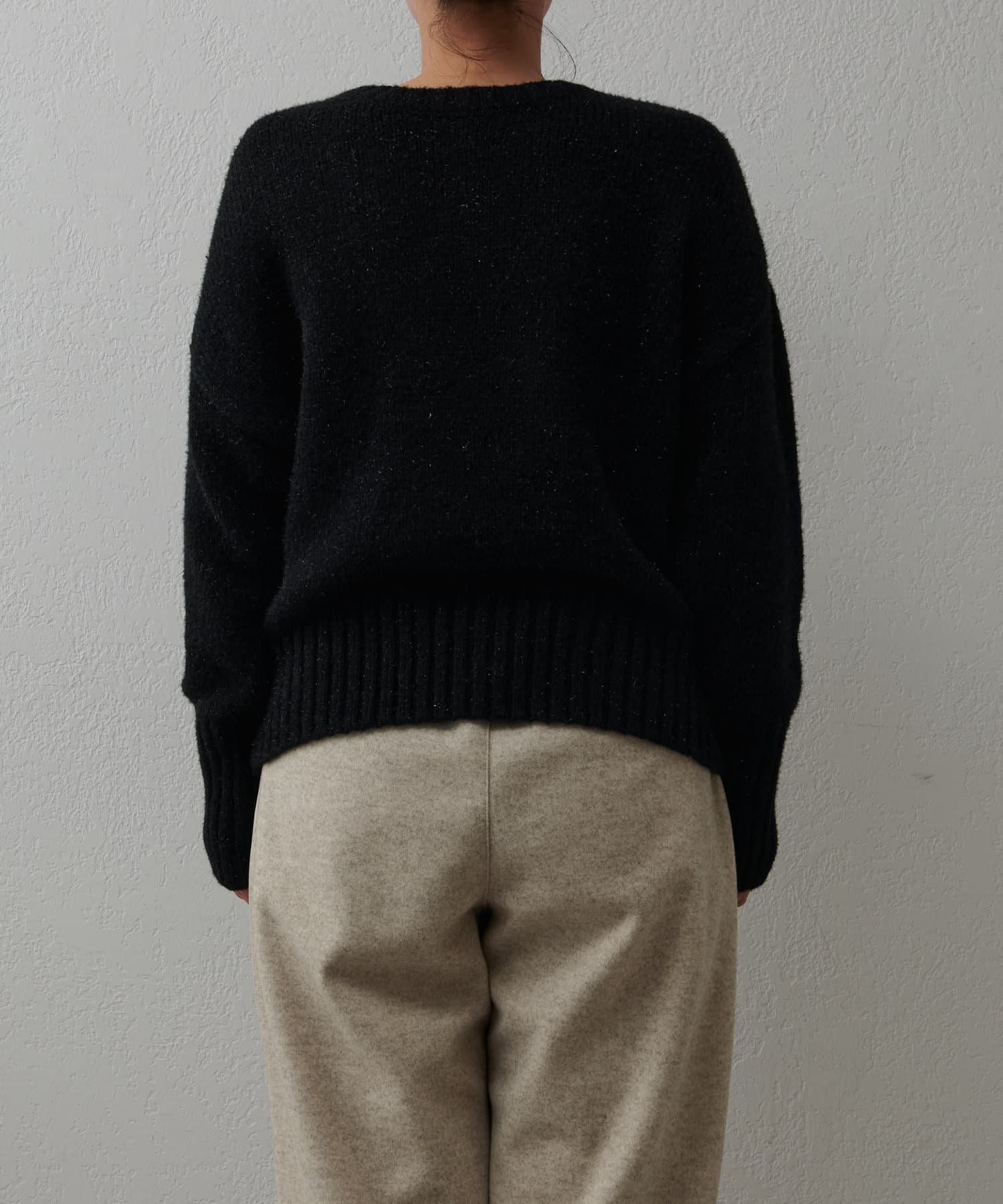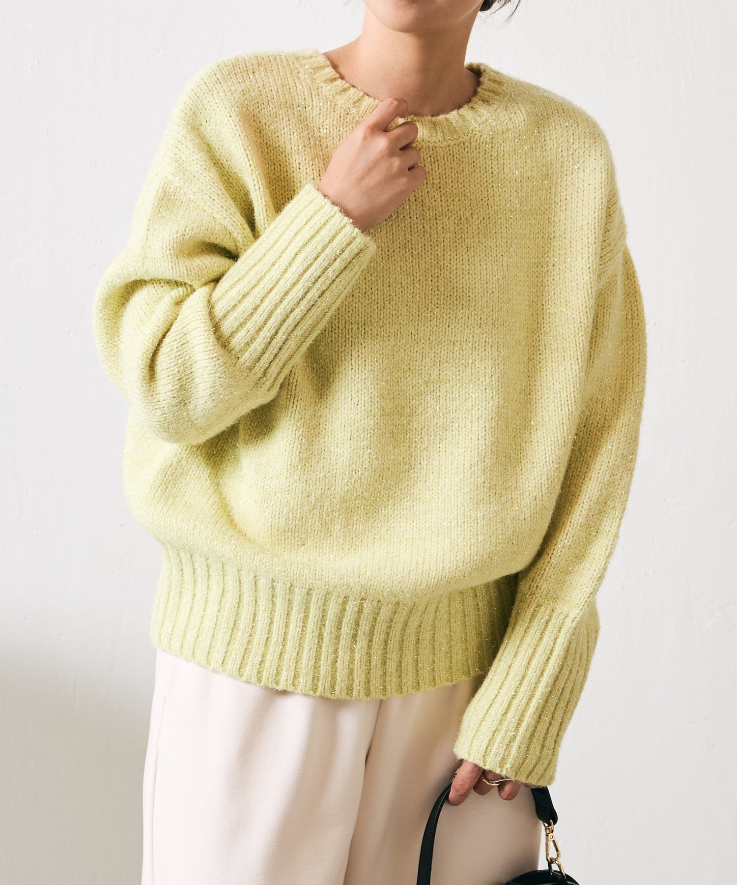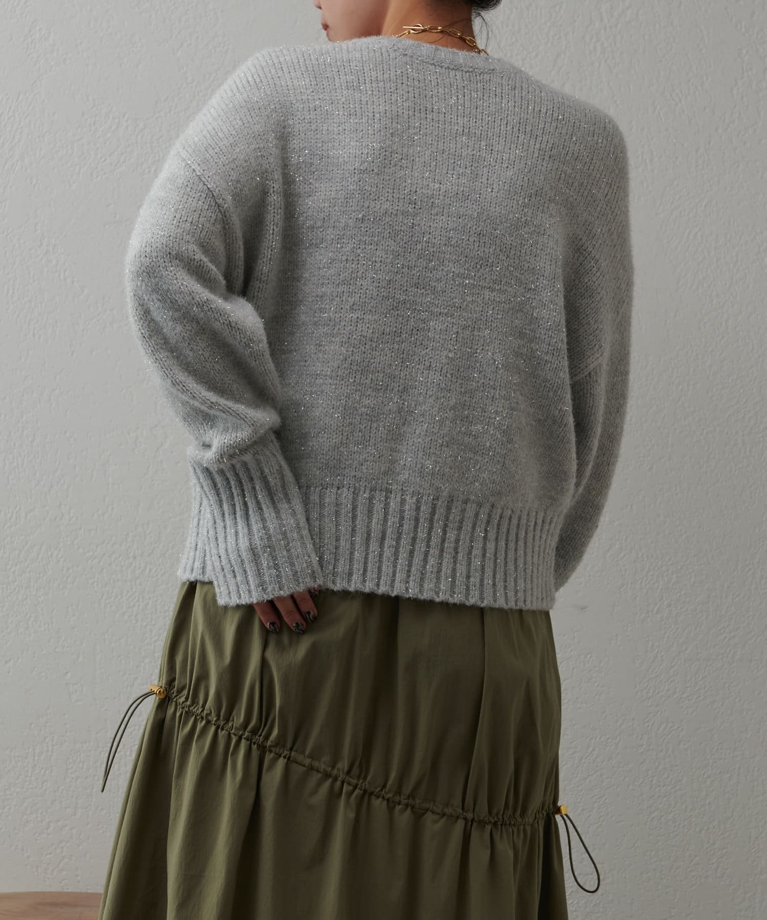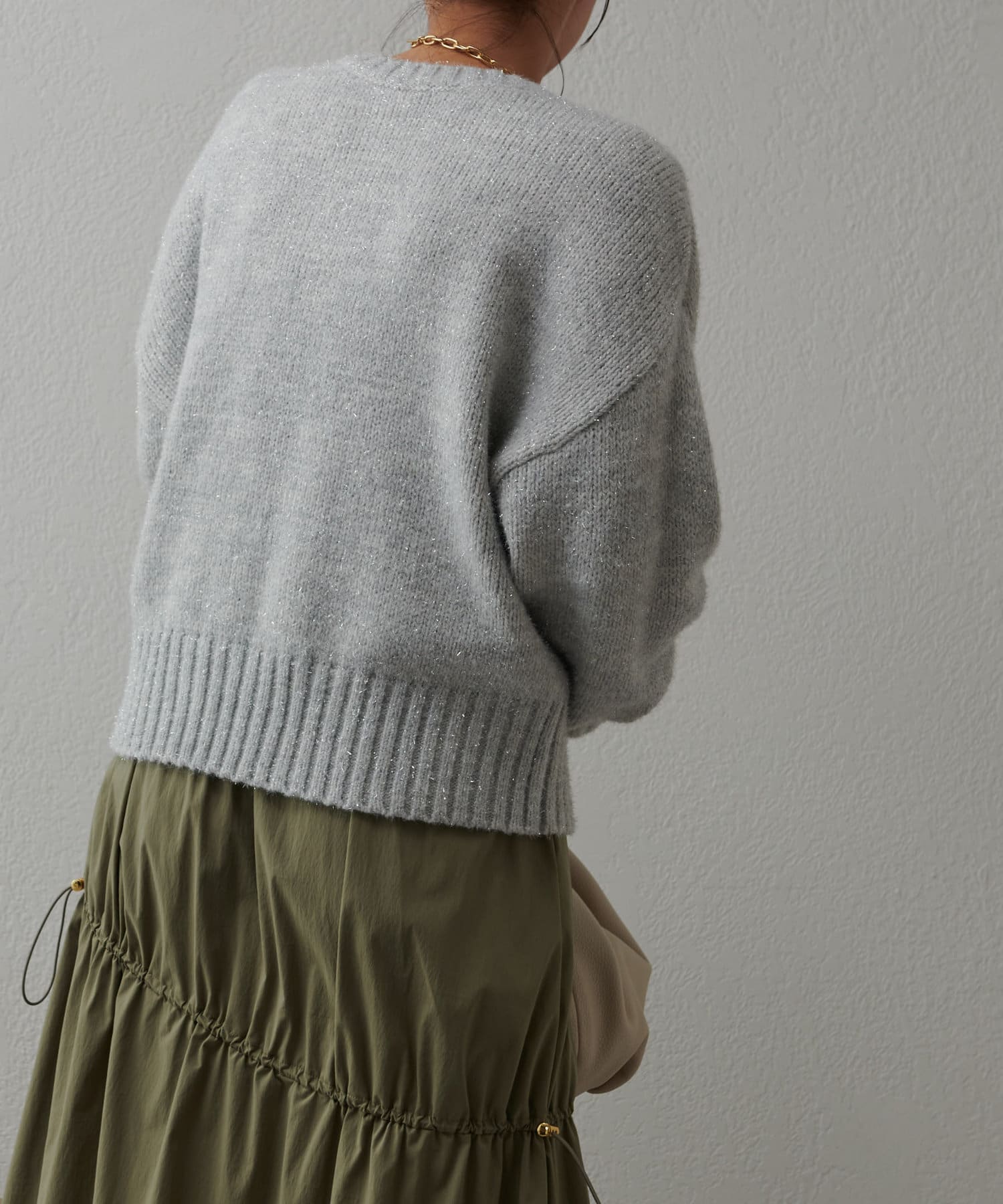 ・きらきらとしたラメ糸を使った柔らかな編み地で、コーディネートに華やかさをプラスしてくれる一枚です。