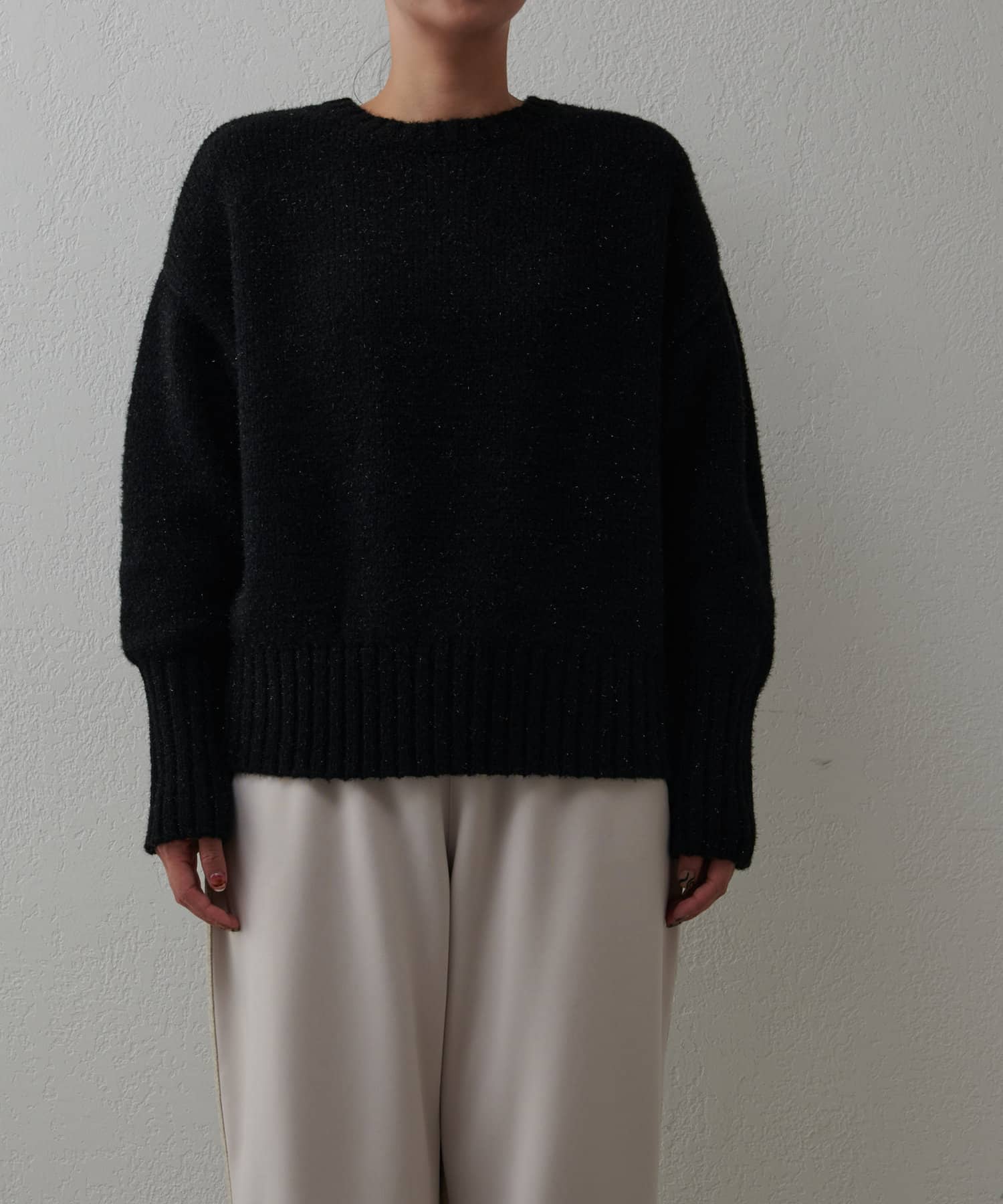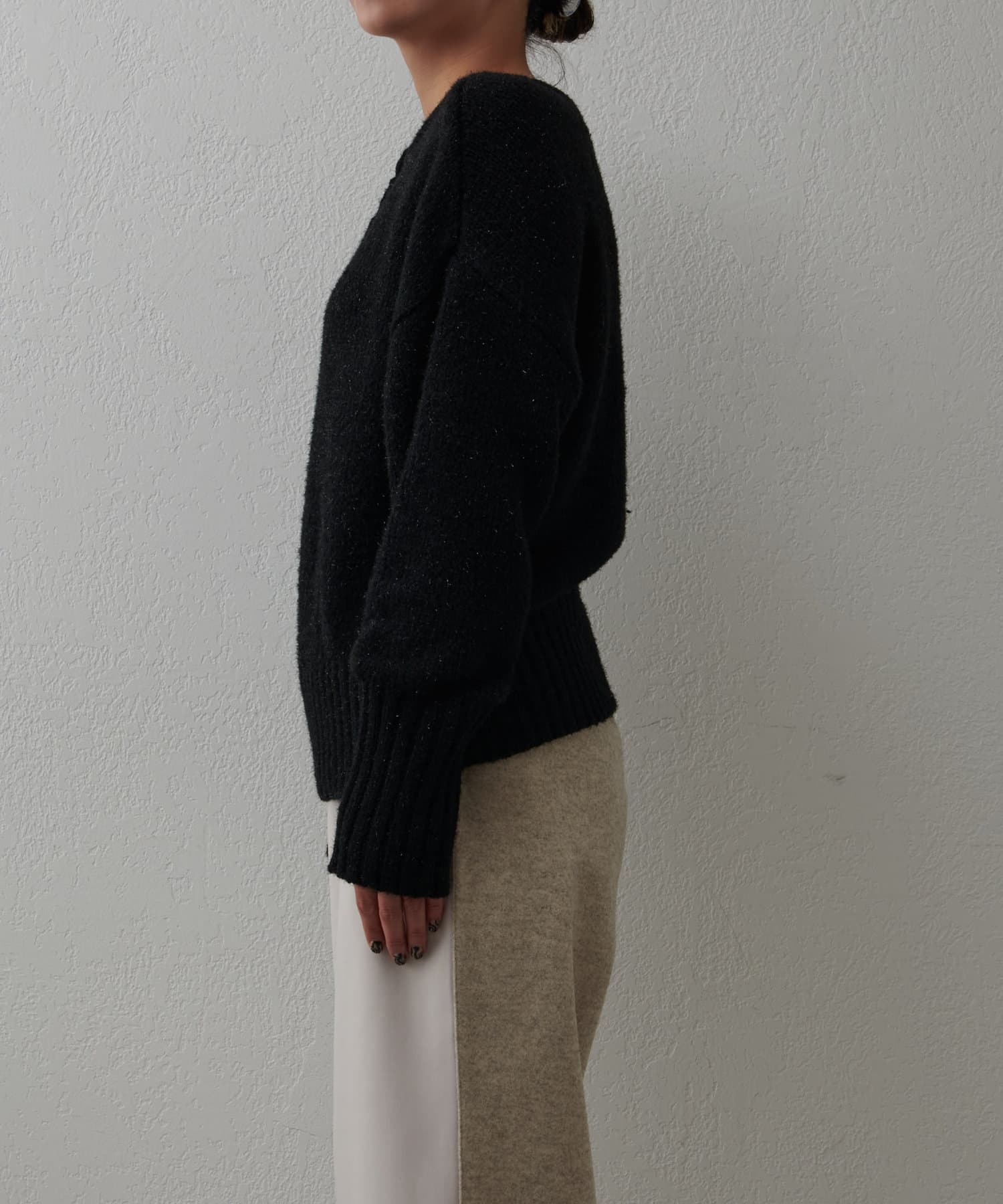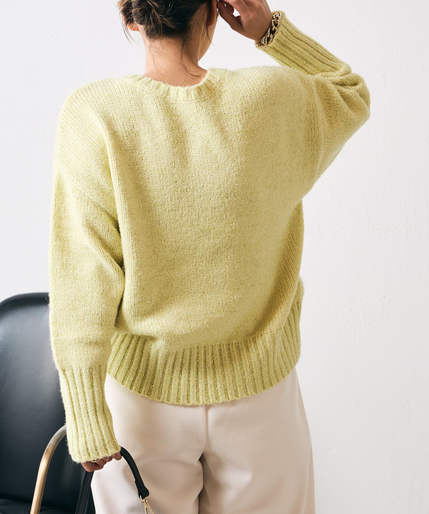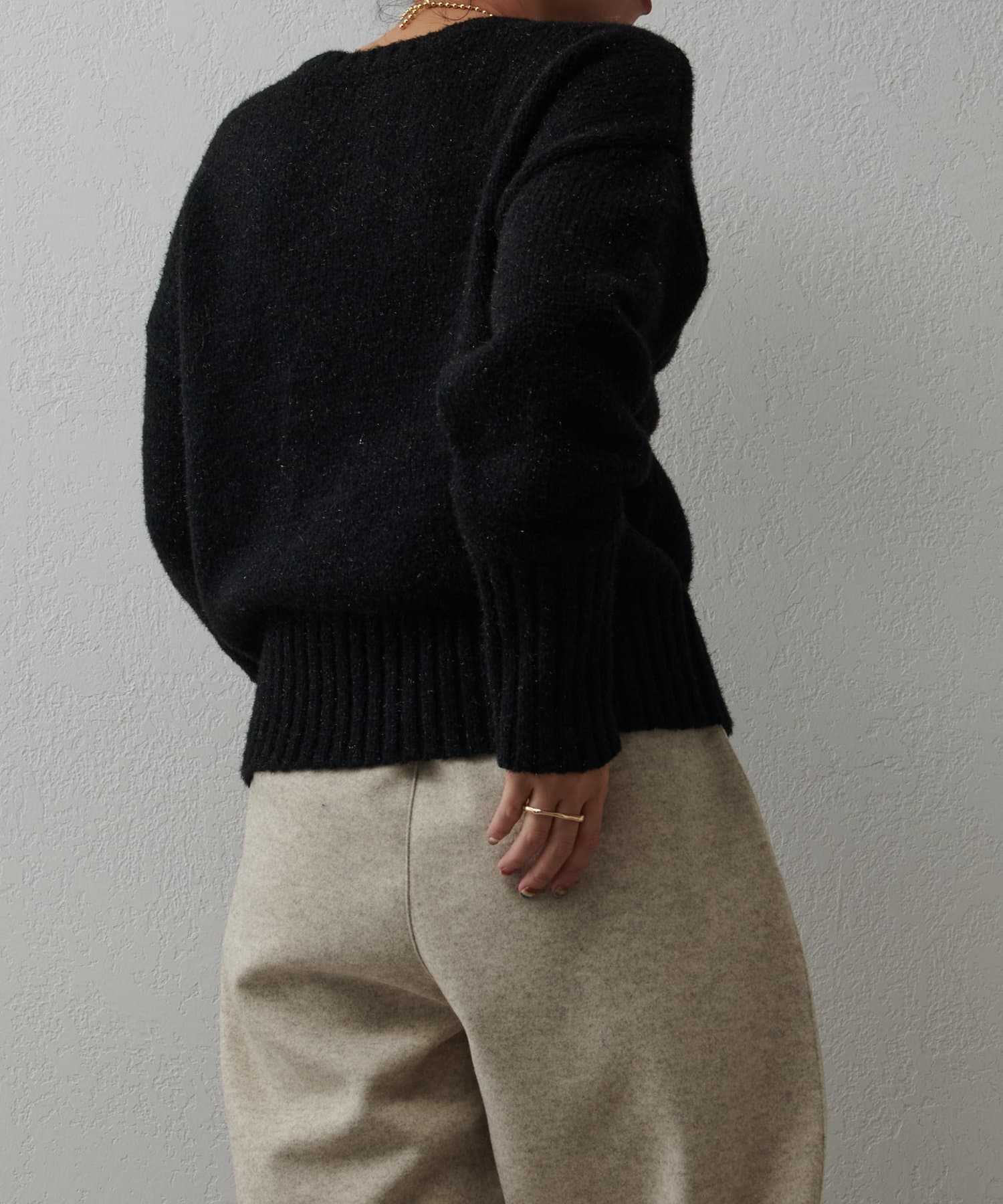 ・きらきらとしたラメ糸を使った柔らかな編み地で、コーディネートに華やかさをプラスしてくれる一枚です。
