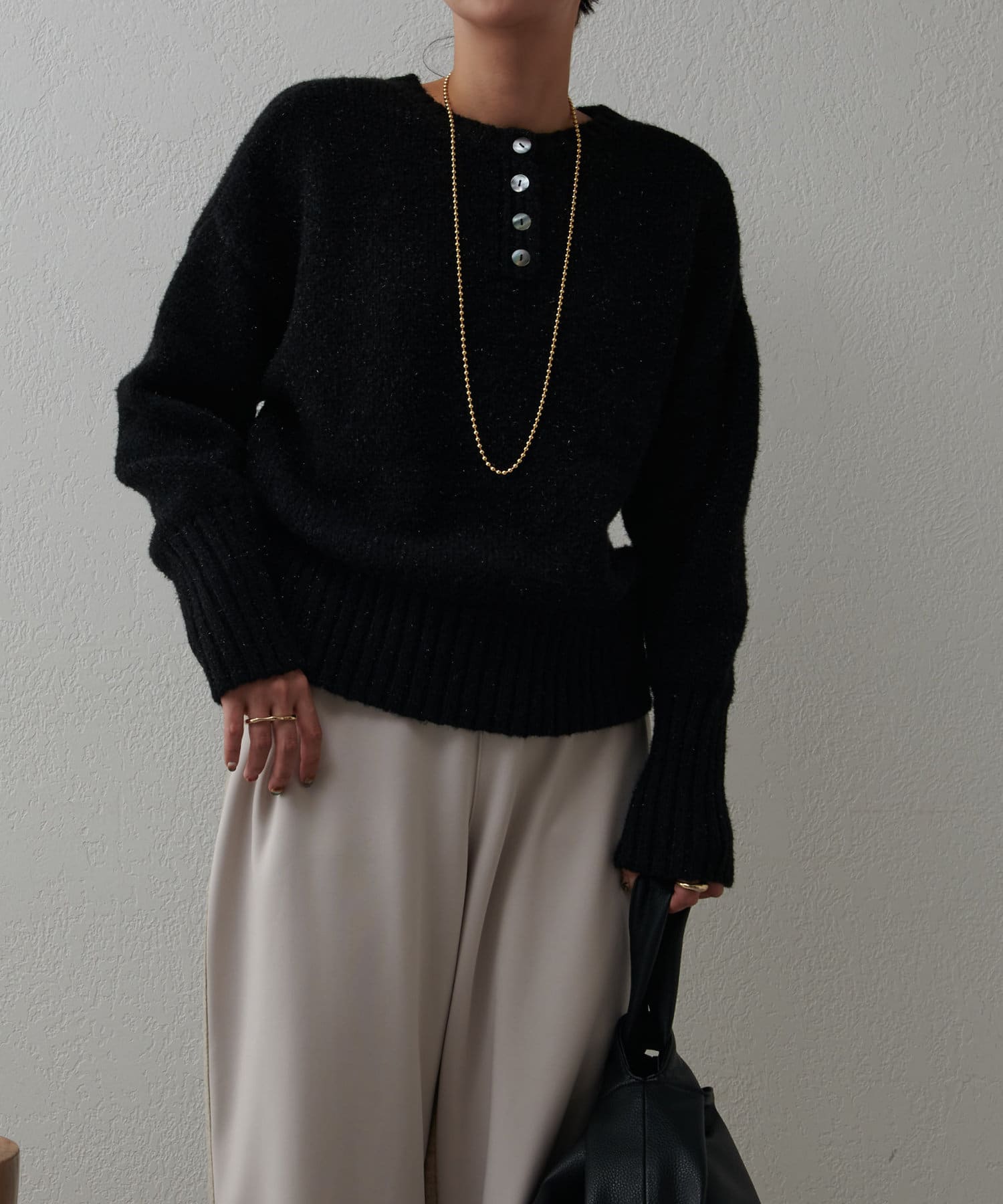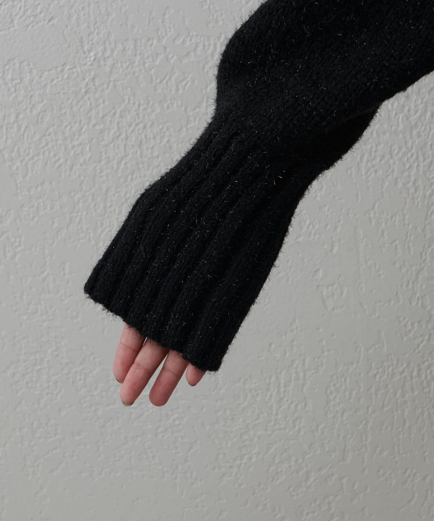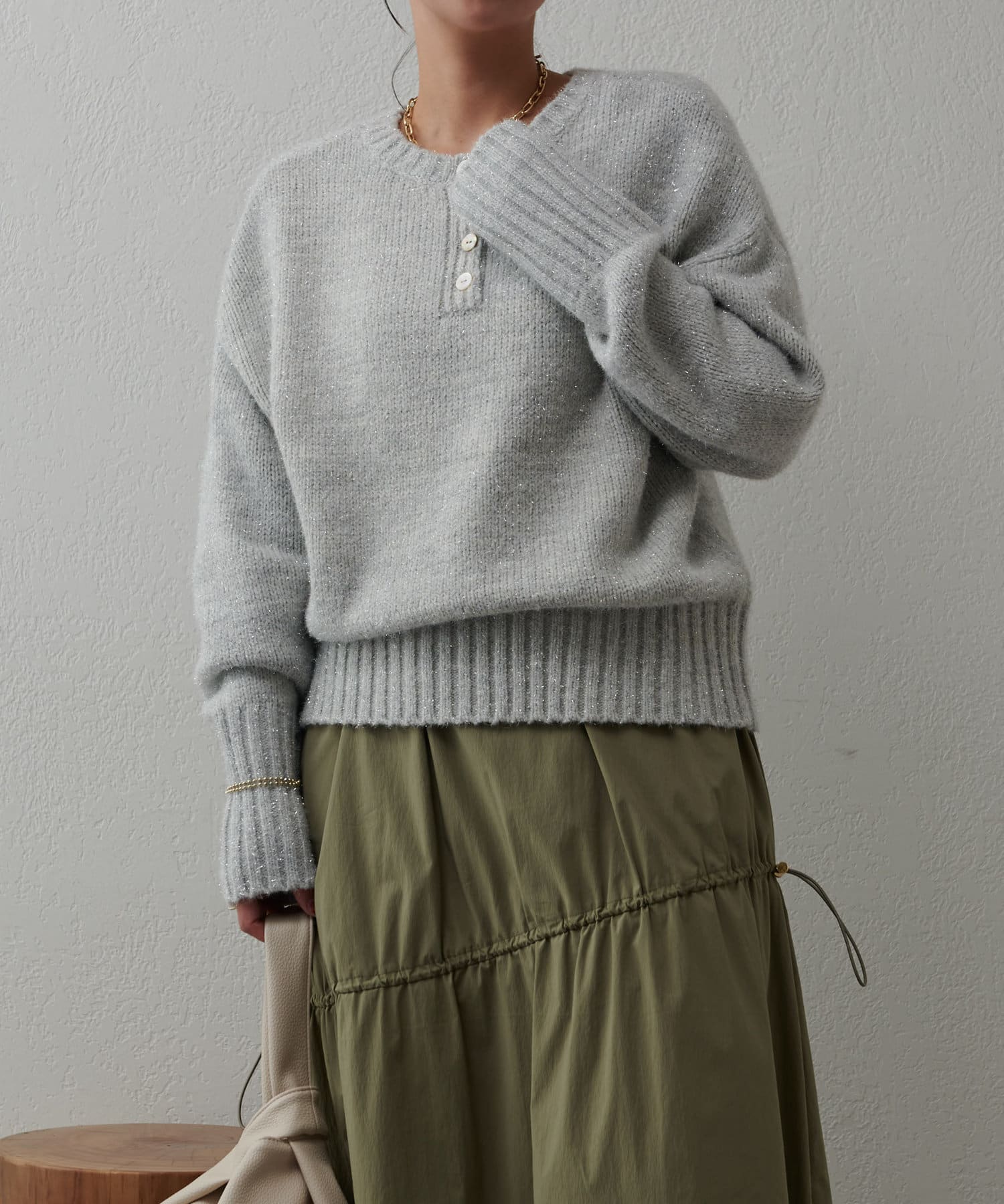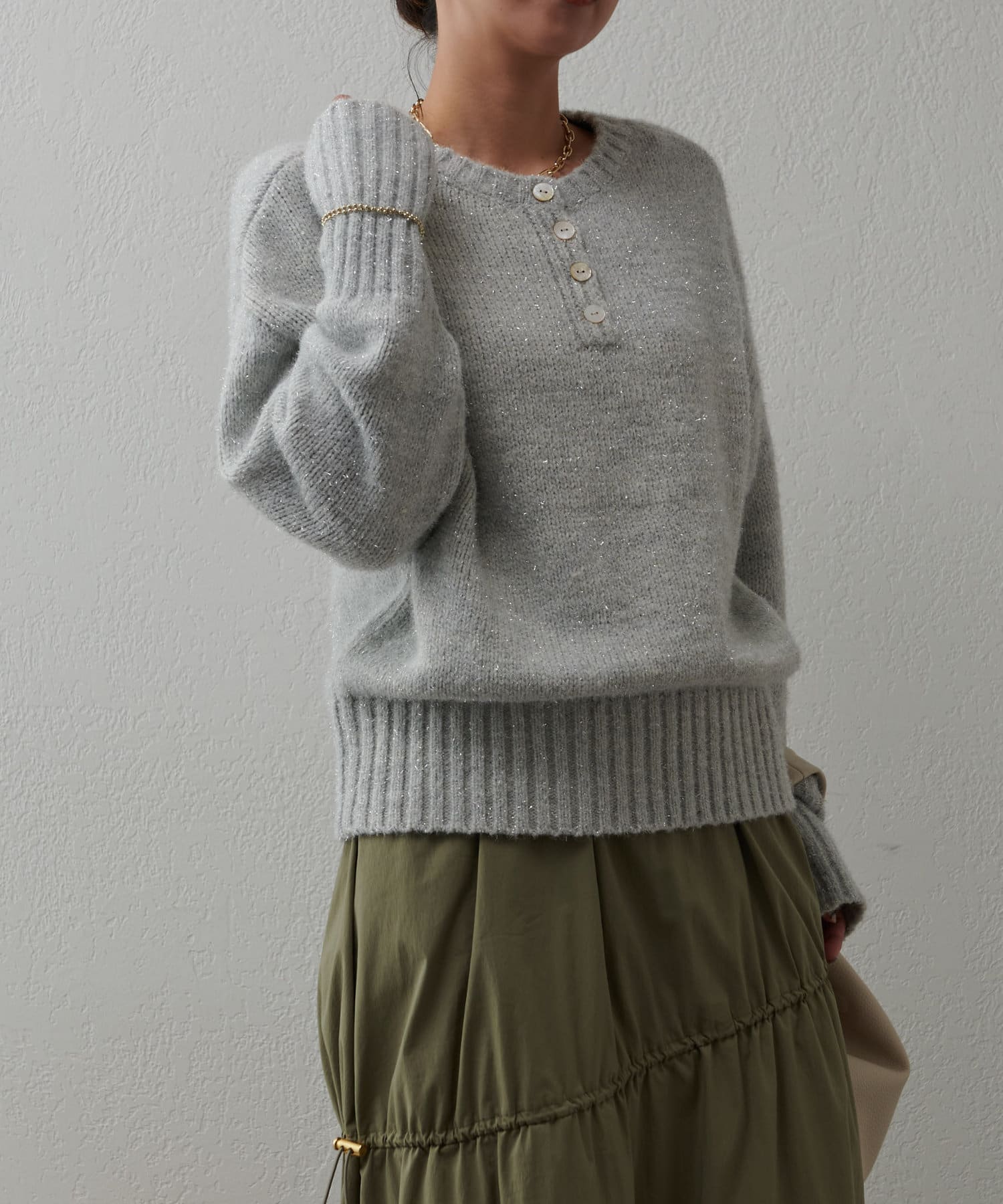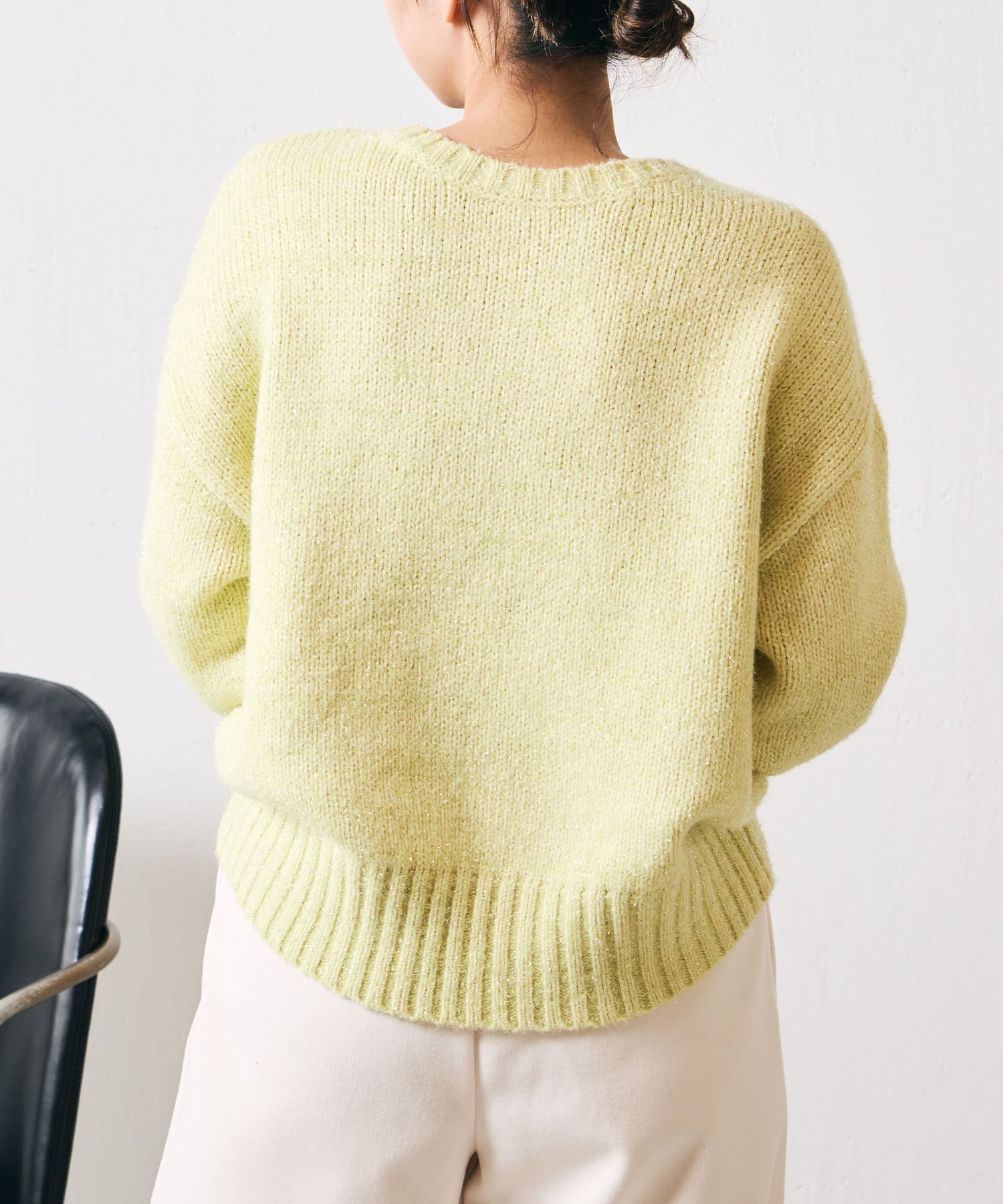 ・きらきらとしたラメ糸を使った柔らかな編み地で、コーディネートに華やかさをプラスしてくれる一枚です。
