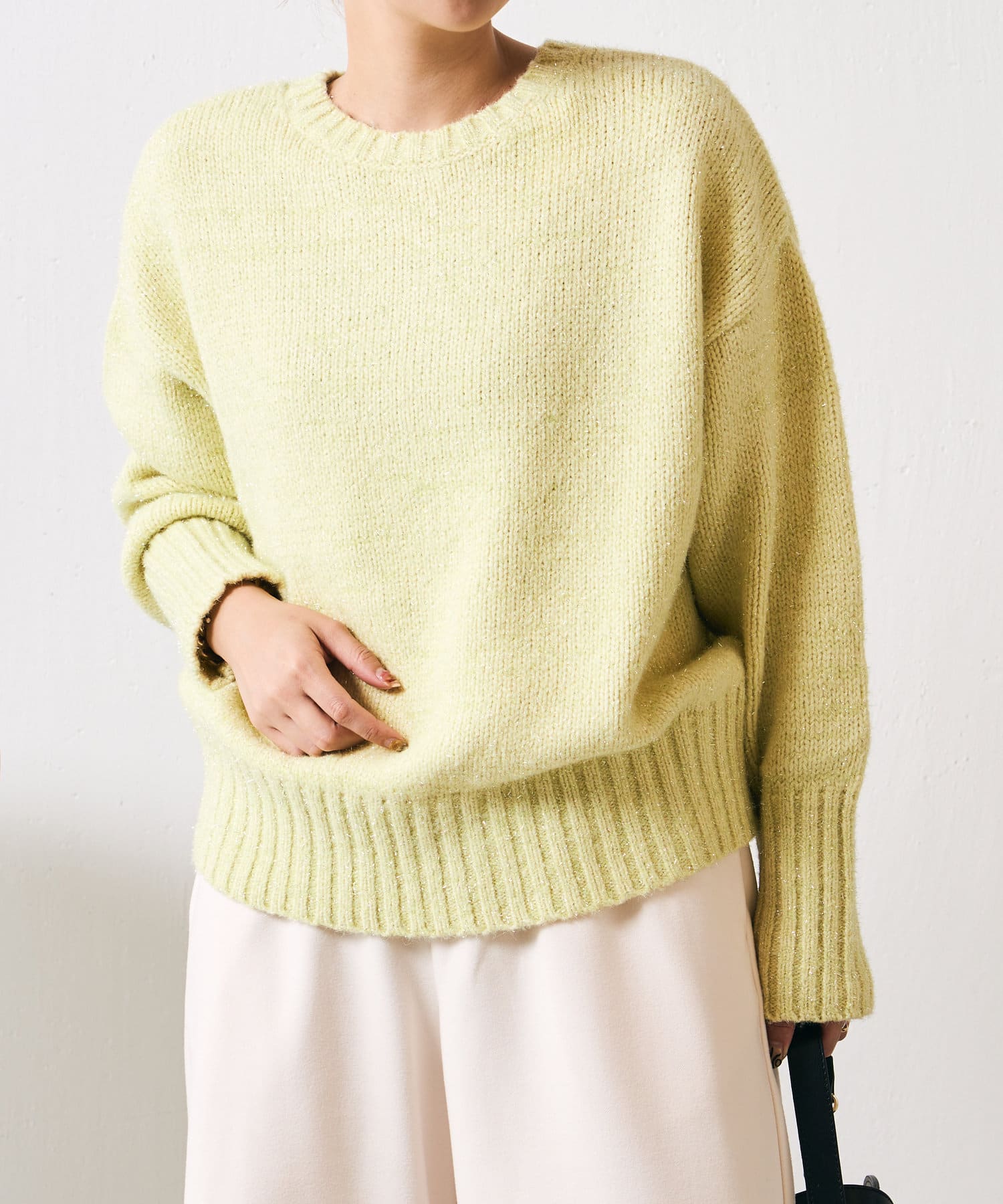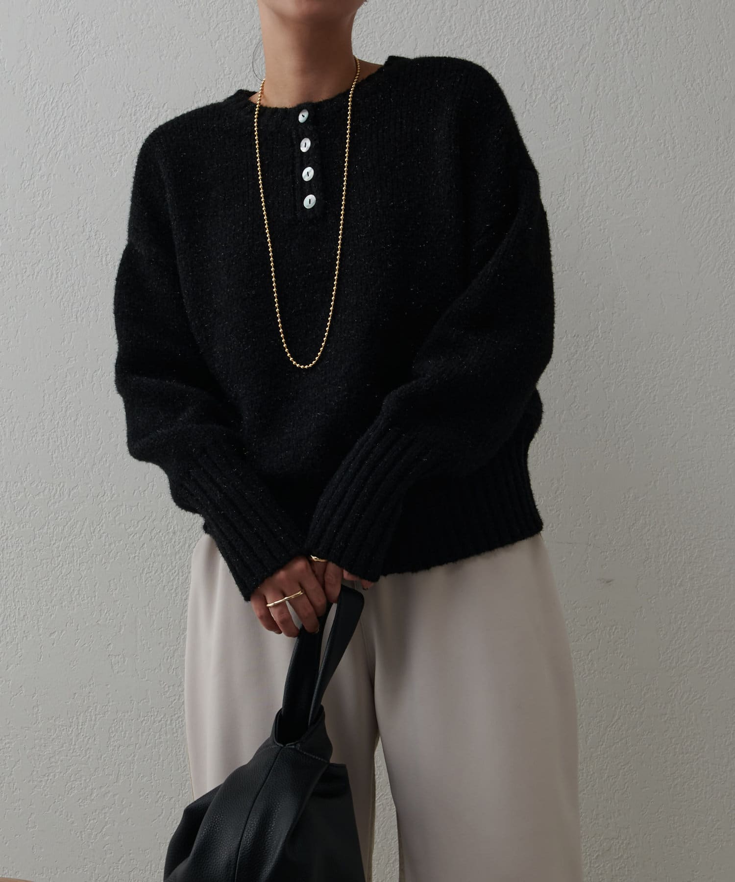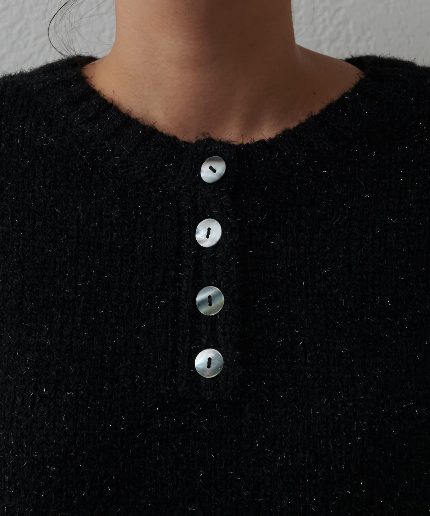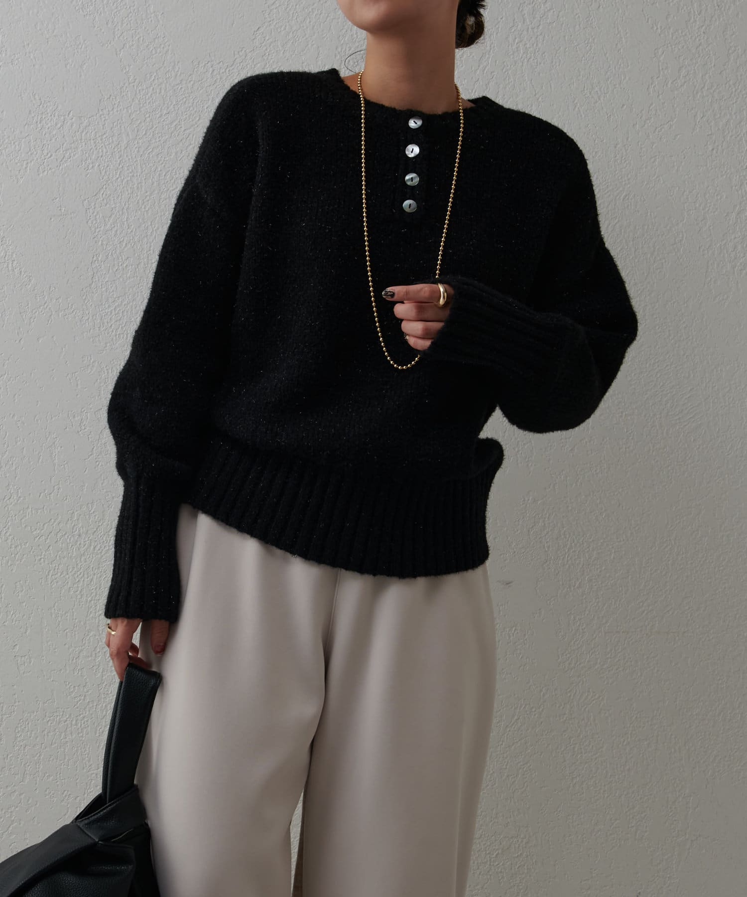 ・きらきらとしたラメ糸を使った柔らかな編み地で、コーディネートに華やかさをプラスしてくれる一枚です。
