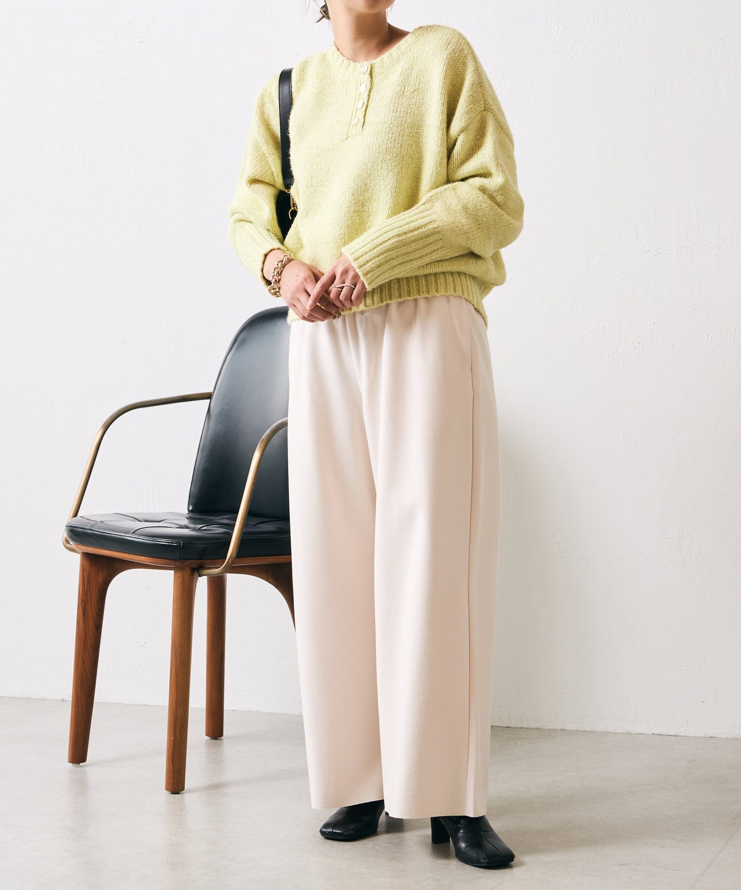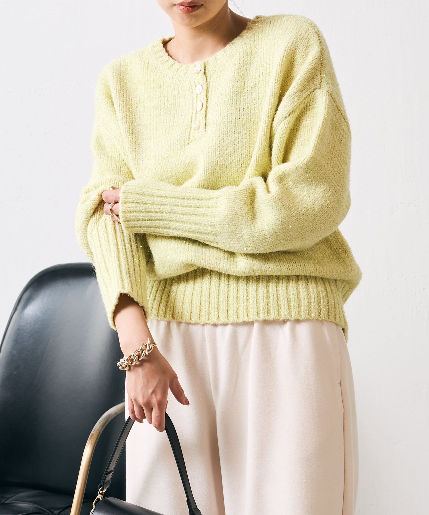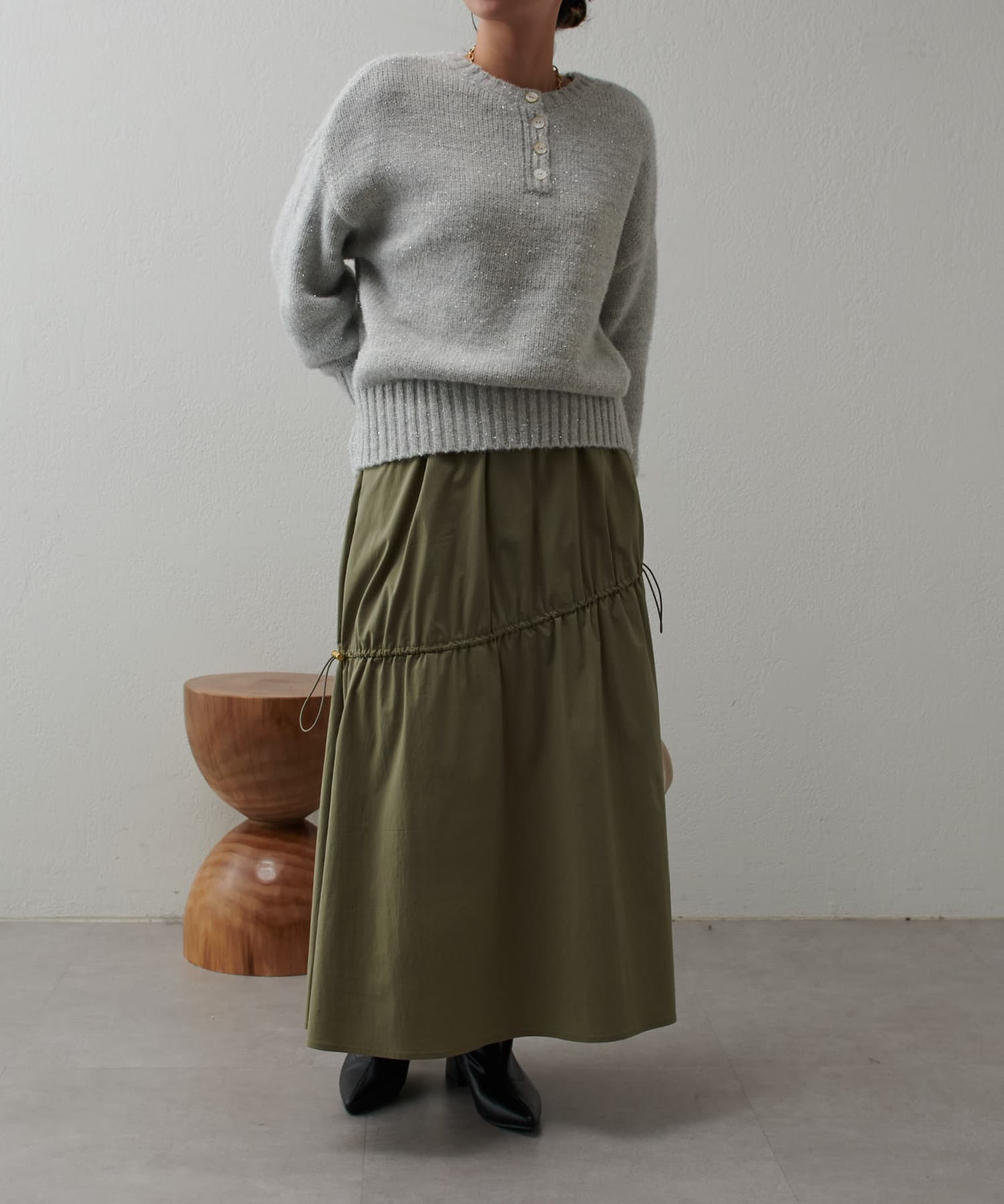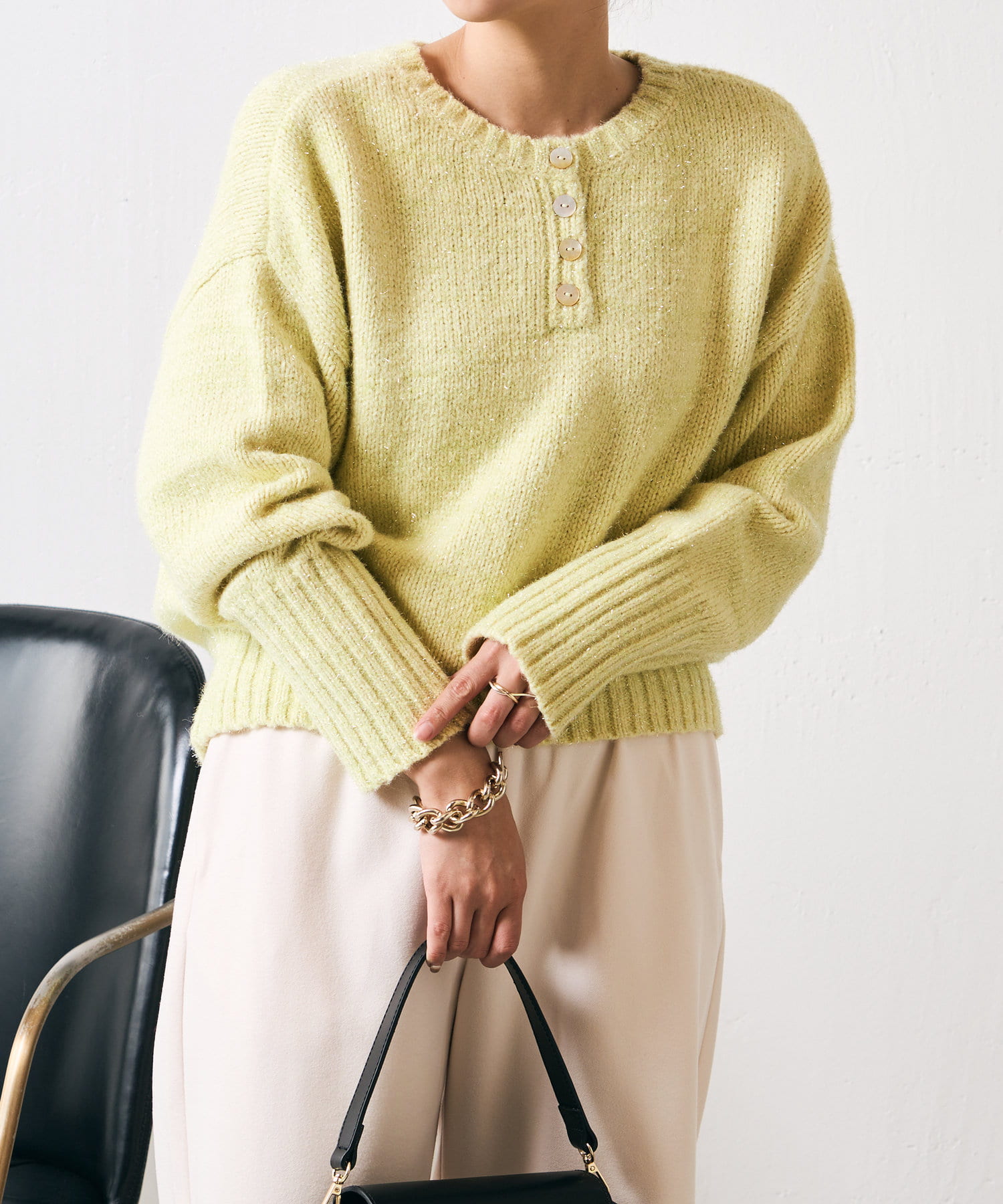 ・きらきらとしたラメ糸を使った柔らかな編み地で、コーディネートに華やかさをプラスしてくれる一枚です。
