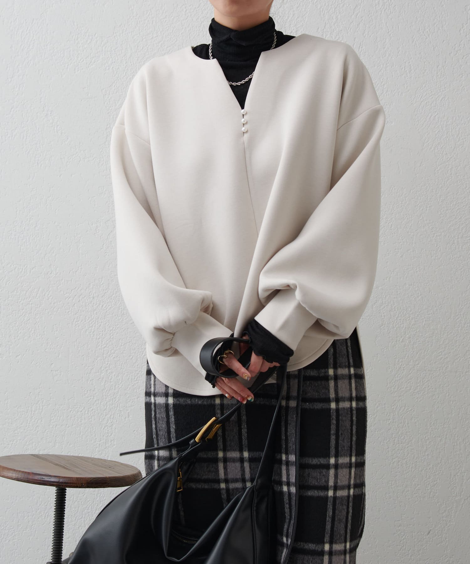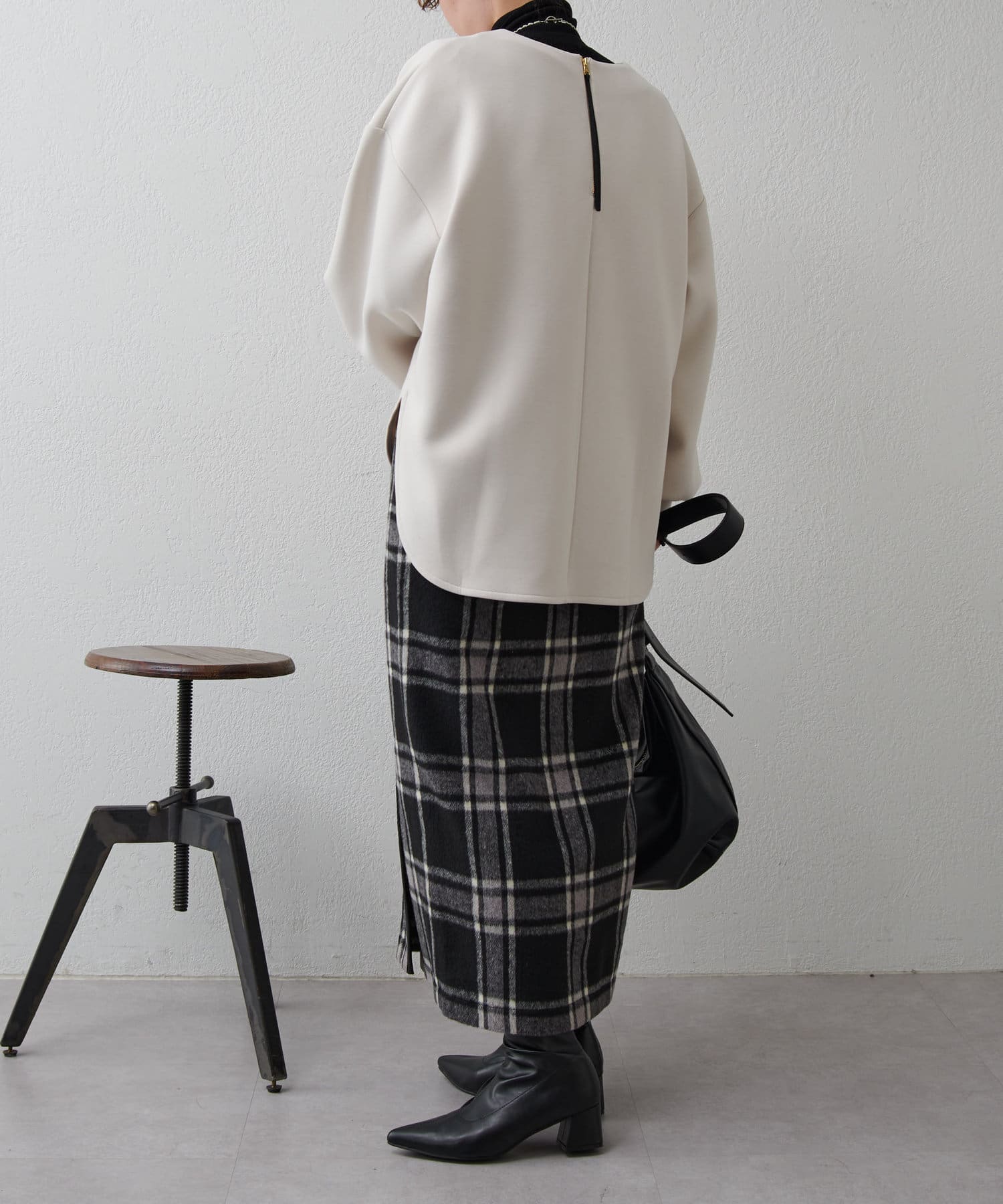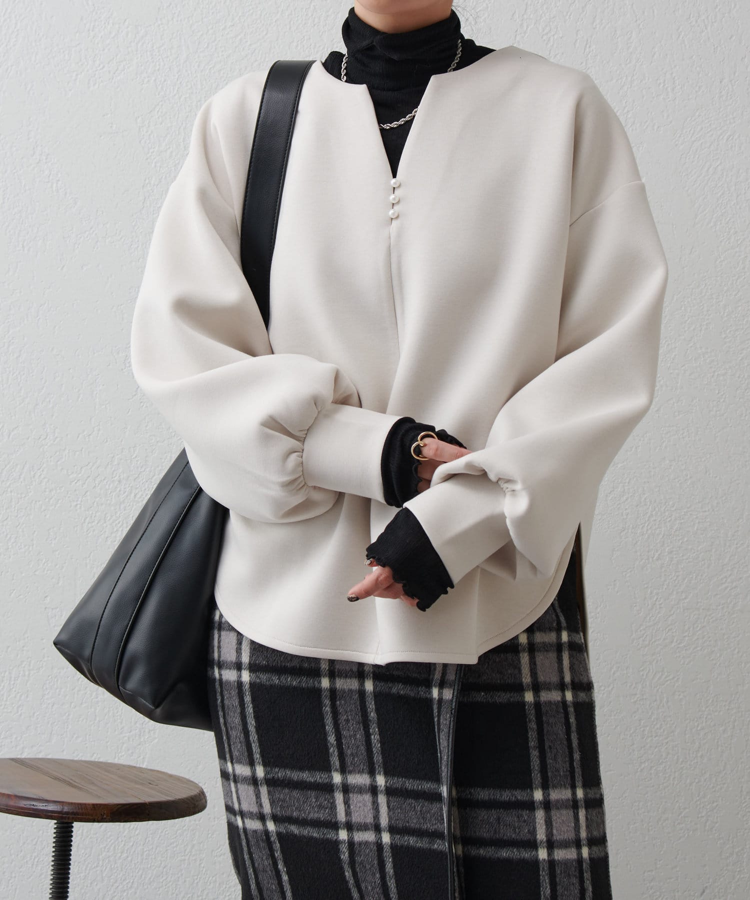 ニット以外で冬も重ね着して使えそうなものを探していたところ、こちらを見つけて即決!着た時の首周りと後ろのデザインがとても素敵です。春秋は1枚でシーズン長く使えそうです!