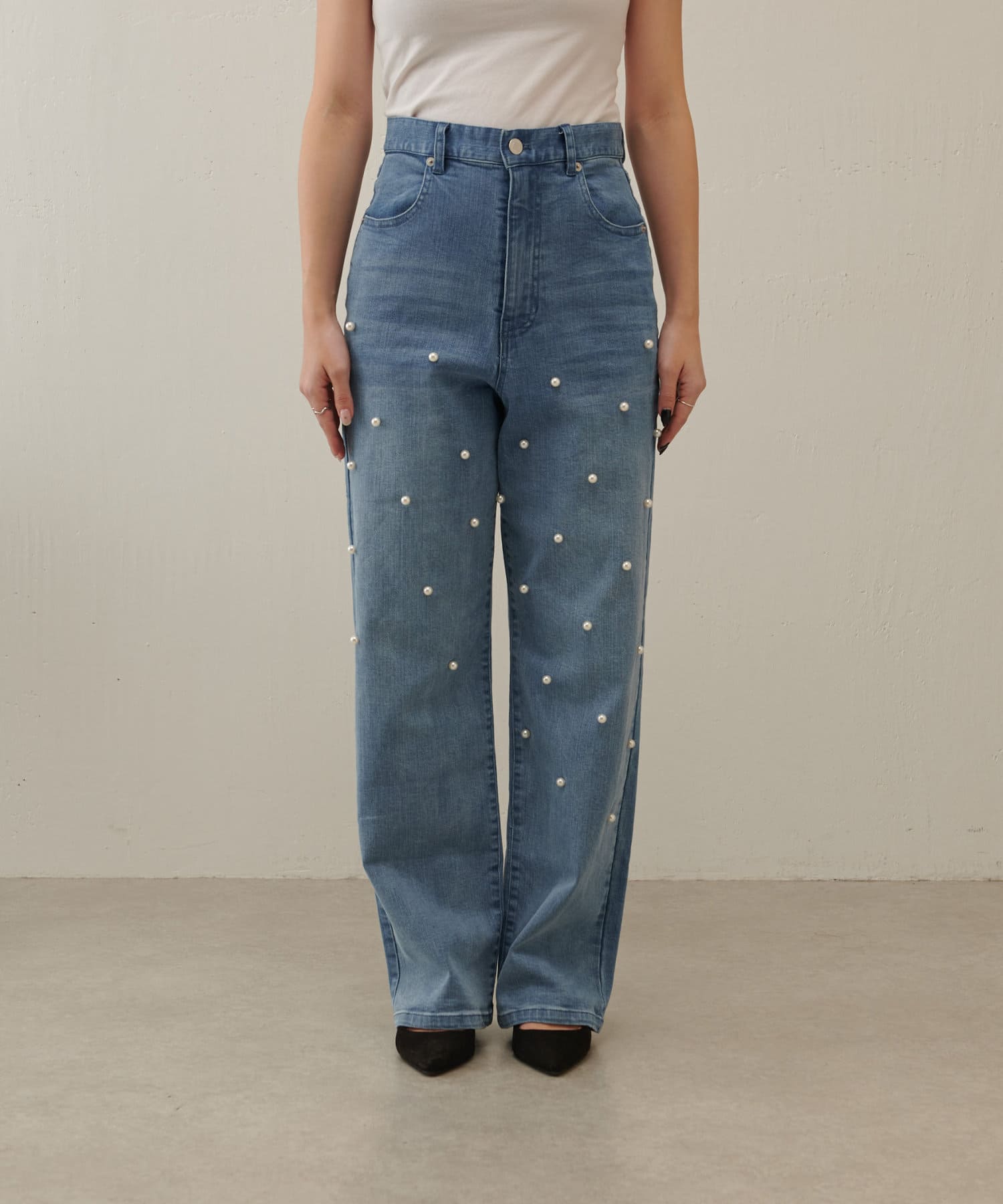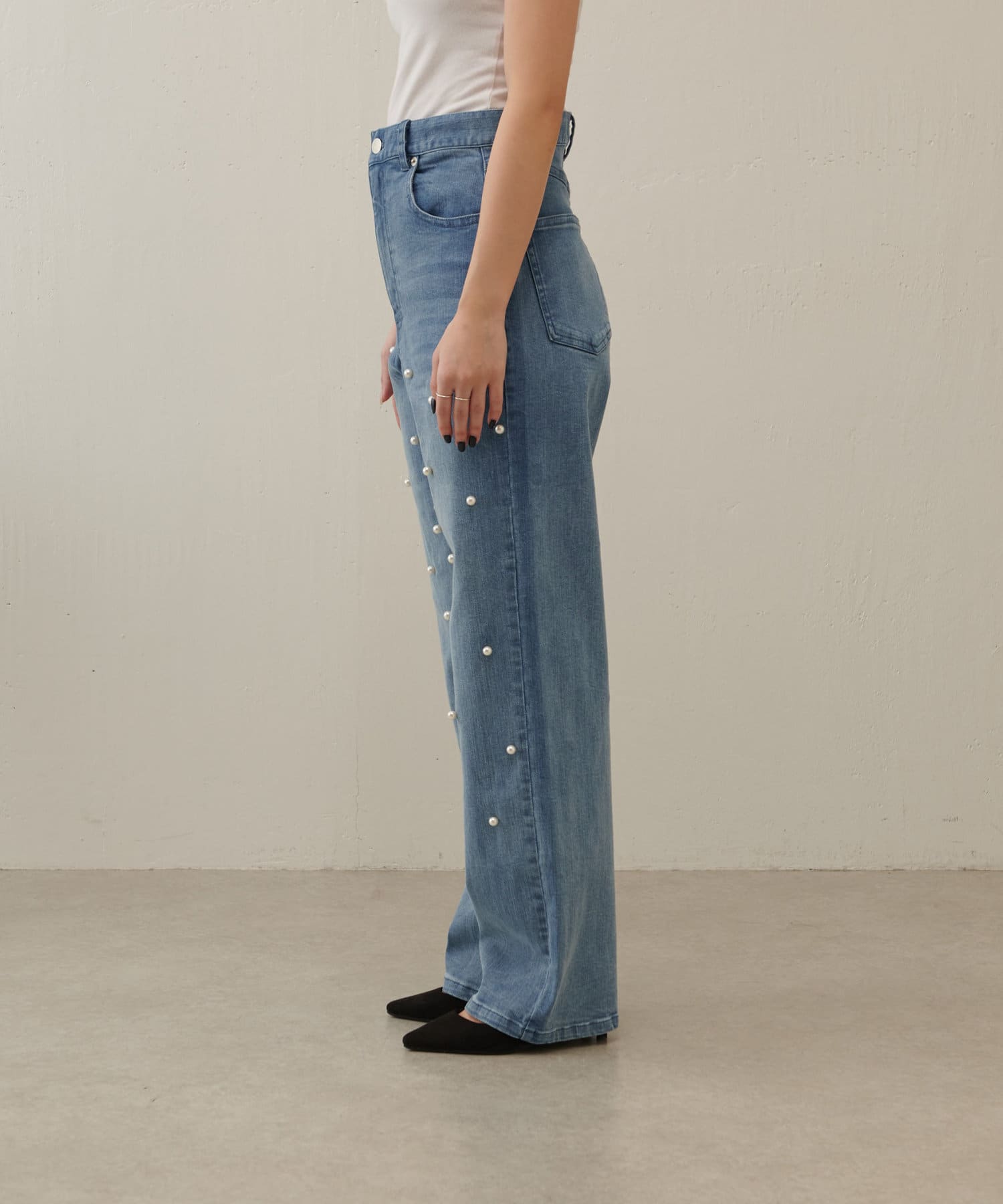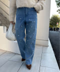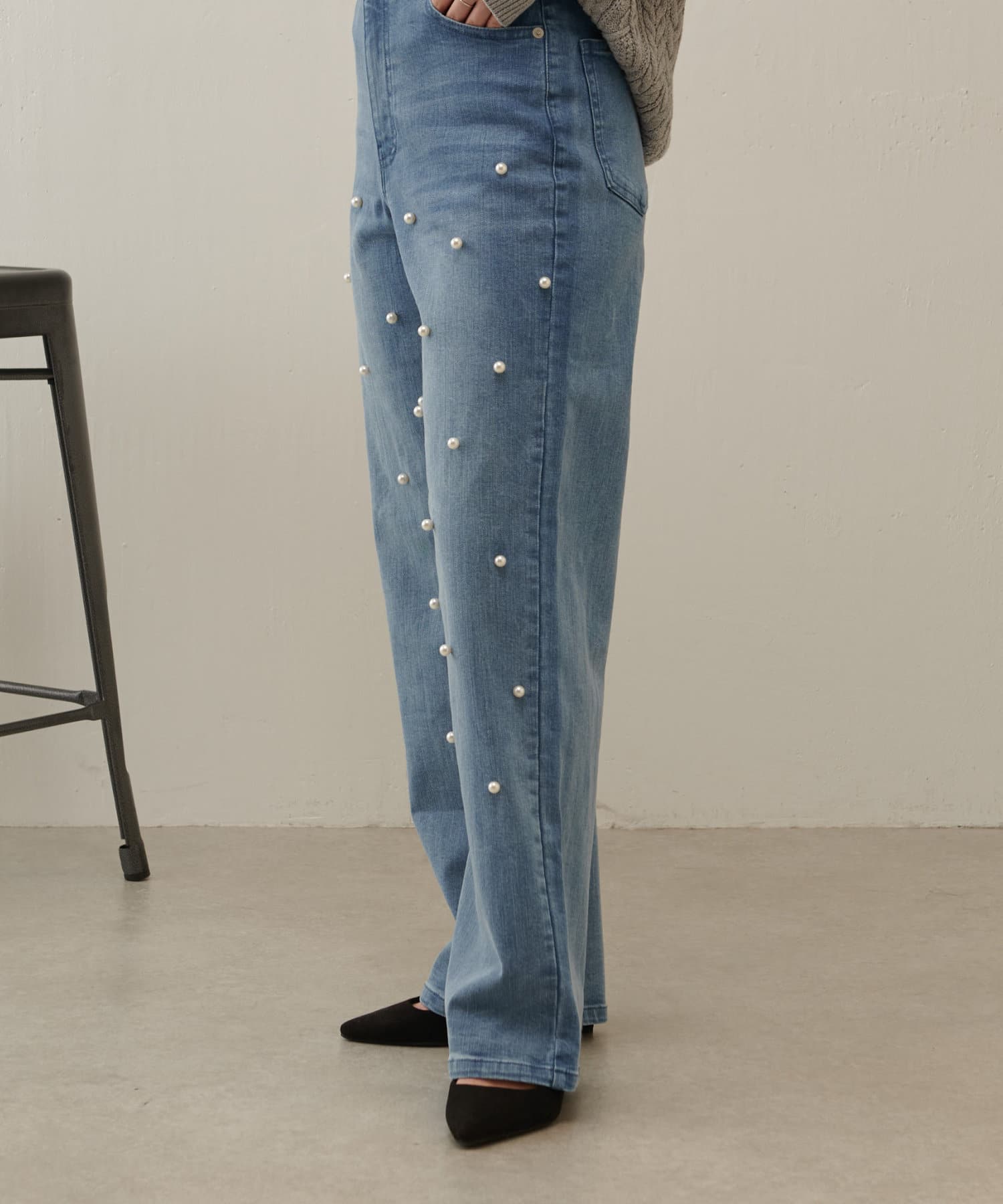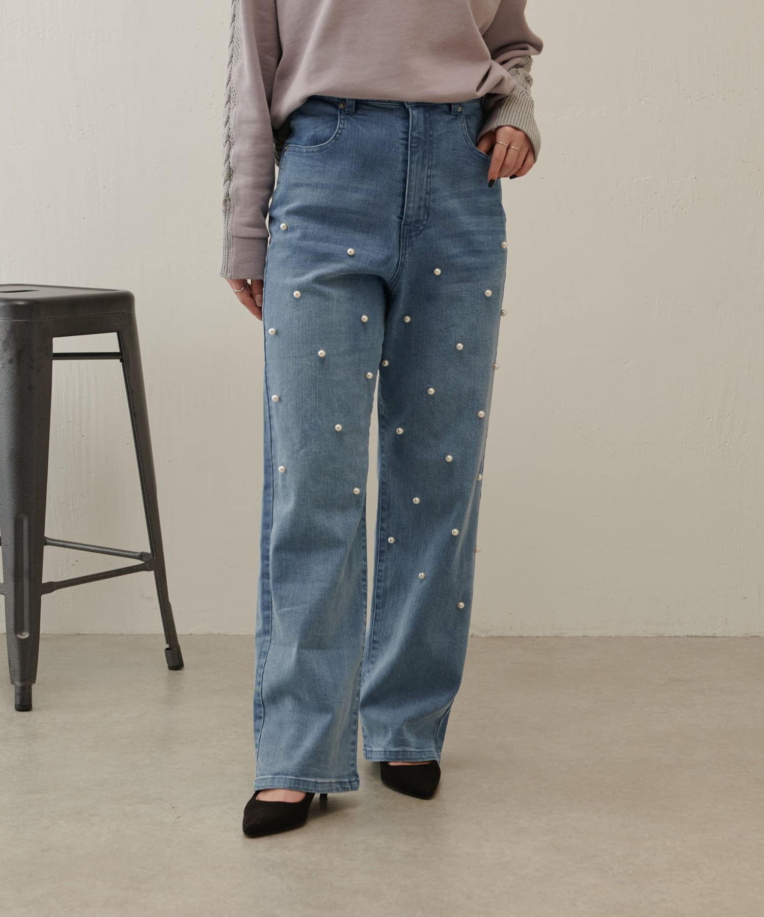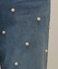 ・デニム×パールの程よい甘さがカジュアル過ぎないデニムパンツ。