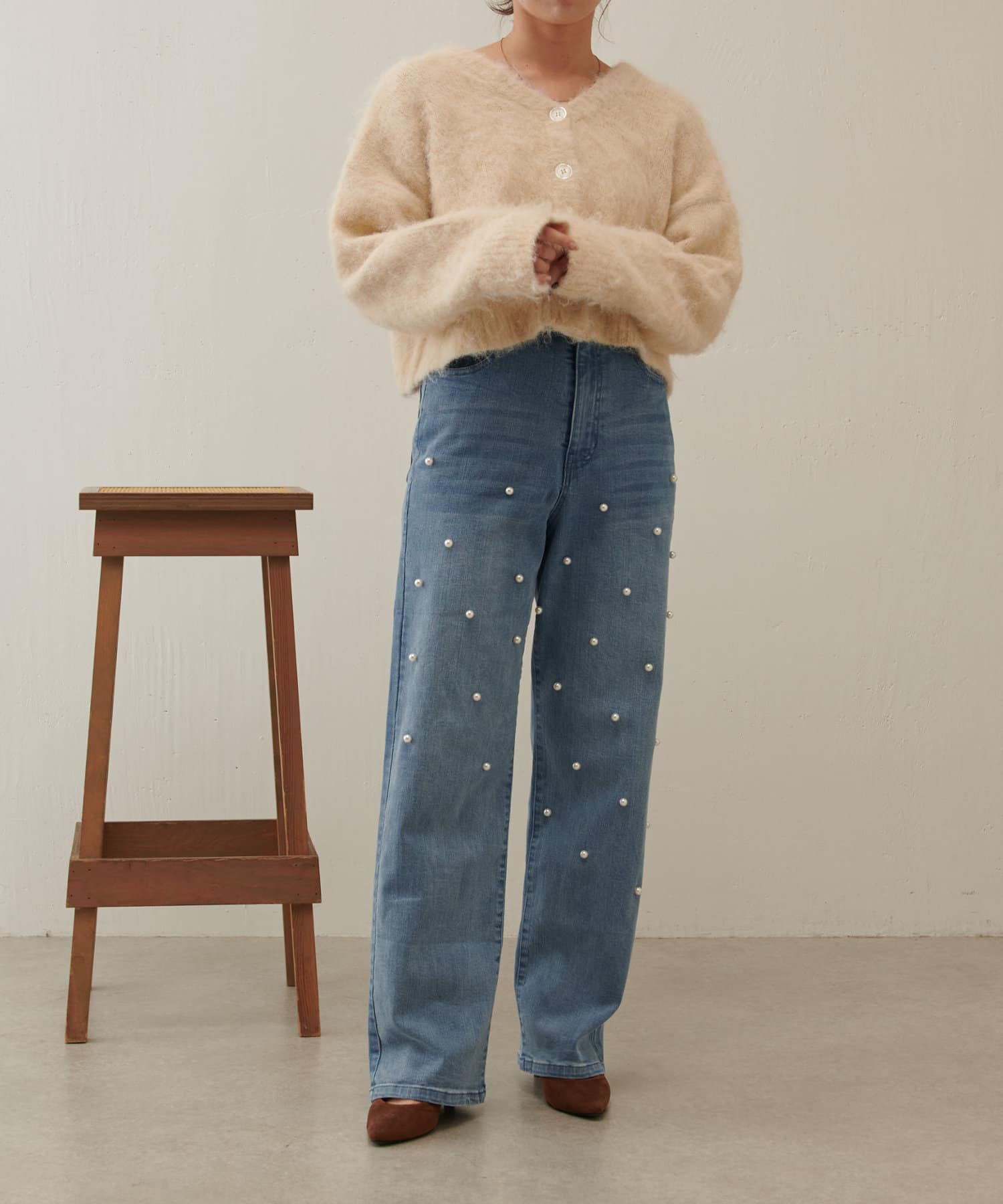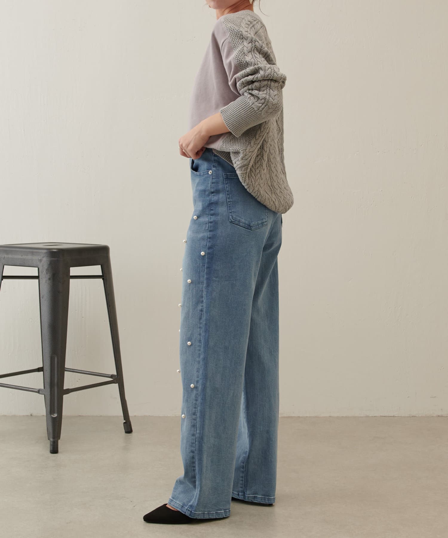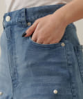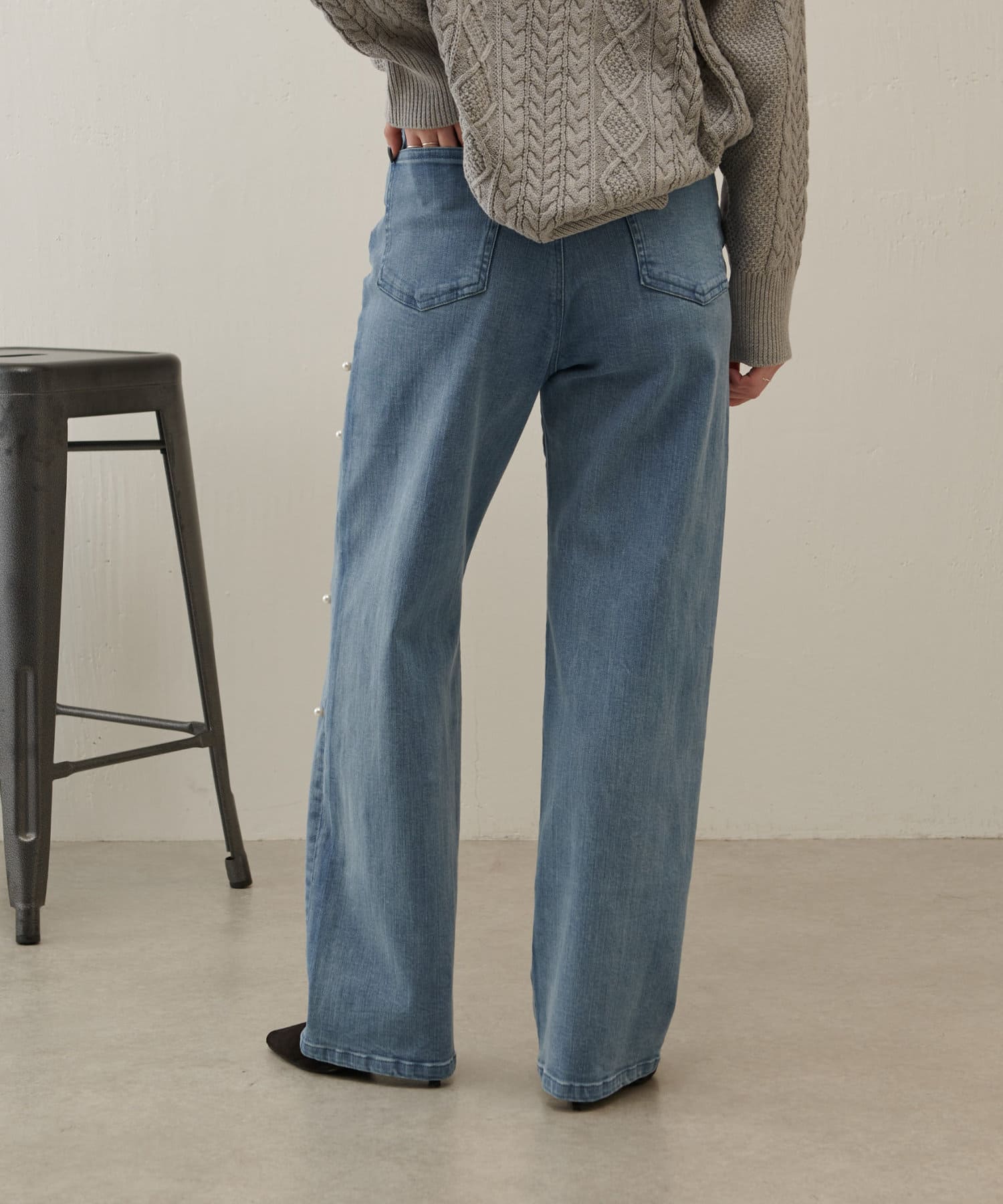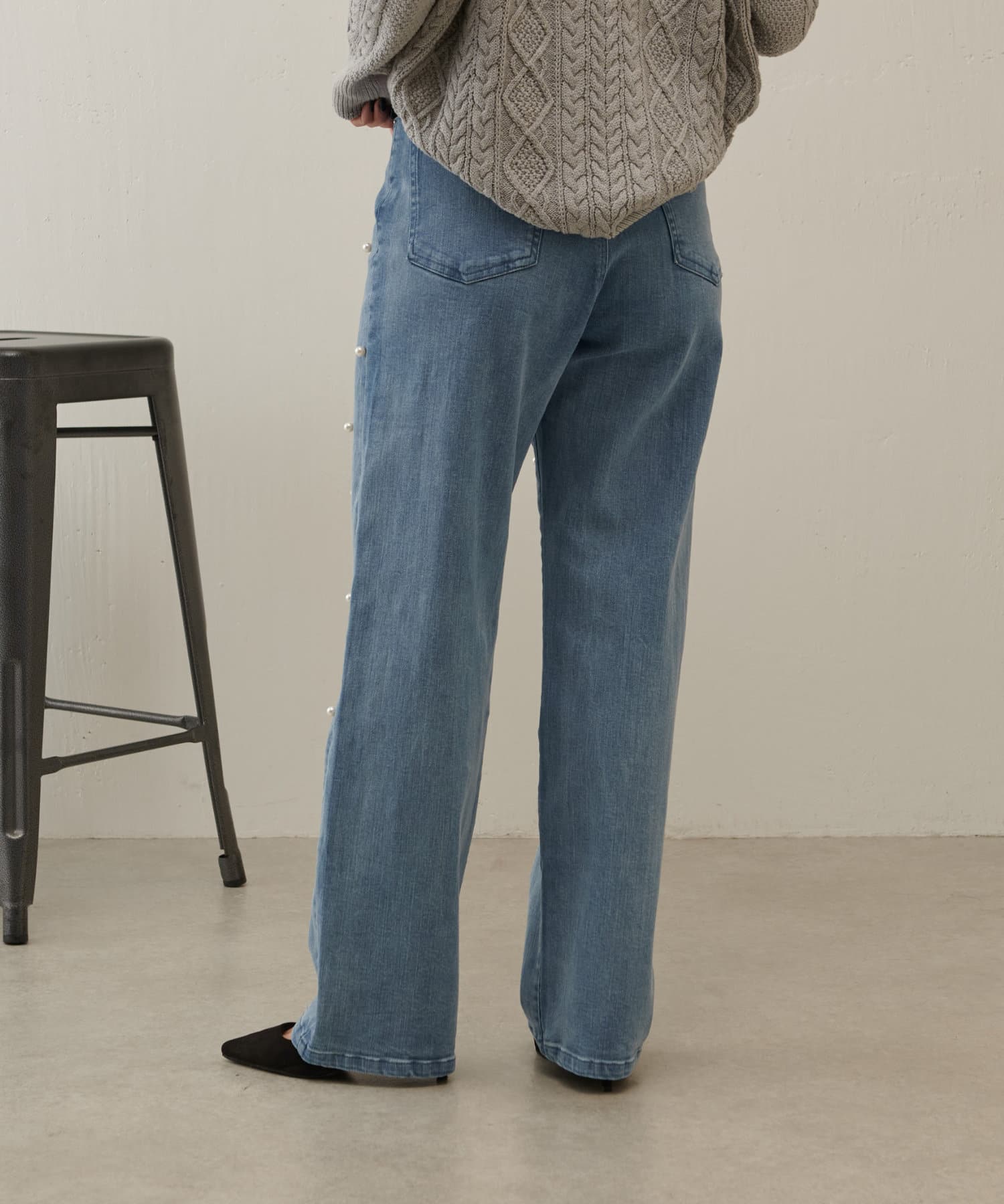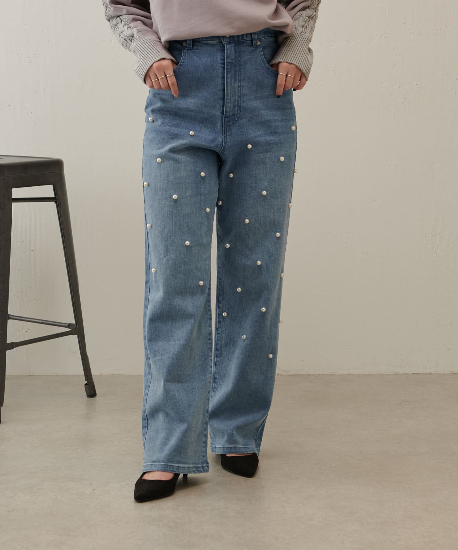 ・デニム×パールの程よい甘さがカジュアル過ぎないデニムパンツ。