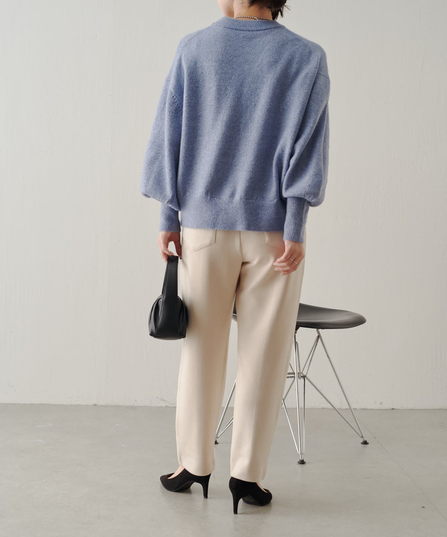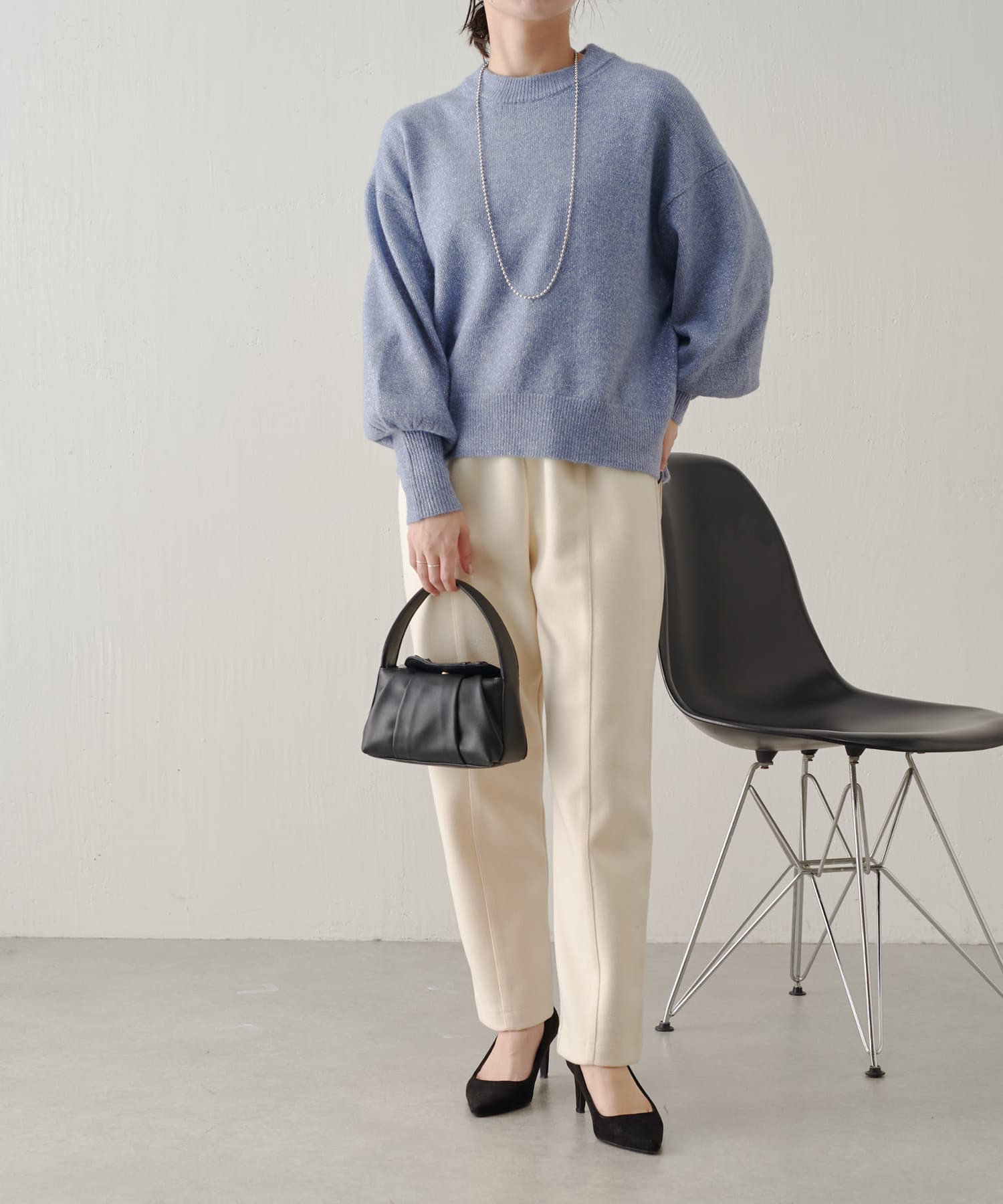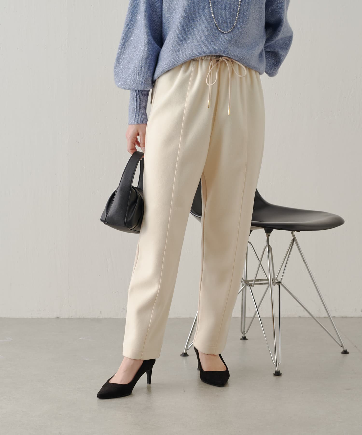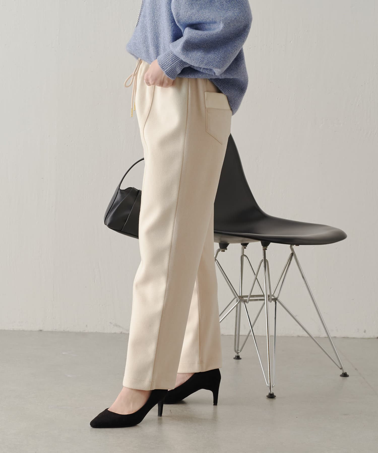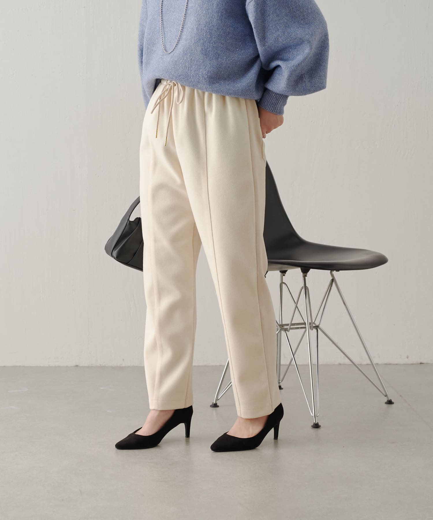 ・前後差のある素材感がワンポイントになった今の時期から活躍するイージーパンツ。