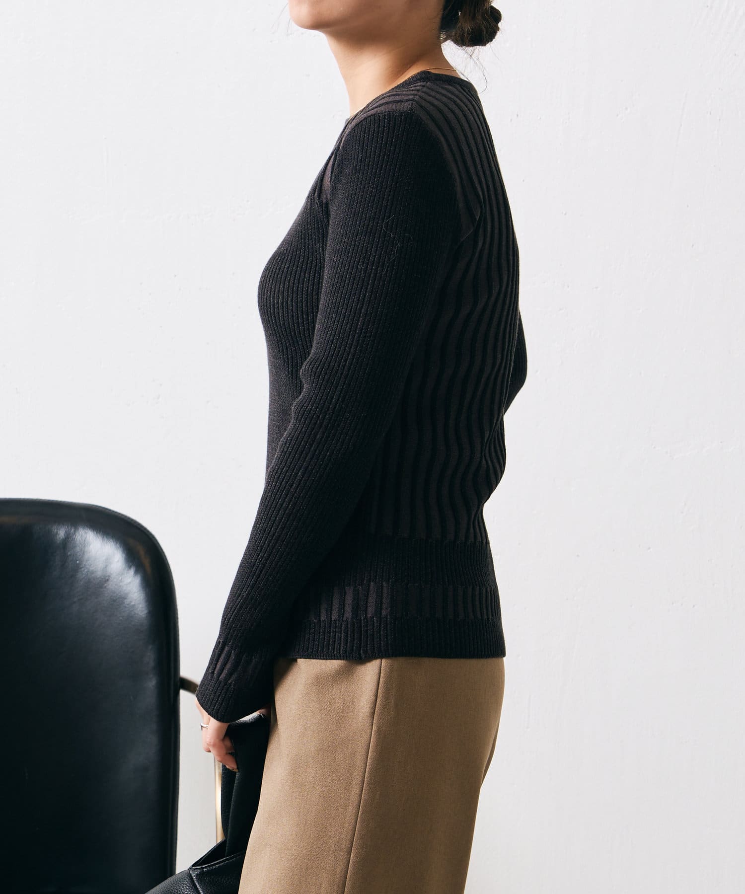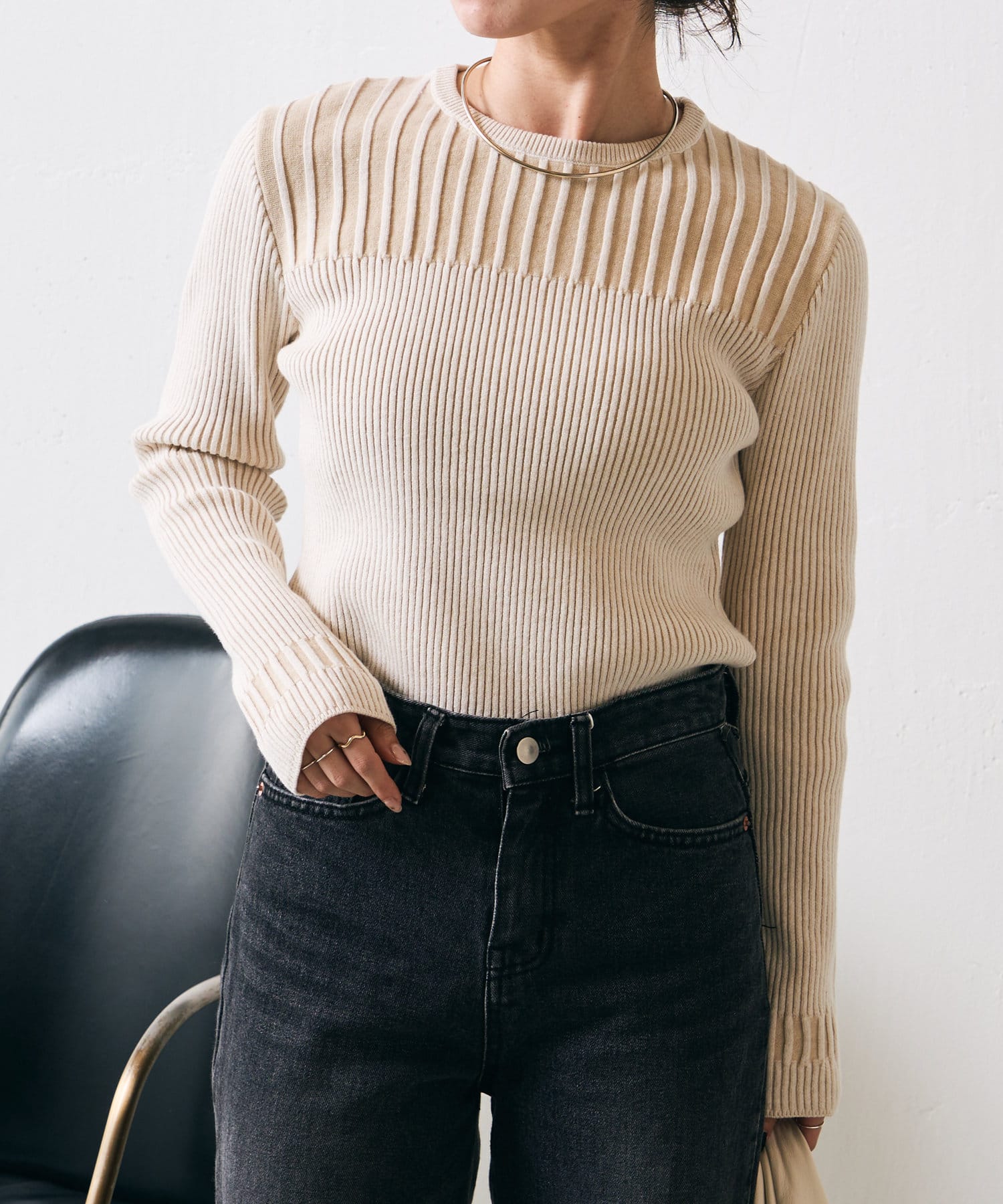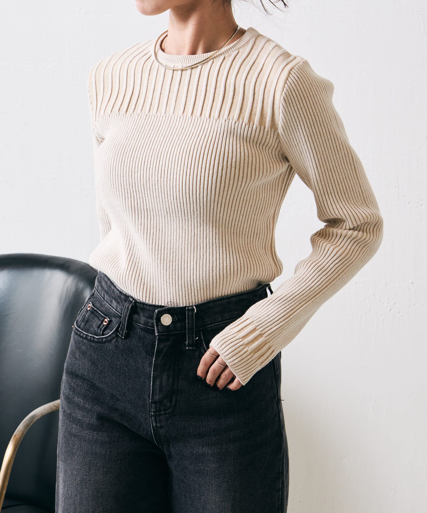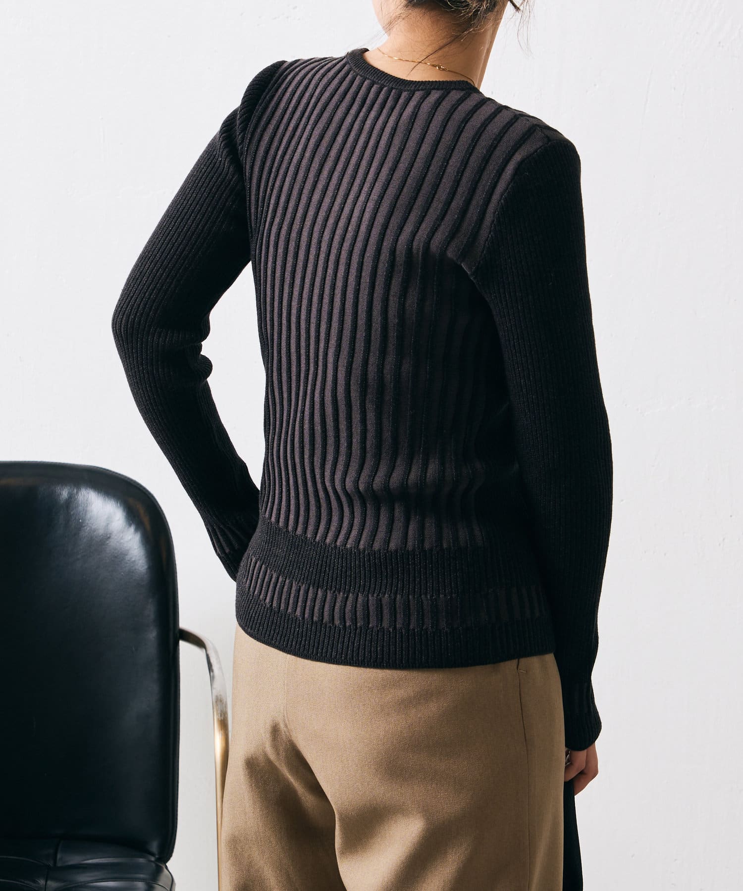 ・胸元から下にかけて細めのリブがビスチェを重ねているかのように魅せてくれます。