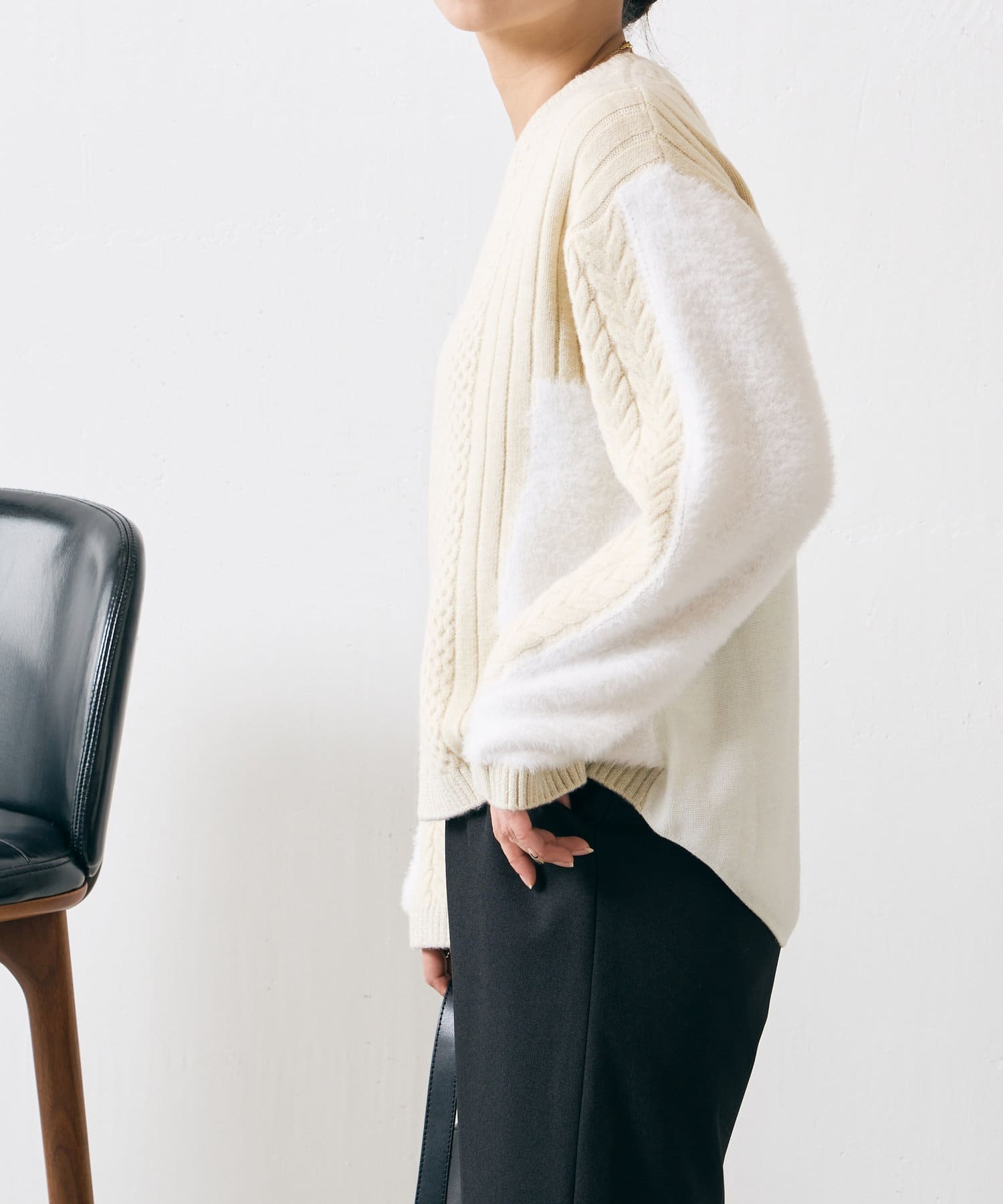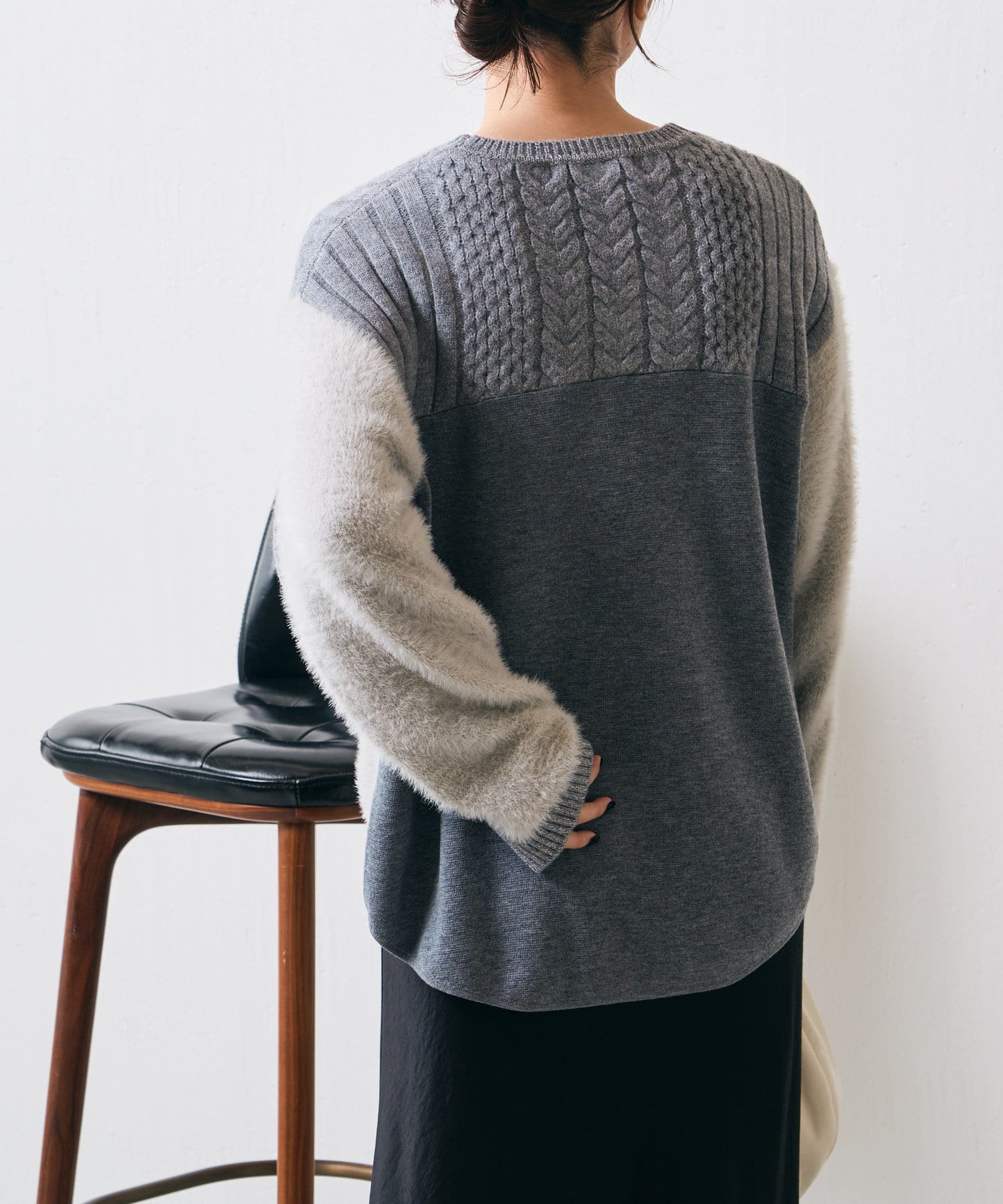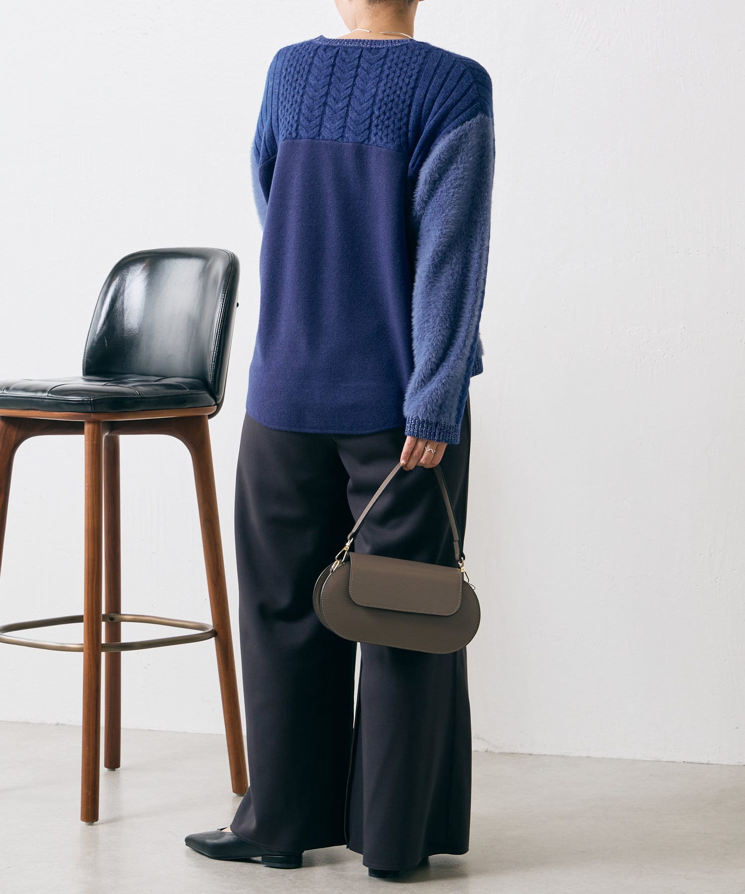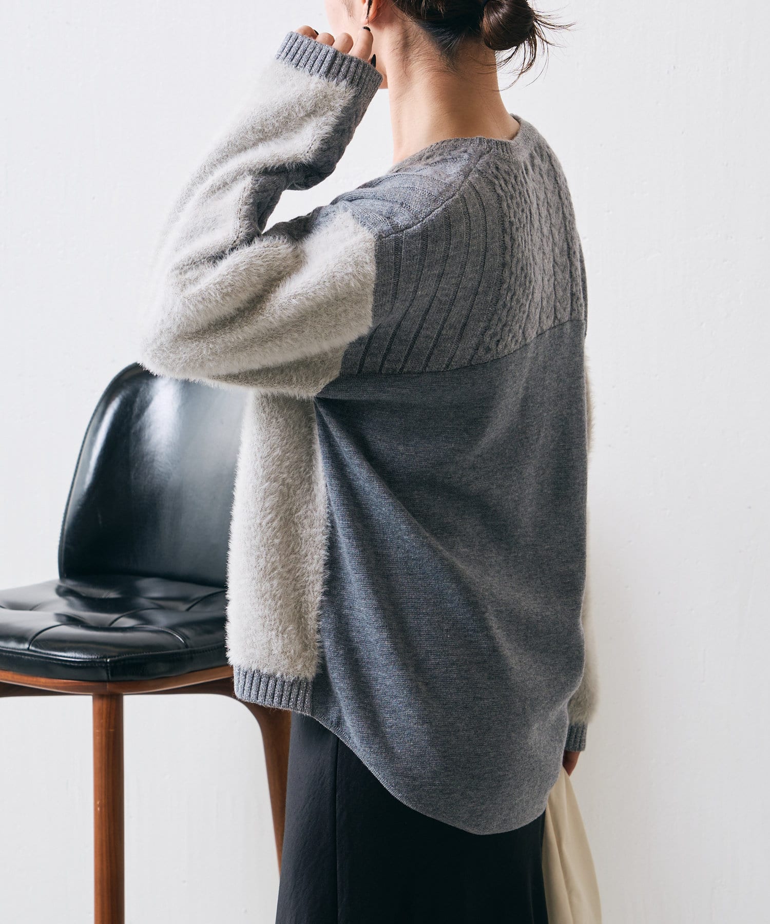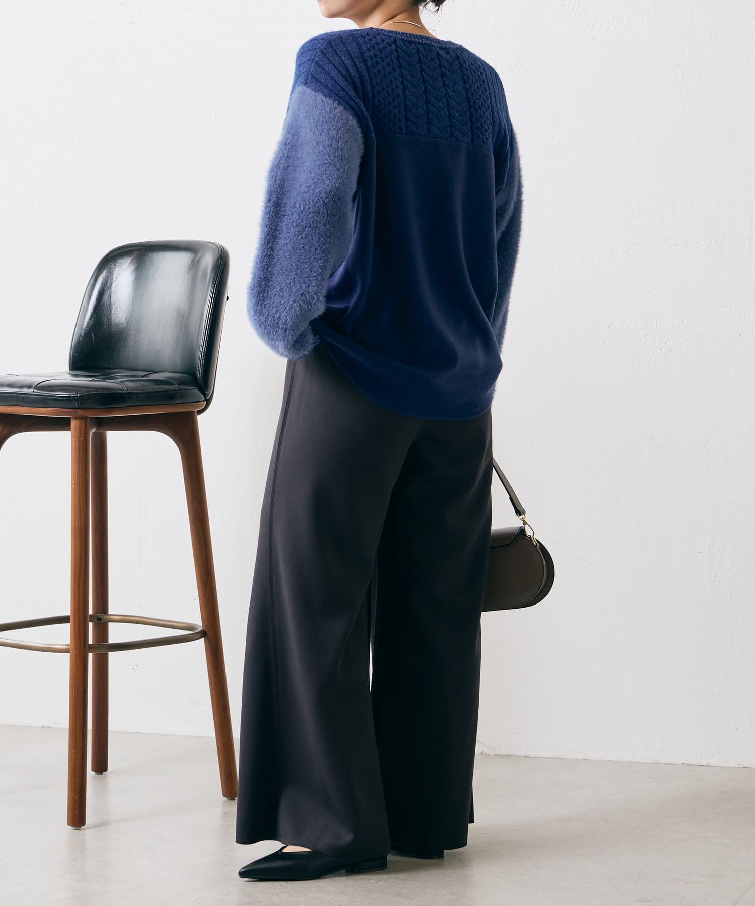 ・サイドとスリーブに施されたシャギー切り替えがニットながらすっきりとした印象に。