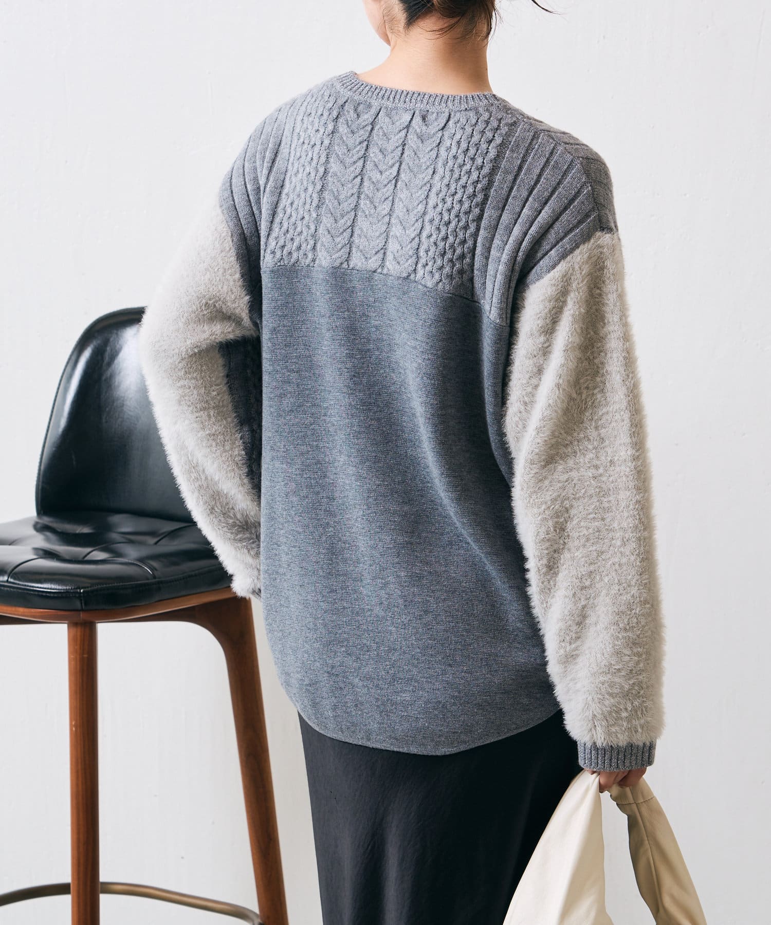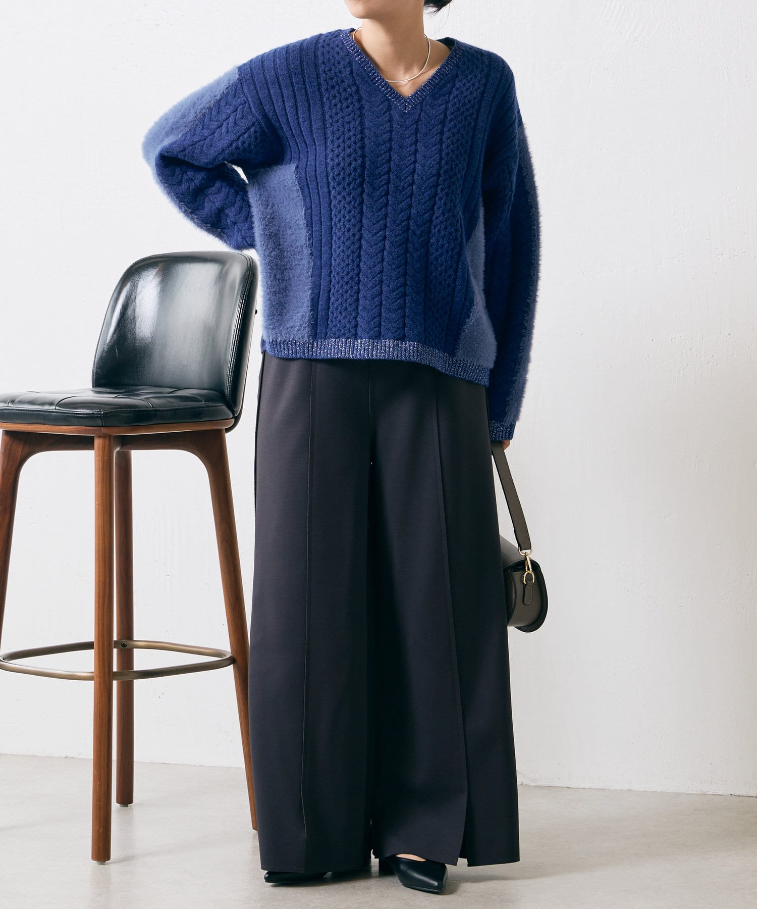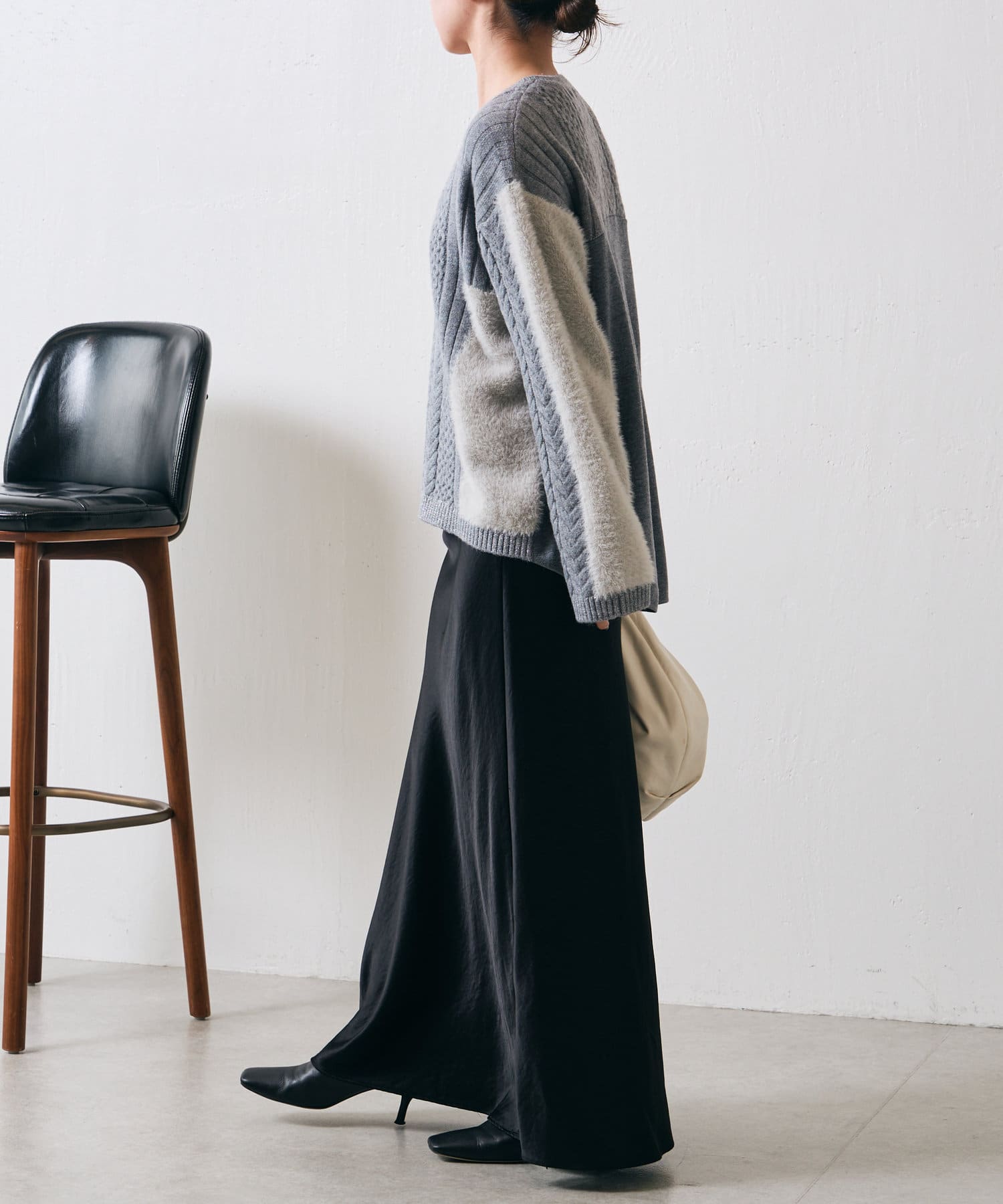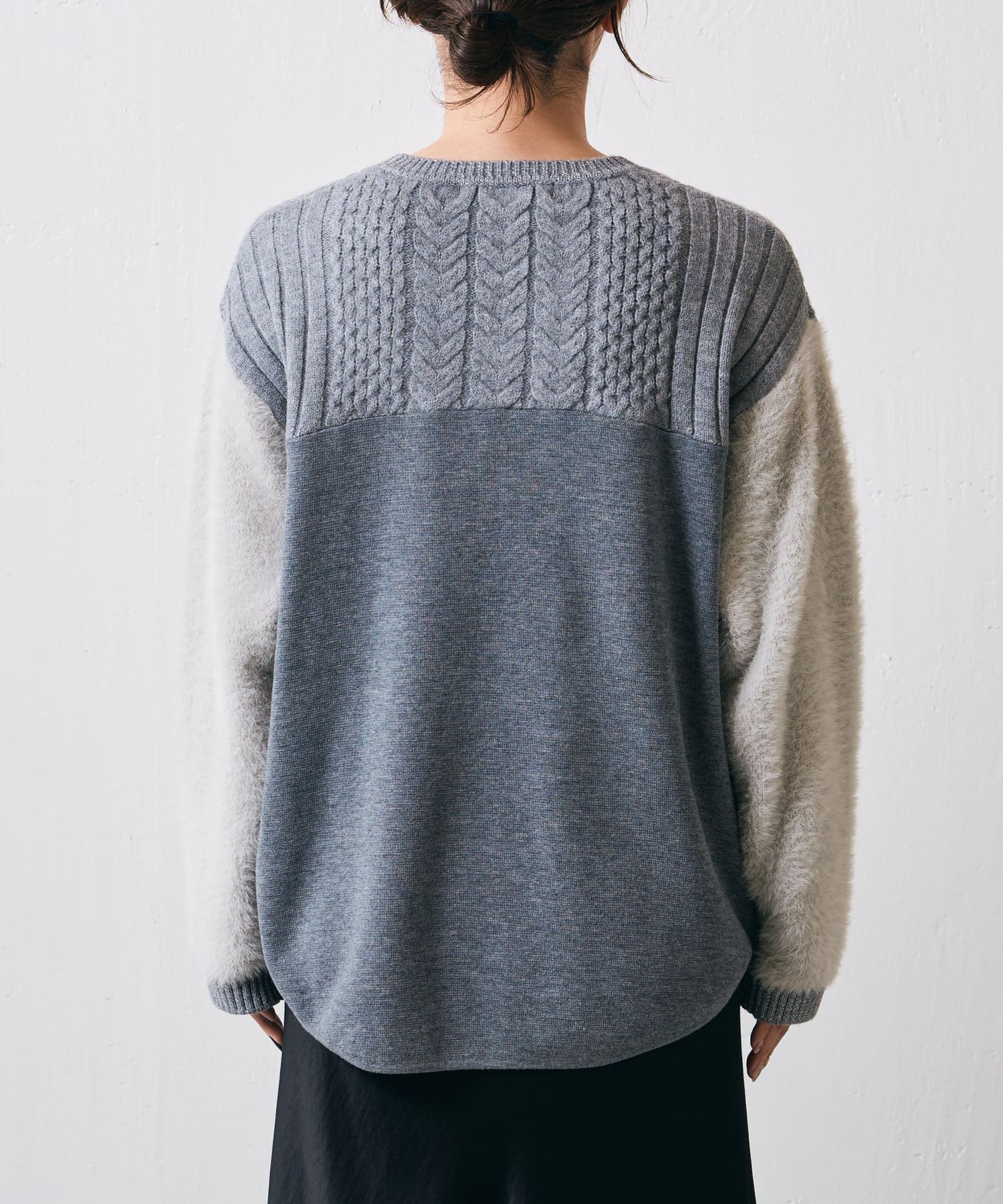 ・サイドとスリーブに施されたシャギー切り替えがニットながらすっきりとした印象に。