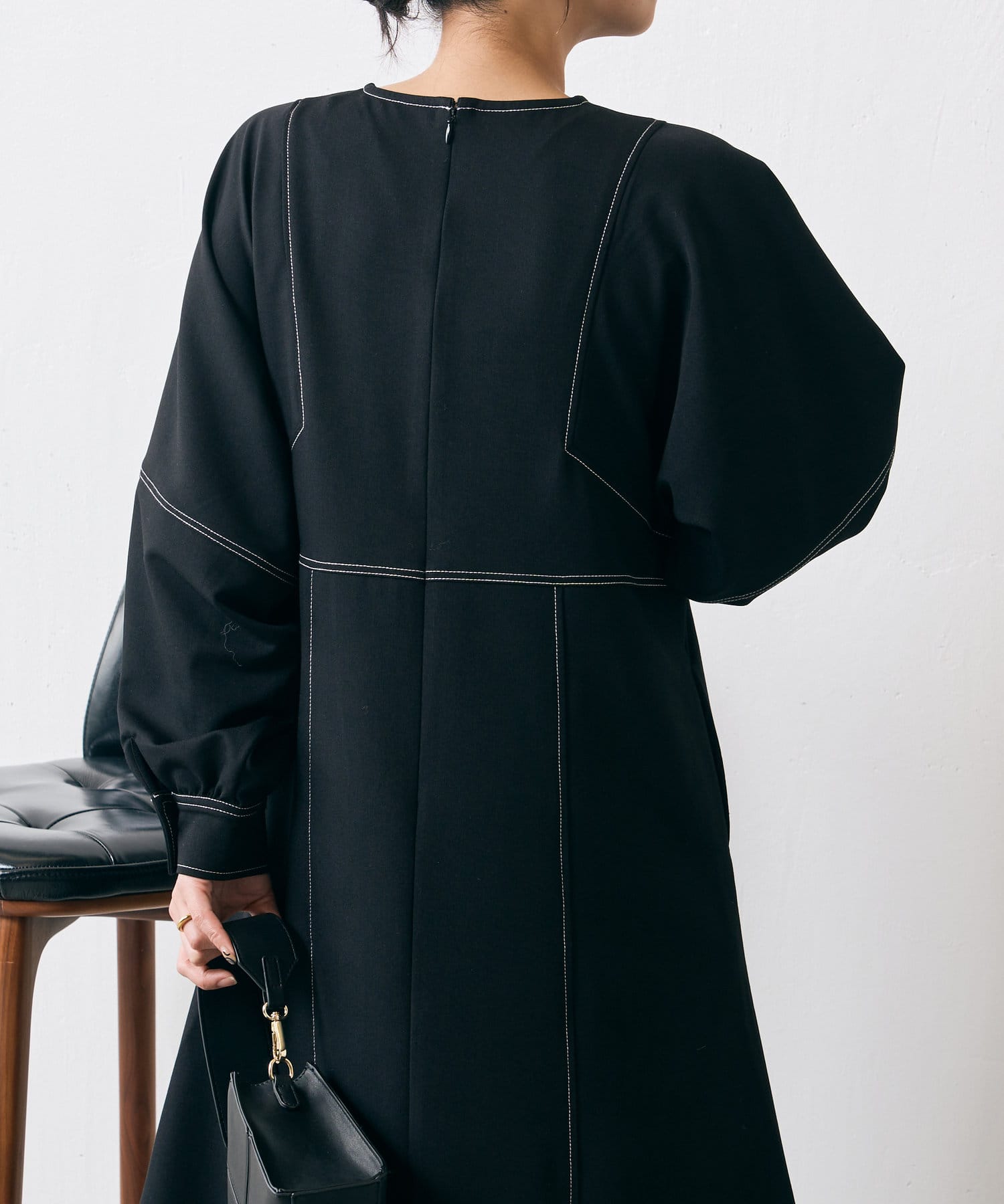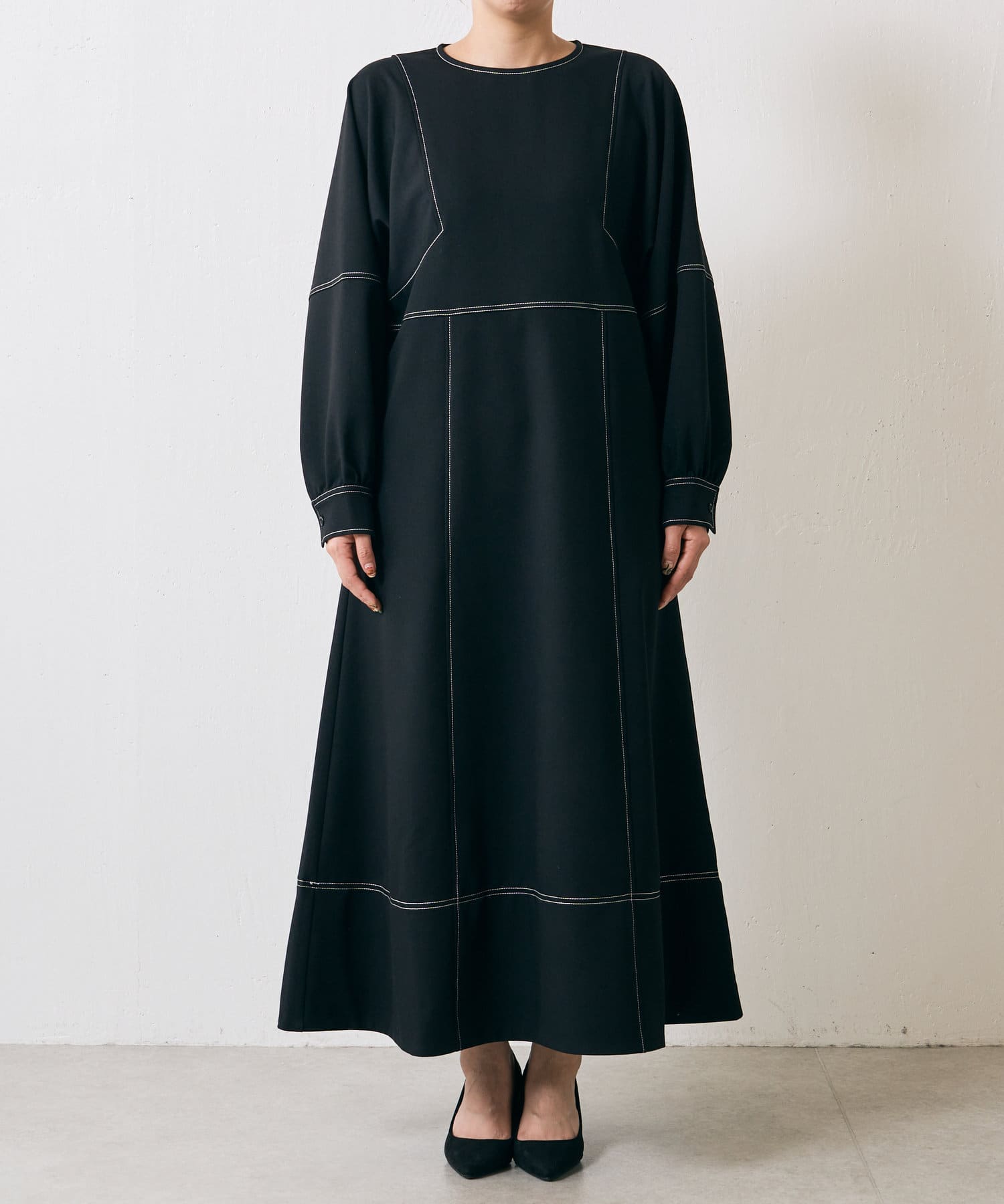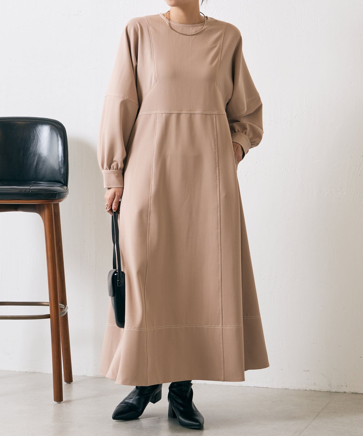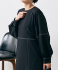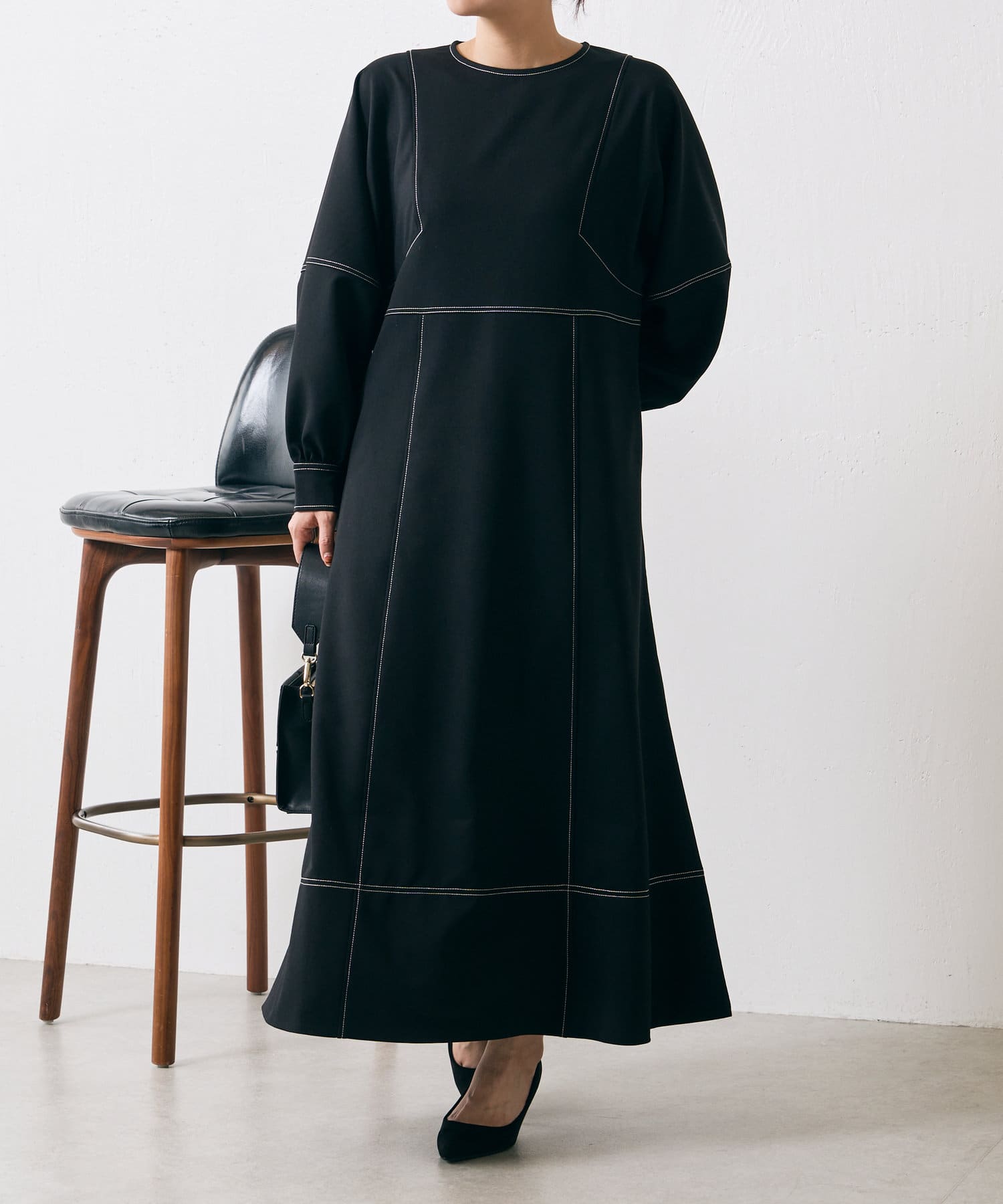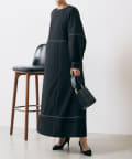 ・配色ステッチが施された、上品なフレアワンピース