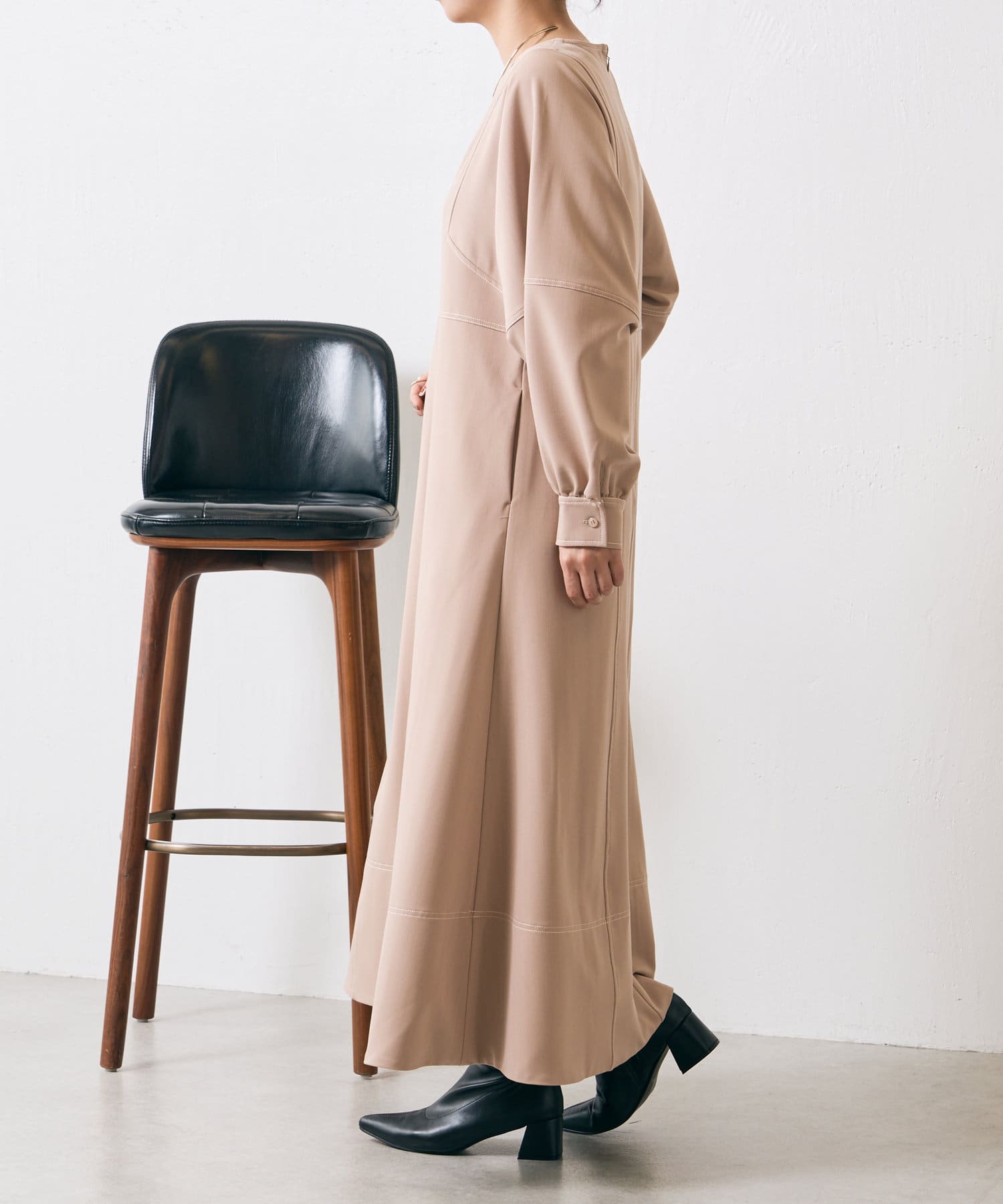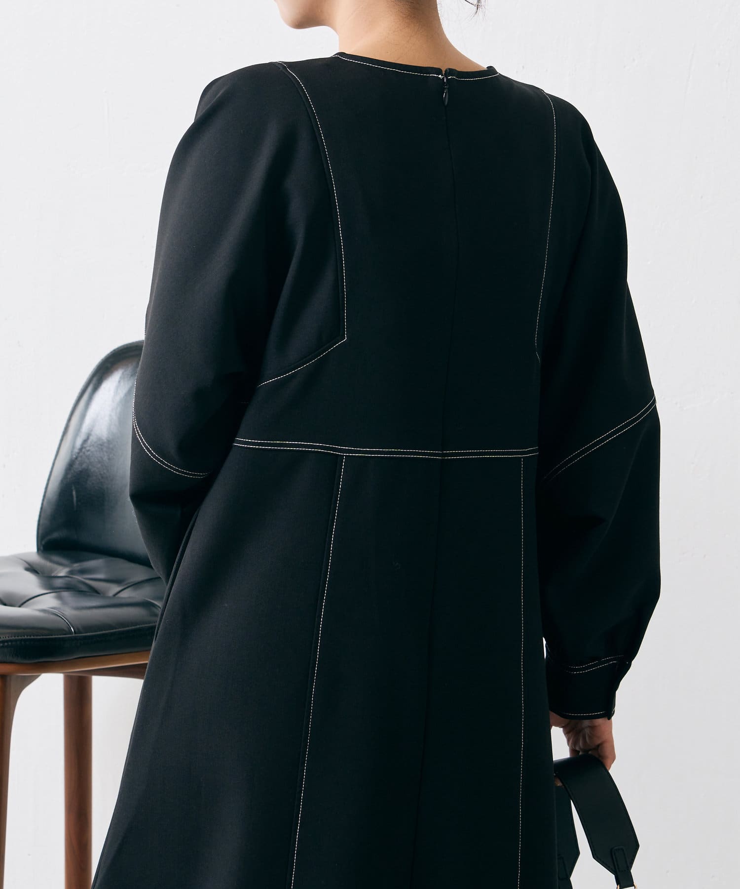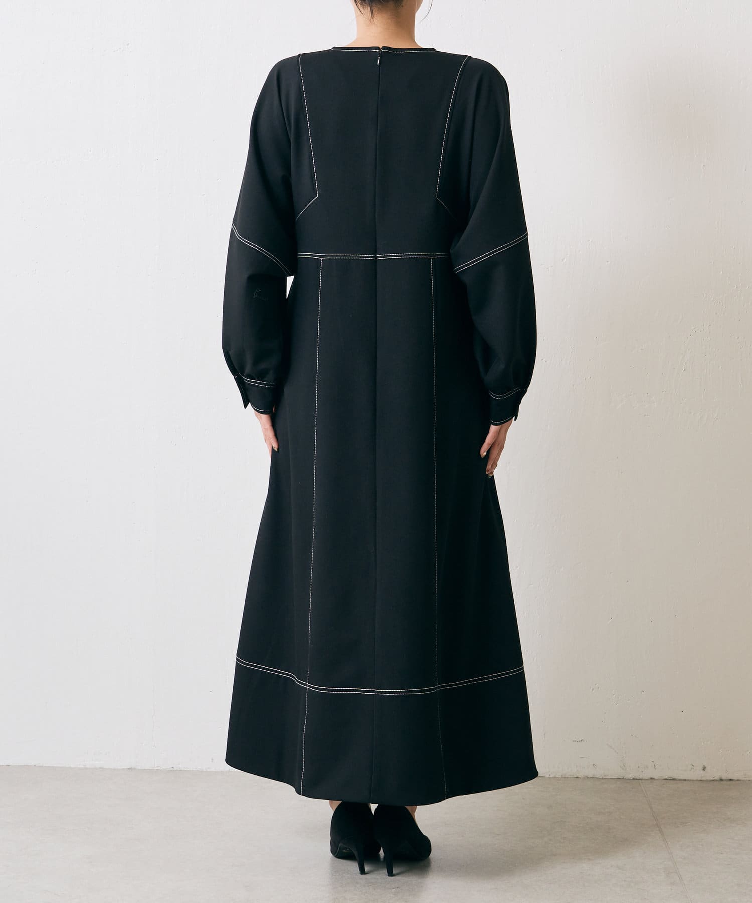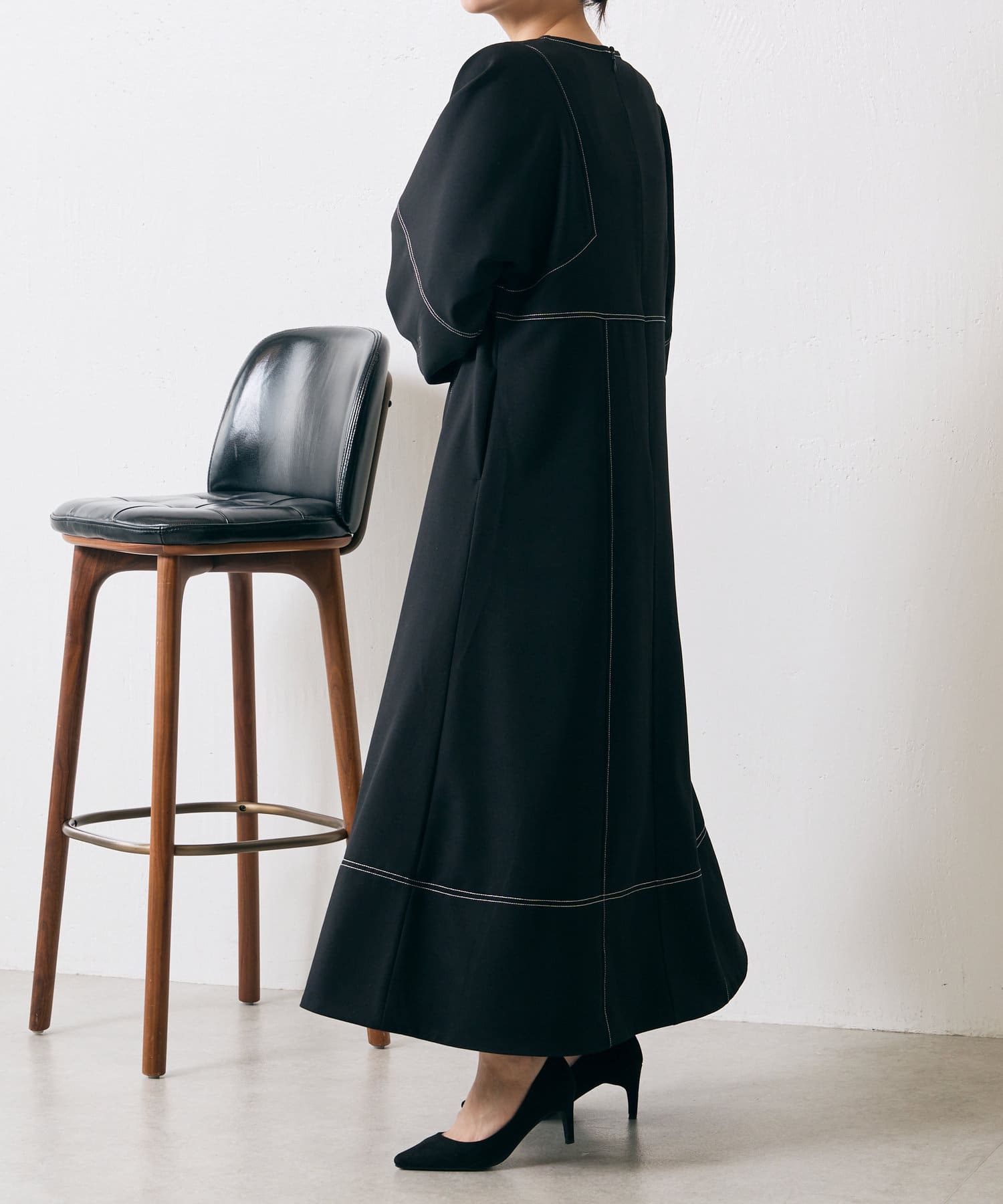 ・配色ステッチが施された、上品なフレアワンピース