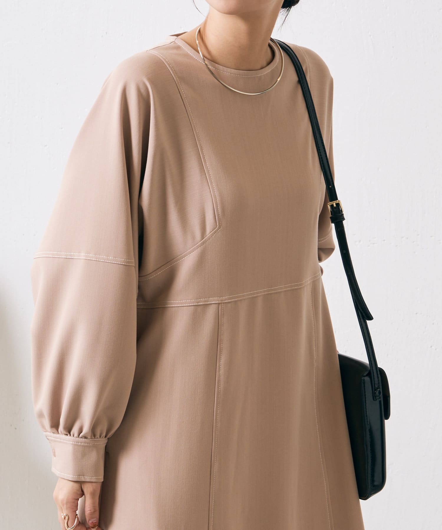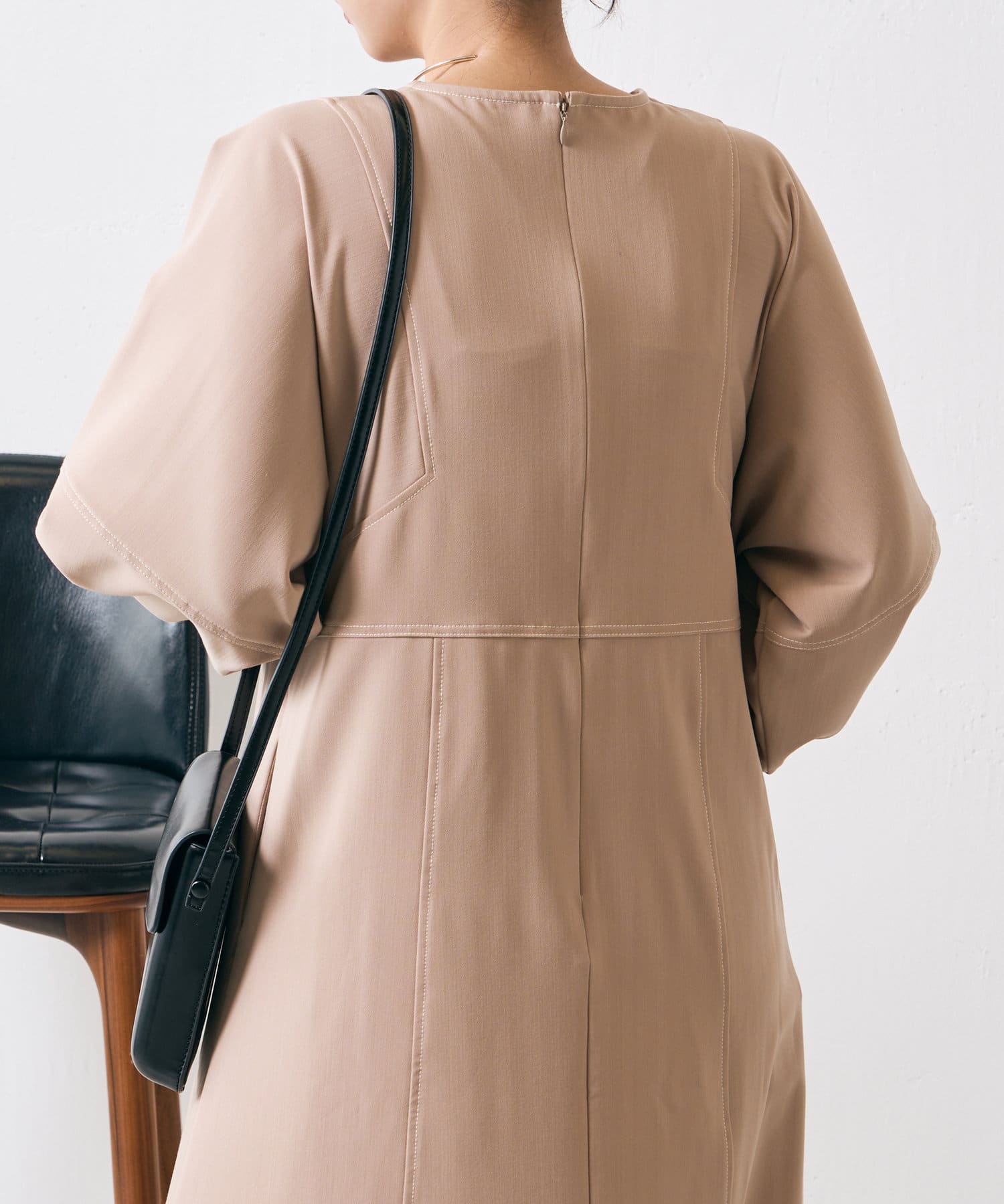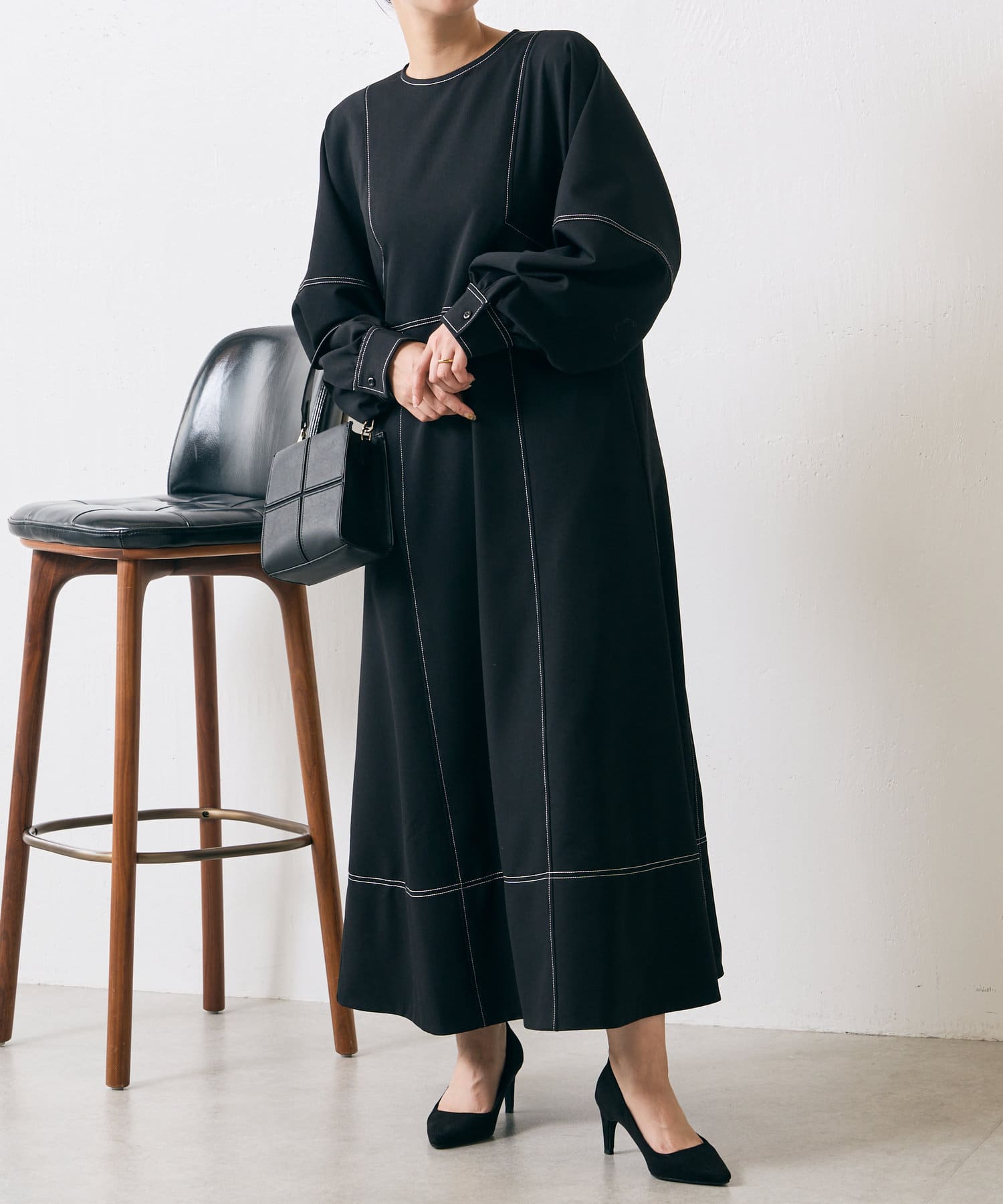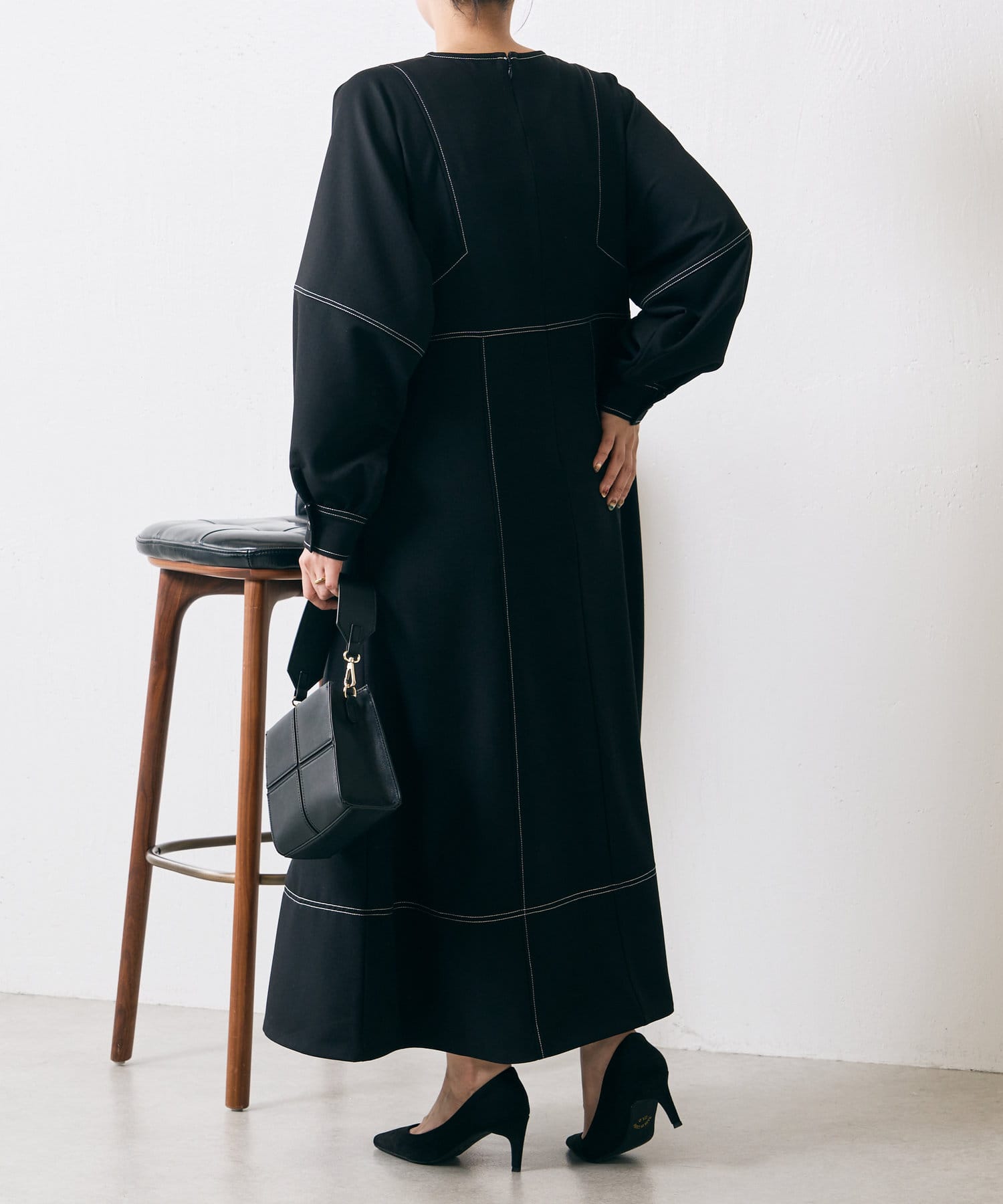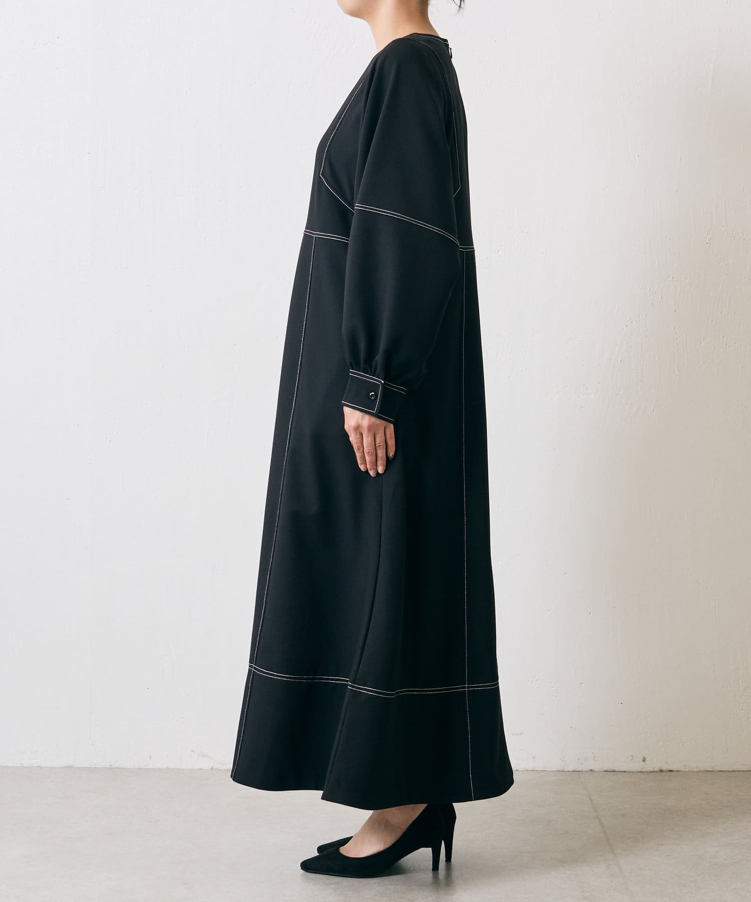 ・配色ステッチが施された、上品なフレアワンピース