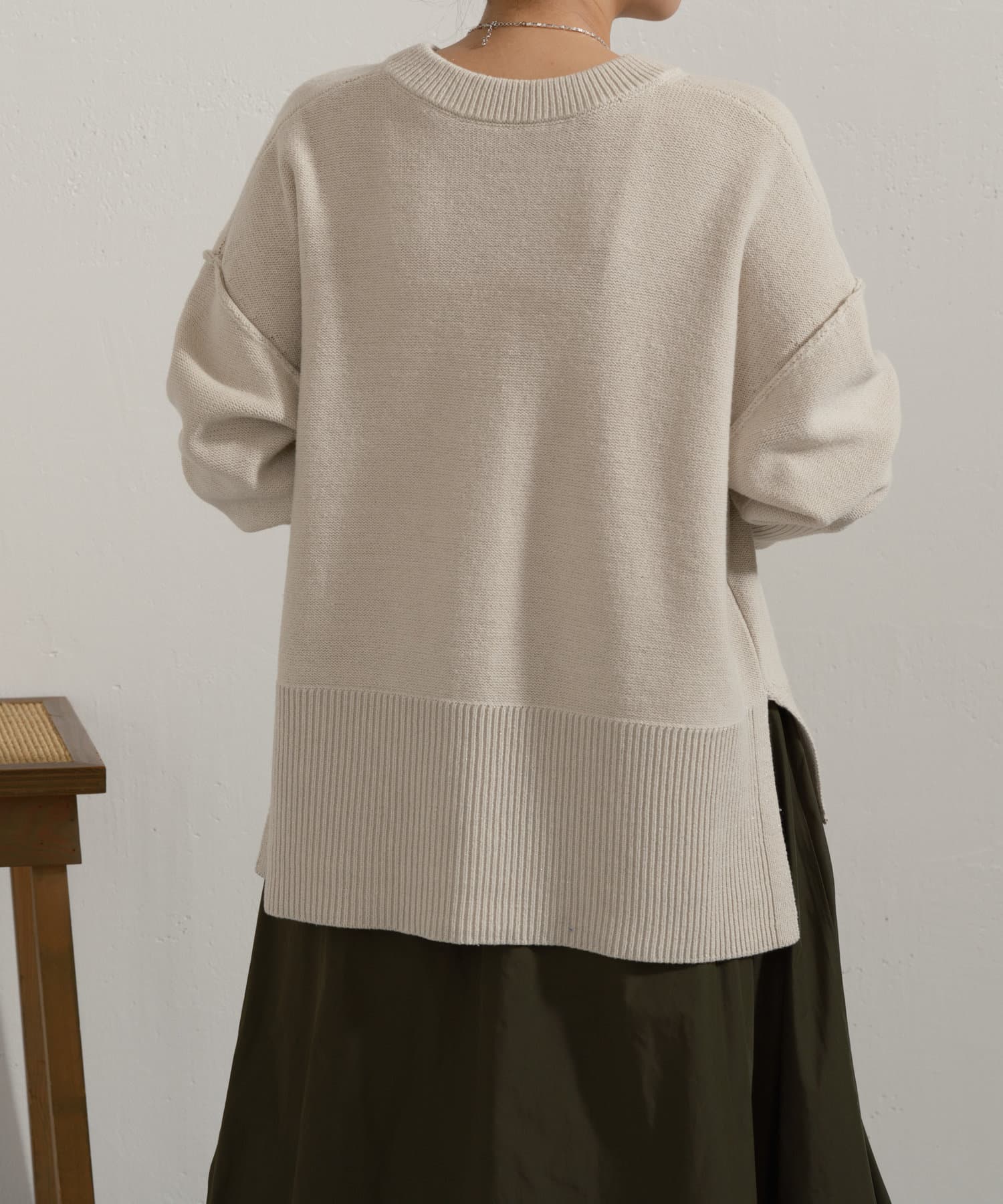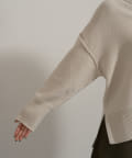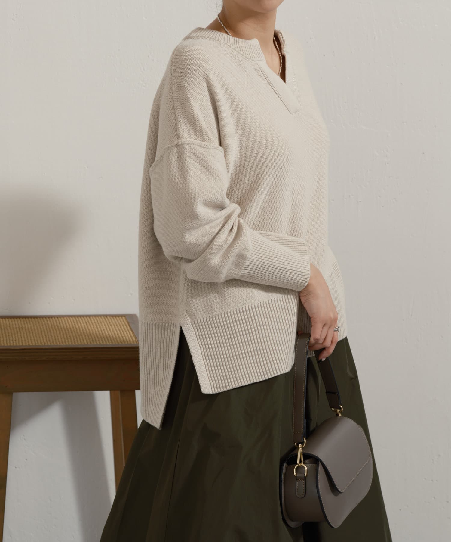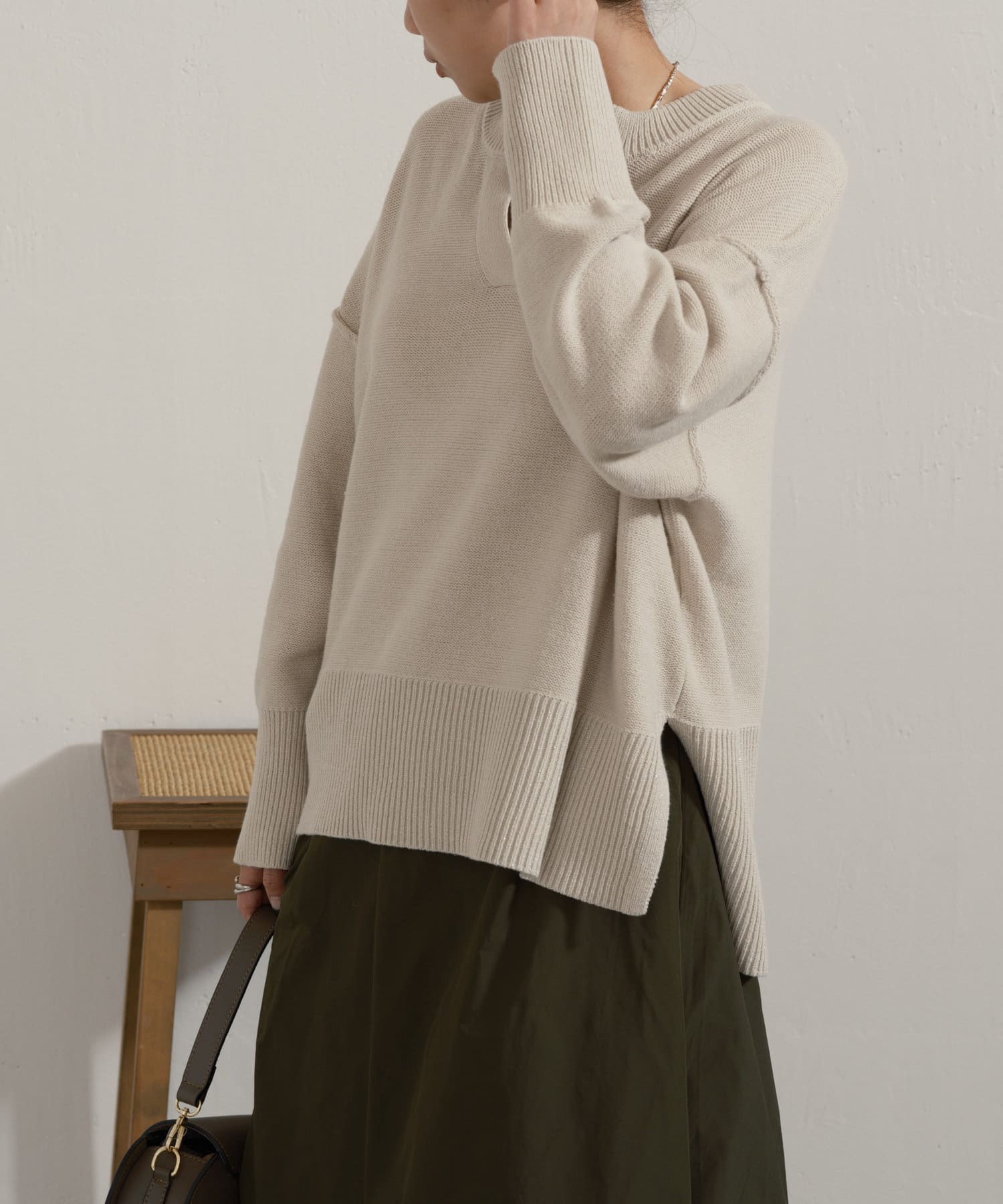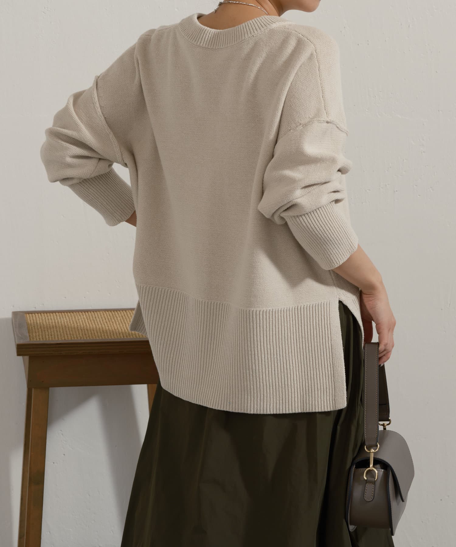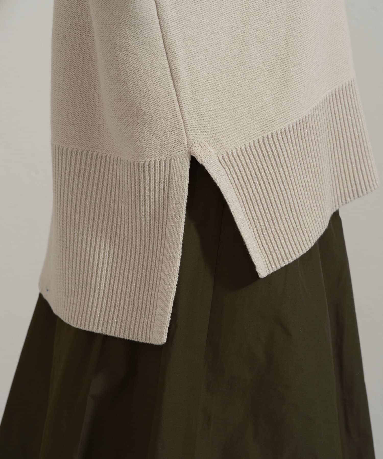 ・首元と裾に施されたさりげないラメがポイントのニット。