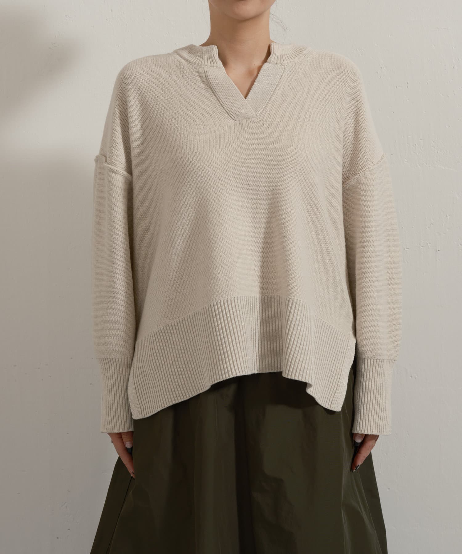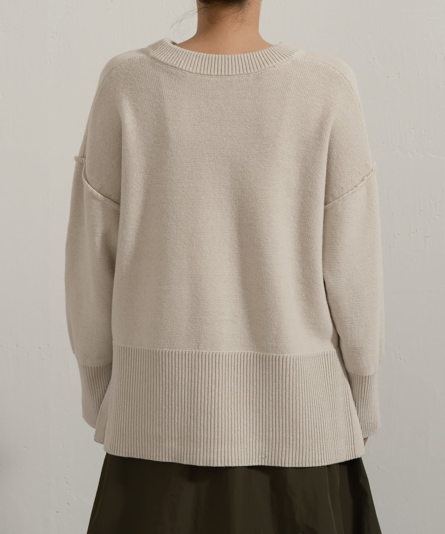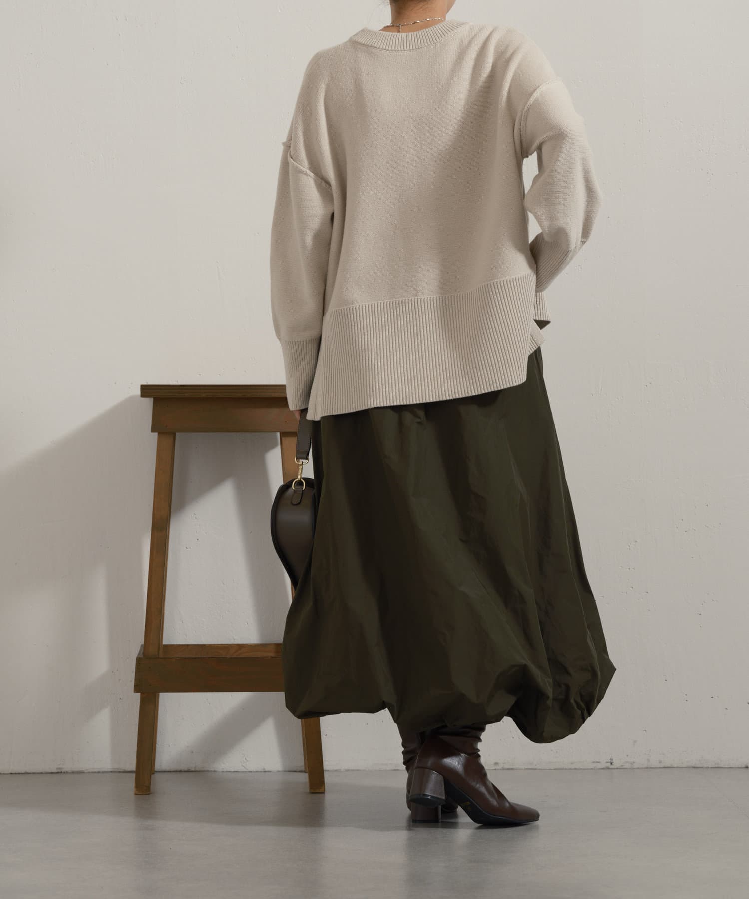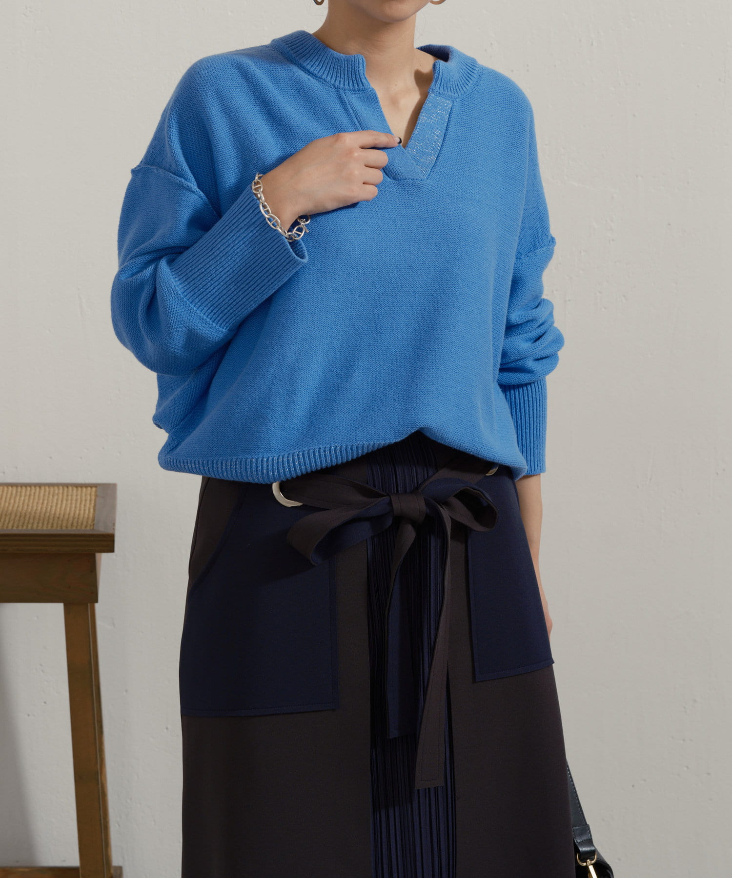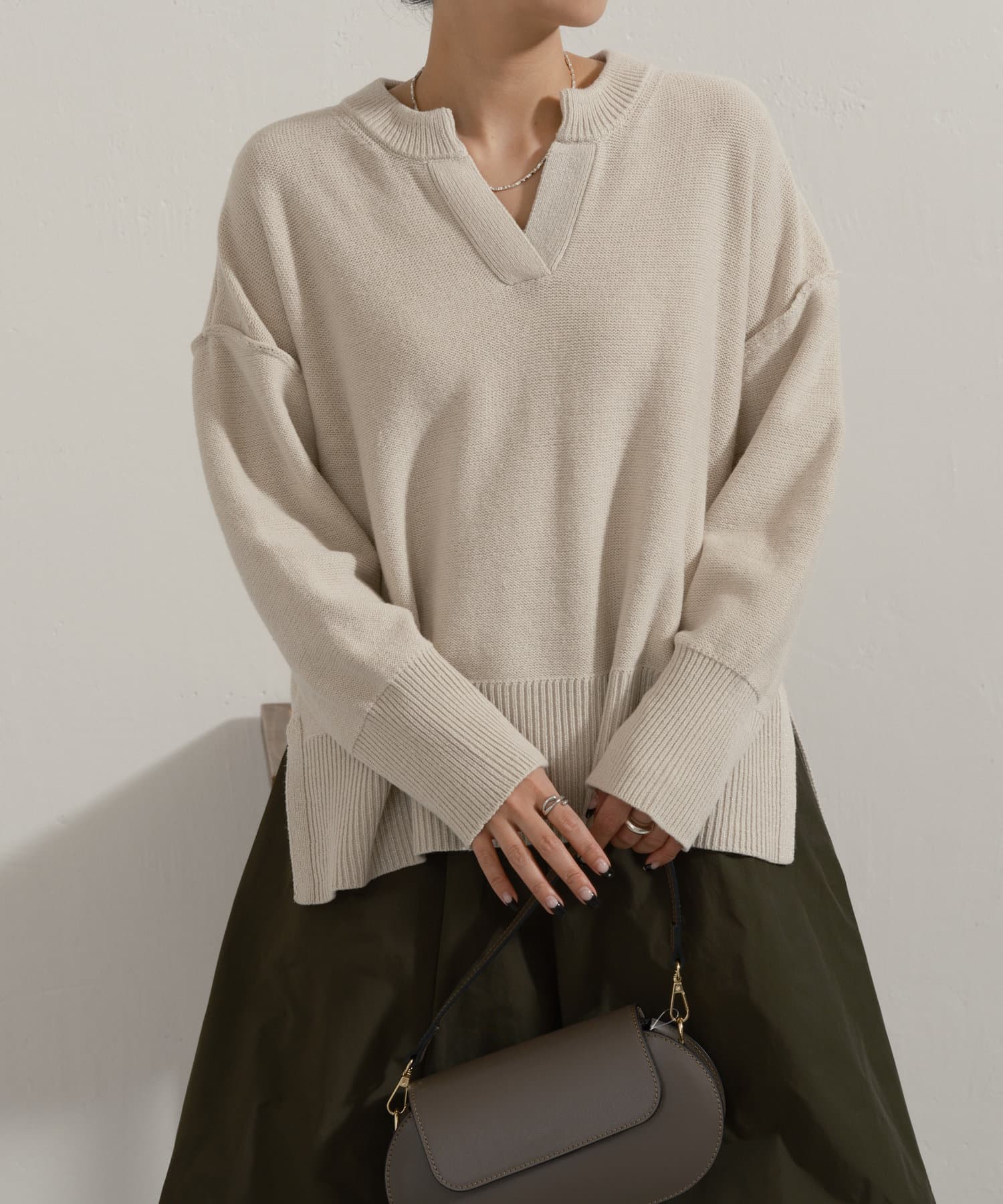 ・首元と裾に施されたさりげないラメがポイントのニット。