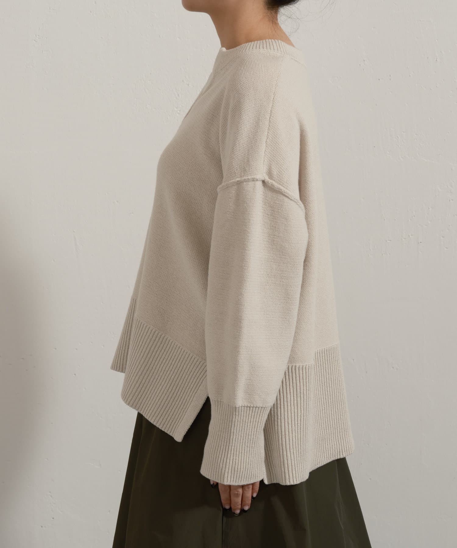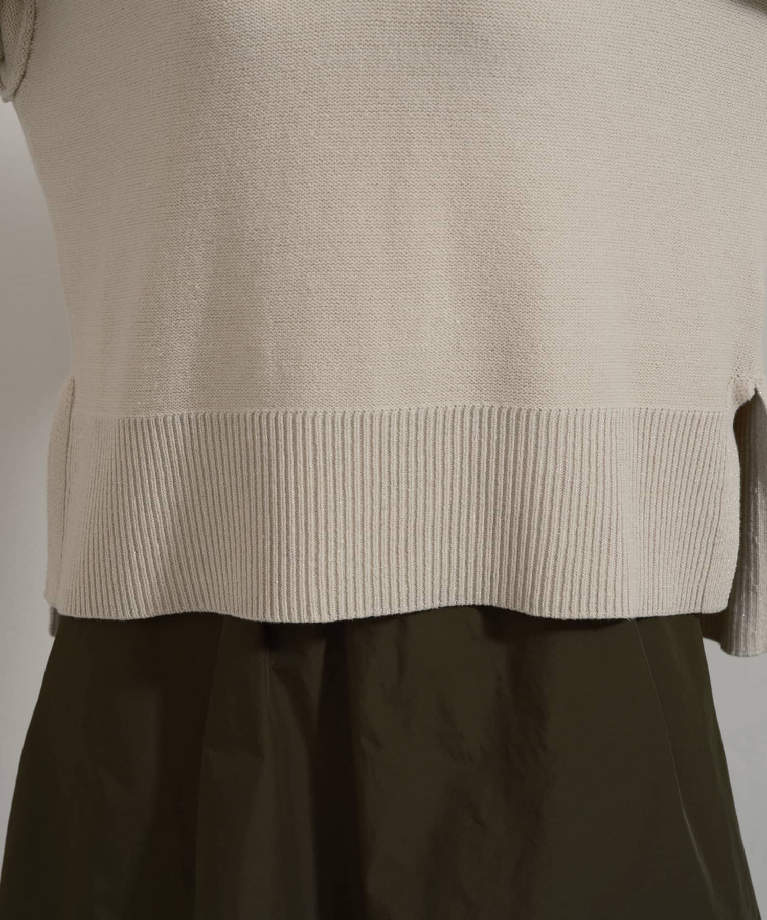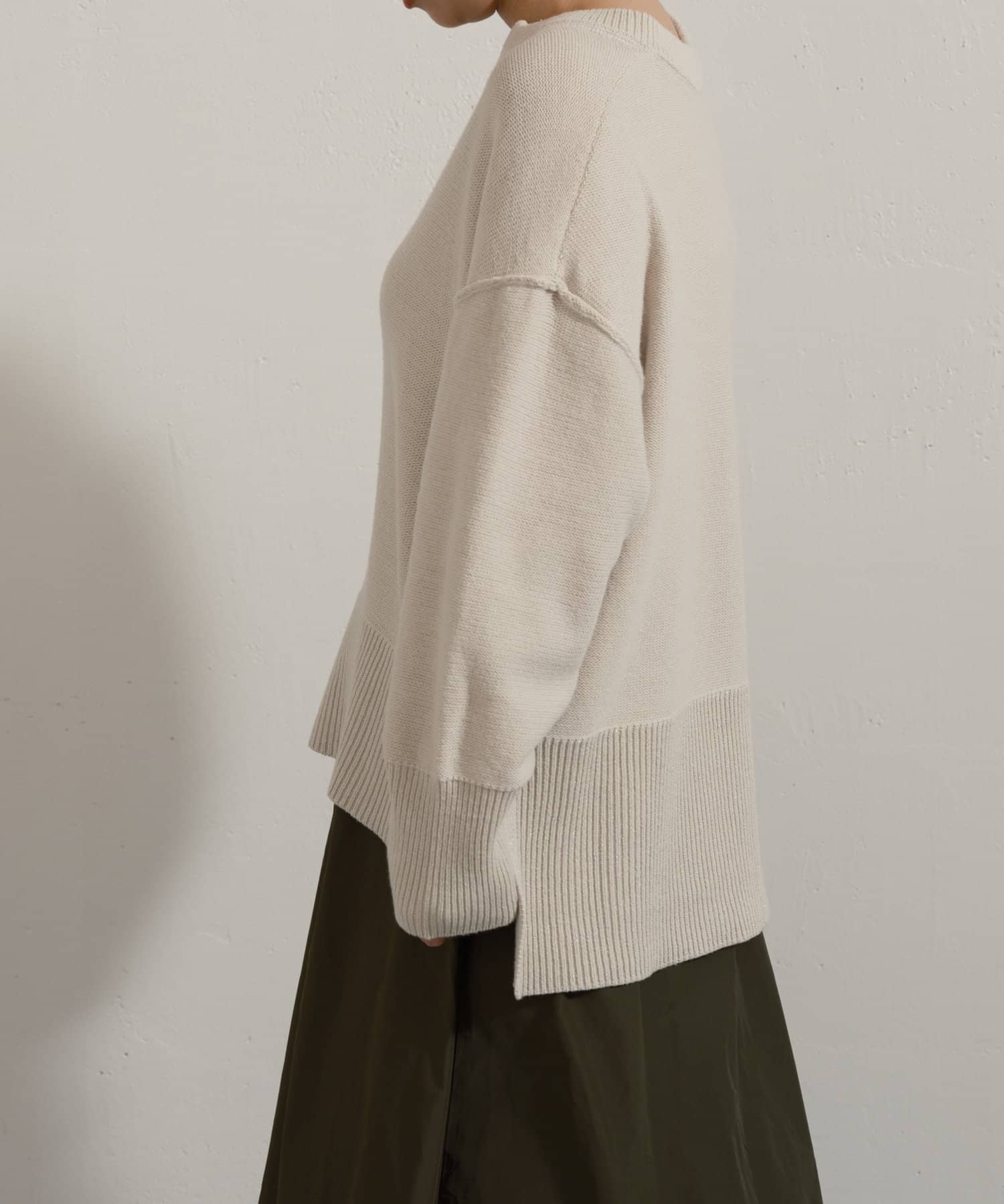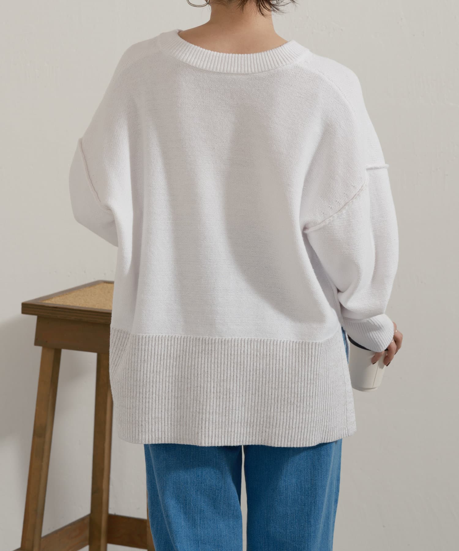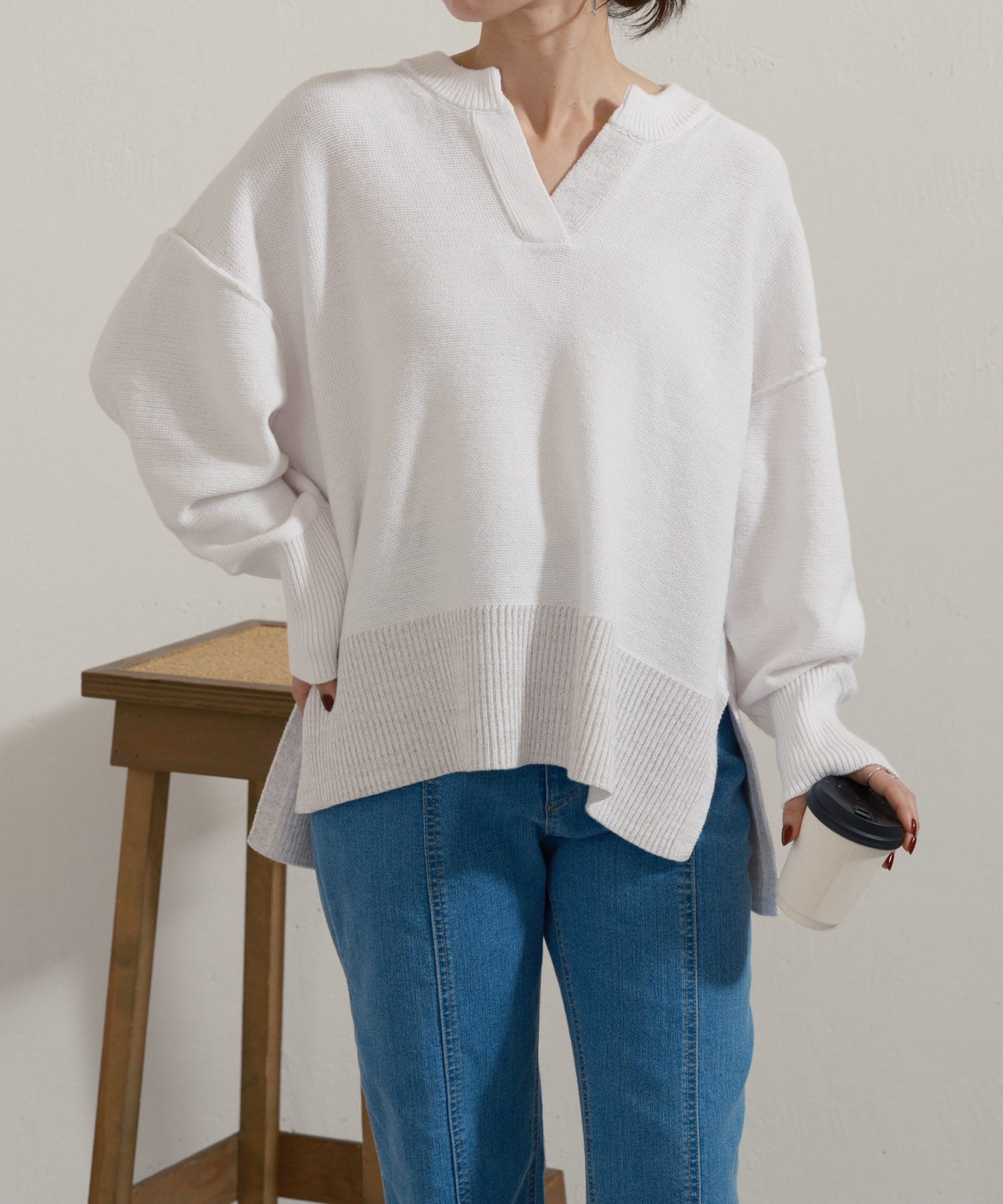 ・首元と裾に施されたさりげないラメがポイントのニット。